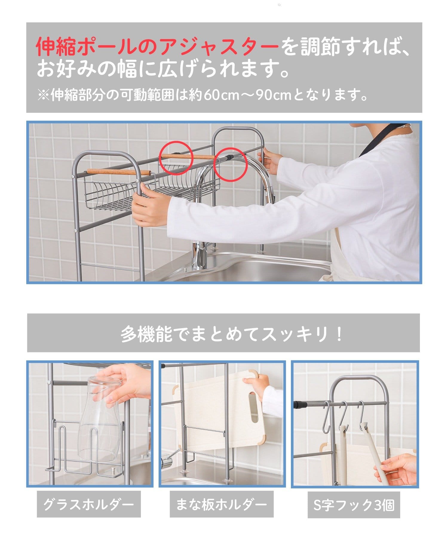 ●伸縮ポールのアジャスターで調整できるので、シンクサイズに合わせて設置可能です◎
