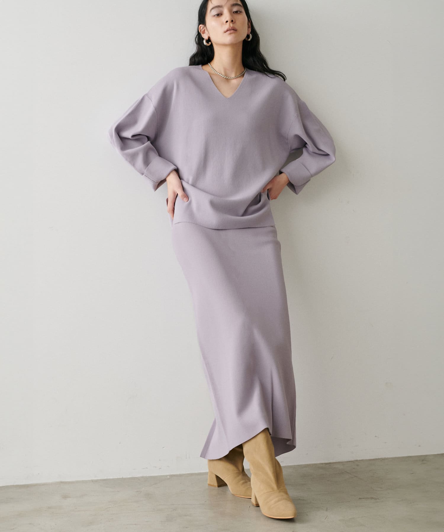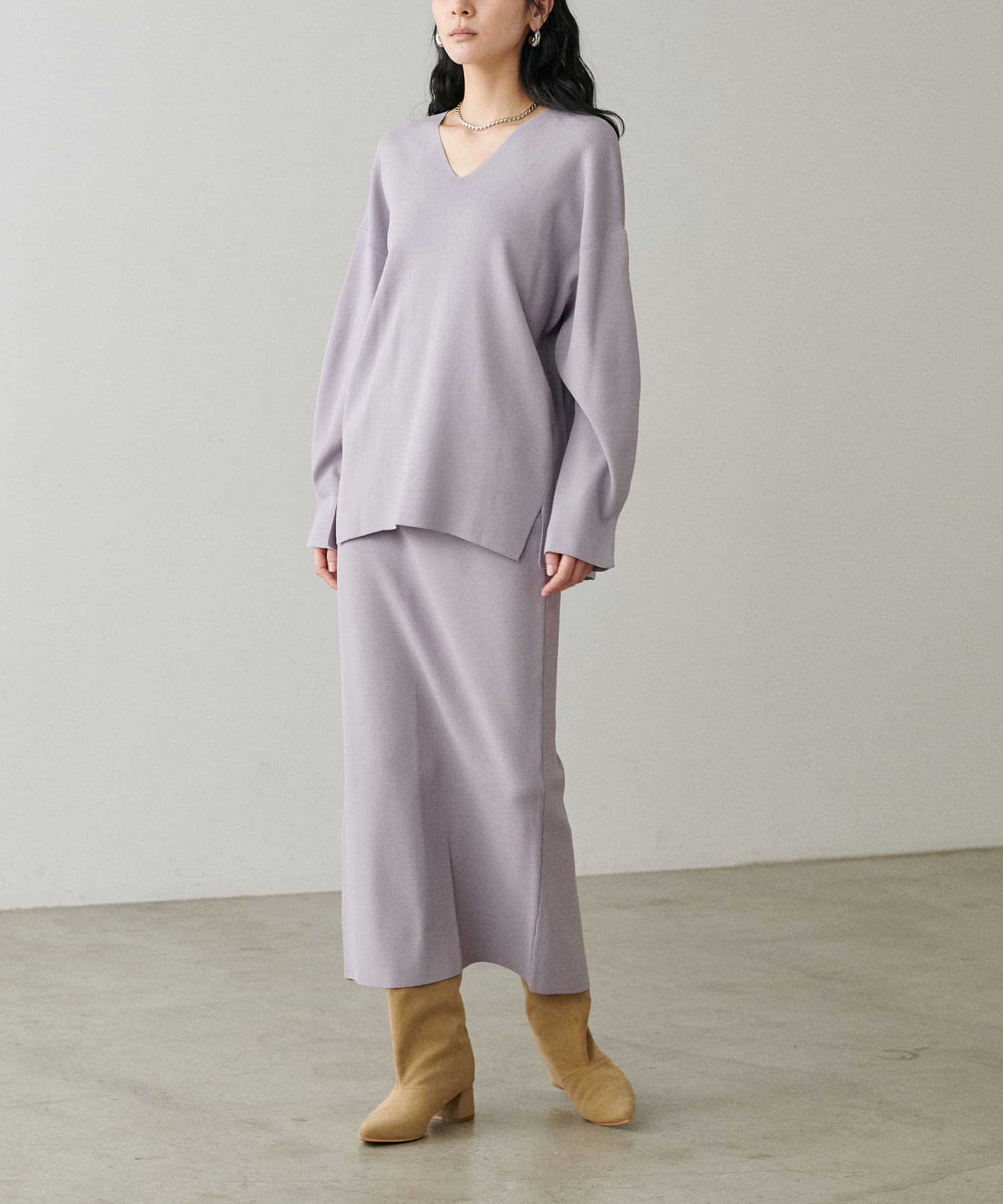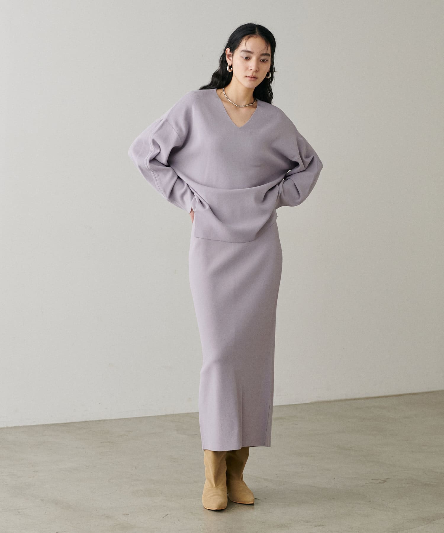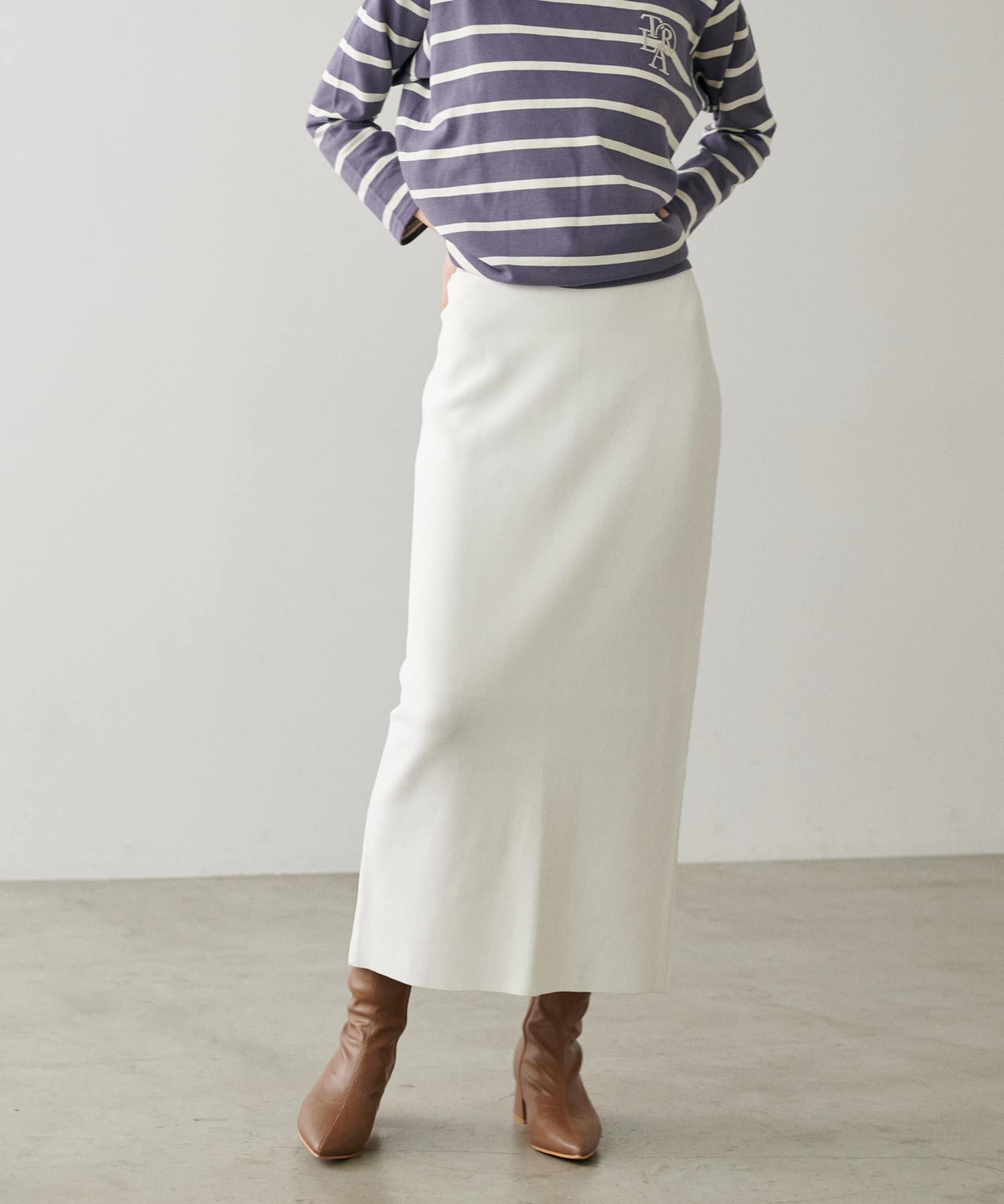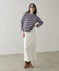 すっきりとしたシルエットのスカートなのでトップスは