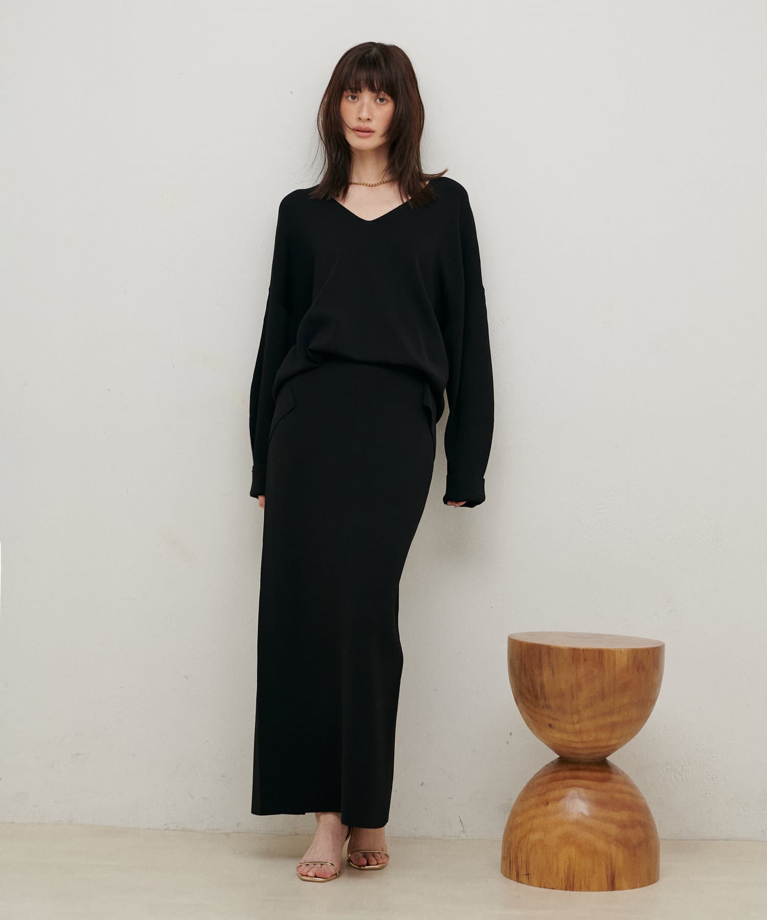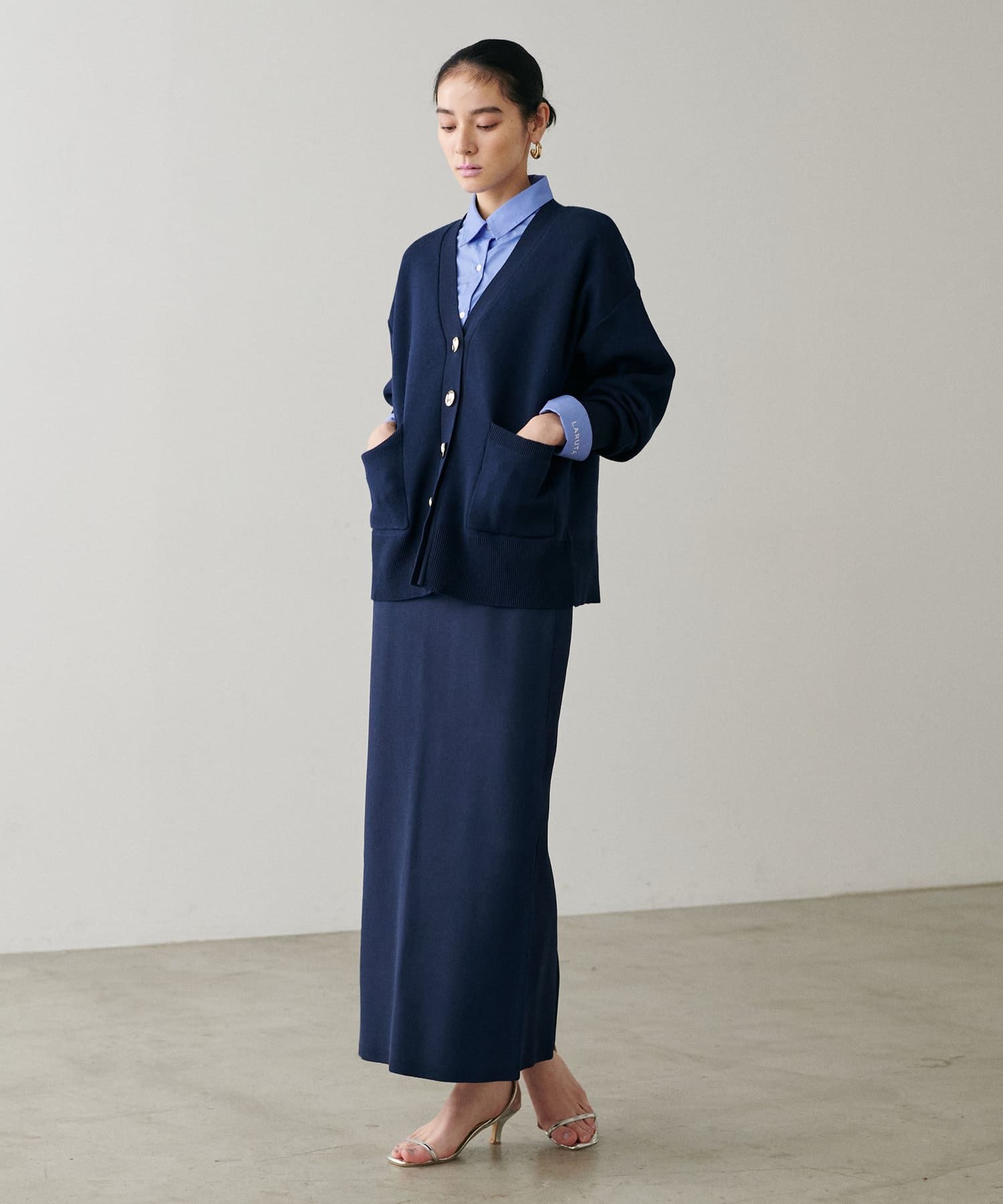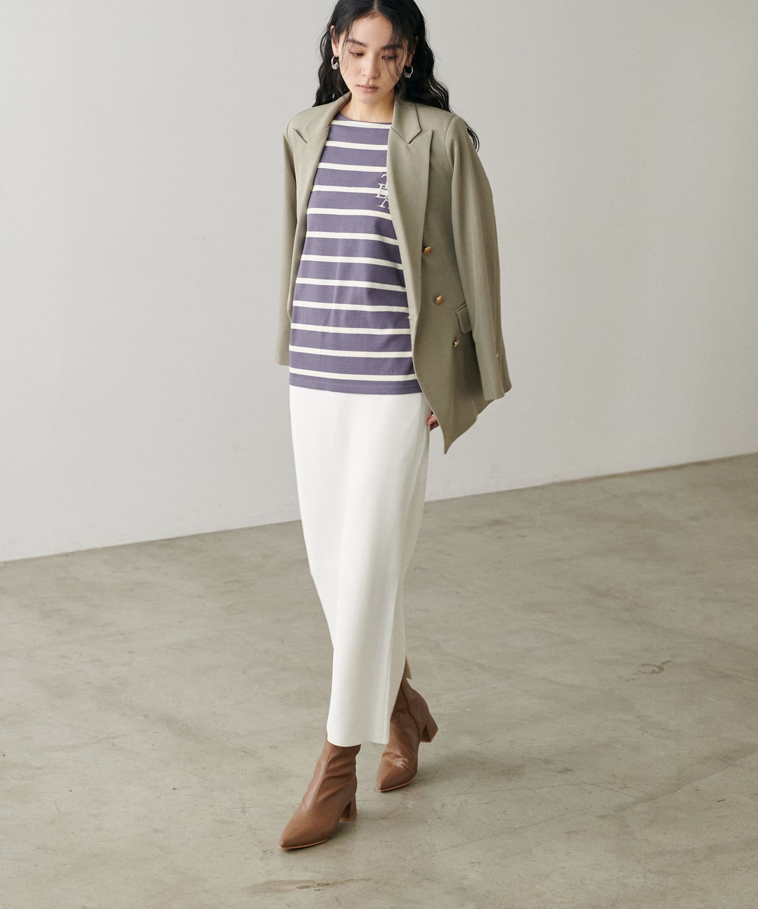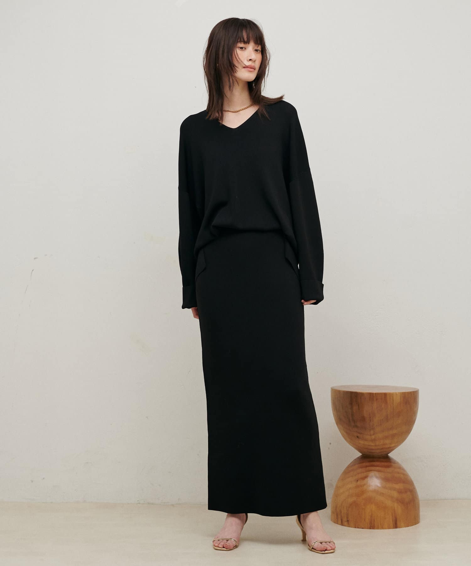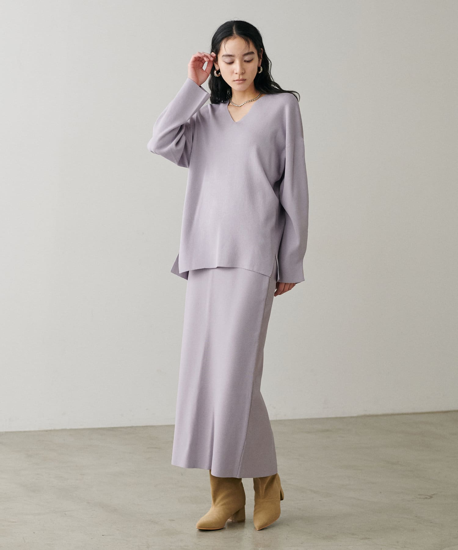 すっきりとしたシルエットのスカートなのでトップスは