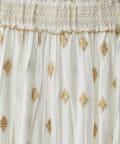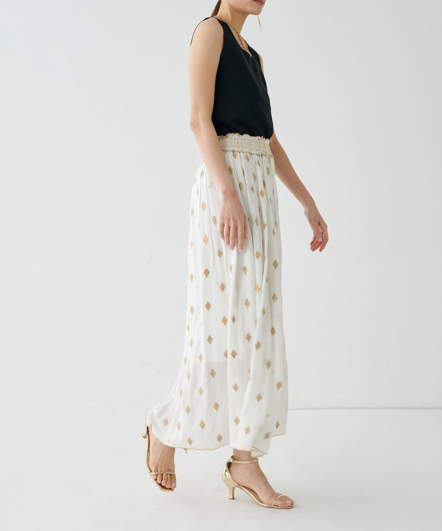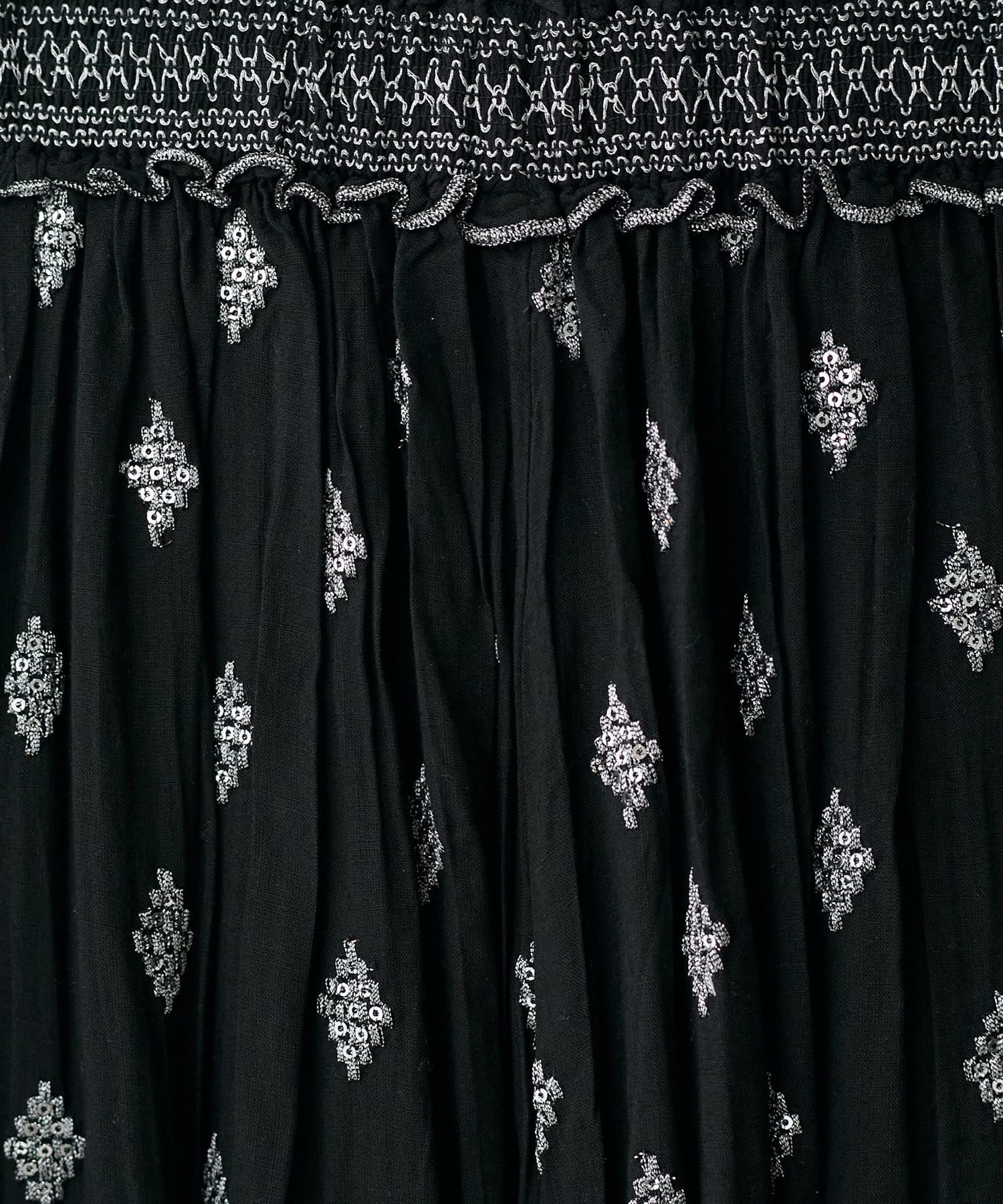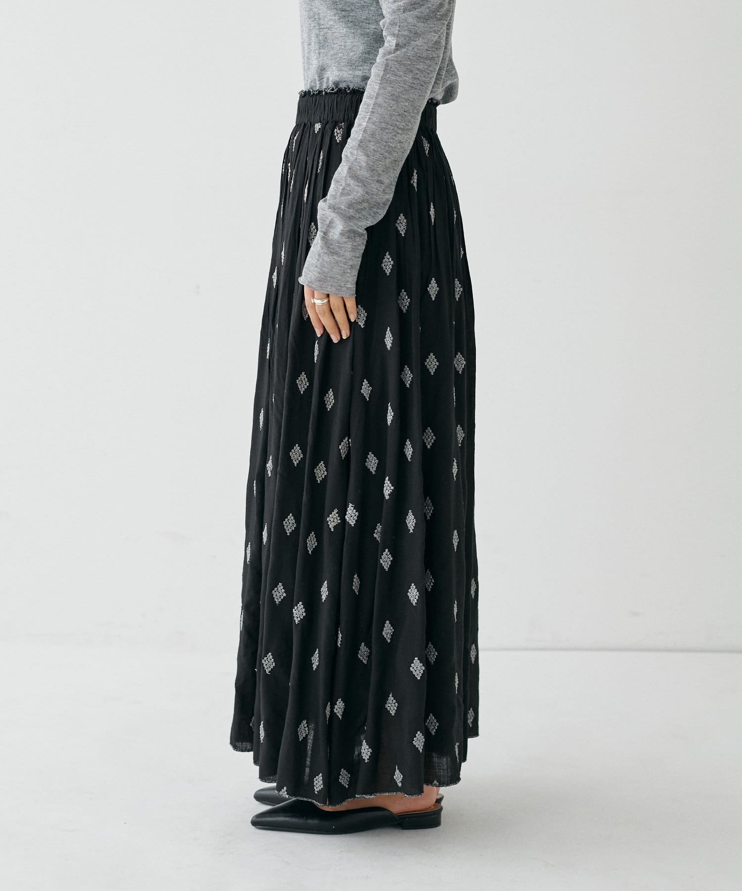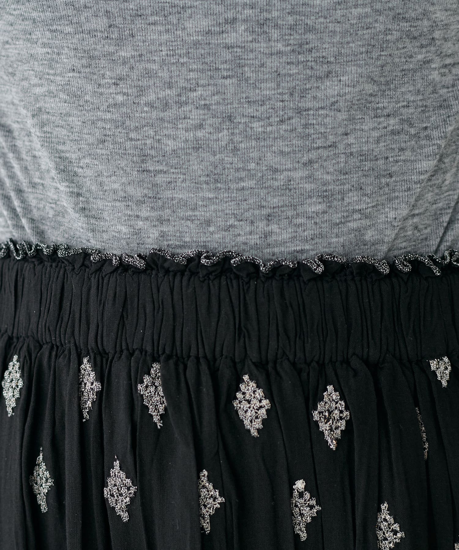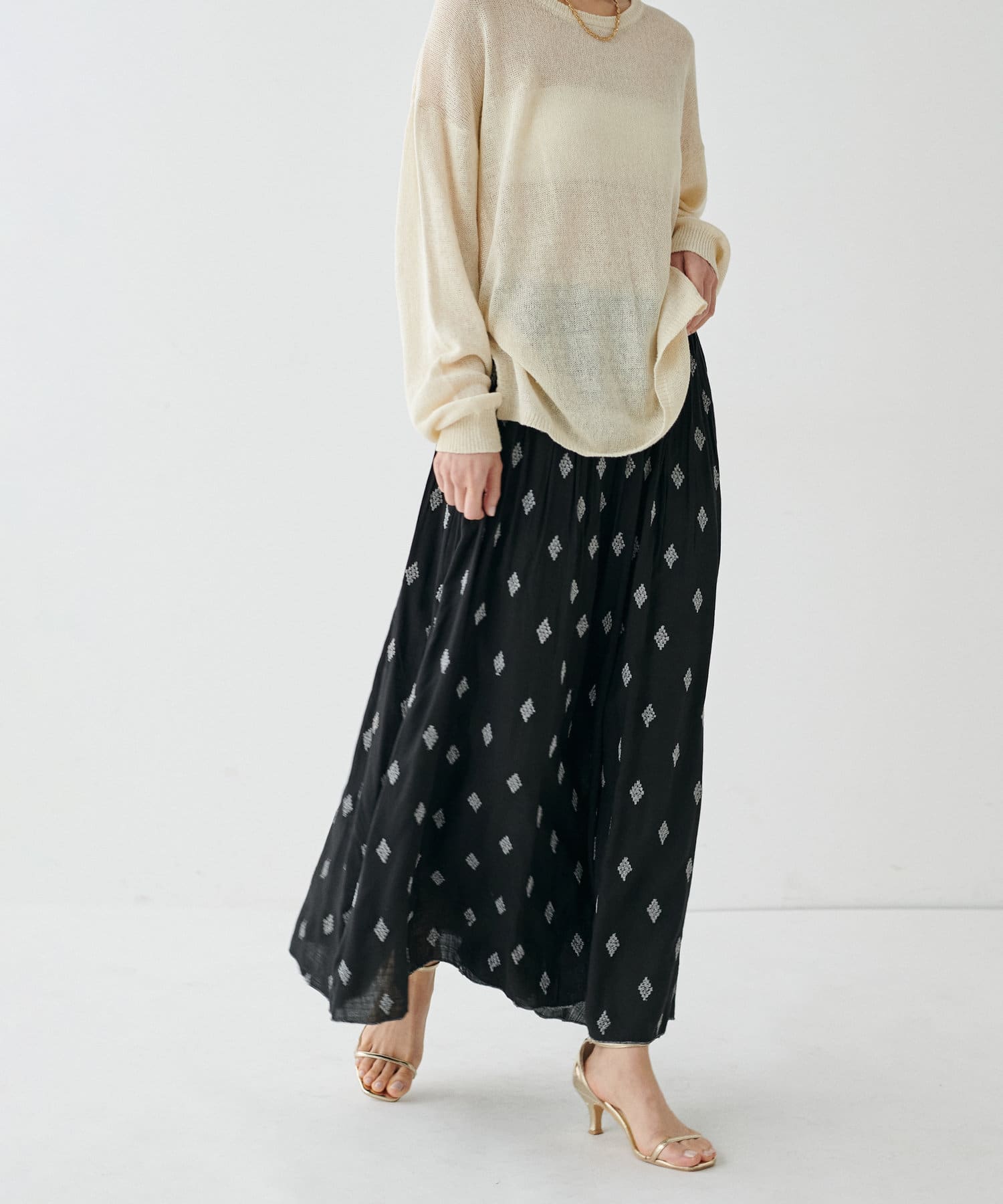 刺繍がアクセントになっています。ウエスト部分はオールゴムなので