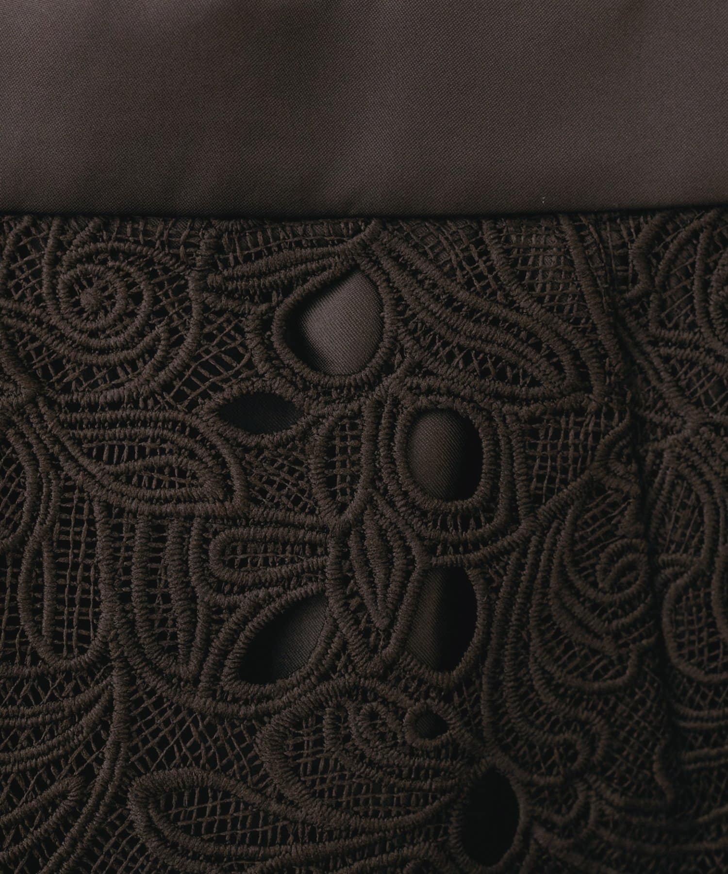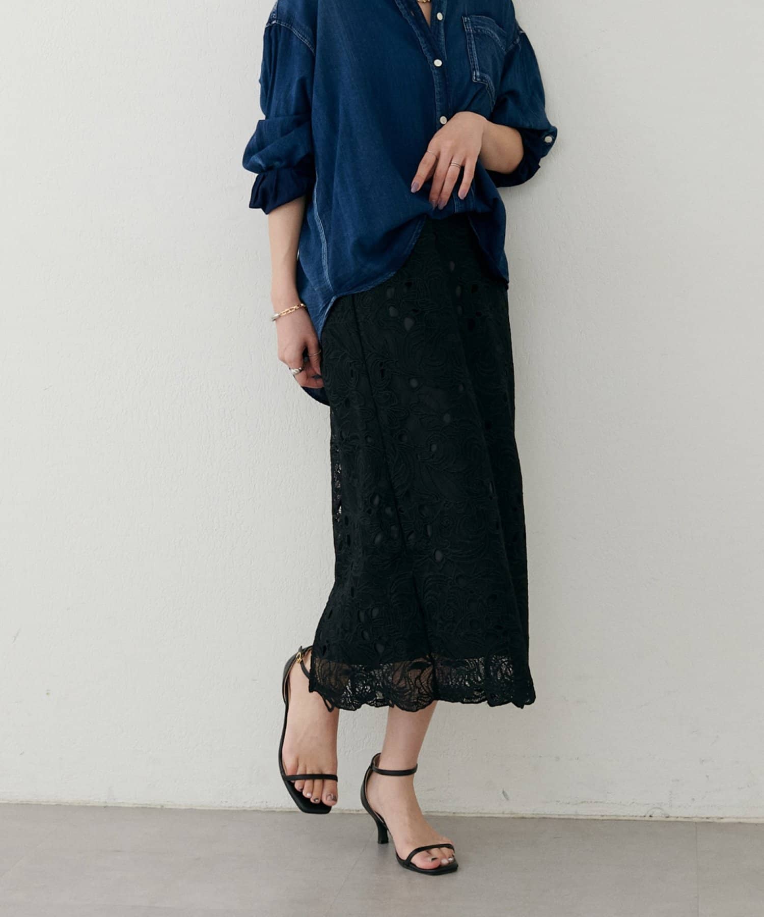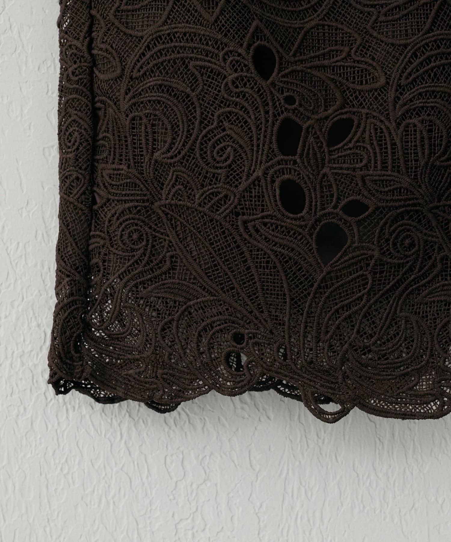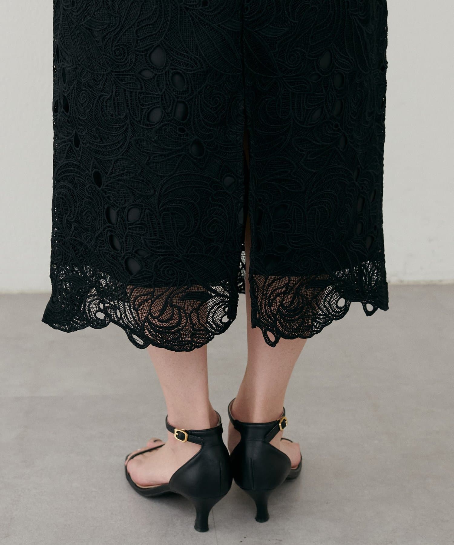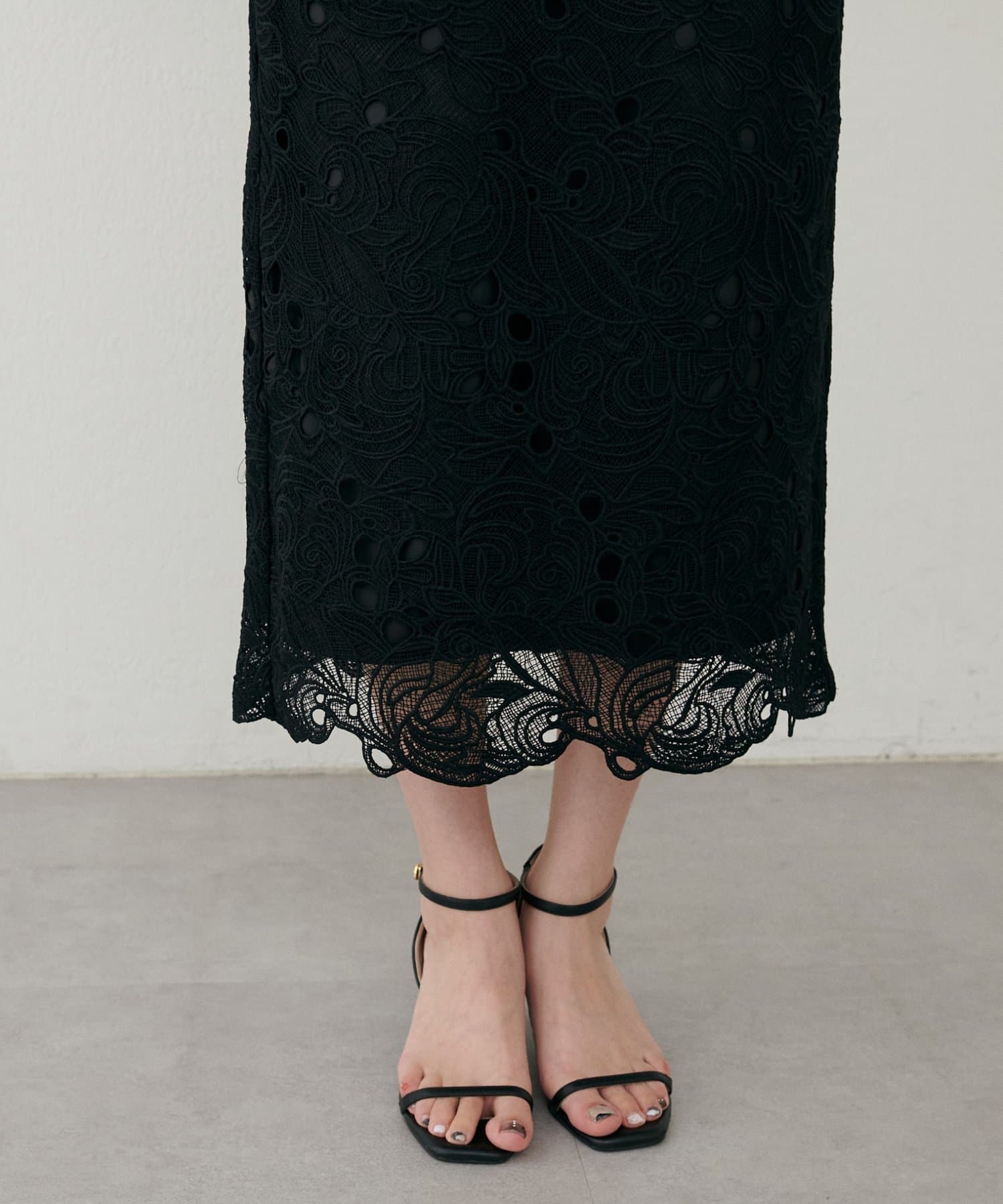 スカート全体に施されたフラワーレースは、甘すぎない大人のためのデザイン。