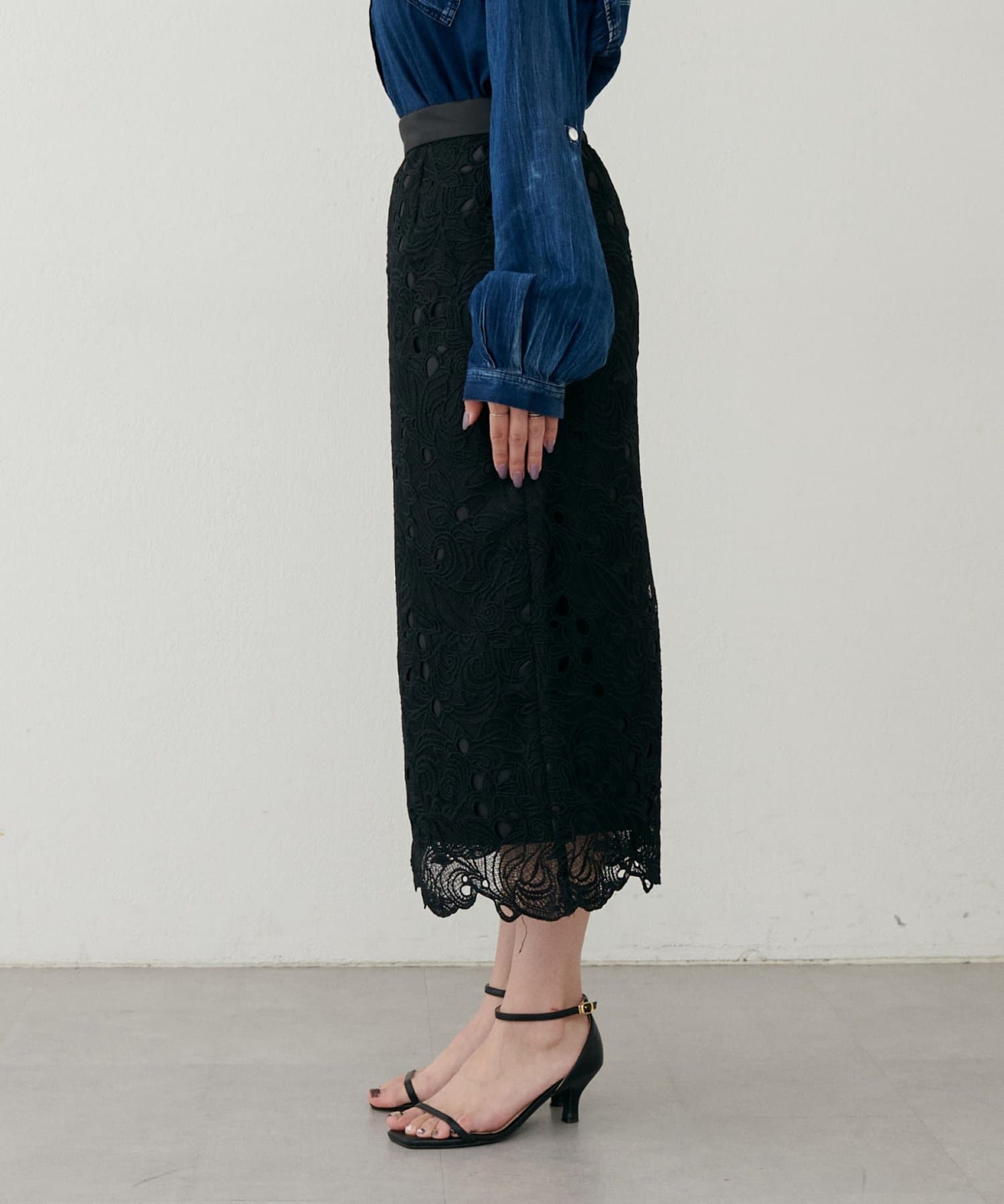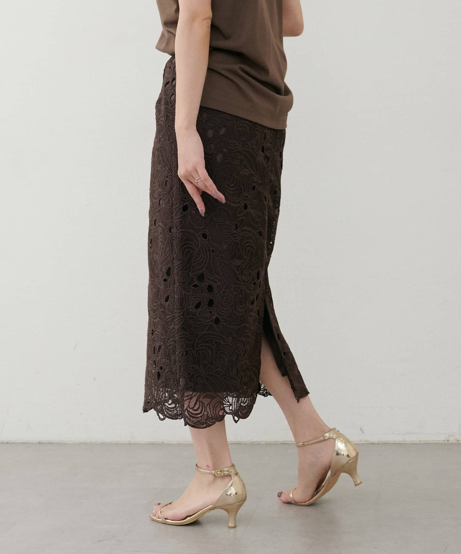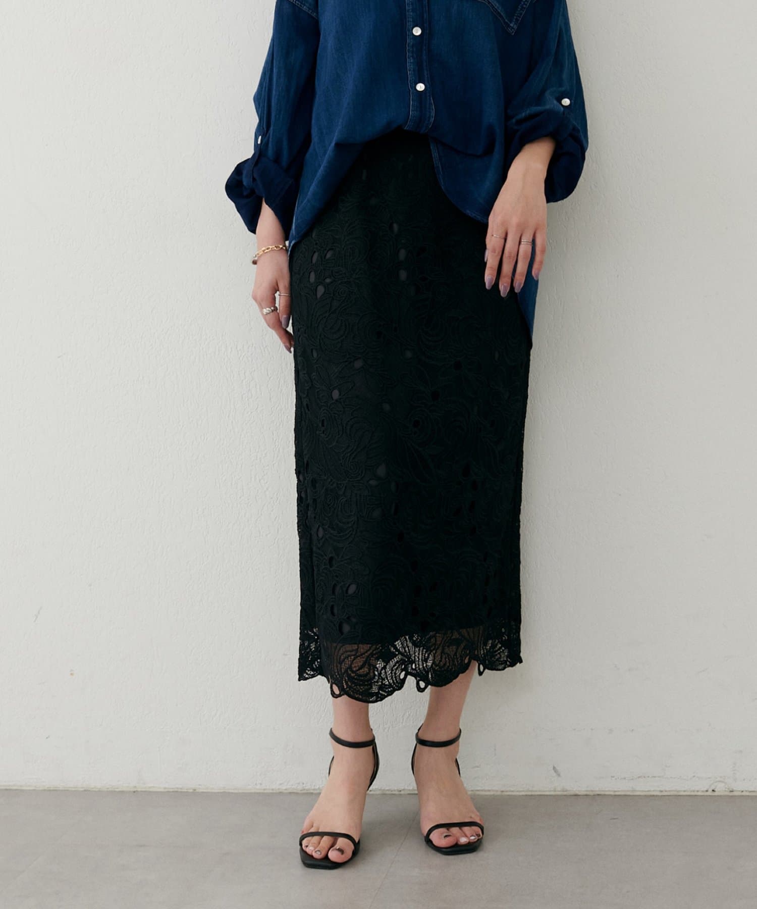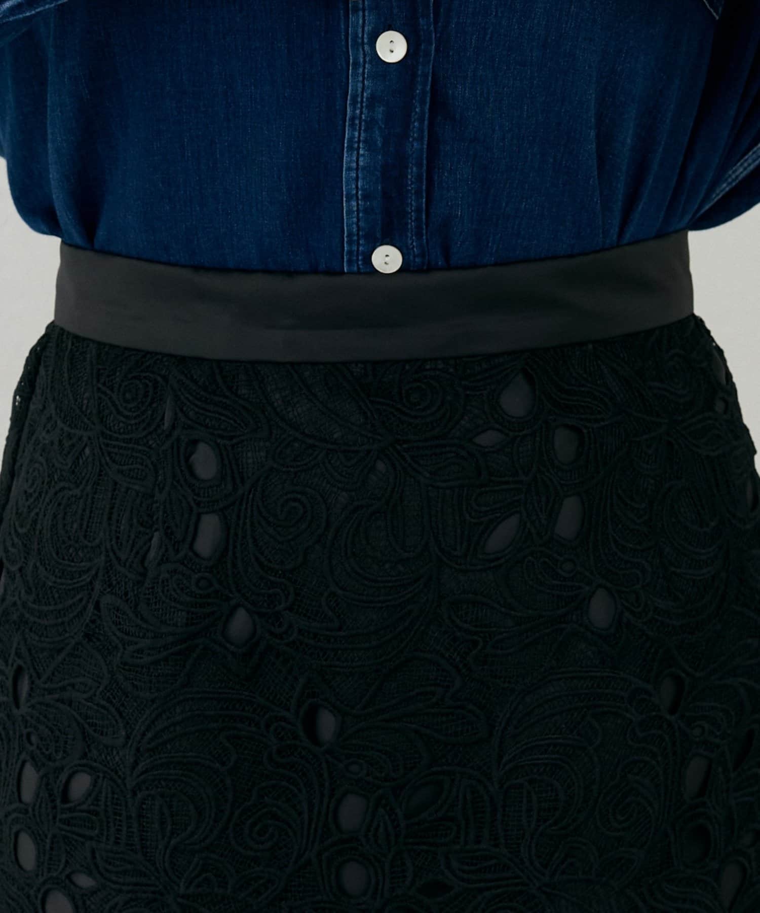 スカート全体に施されたフラワーレースは、甘すぎない大人のためのデザイン。
