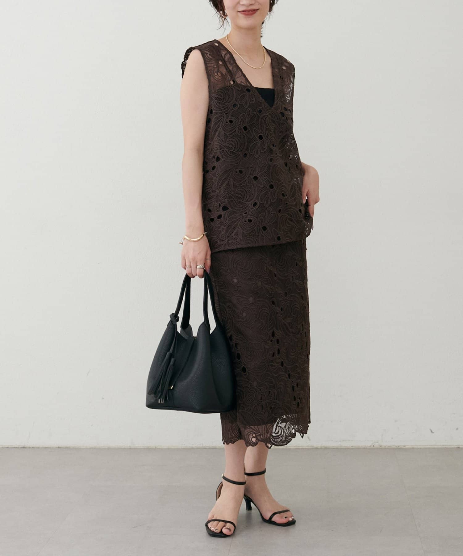 同素材を使用した 3051060640 フラワーレースベスト とのセットアップ着用が可能。