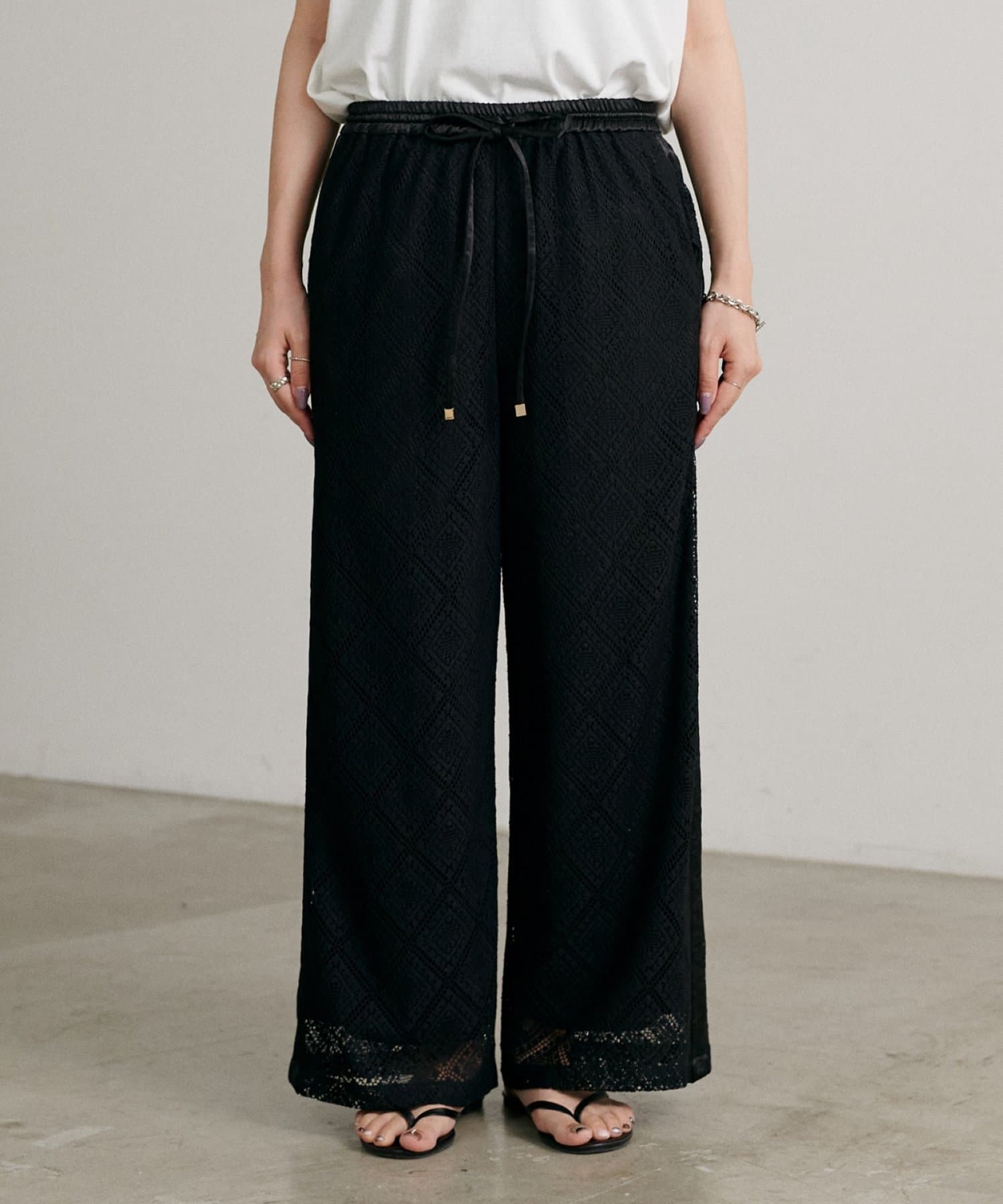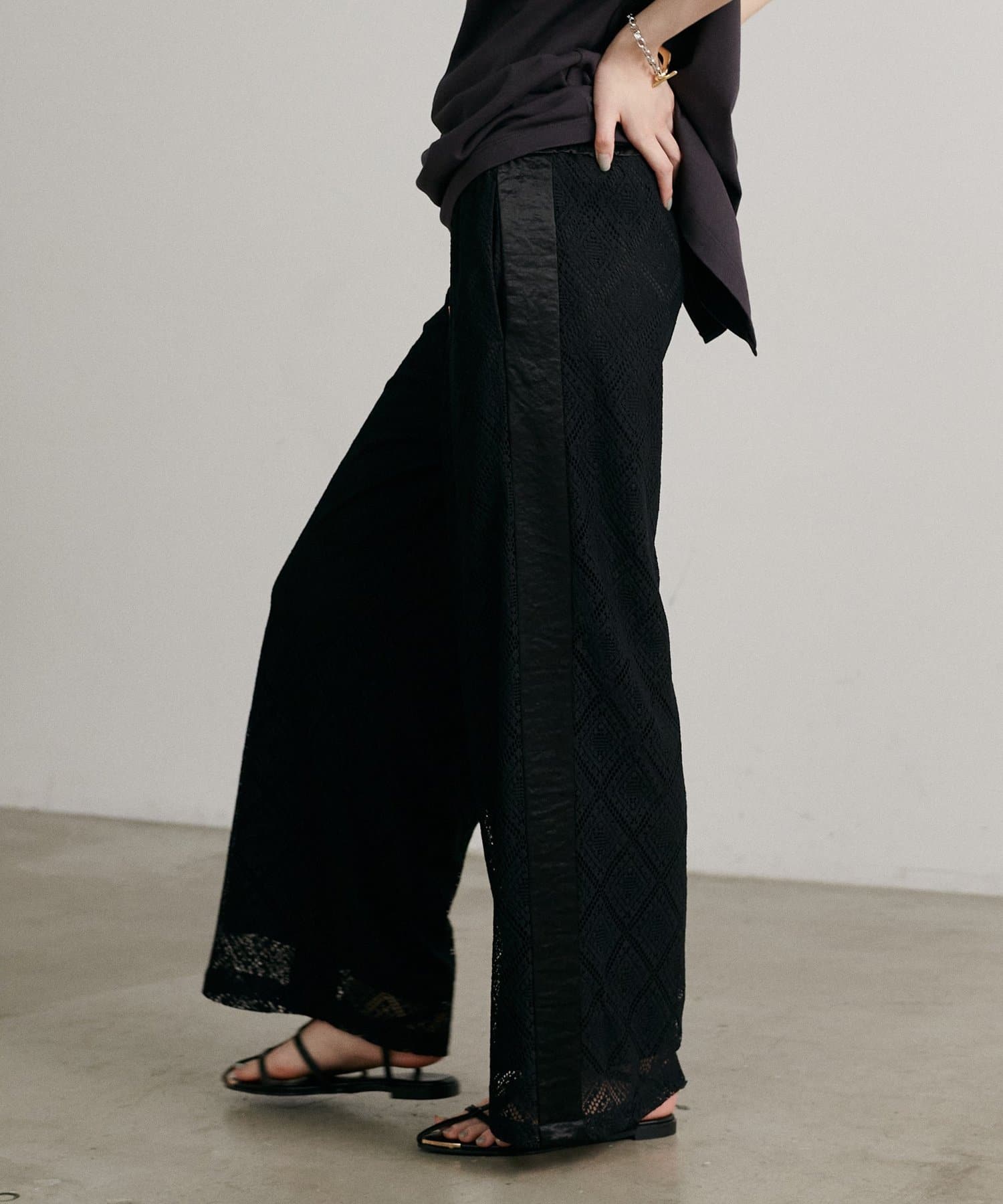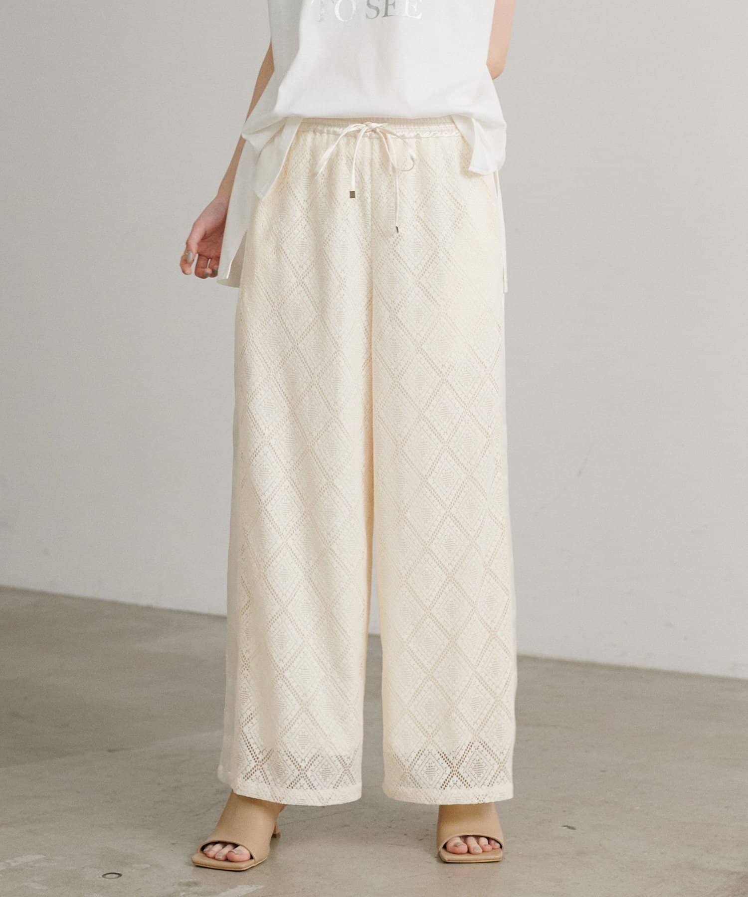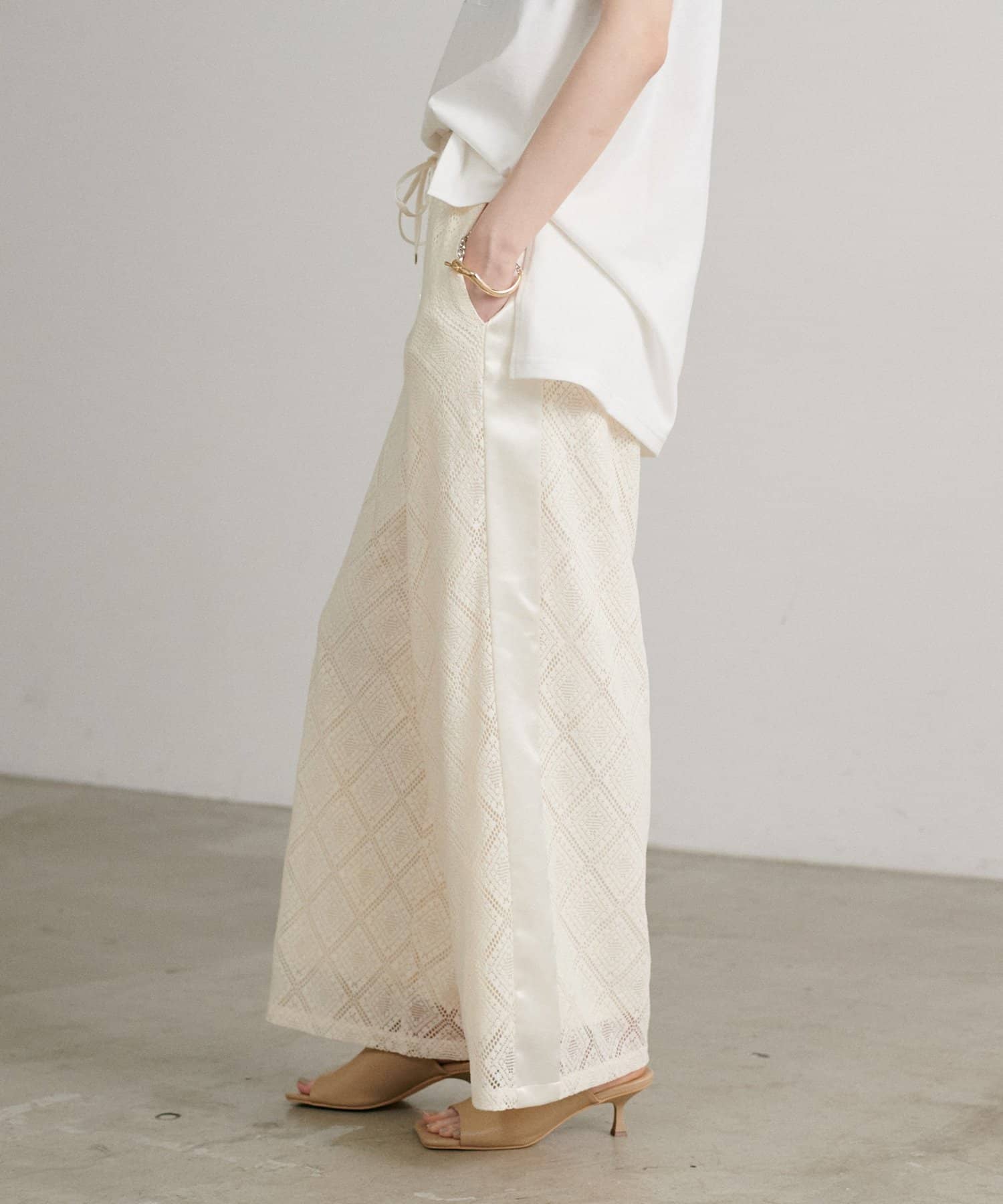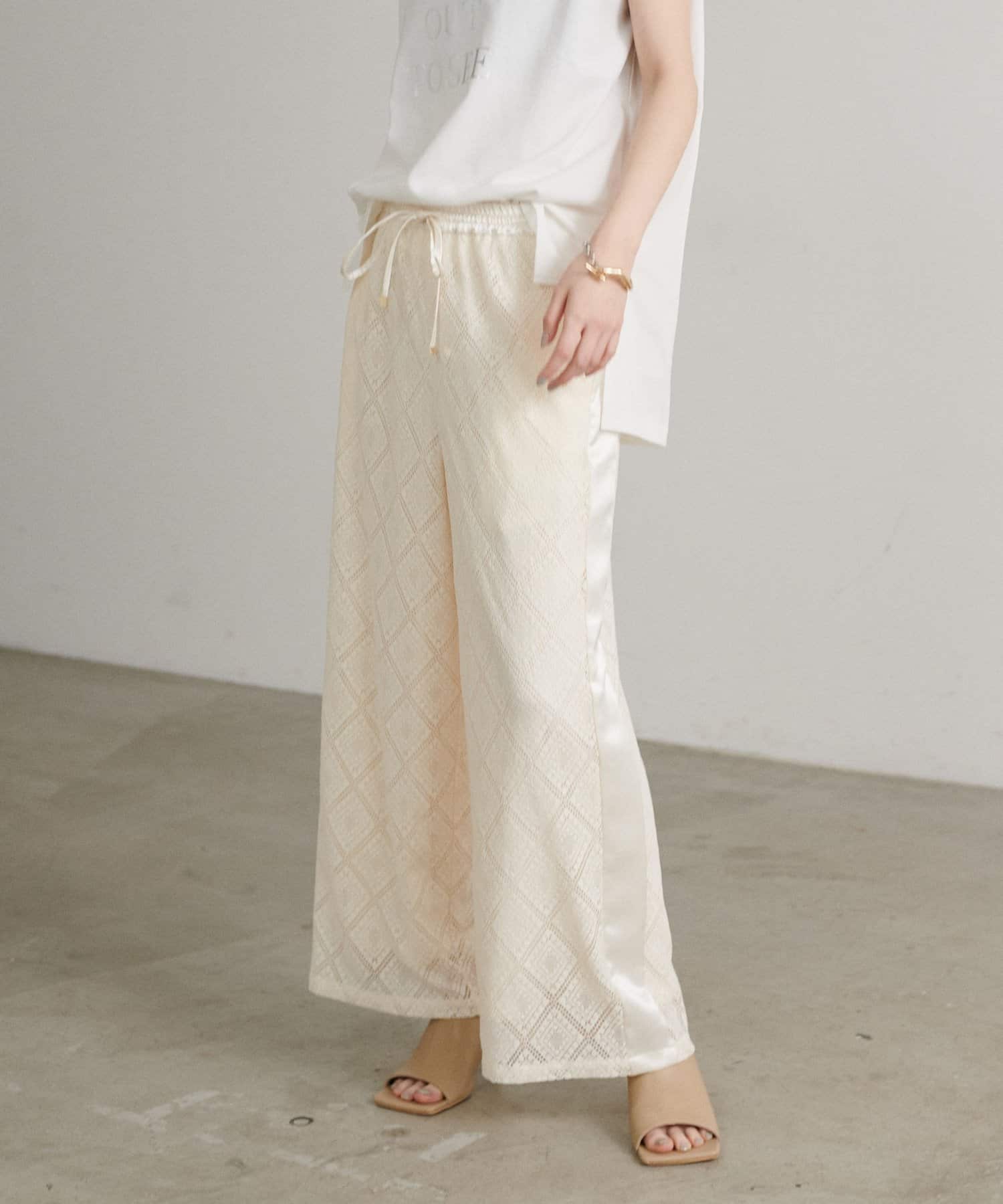 全体にあしらわれたひし柄レースが、甘すぎず大人上品な印象にラインパンツ。