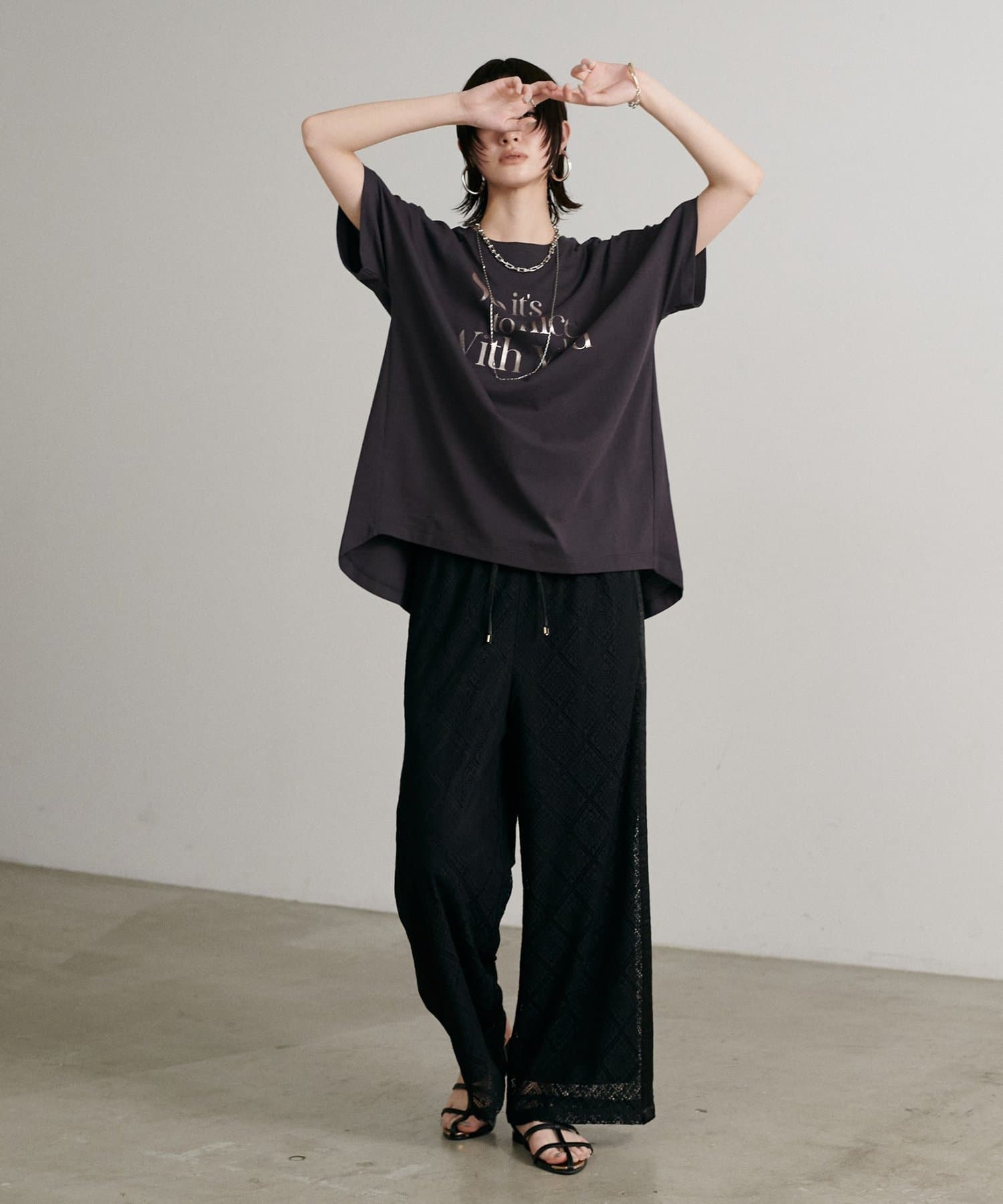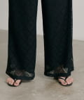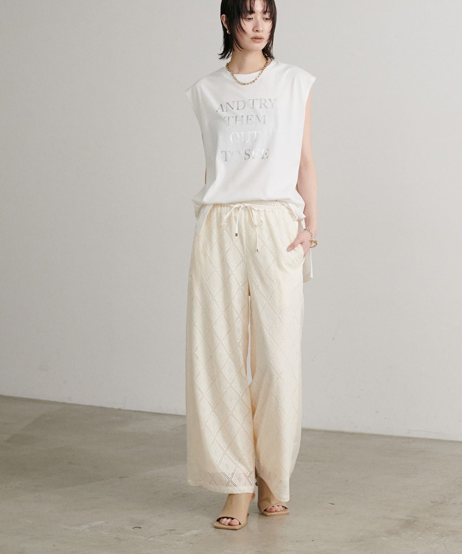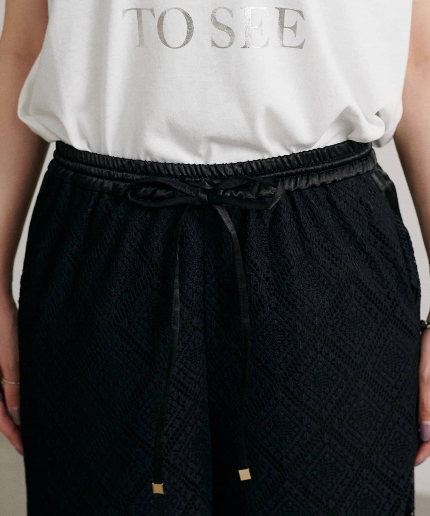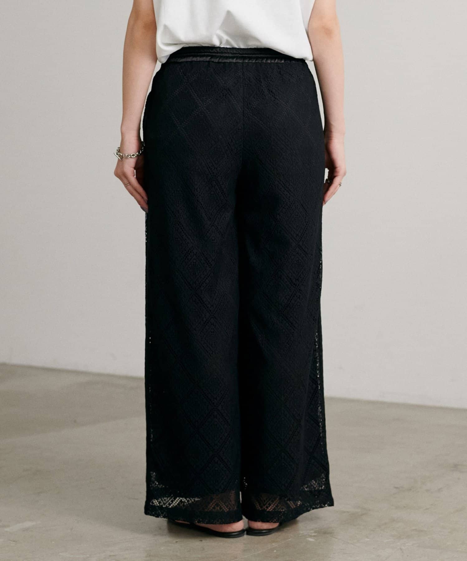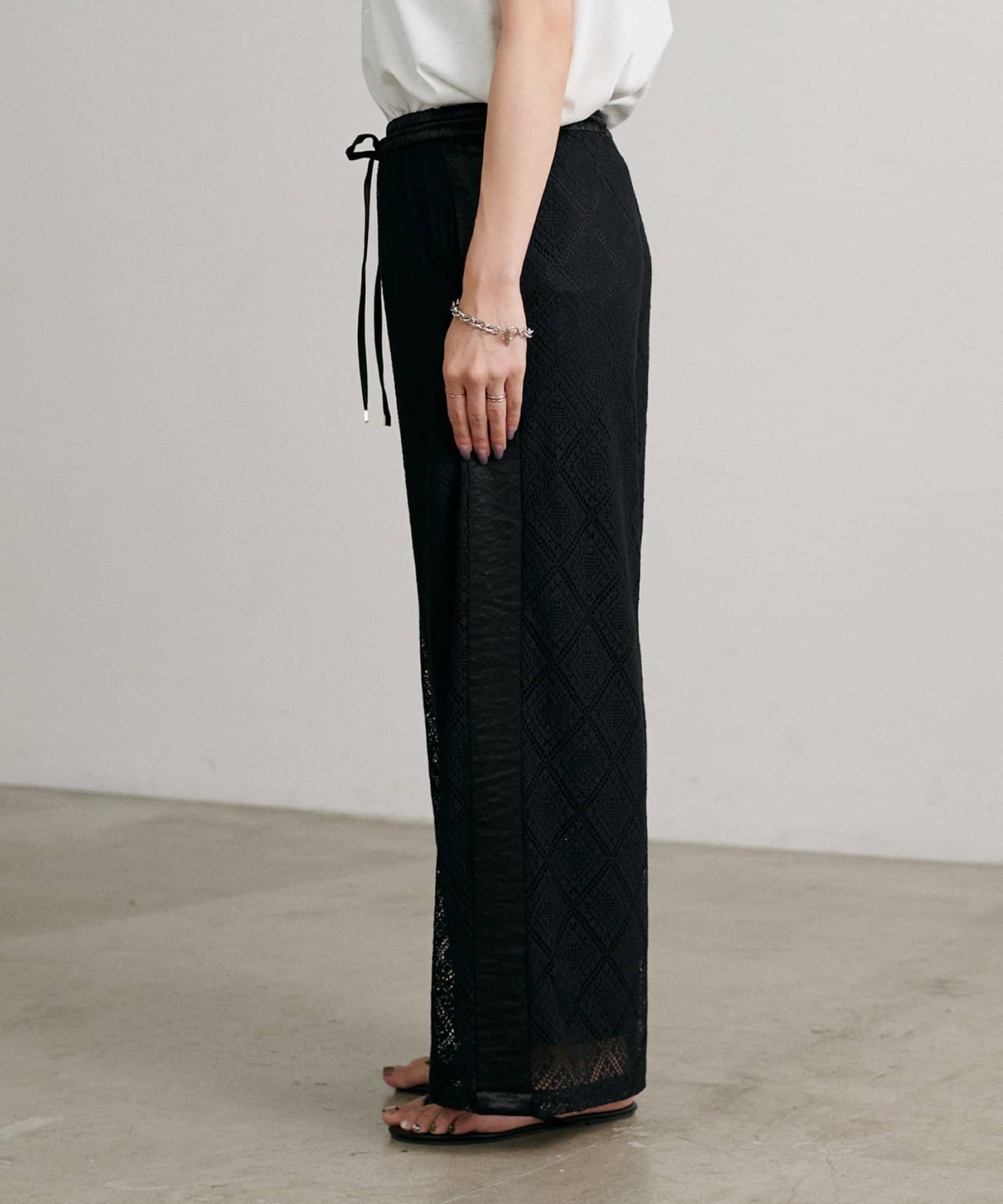 全体にあしらわれたひし柄レースが、甘すぎず大人上品な印象にラインパンツ。