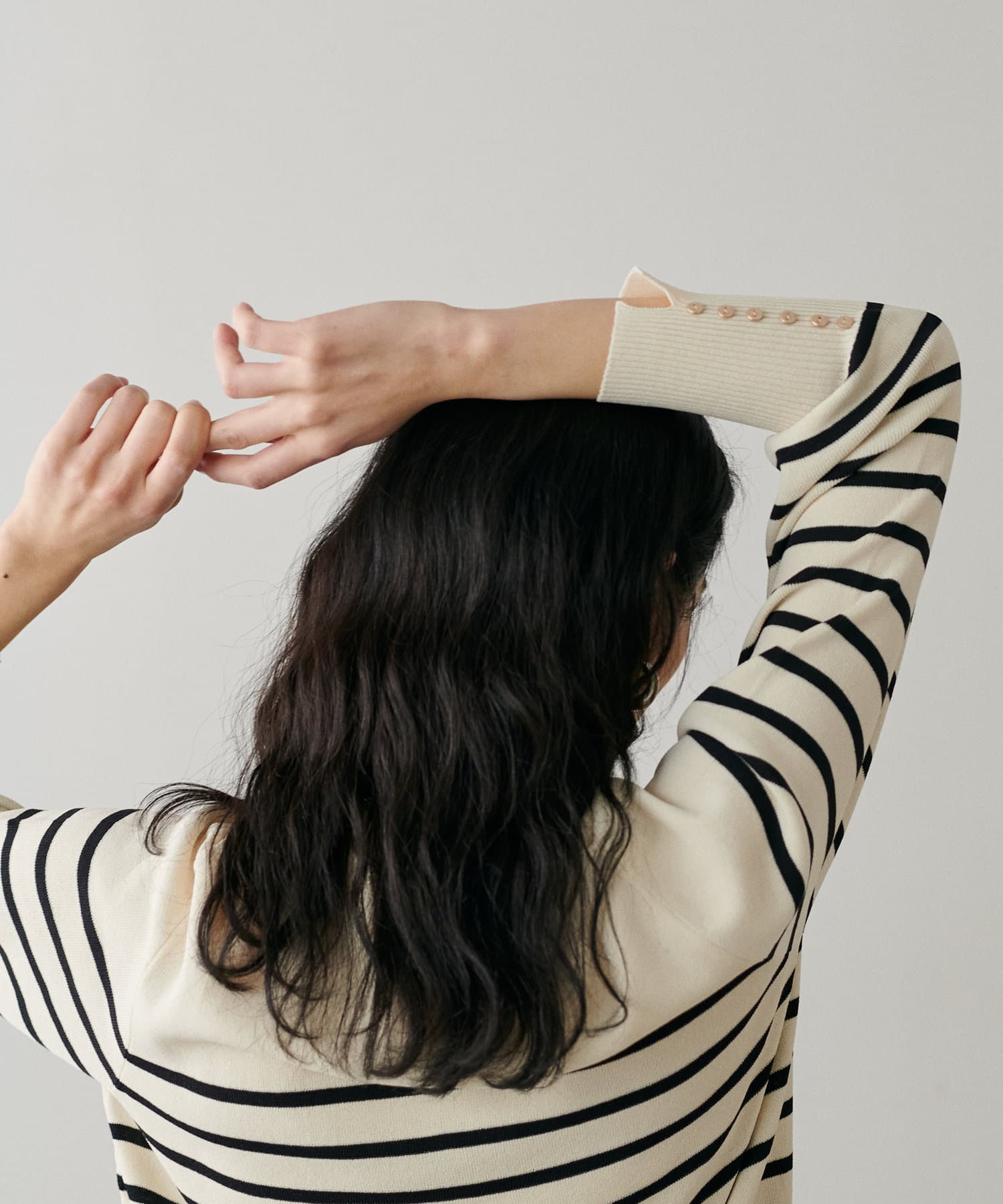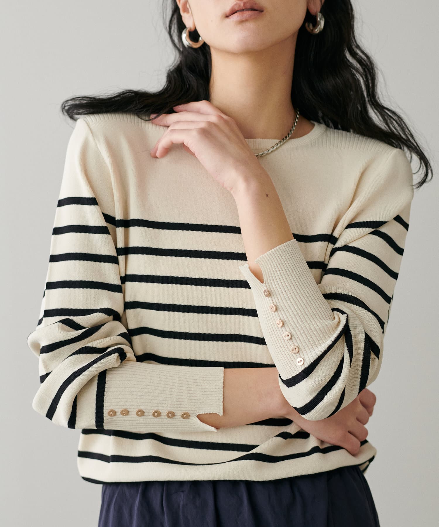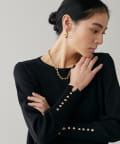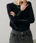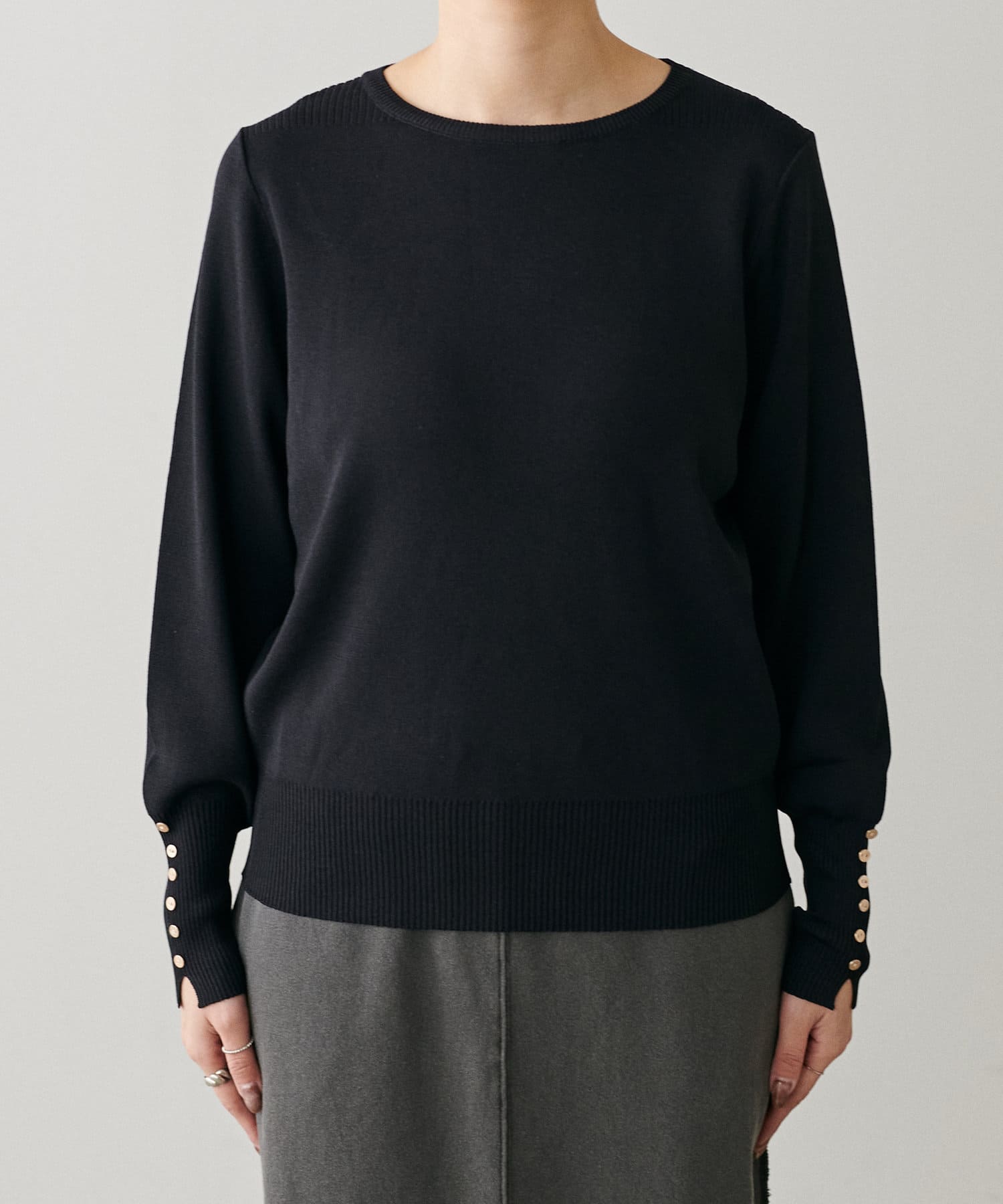 シンプルながらも、袖口はロングカフスに金ボタンを並べた大人上品な1枚。