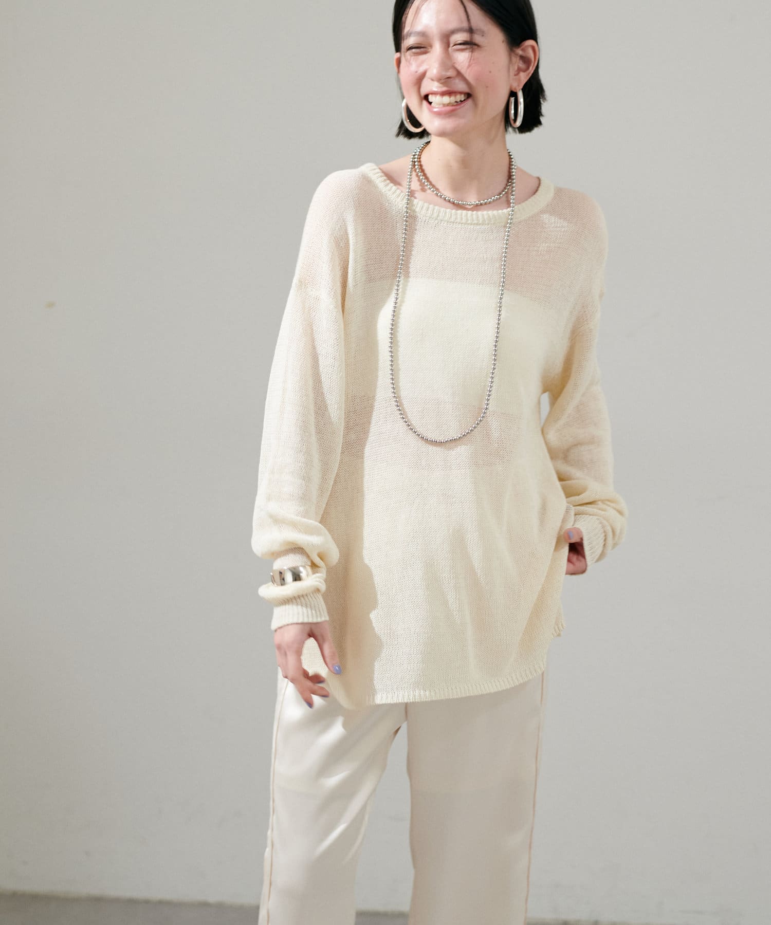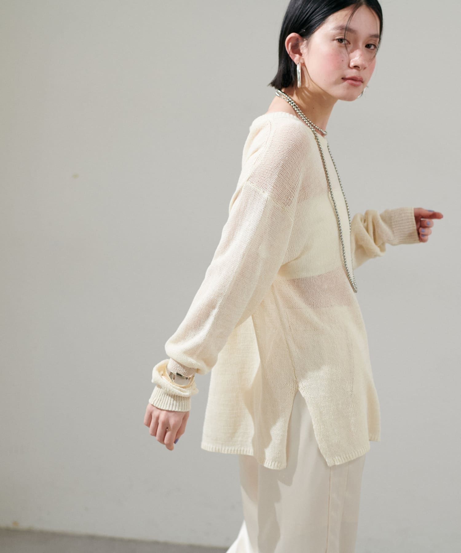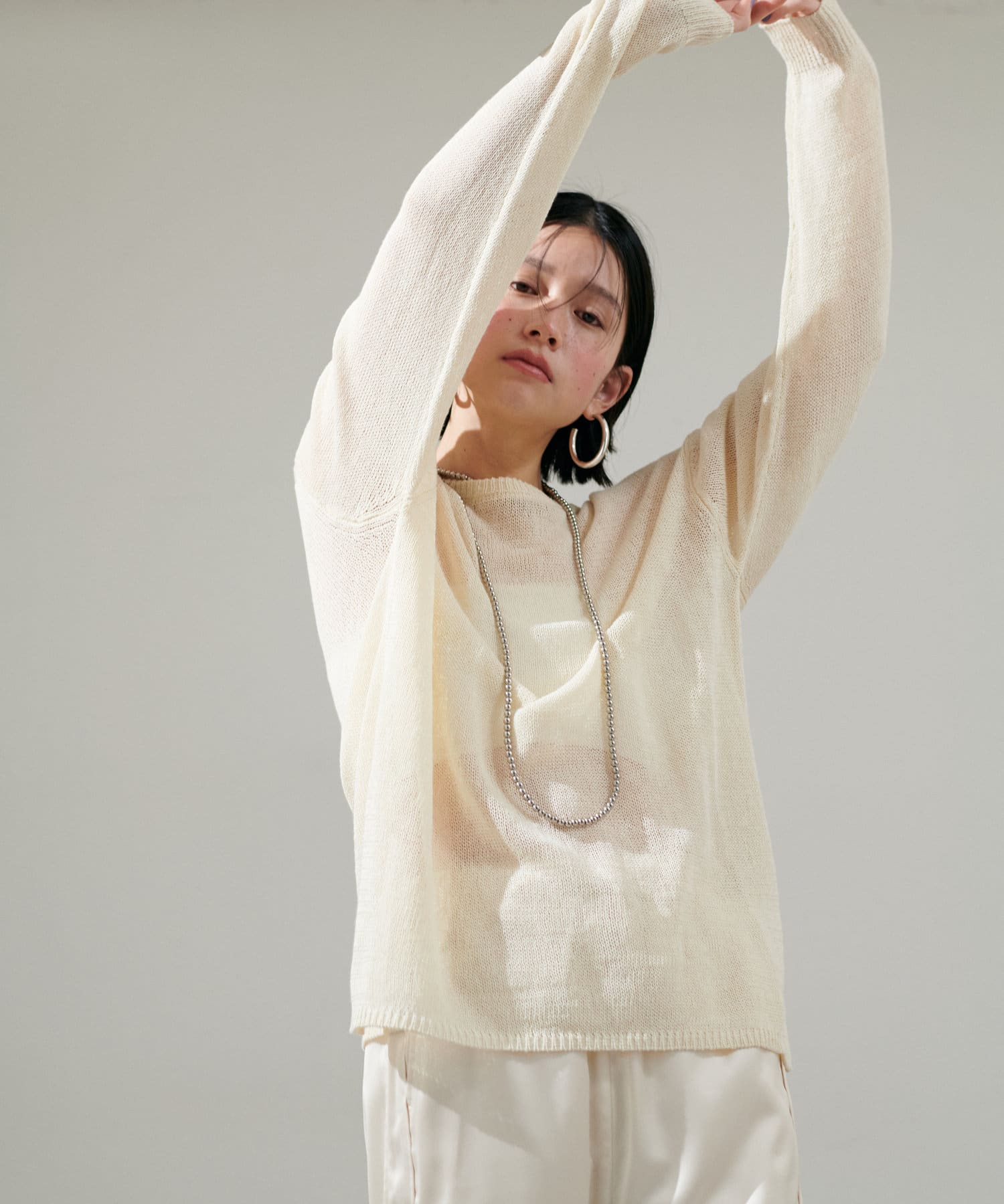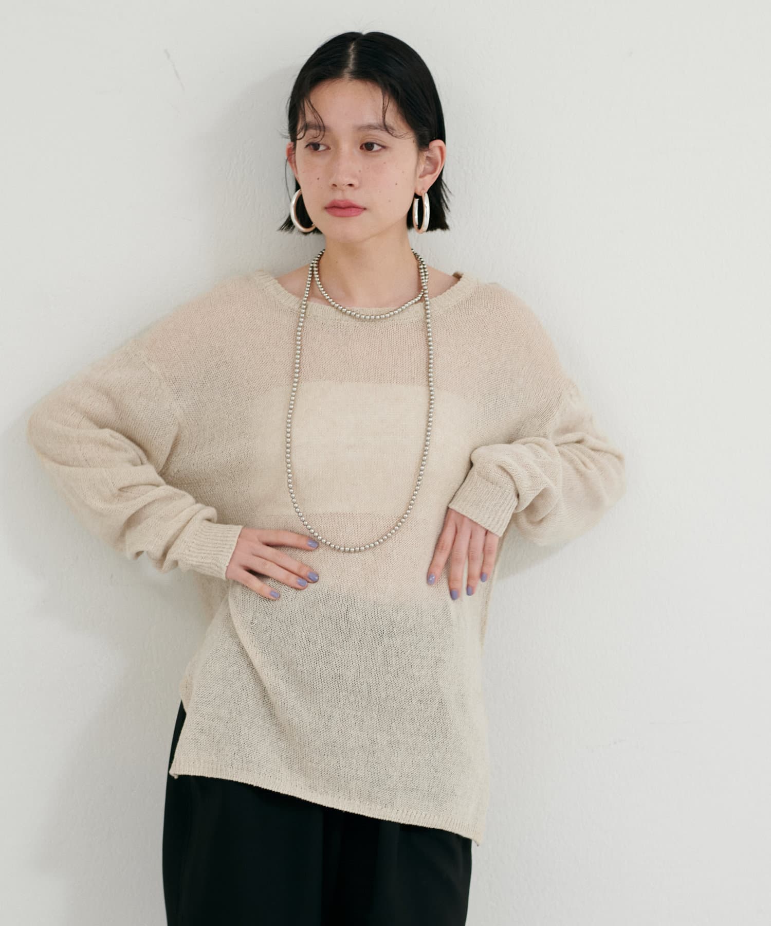 インナー次第で様々な表情にアレンジできるシアーニットは、同色のキャミソールを合わせたヘルシーな肌見せはもちろん、色差を付けたインナーでしっかりと透け感を楽しむのも◎
