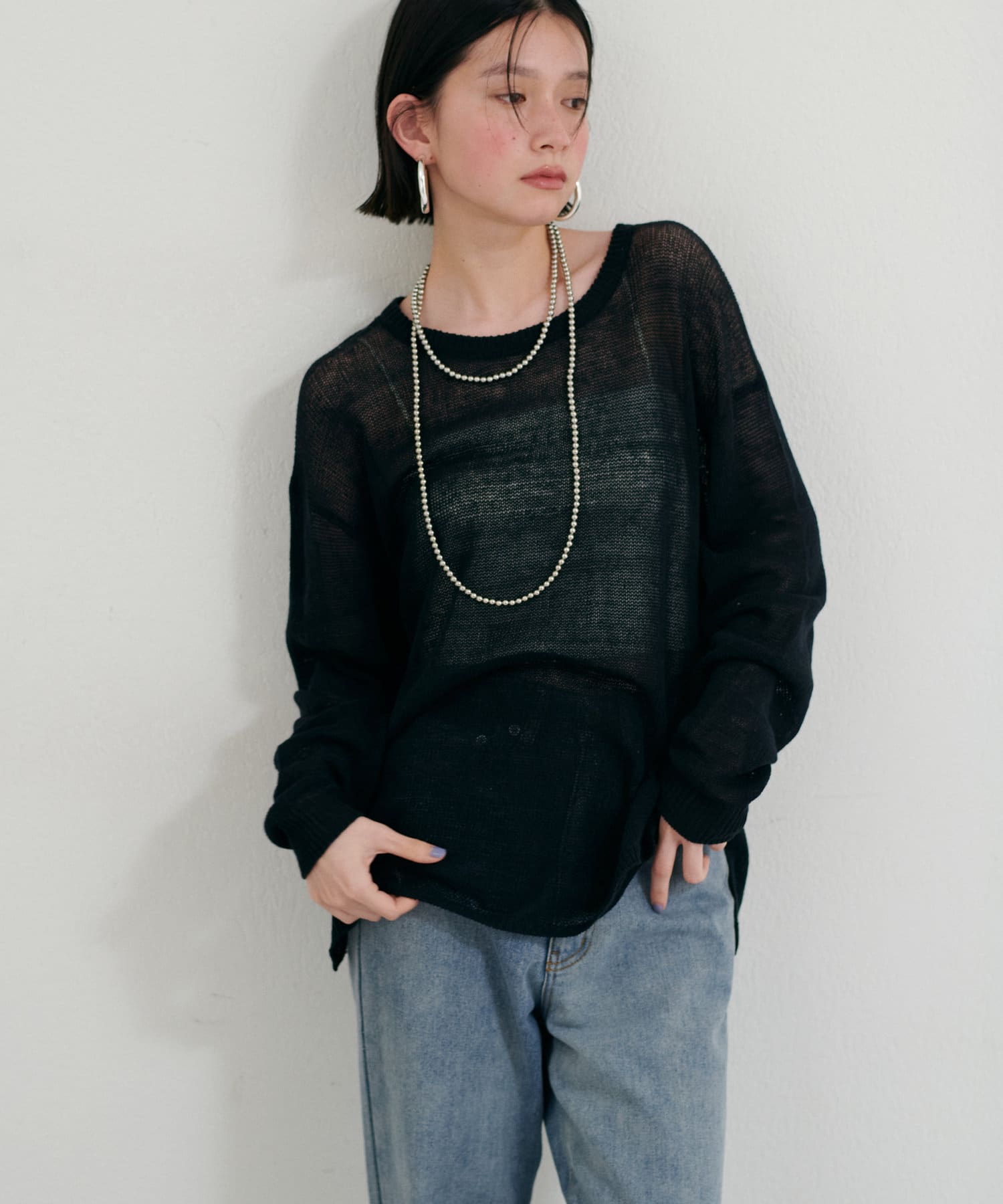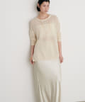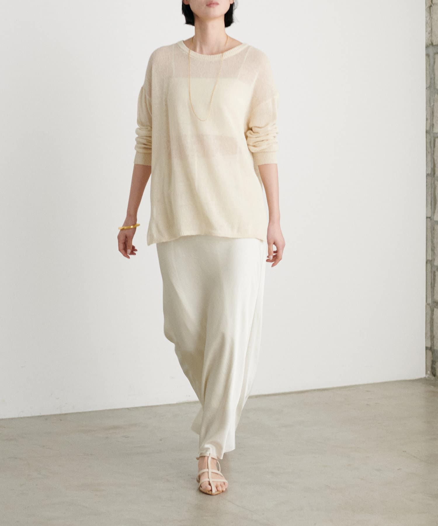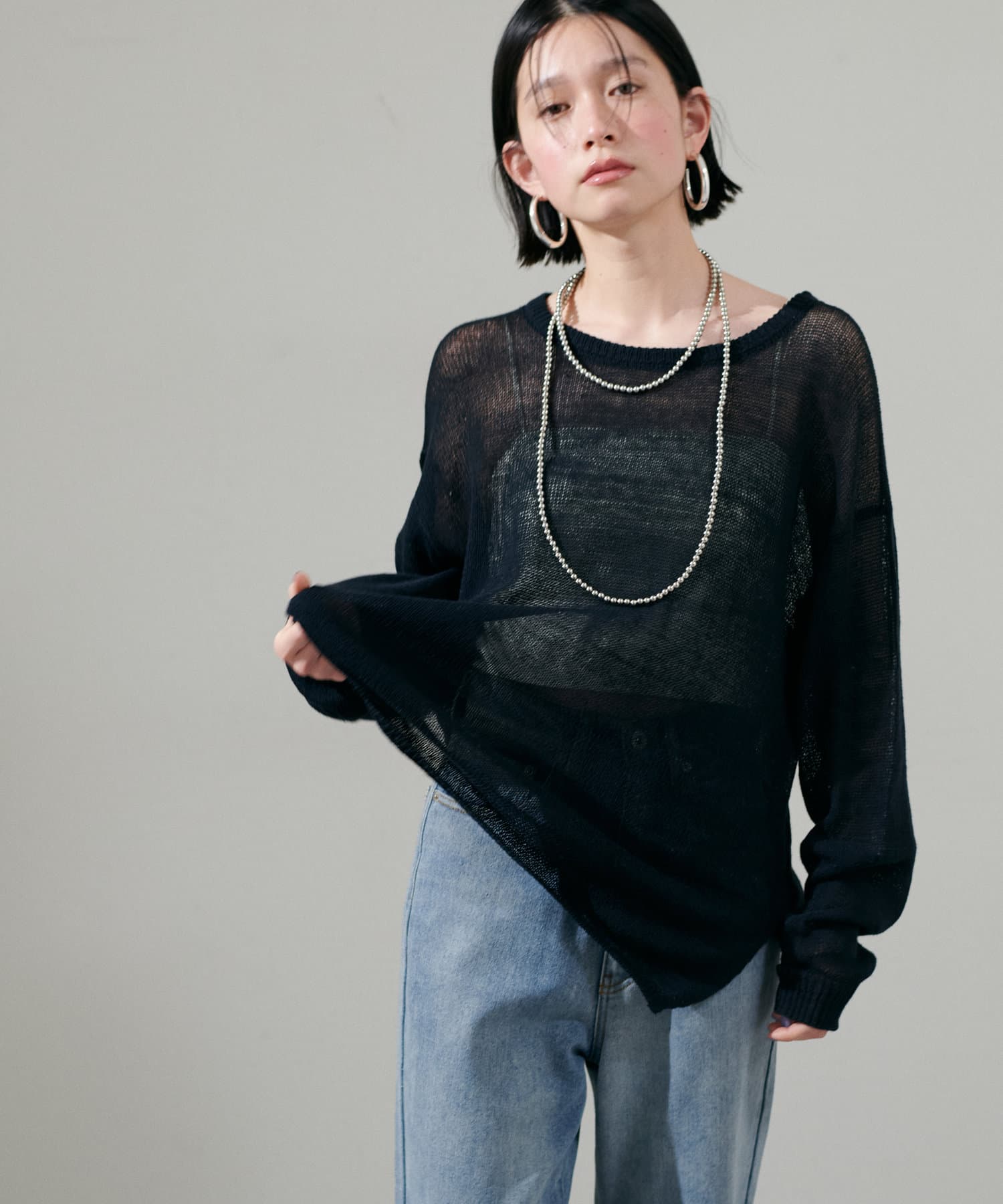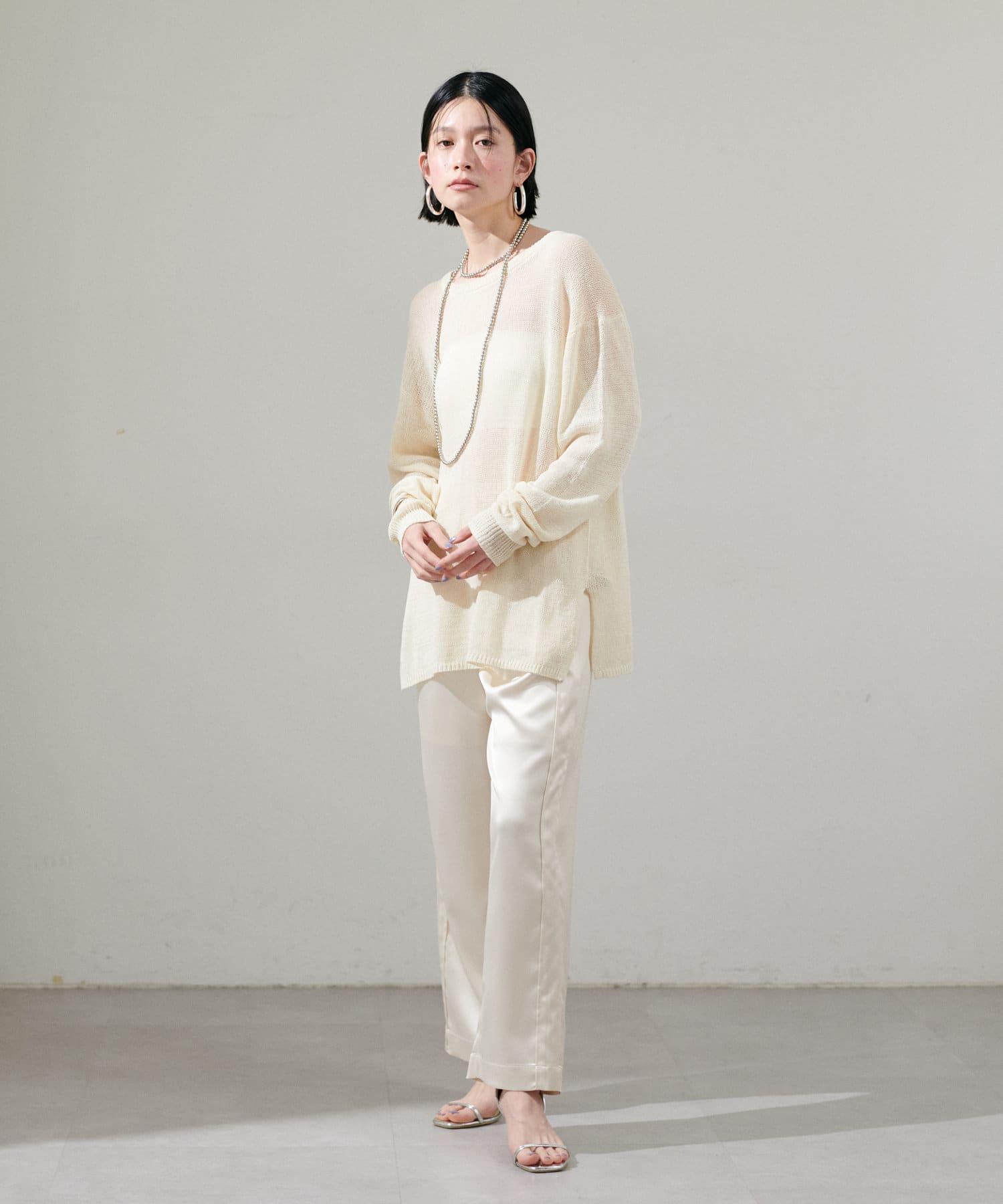 インナー次第で様々な表情にアレンジできるシアーニットは、同色のキャミソールを合わせたヘルシーな肌見せはもちろん、色差を付けたインナーでしっかりと透け感を楽しむのも◎