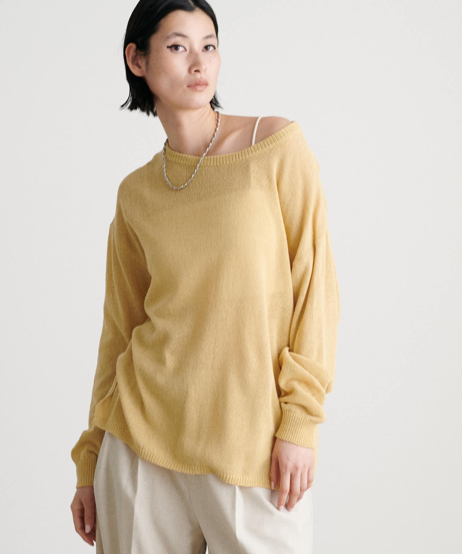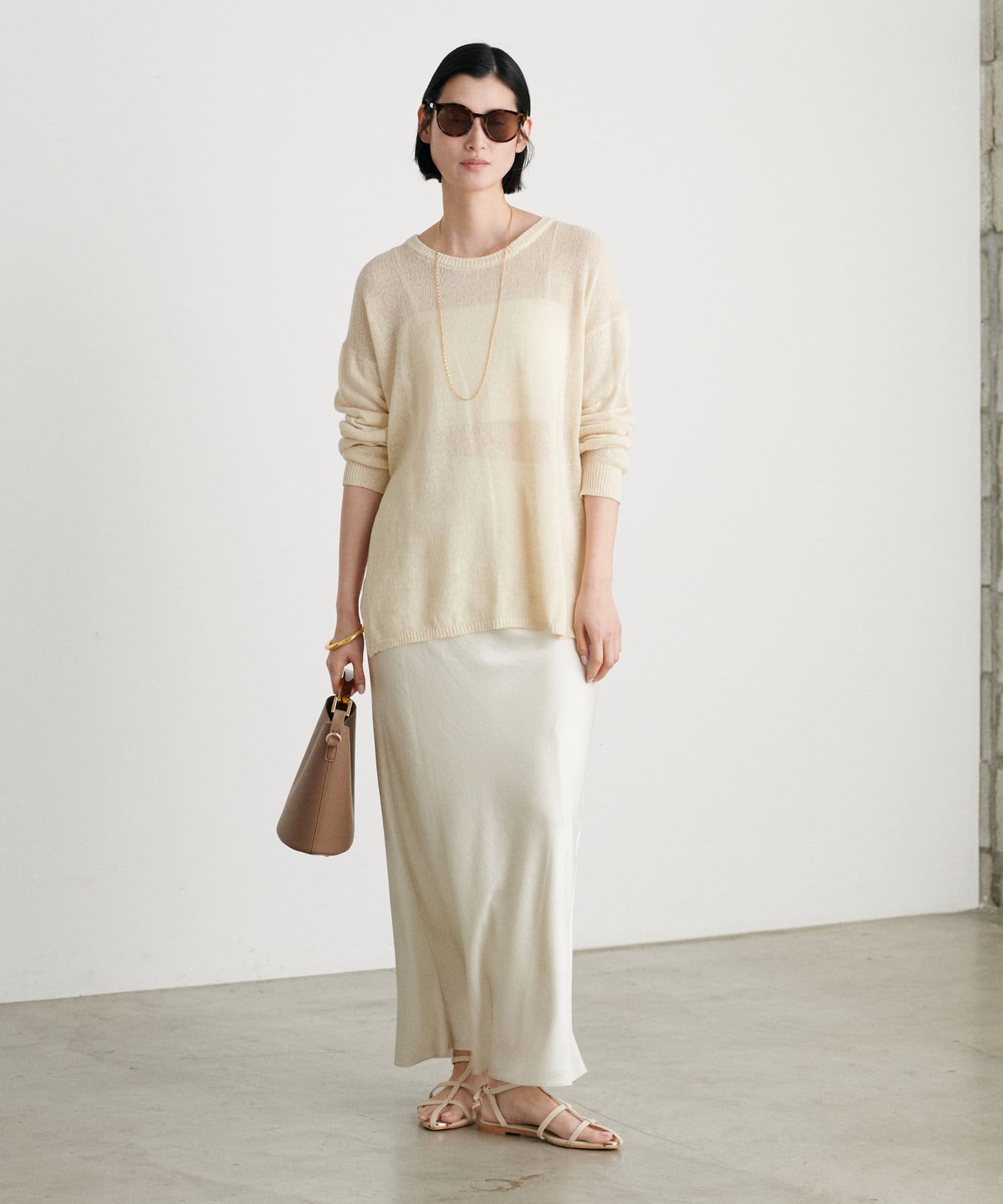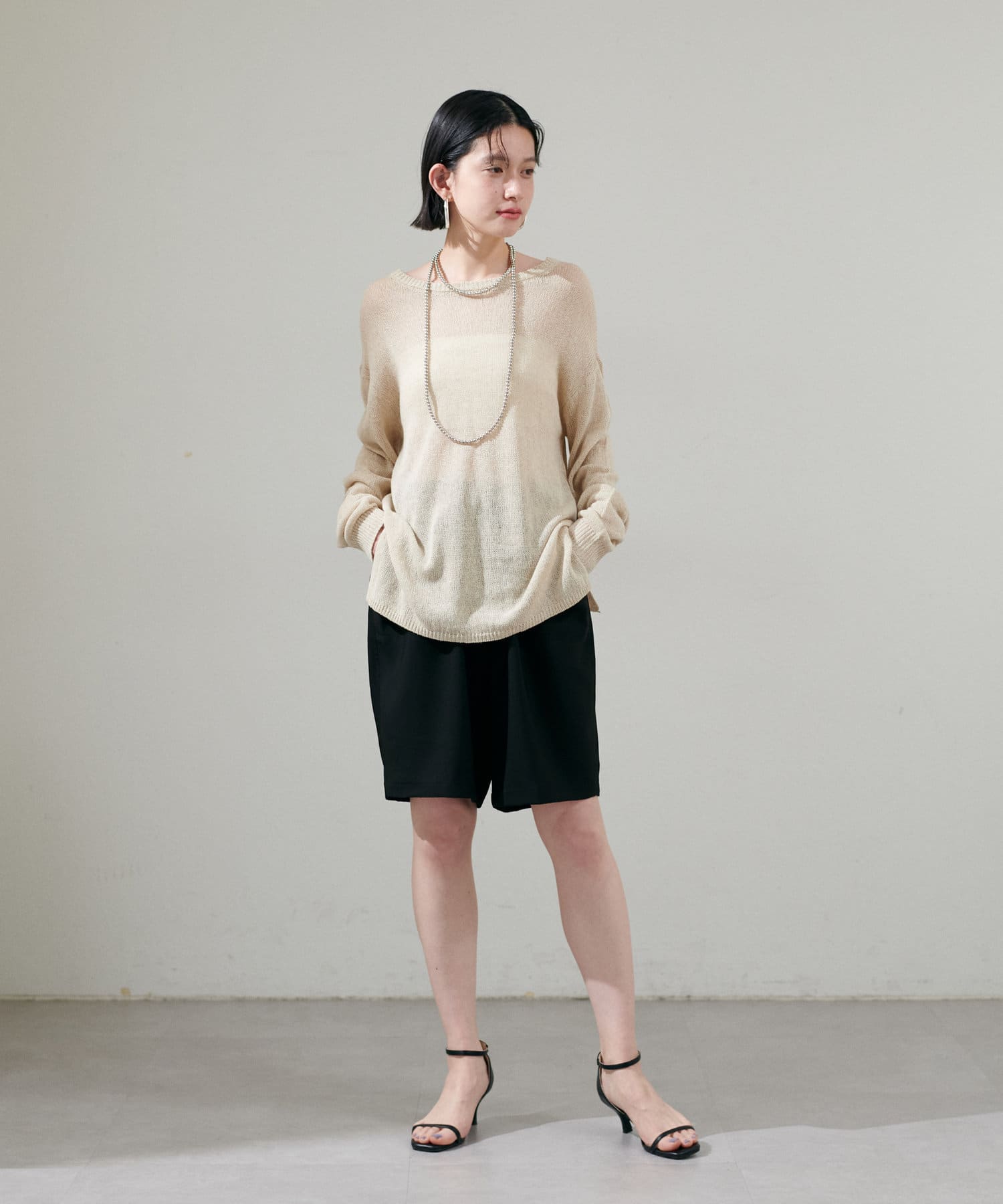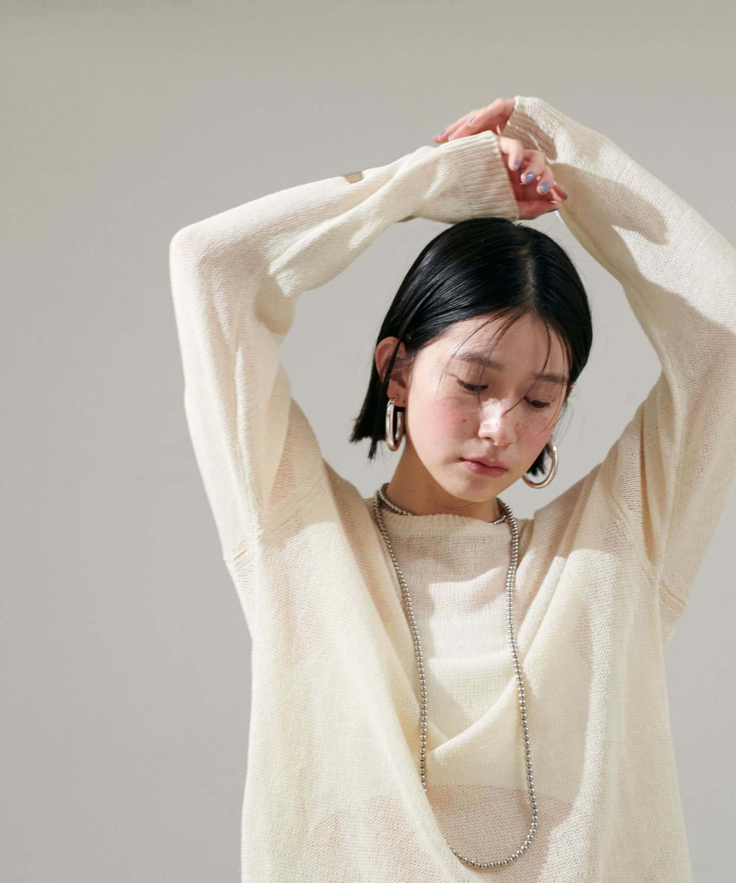 インナー次第で様々な表情にアレンジできるシアーニットは、同色のキャミソールを合わせたヘルシーな肌見せはもちろん、色差を付けたインナーでしっかりと透け感を楽しむのも◎
