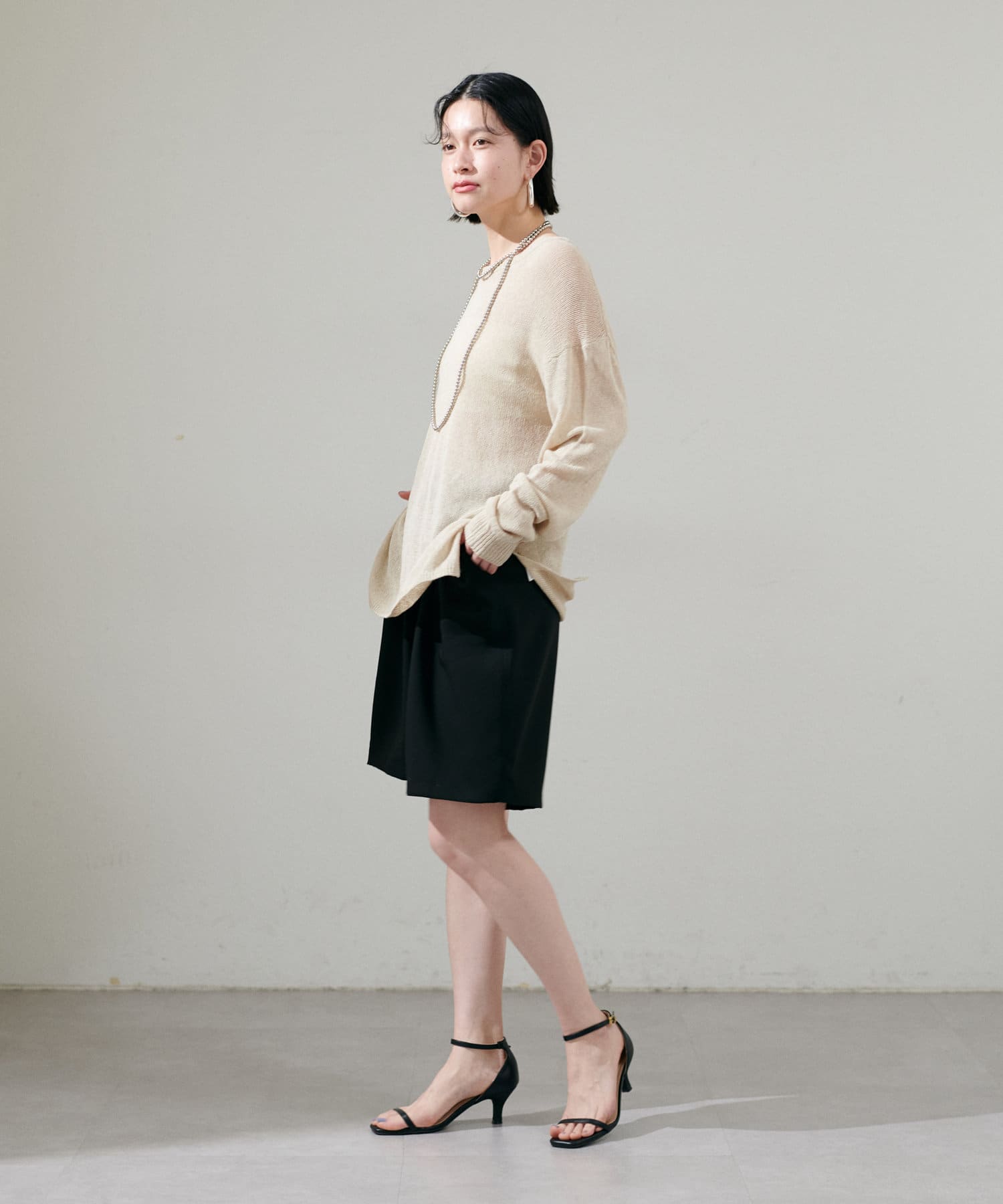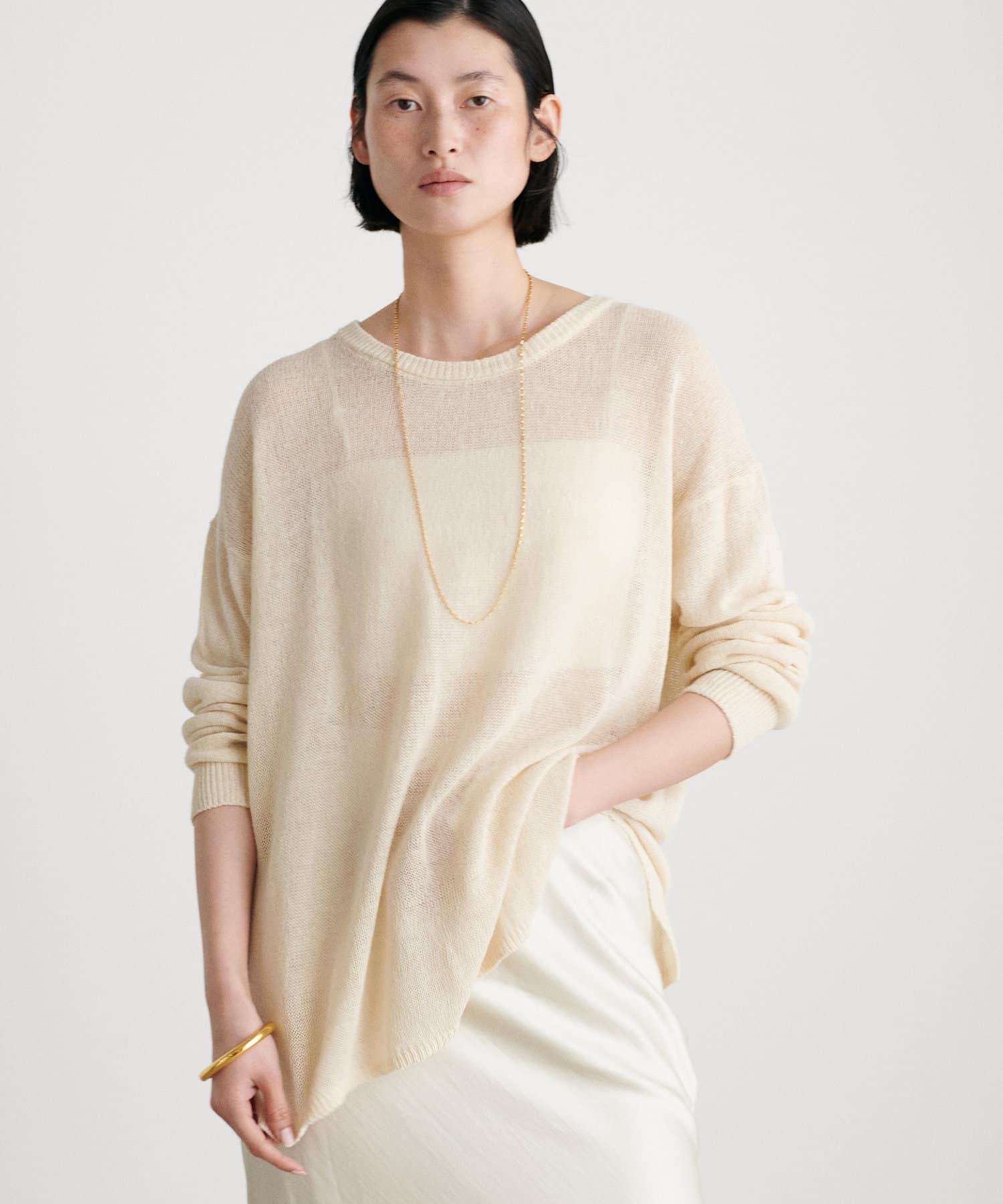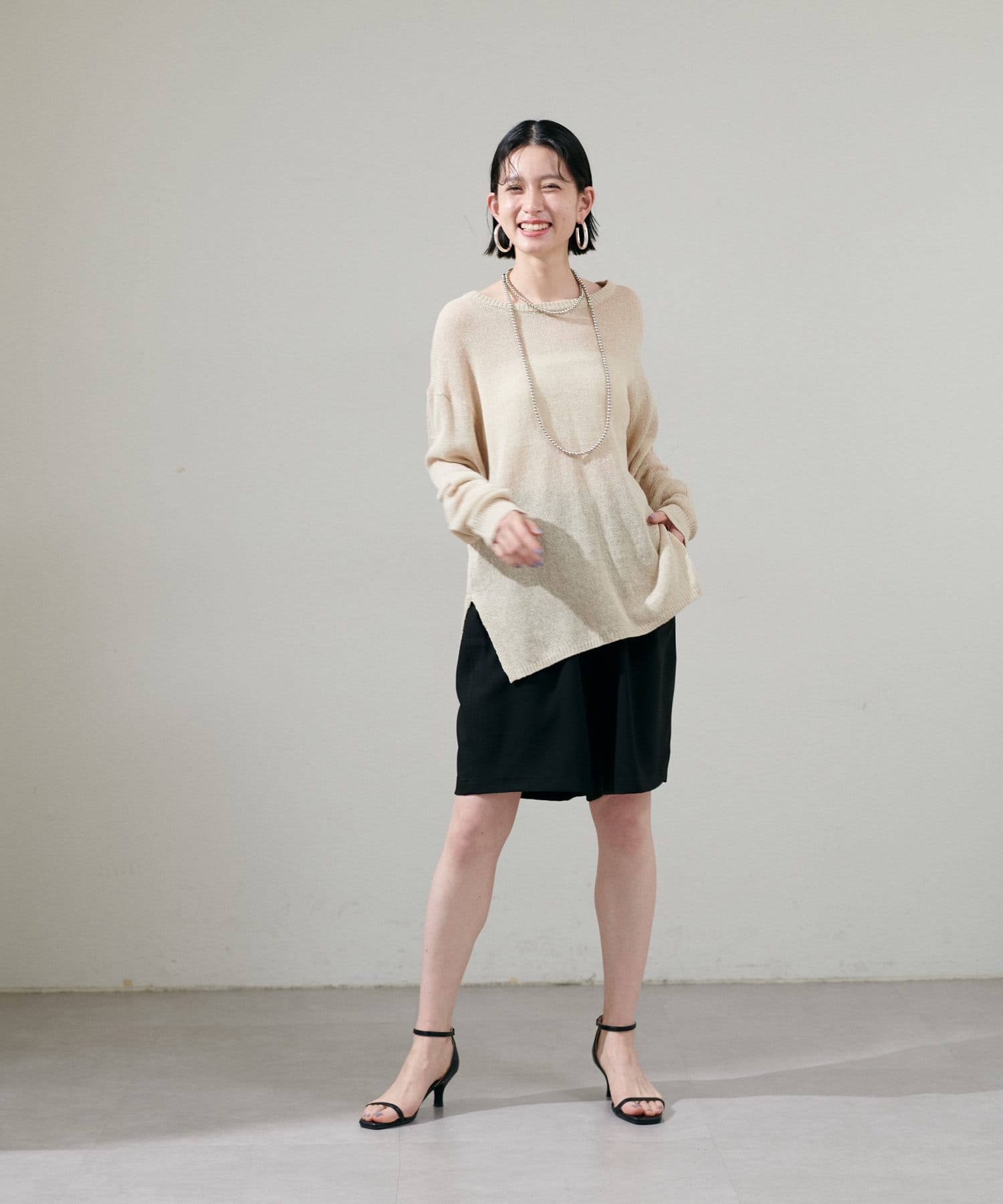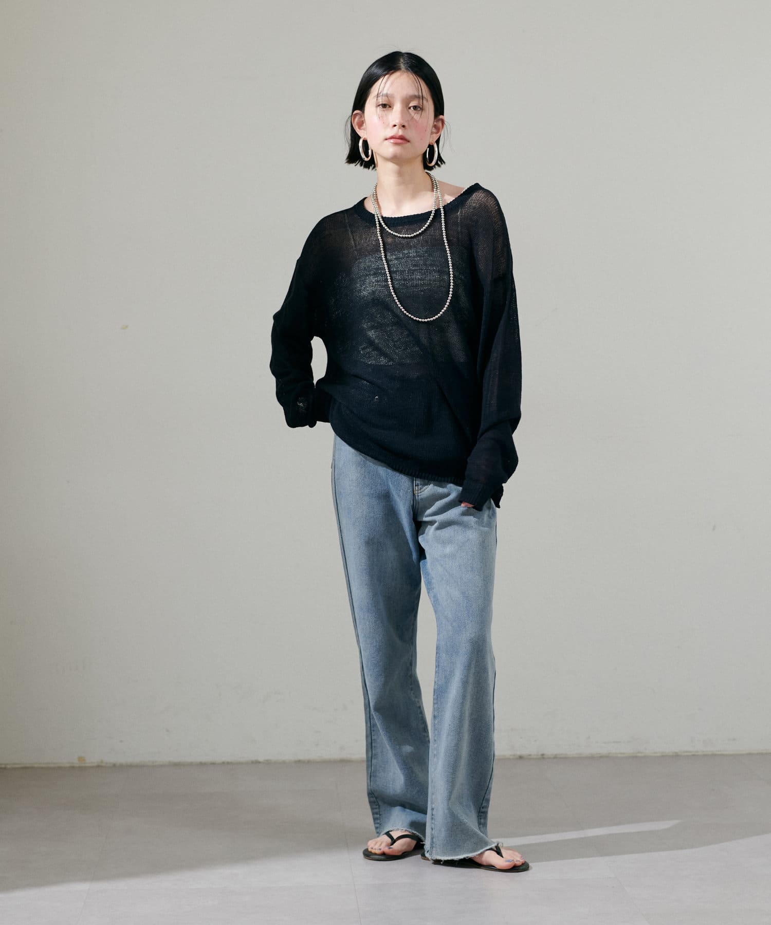 インナー次第で様々な表情にアレンジできるシアーニットは、同色のキャミソールを合わせたヘルシーな肌見せはもちろん、色差を付けたインナーでしっかりと透け感を楽しむのも◎
