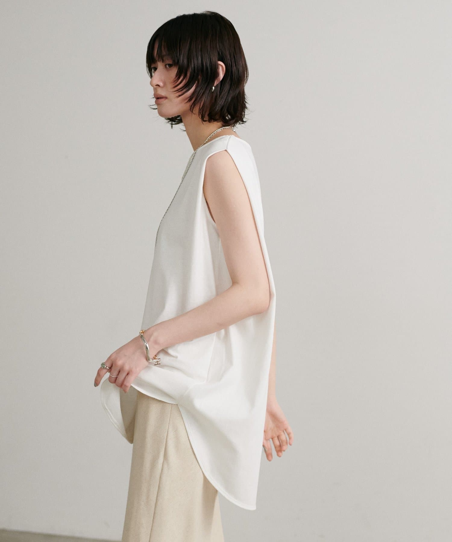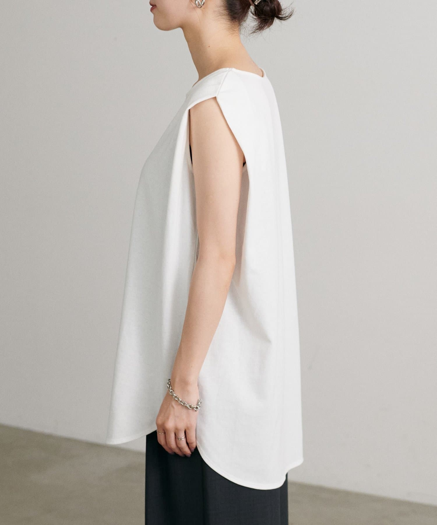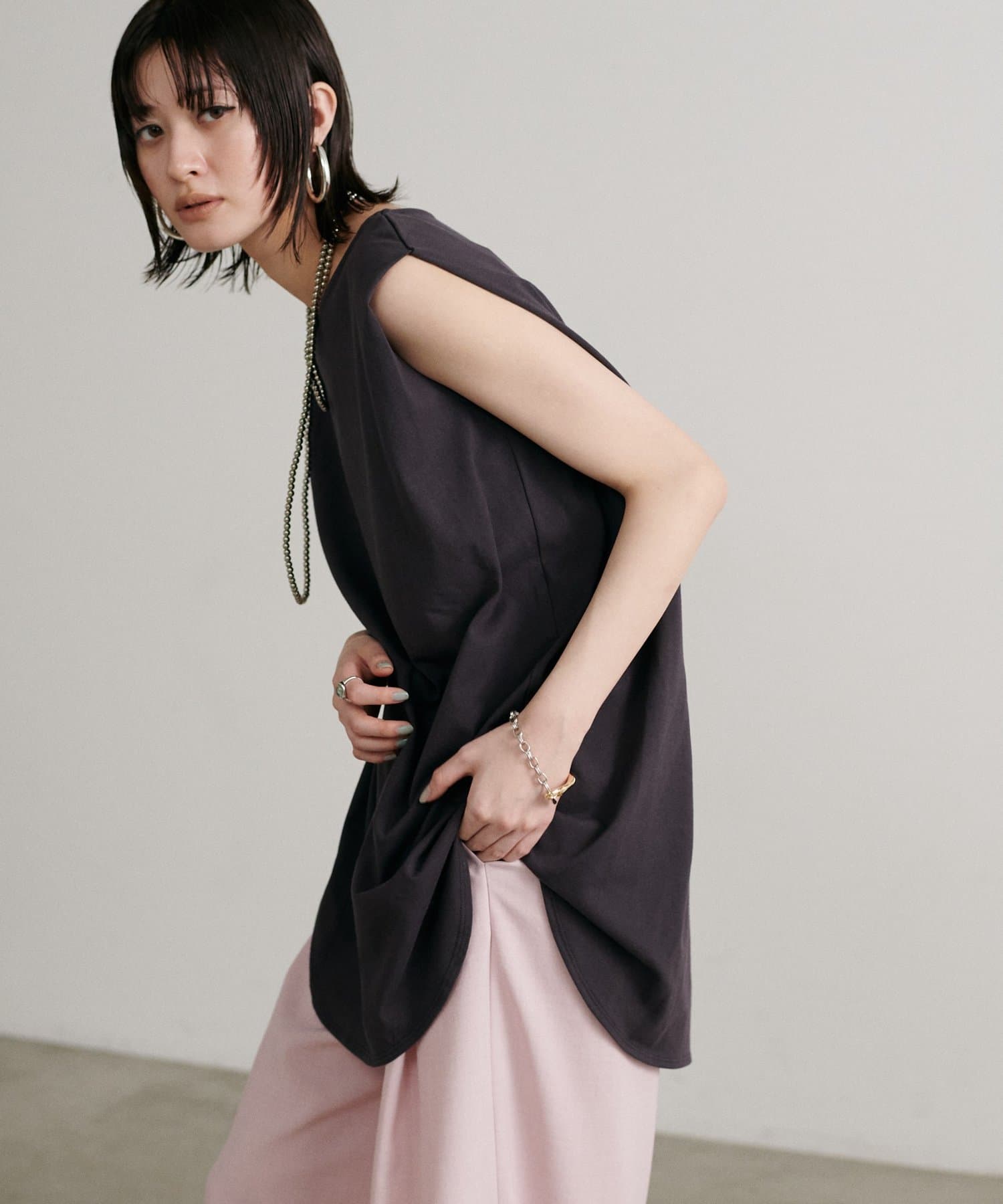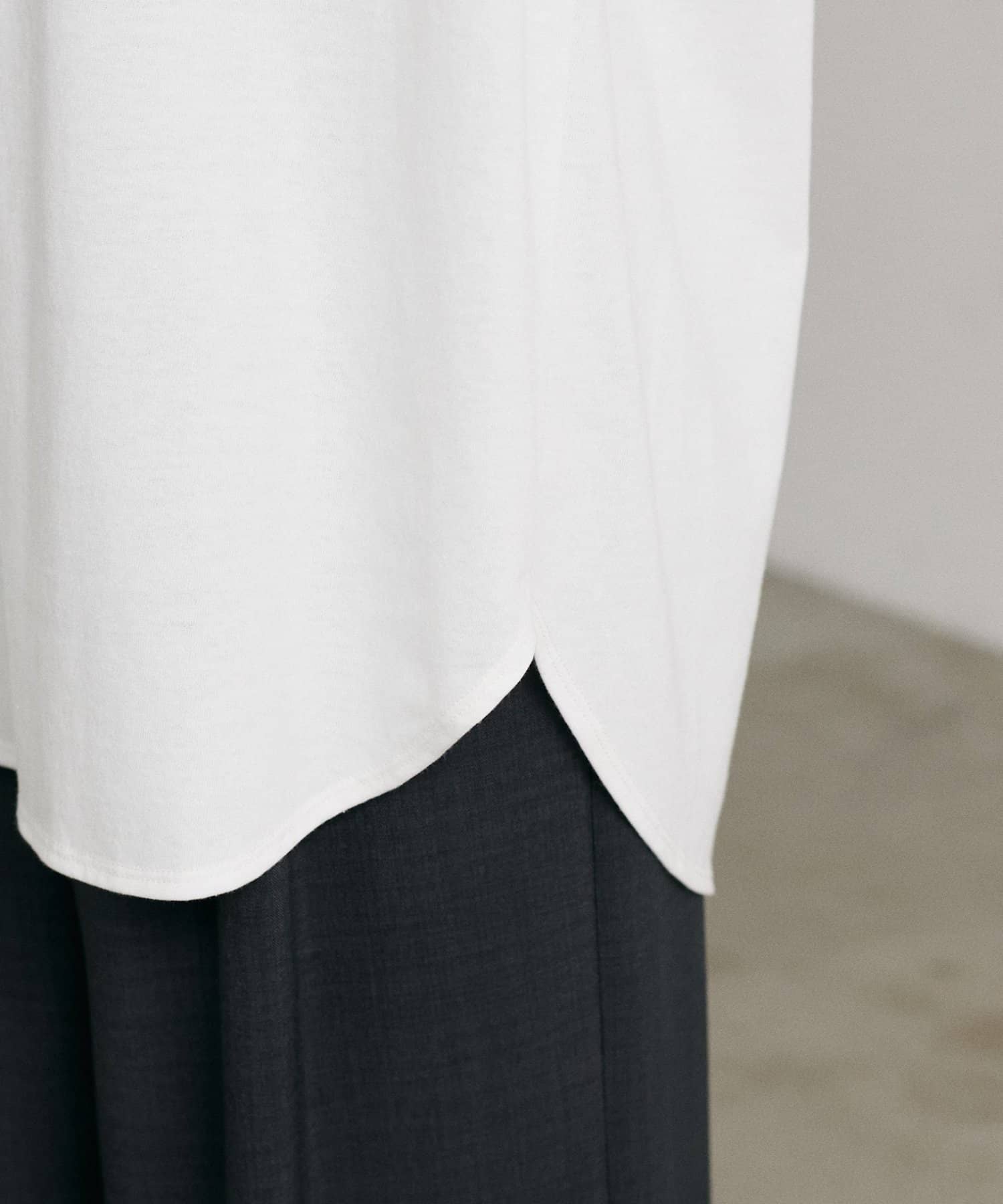 前後差のあるやや長めの丈感で細身のボトムスとの相性も◎