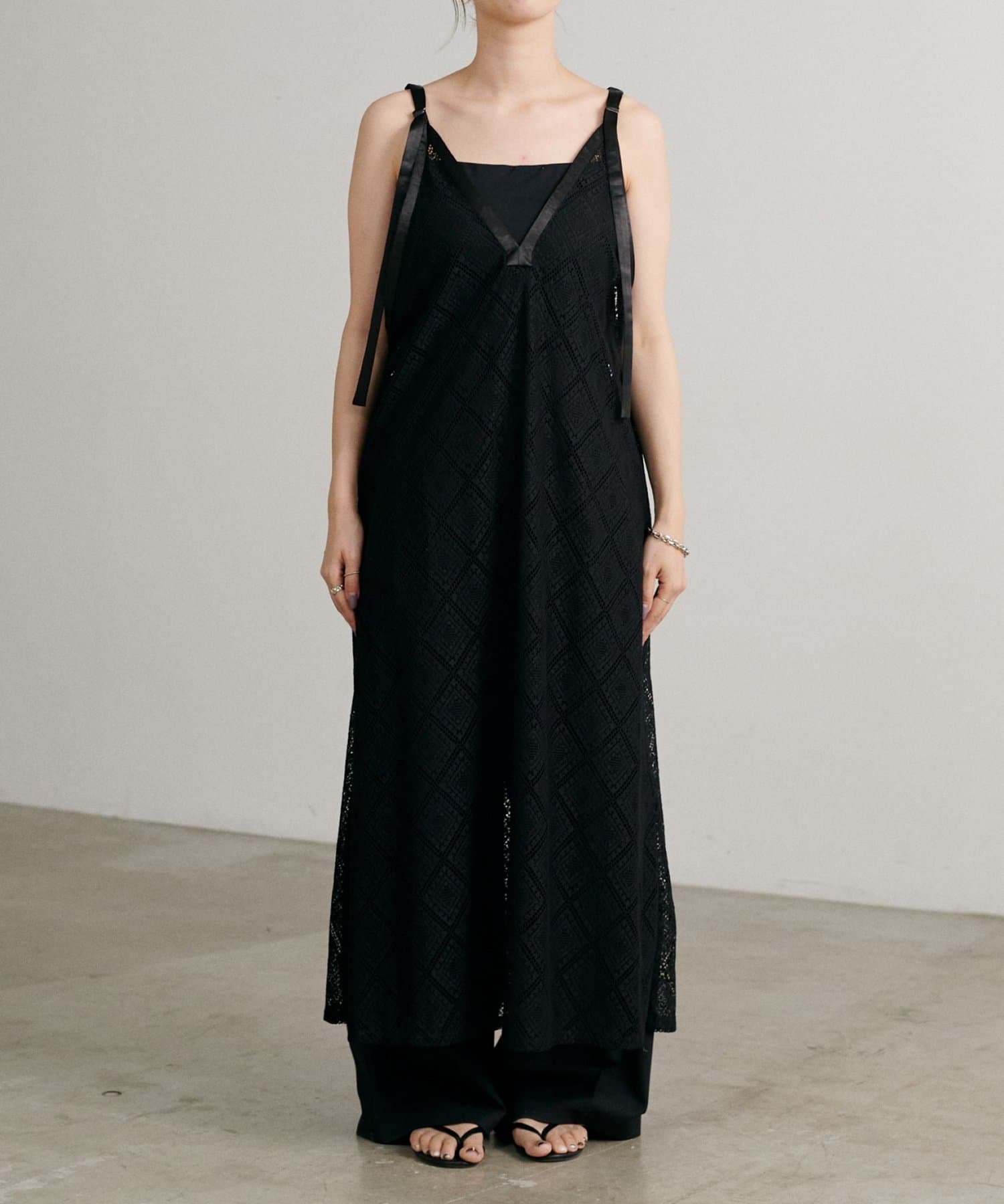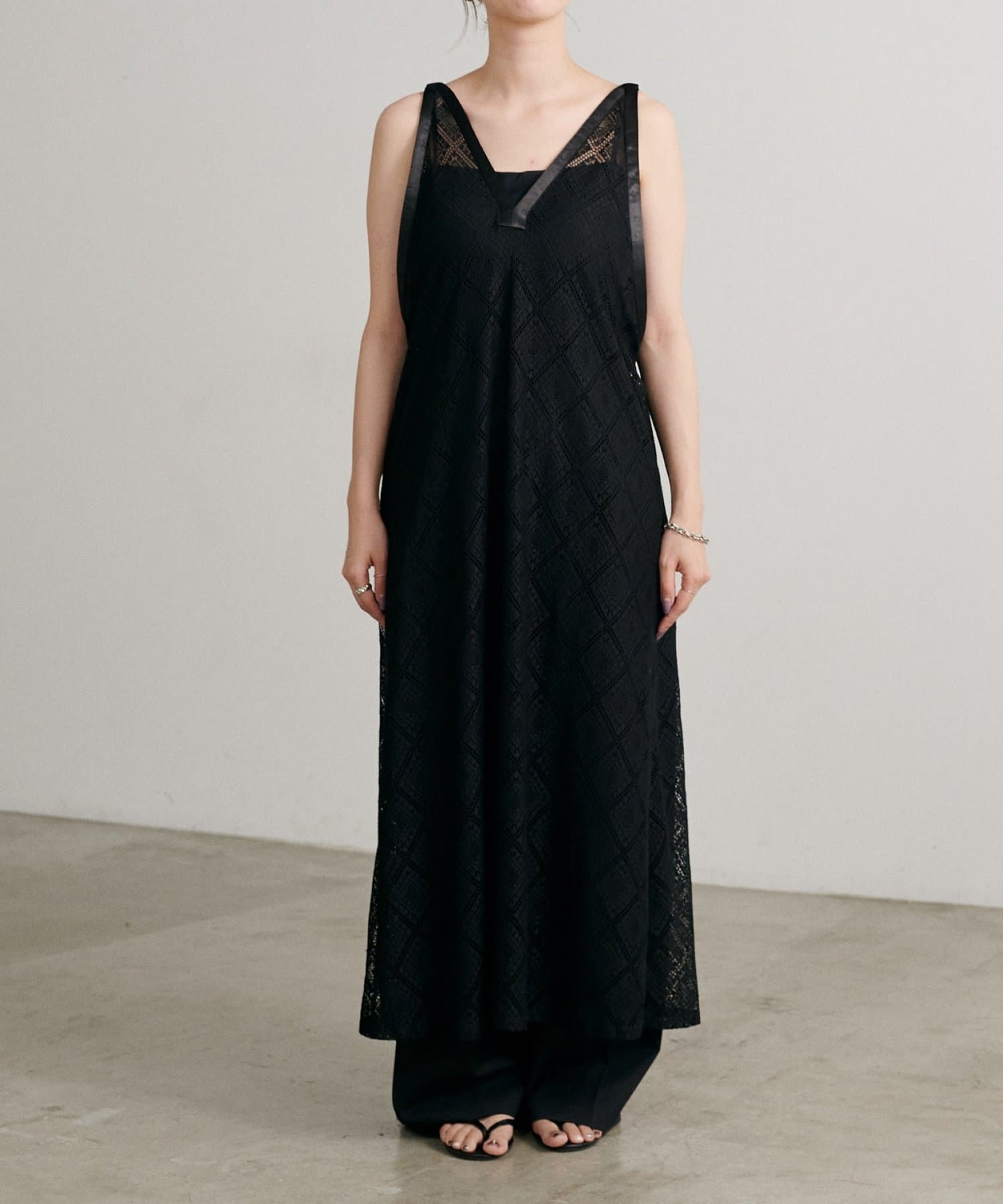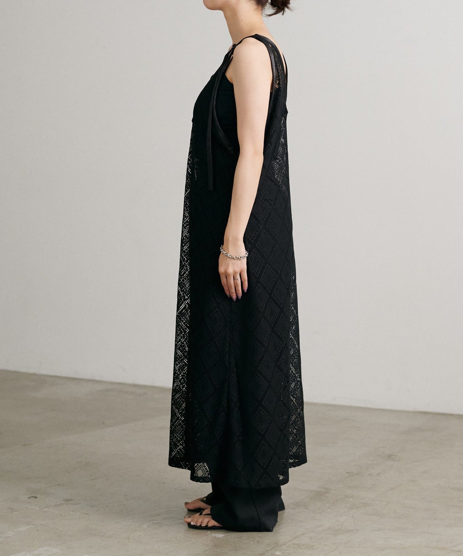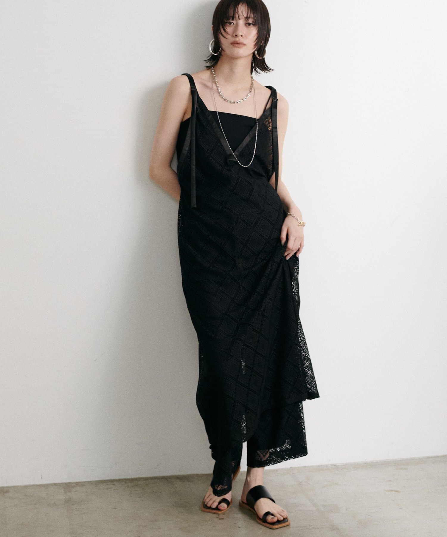 全体にあしらわれたひし柄レースが甘すぎず、上品な印象のワンピース。