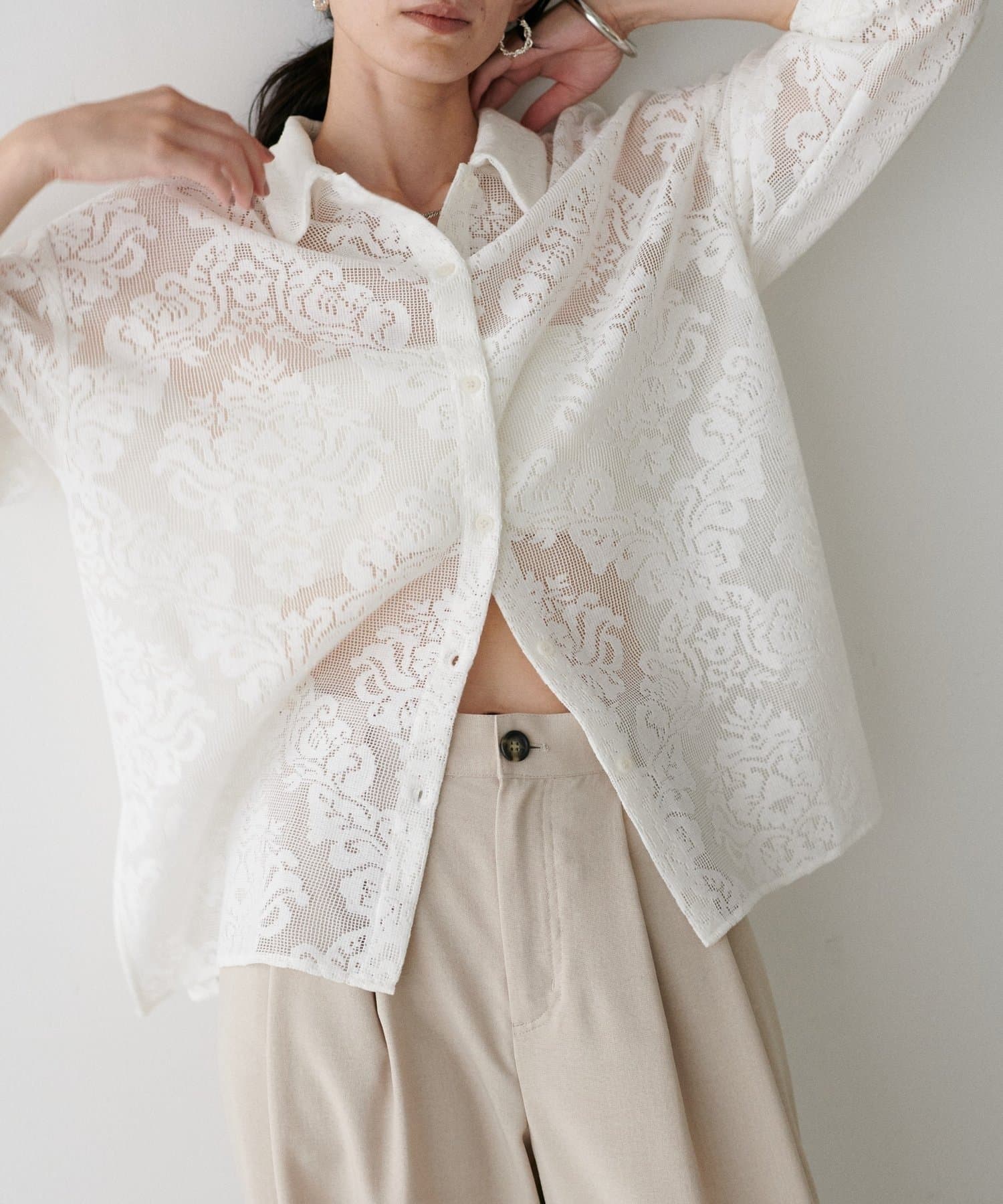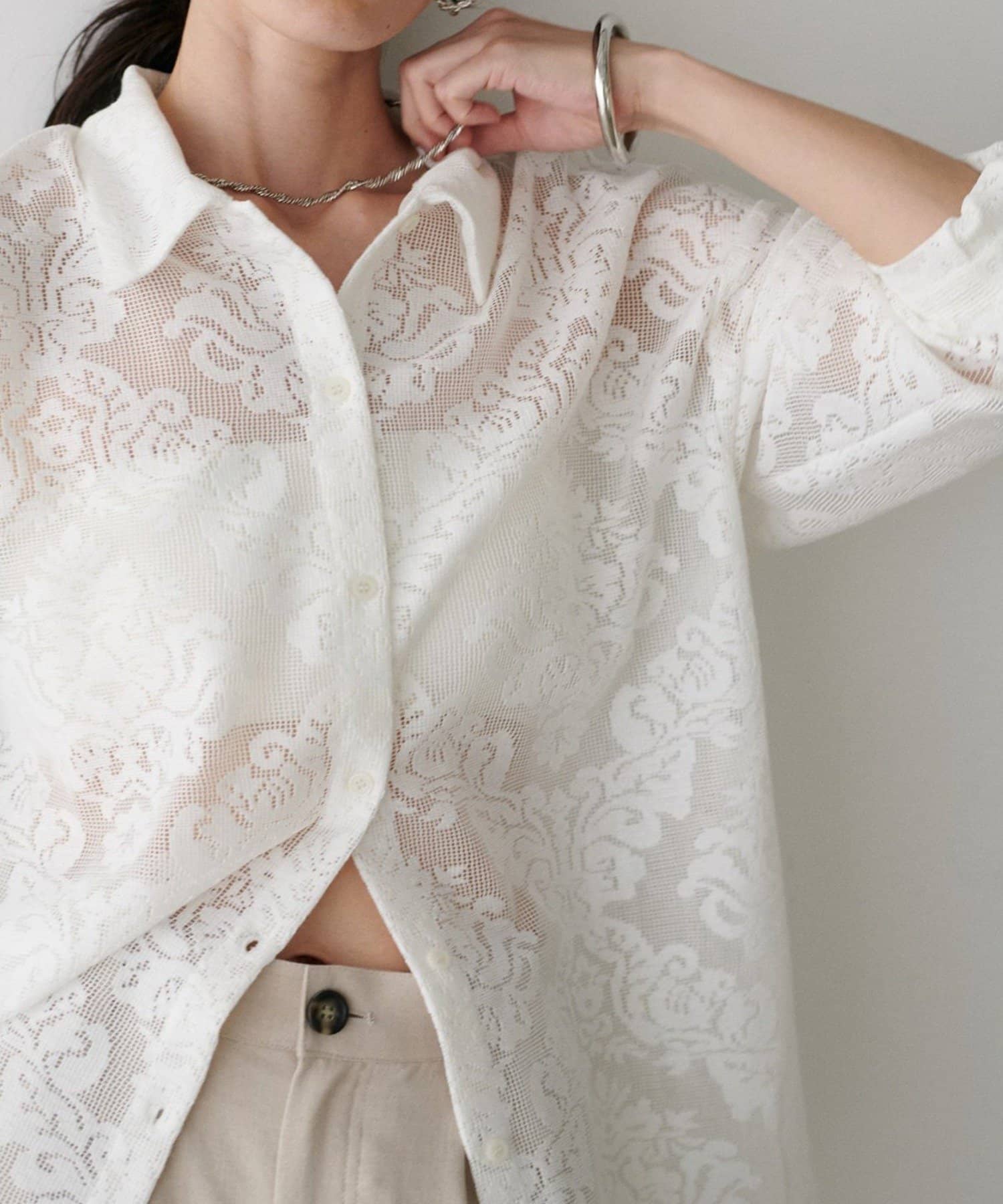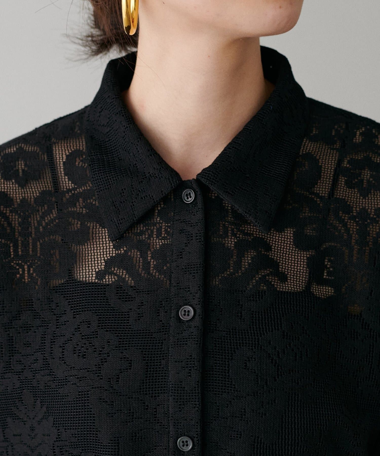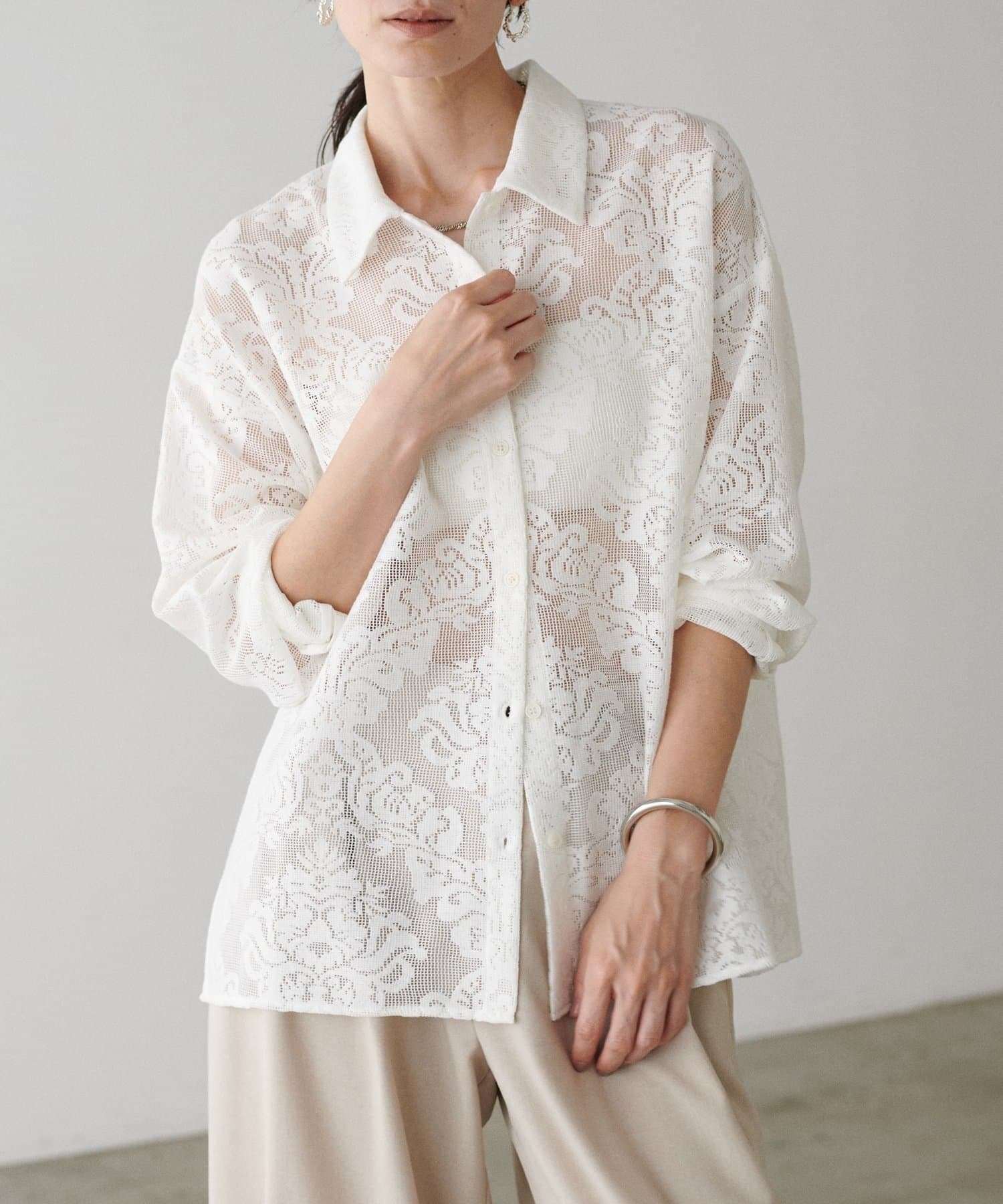 繊細な柄が美しい総レース素材で仕立てた、シアー感のあるレースシャツ。