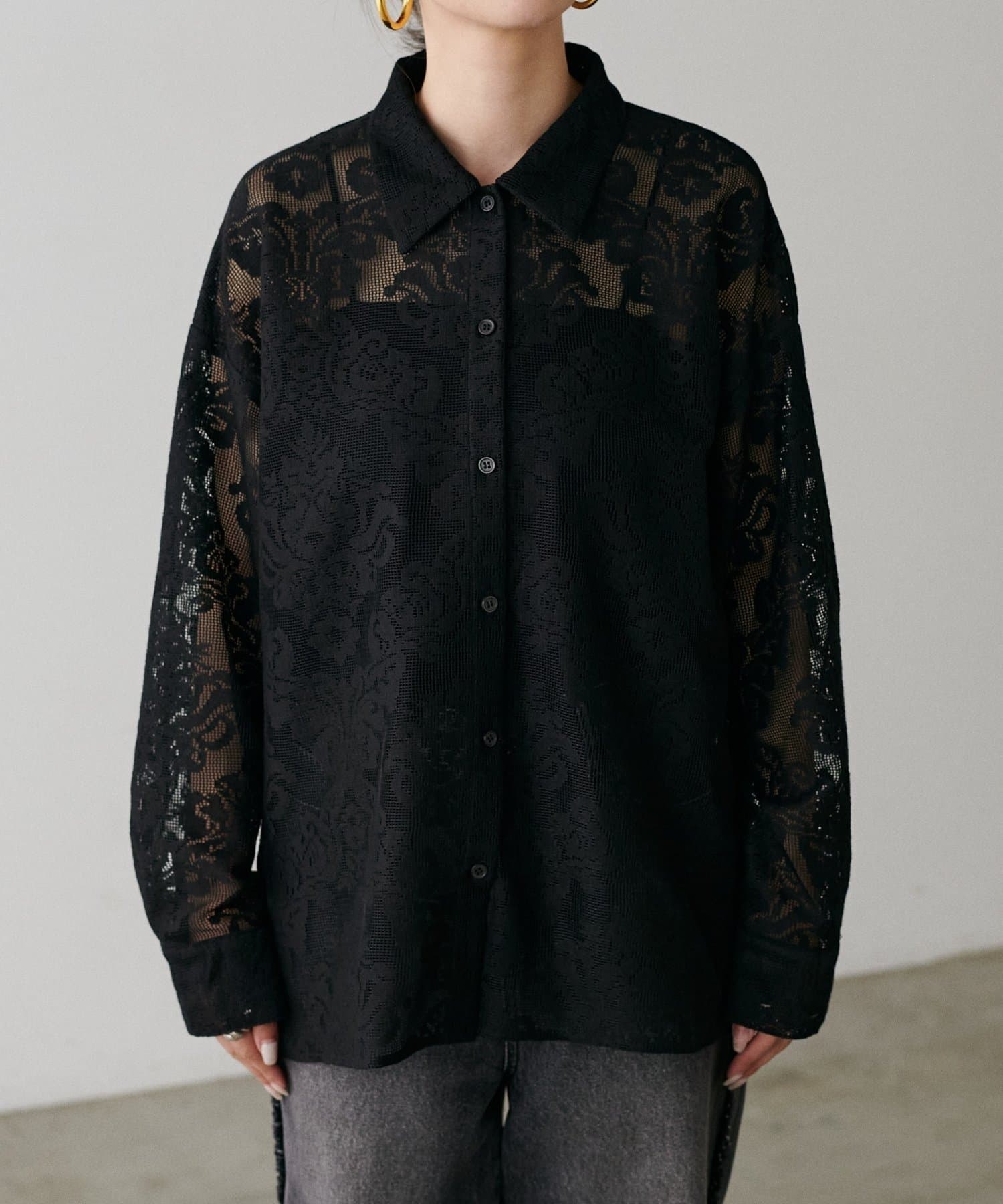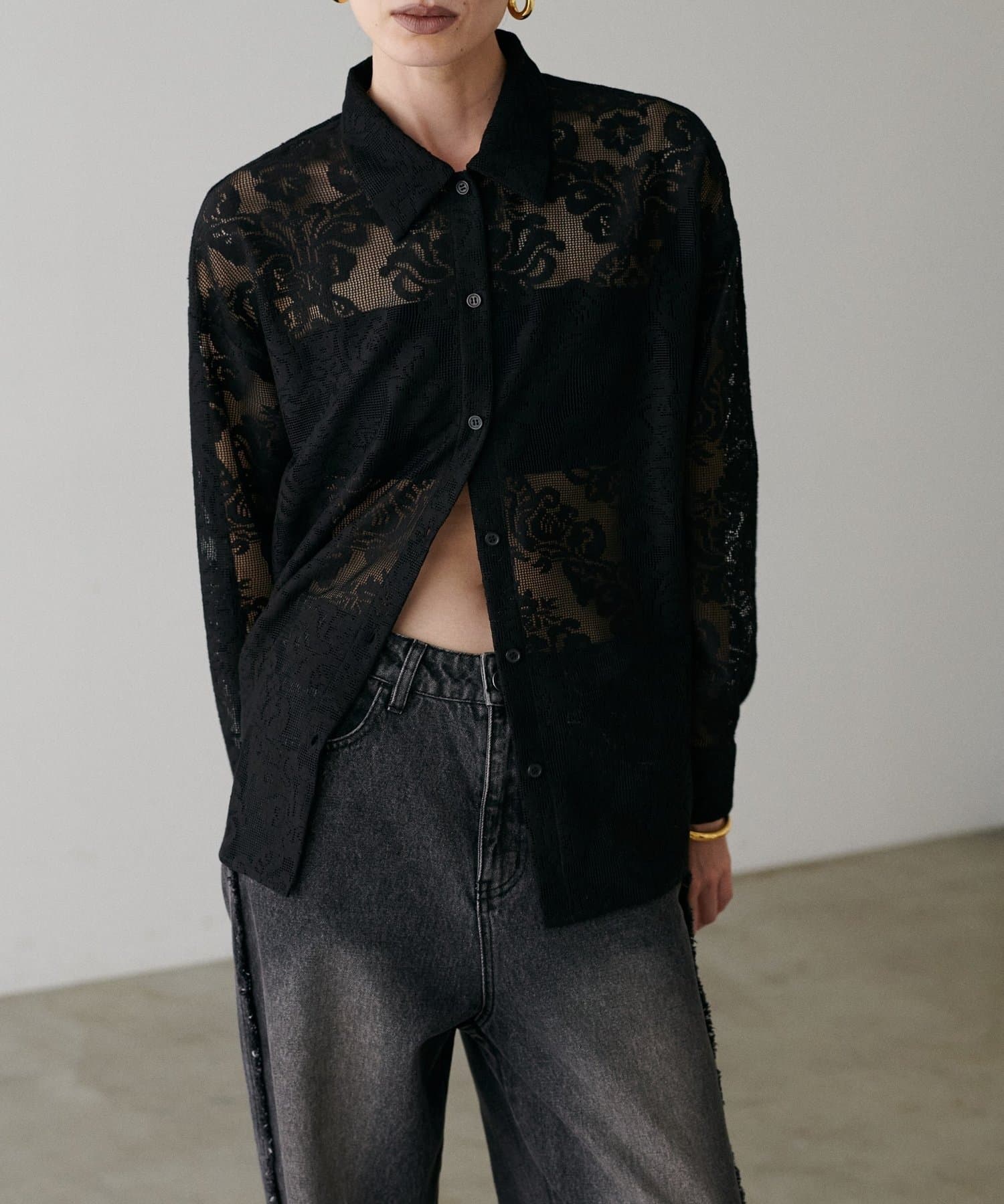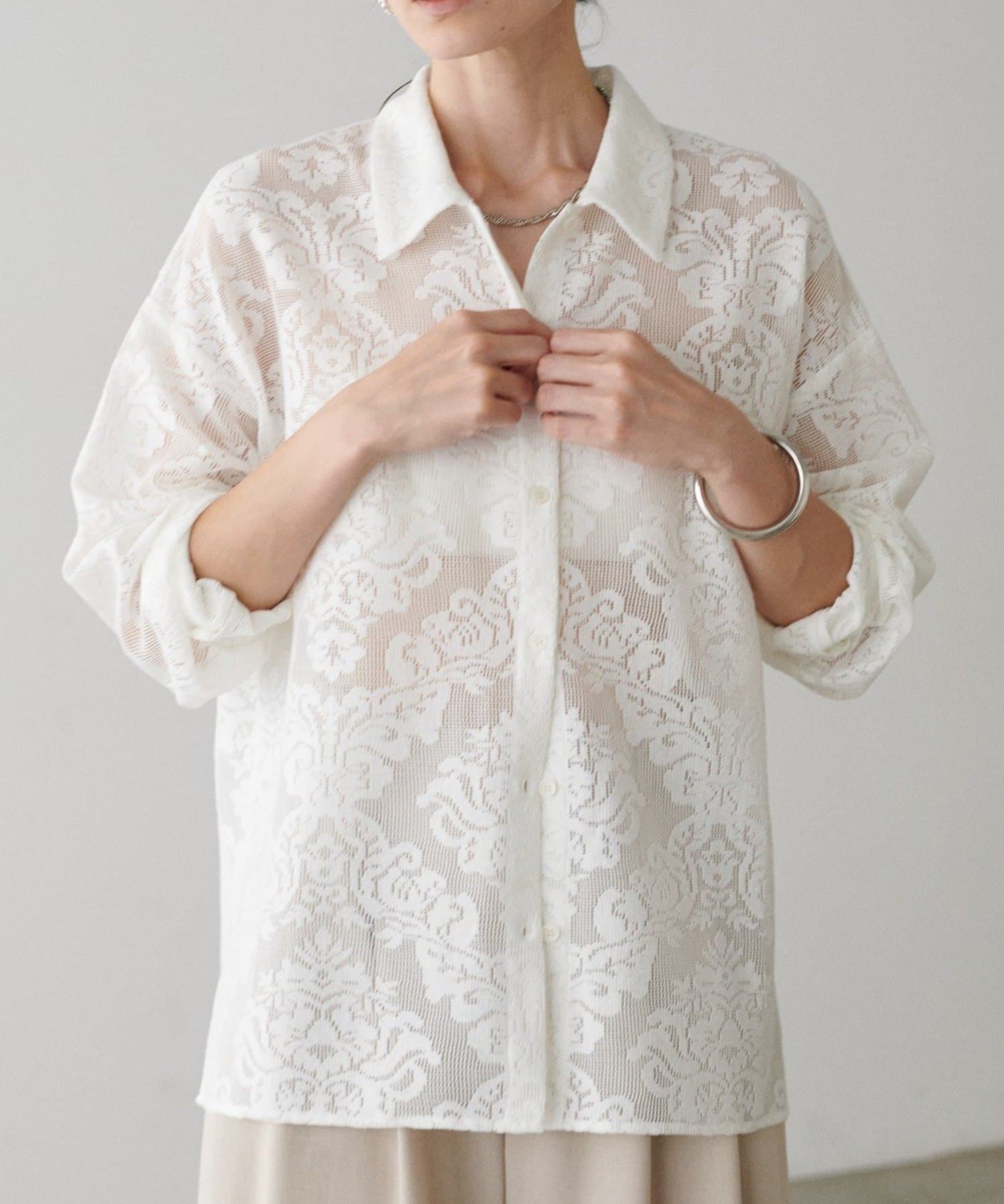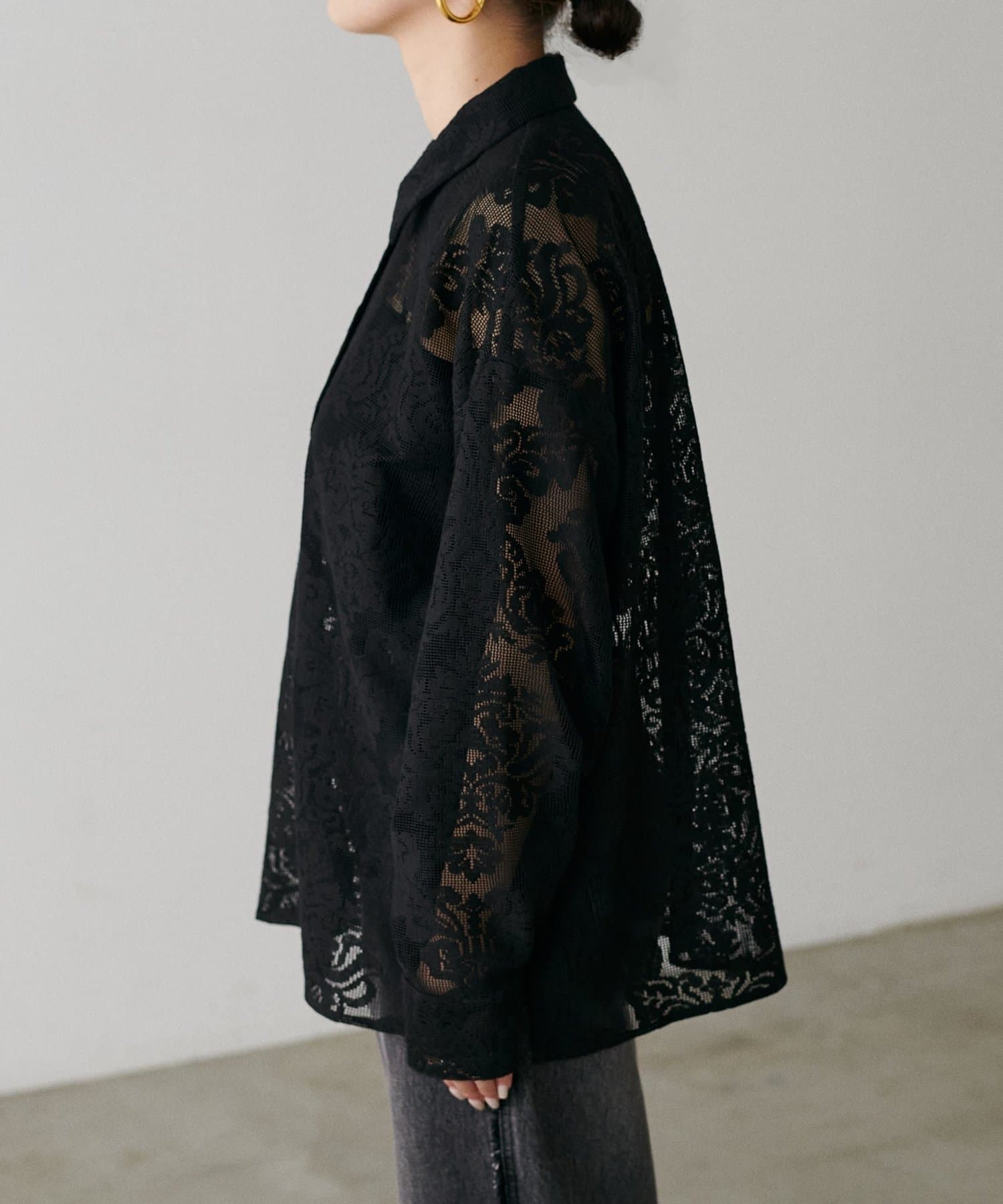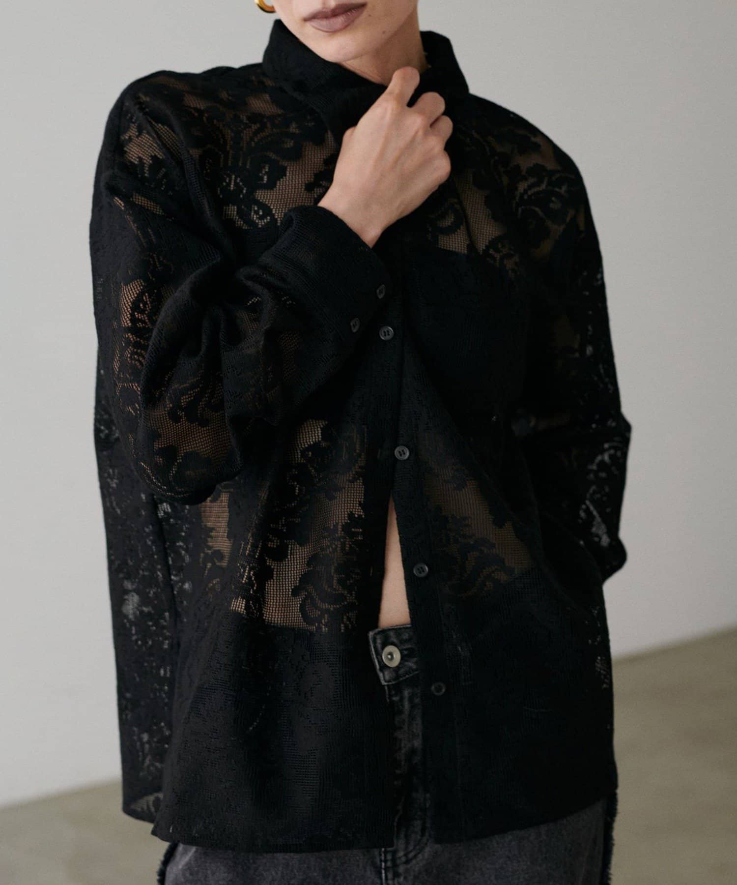 繊細な柄が美しい総レース素材で仕立てた、シアー感のあるレースシャツ。