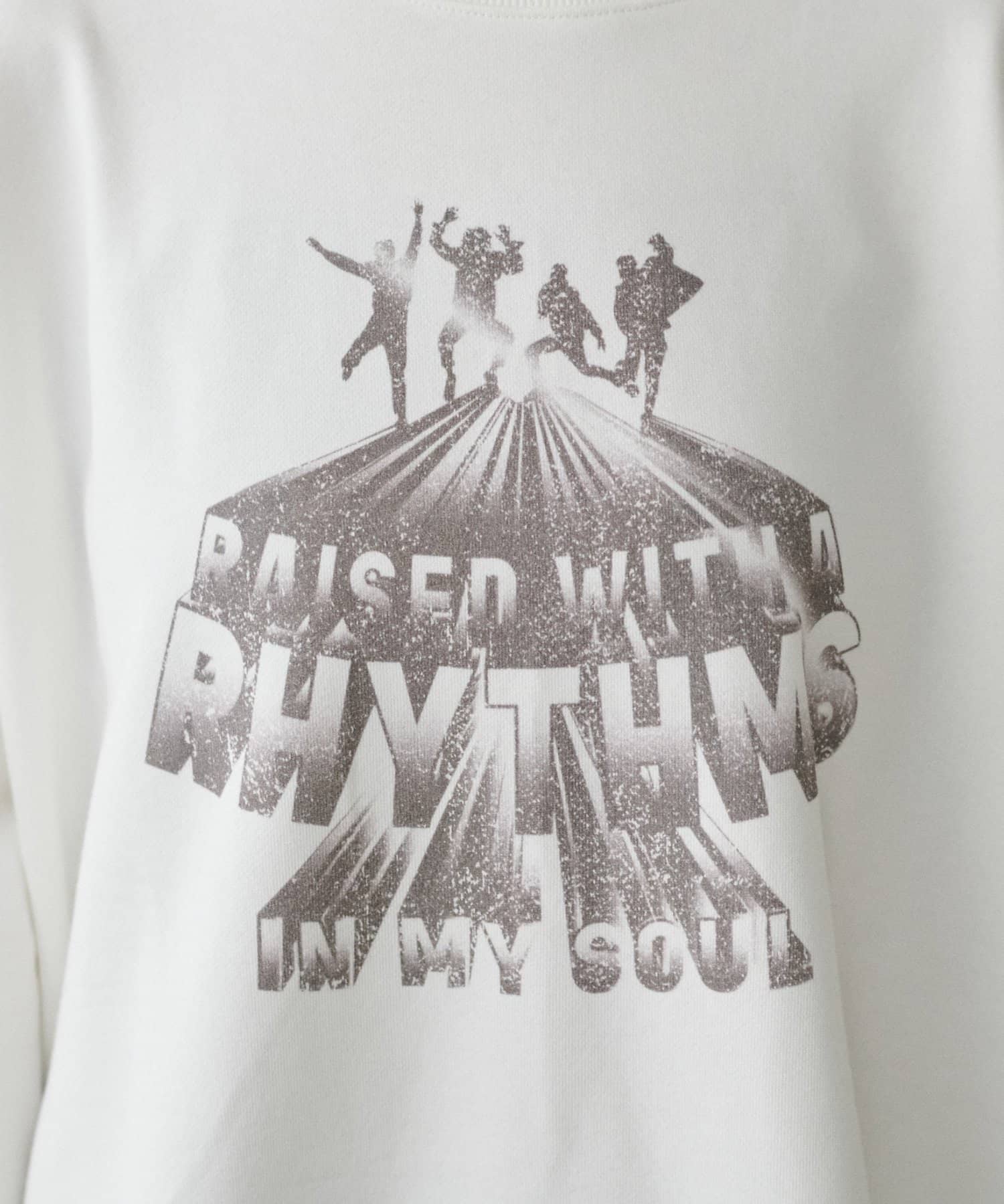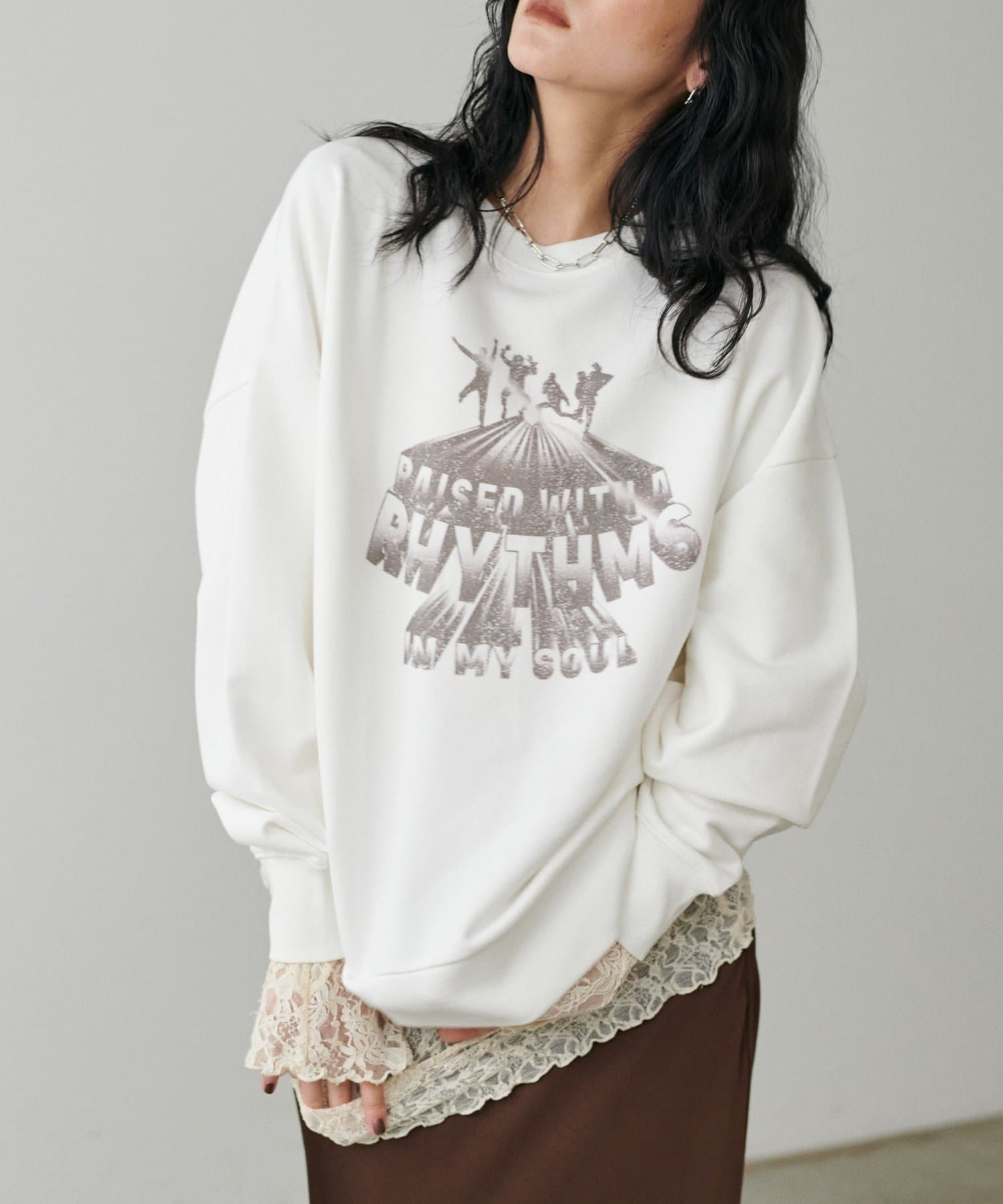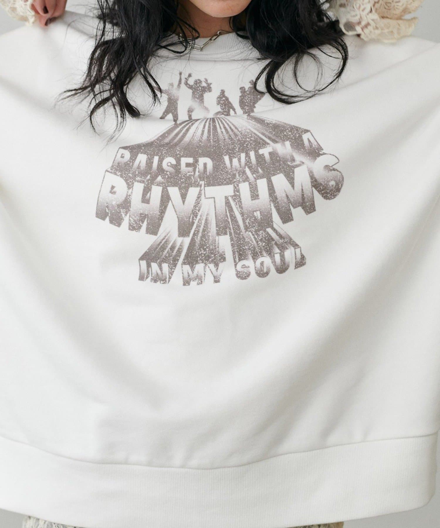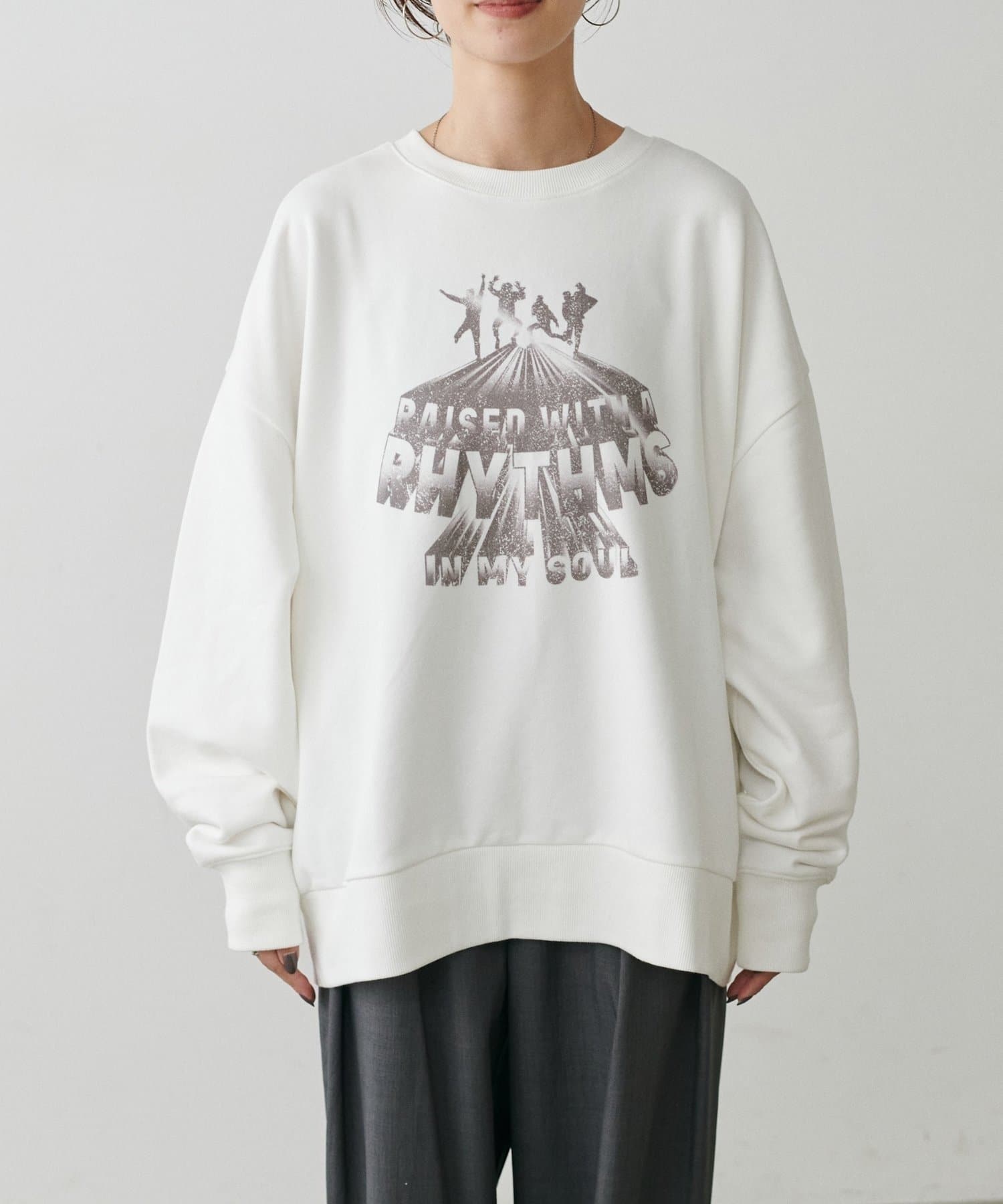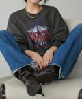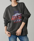 架空のバンドロゴをモチーフにした、遊び心のあるグラフィックプリントが印象的な裏毛プルオーバー。