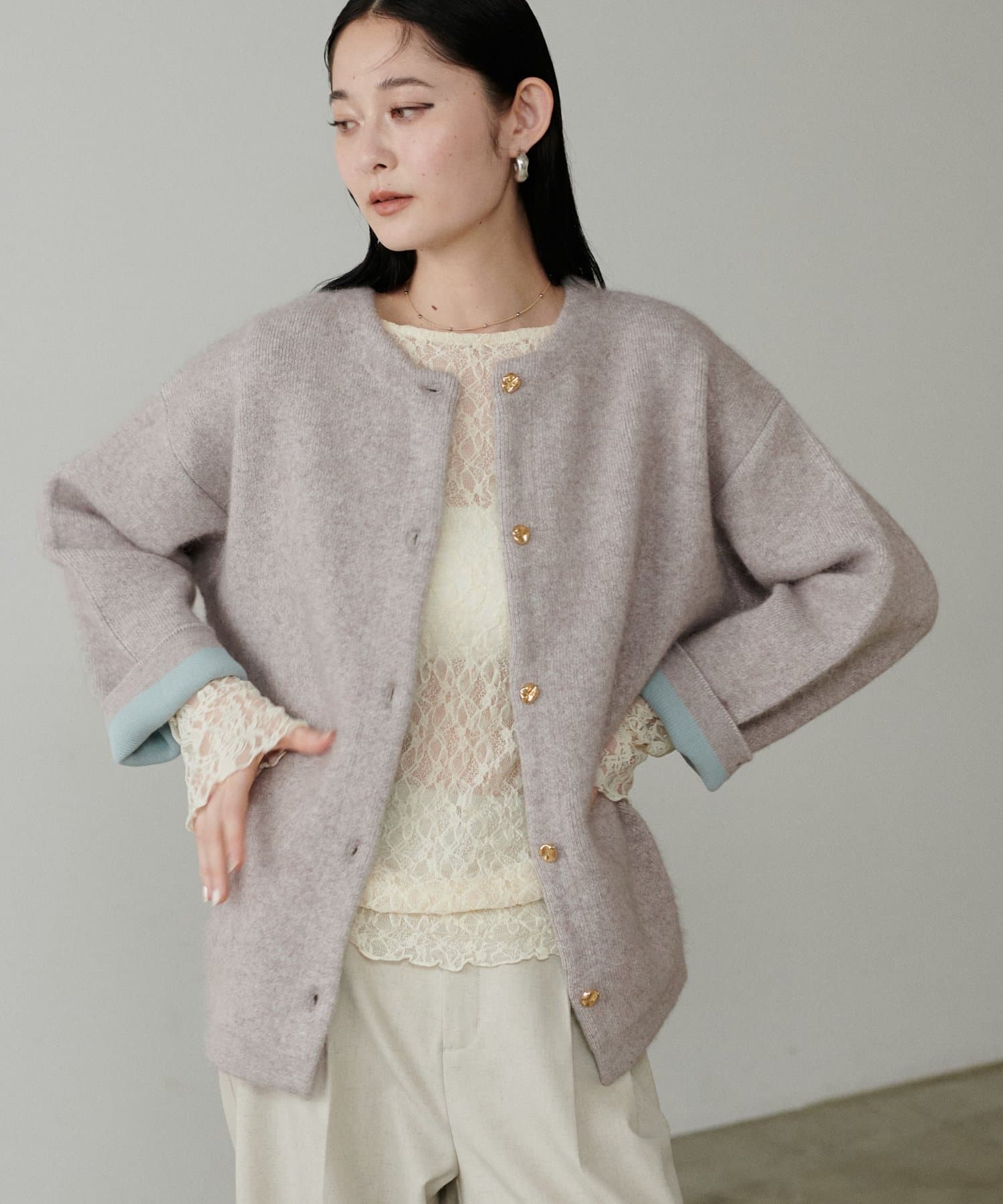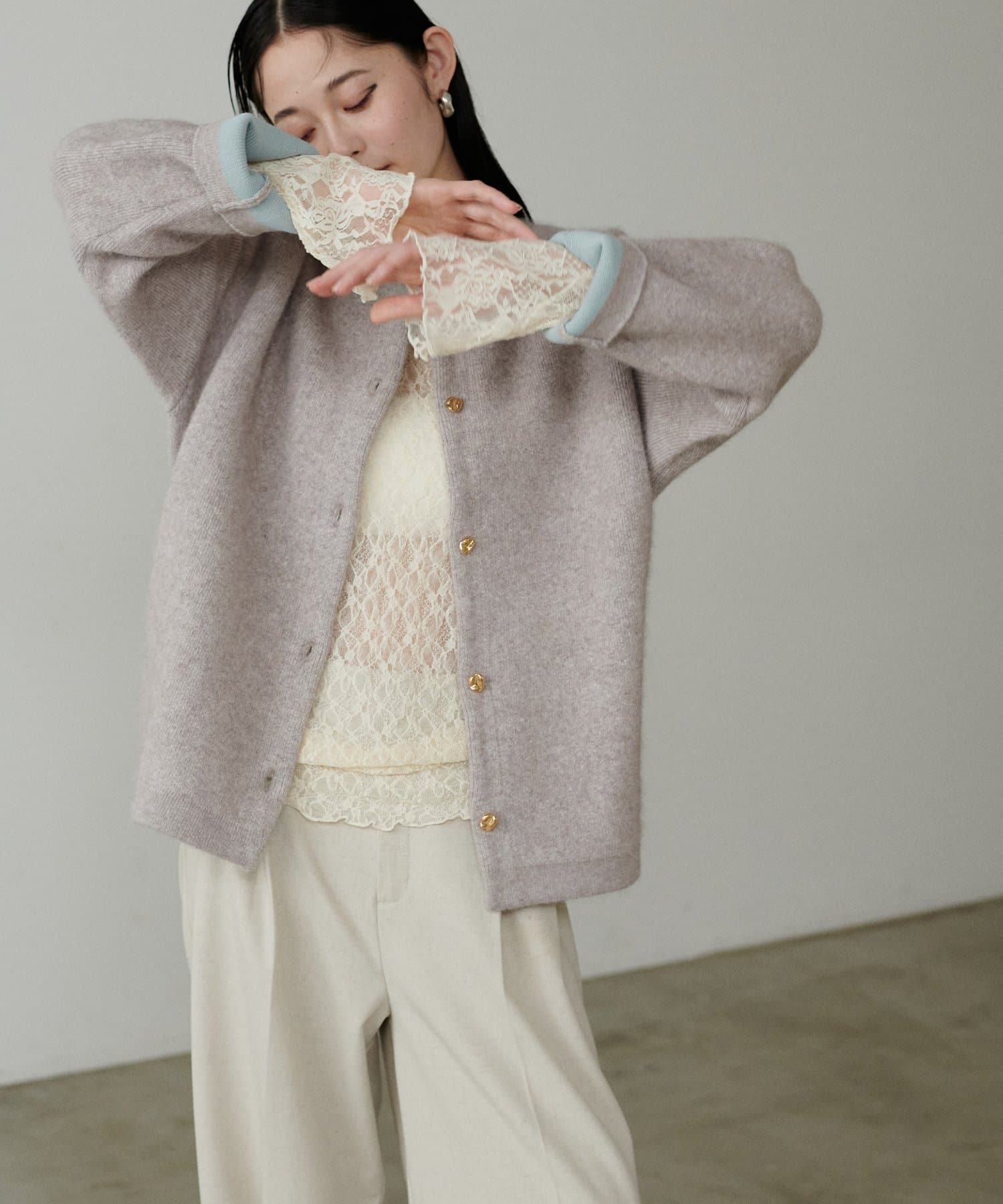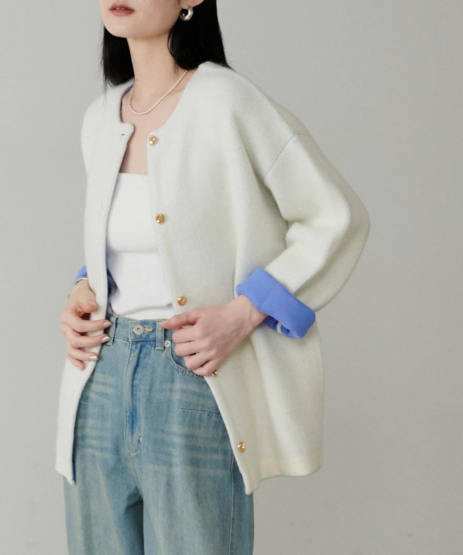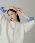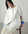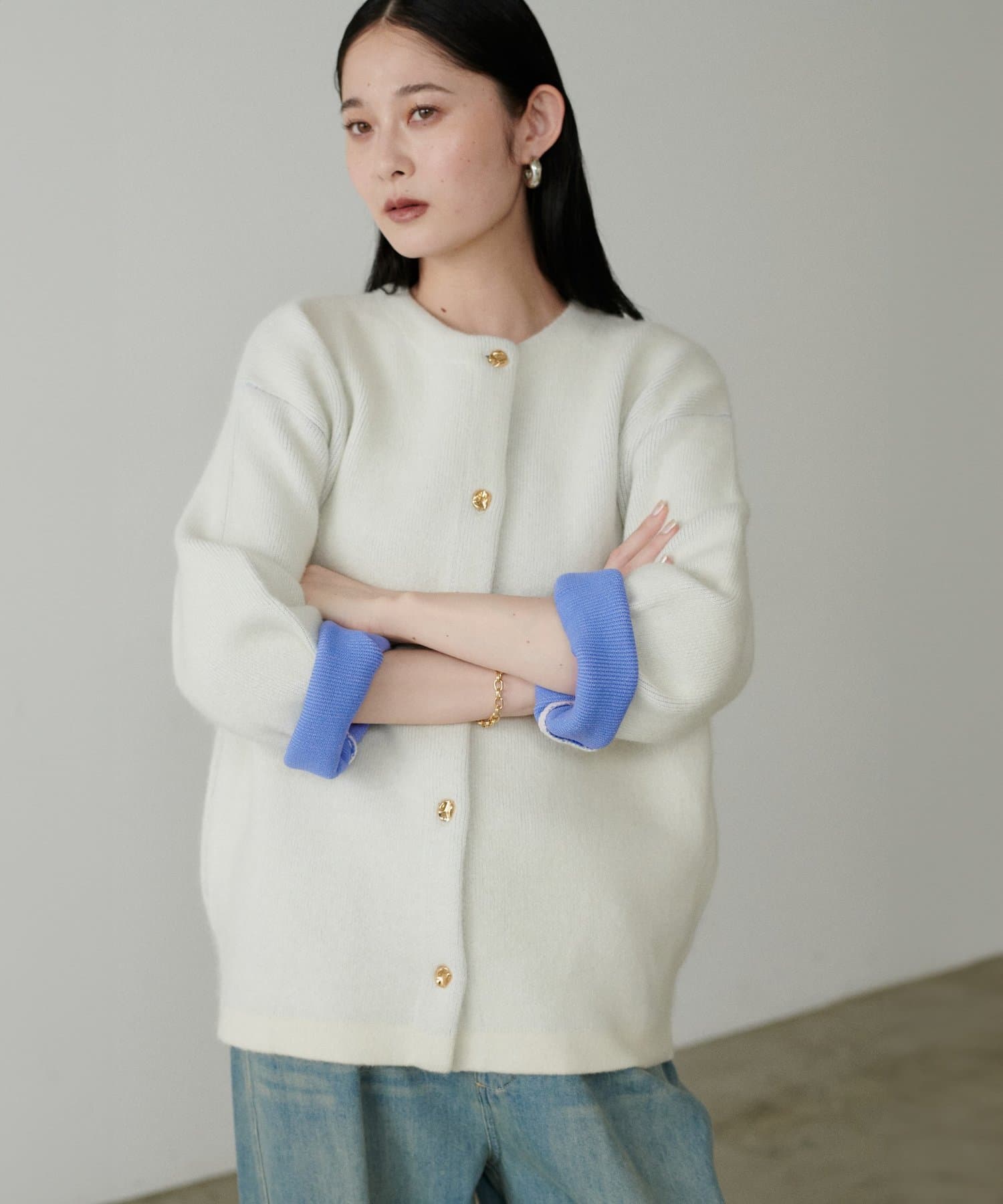 カーディガンの内側は、配色使いのダブルフェイス仕様に仕立て、釦を開けてお召し頂いたり、
