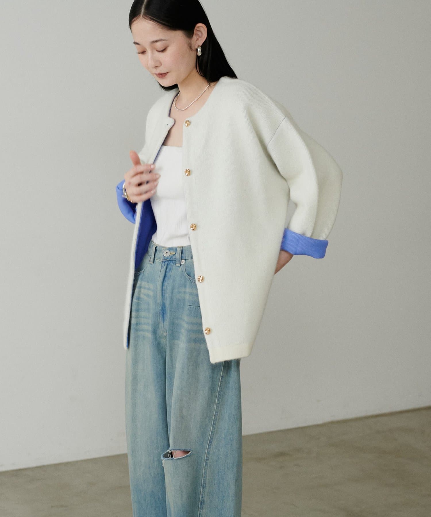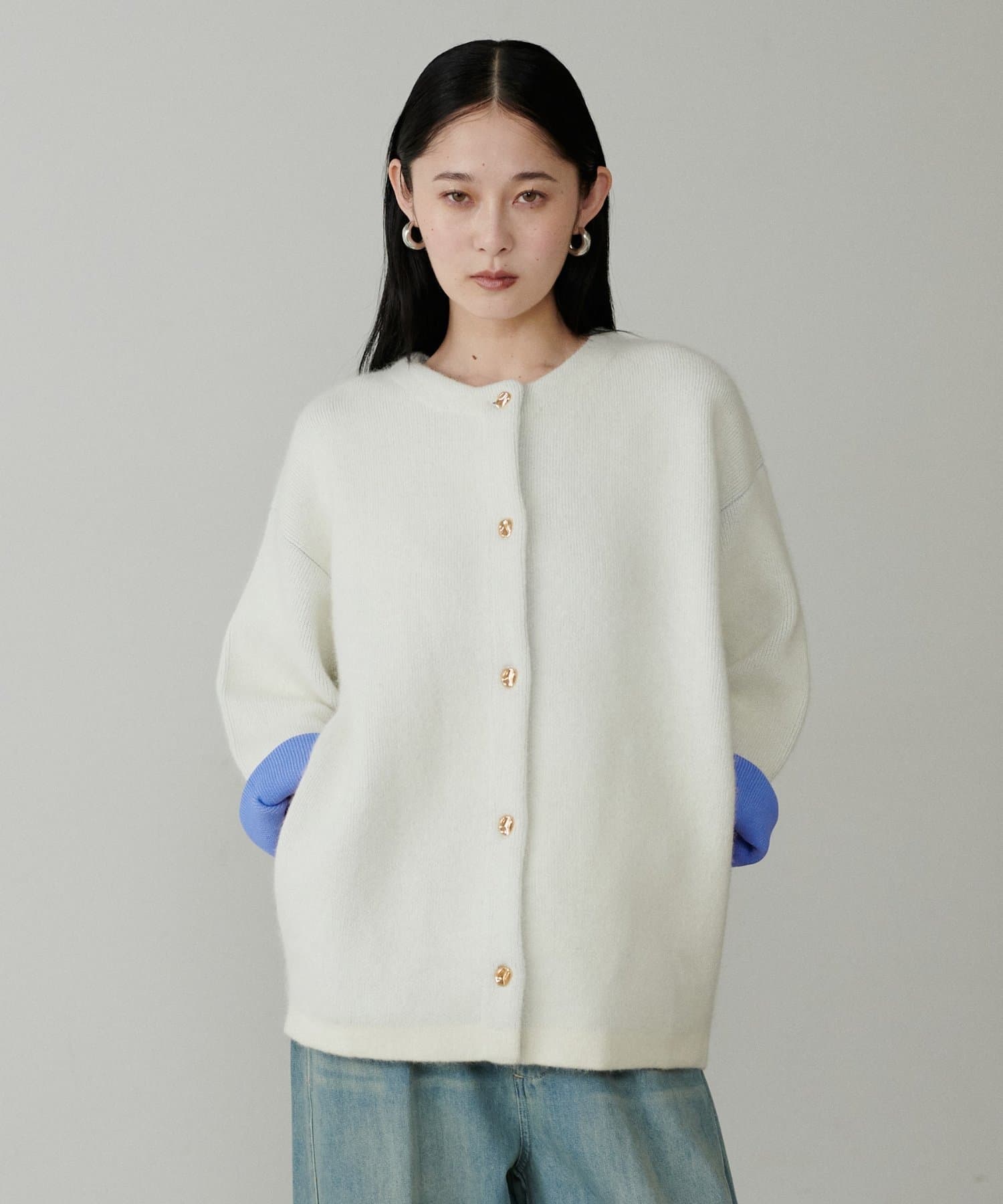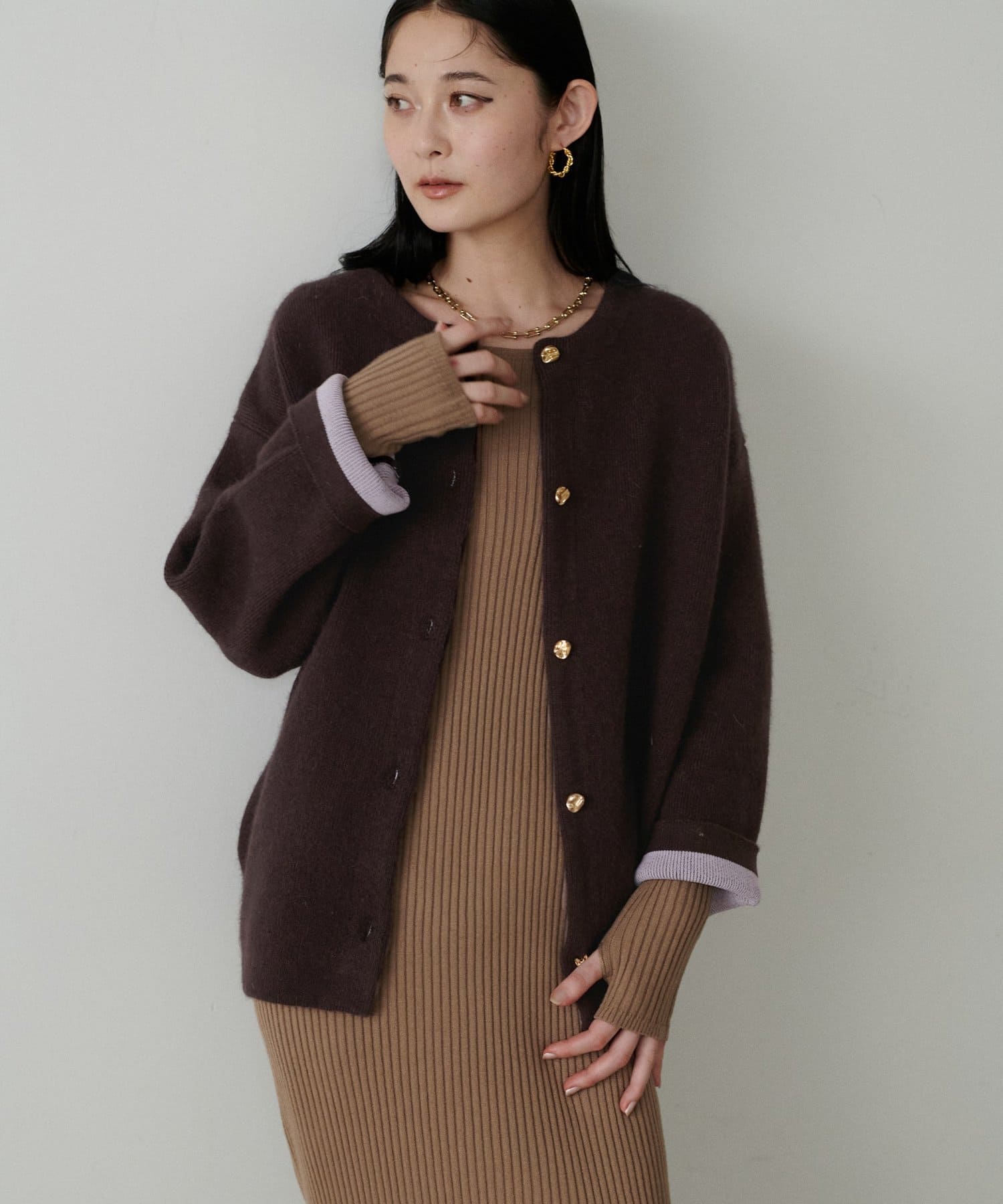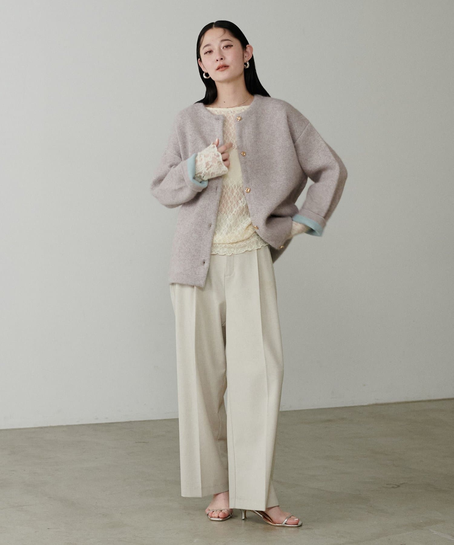 カーディガンの内側は、配色使いのダブルフェイス仕様に仕立て、釦を開けてお召し頂いたり、