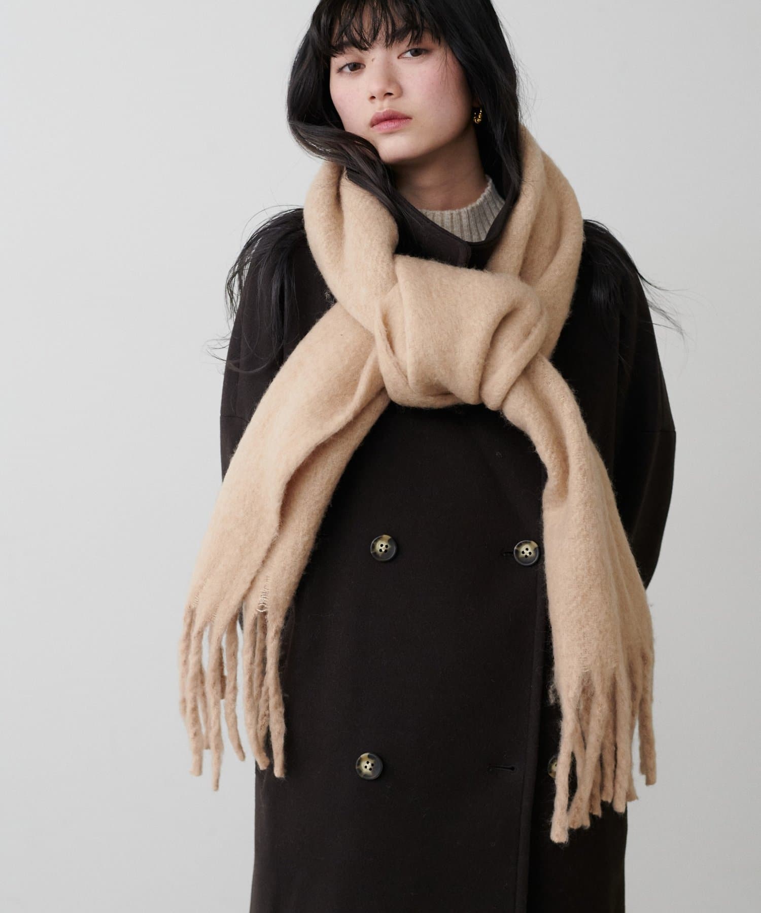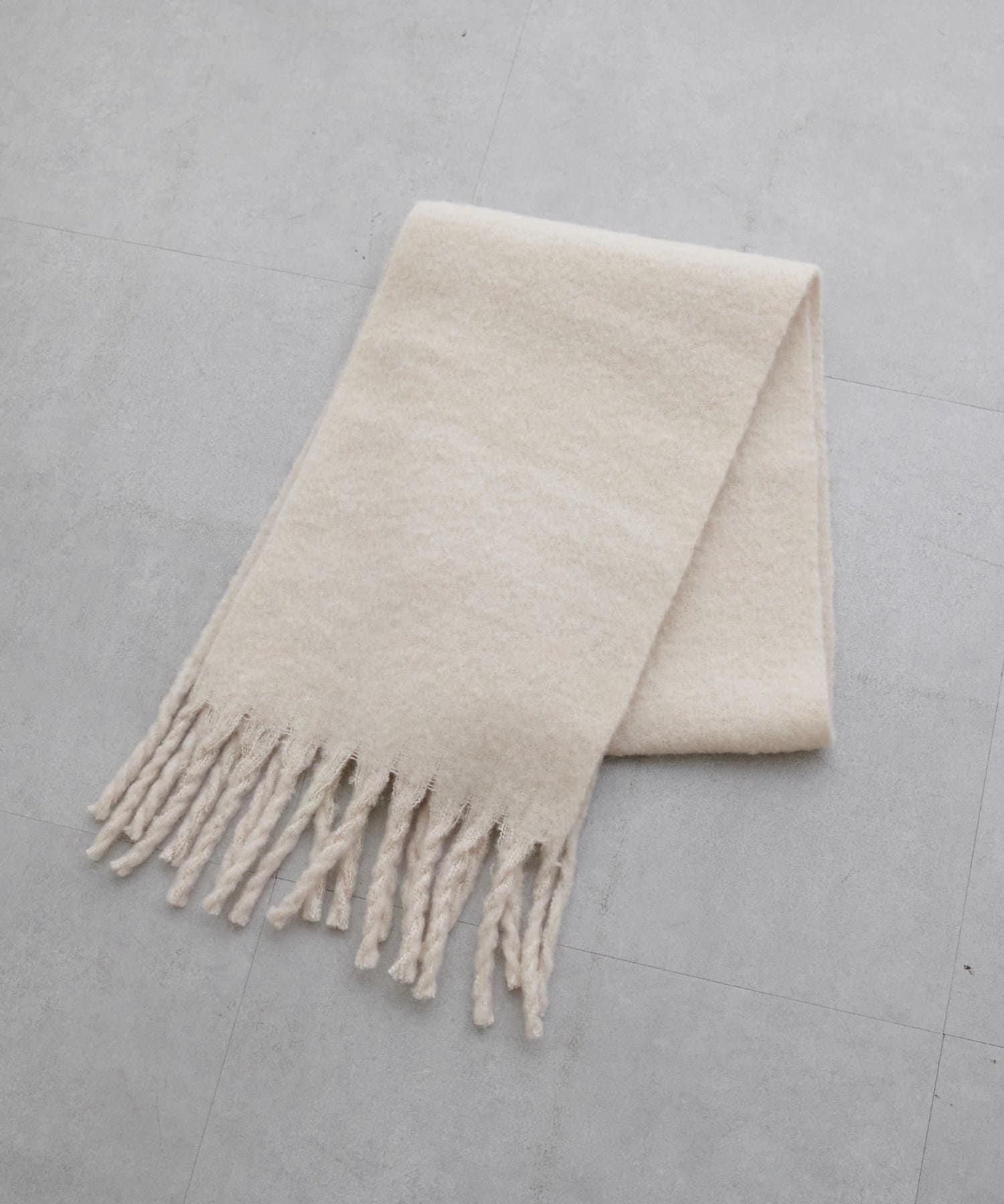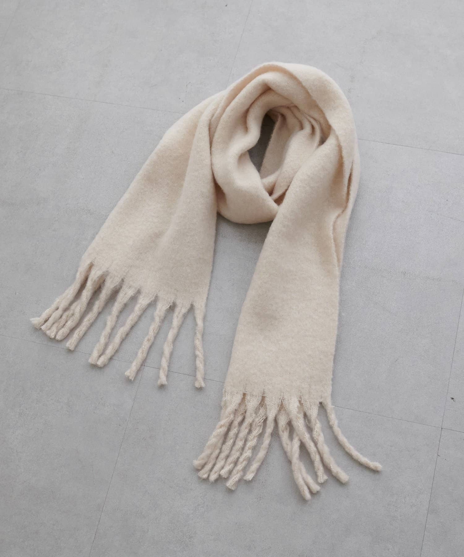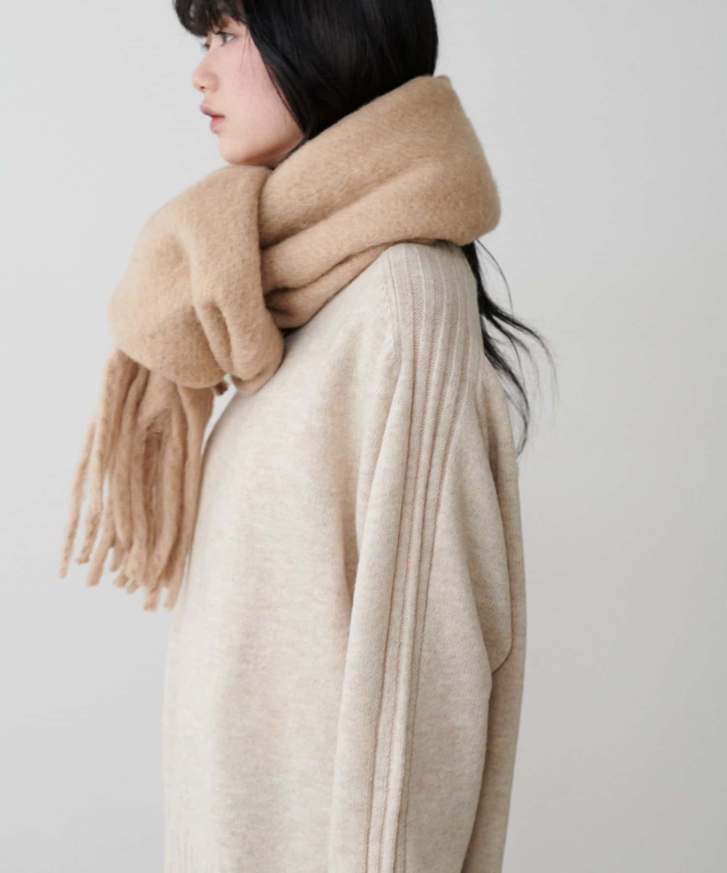 柔らかなブークレの質感と、ほのかなあたたかみが魅力のウール混マフラー。