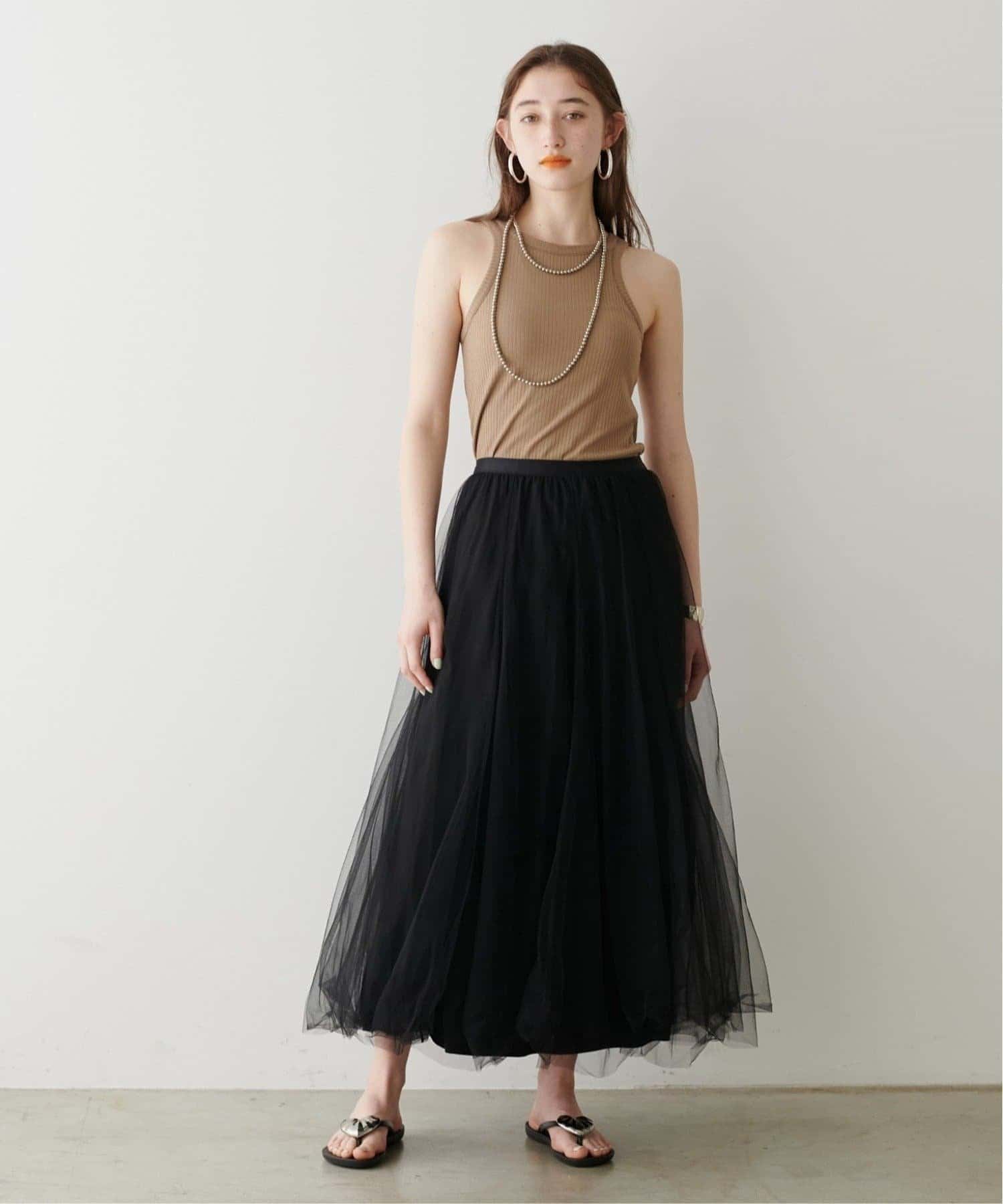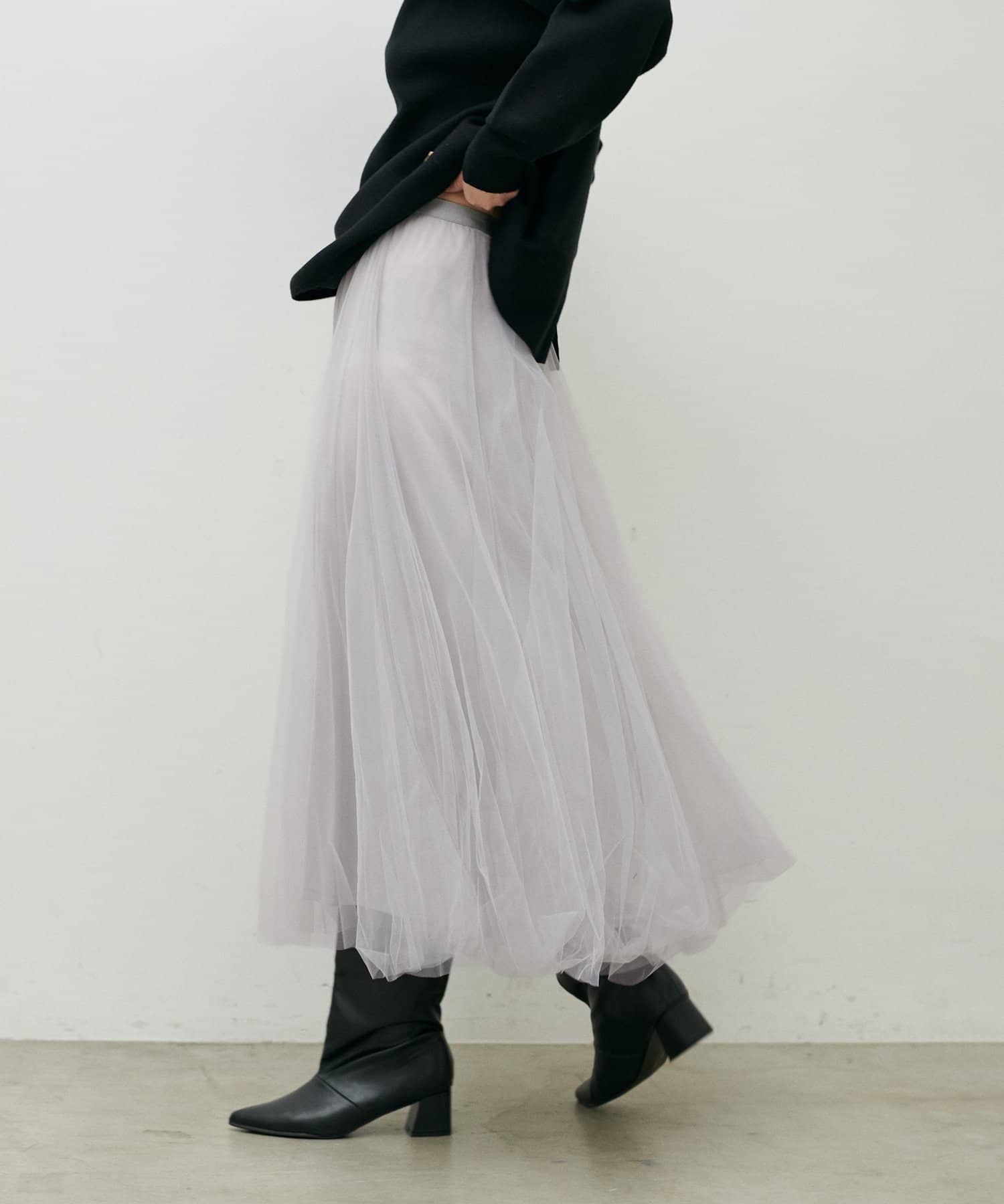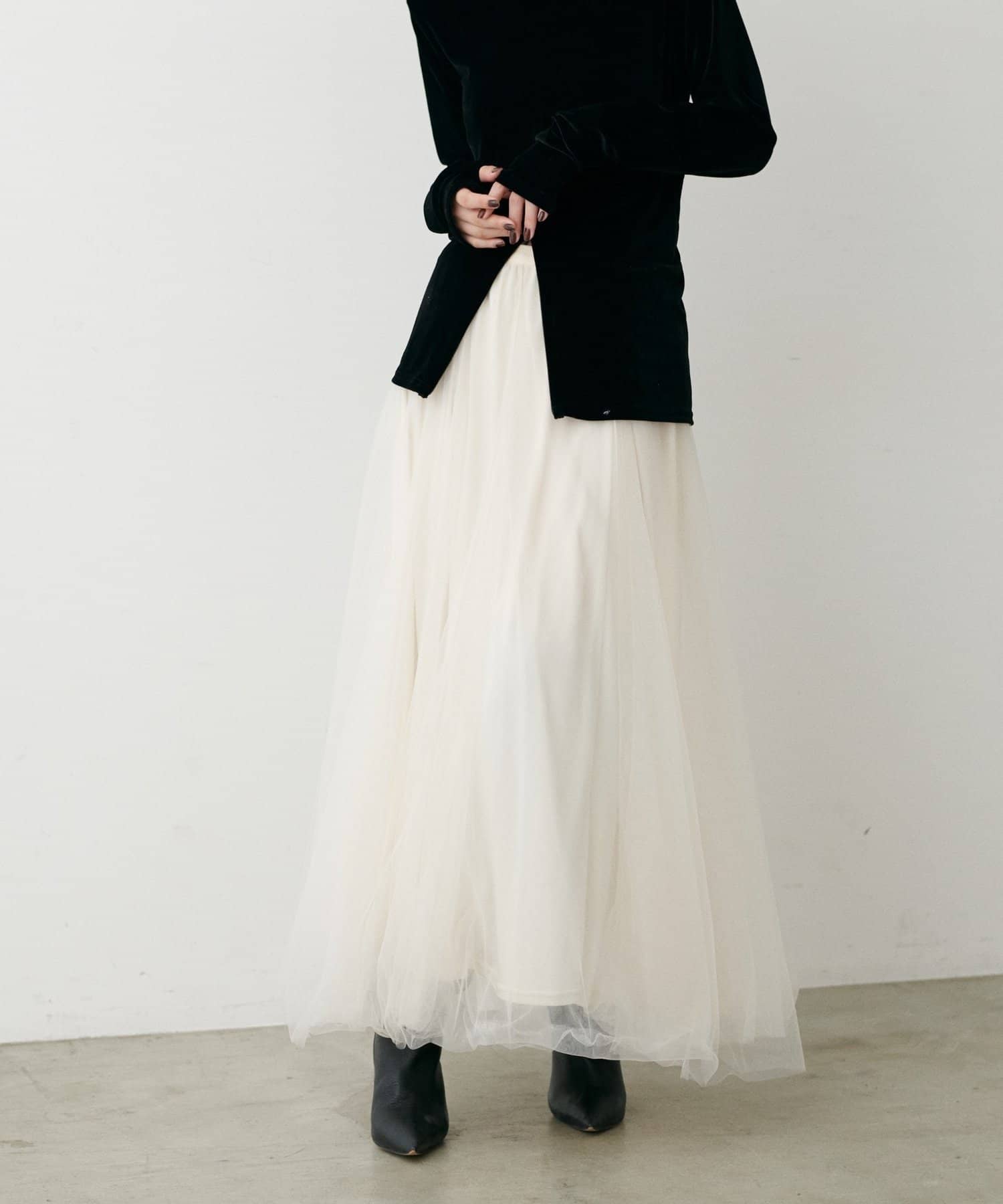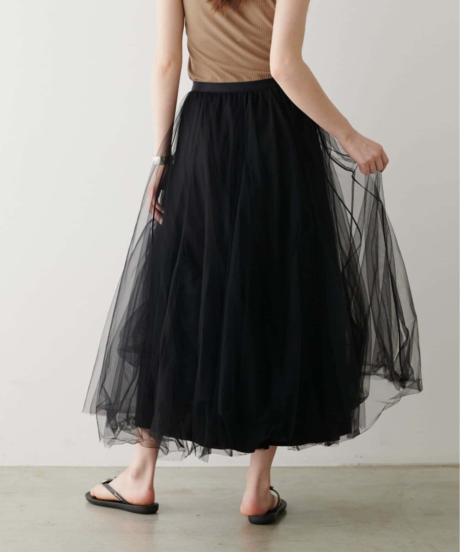チュールを2枚重ねてふんわりとボリュームを持たせたエレガントなフレアスカート。
