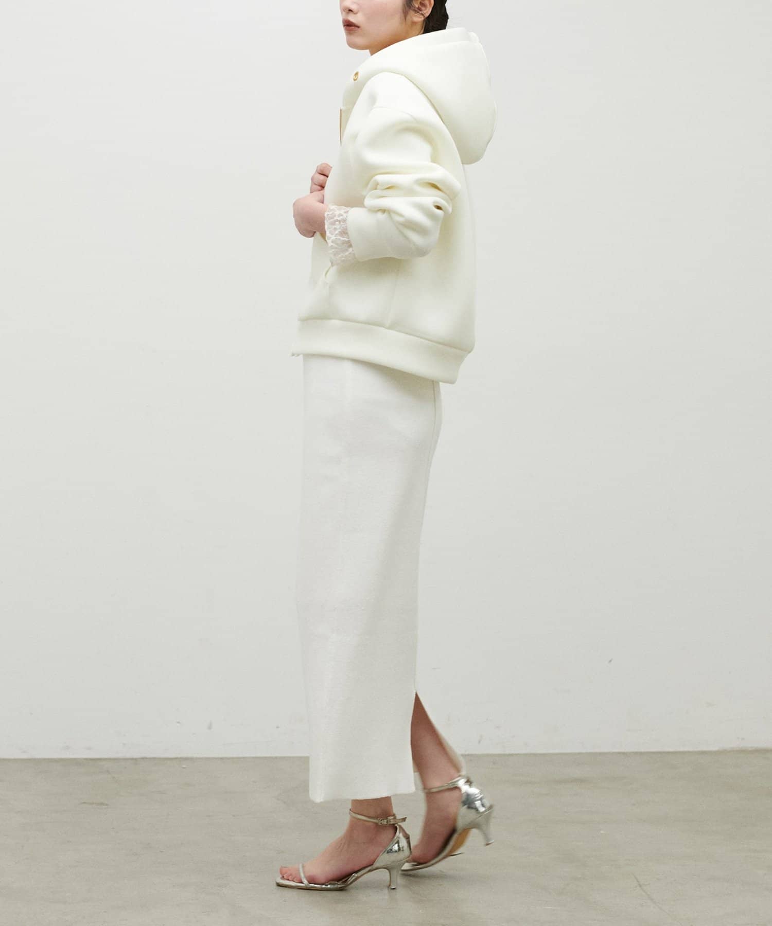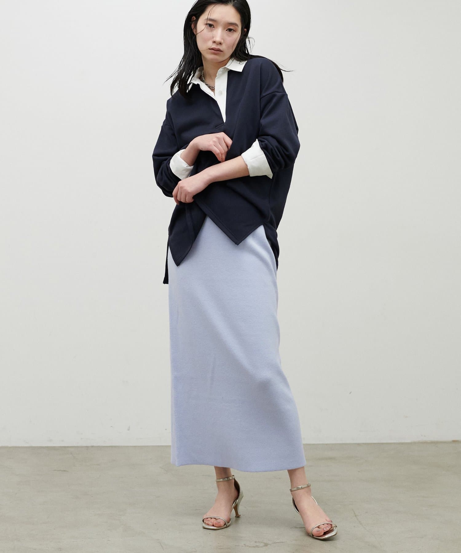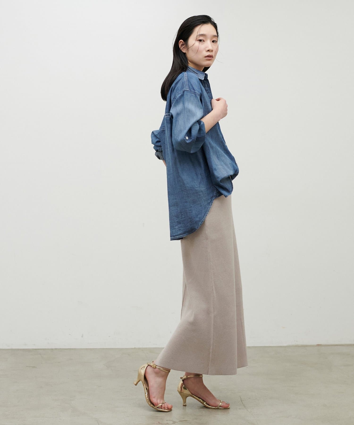 ストンと落ちるIラインシルエットで、甘さを抑えた大人の印象に仕上げました。
