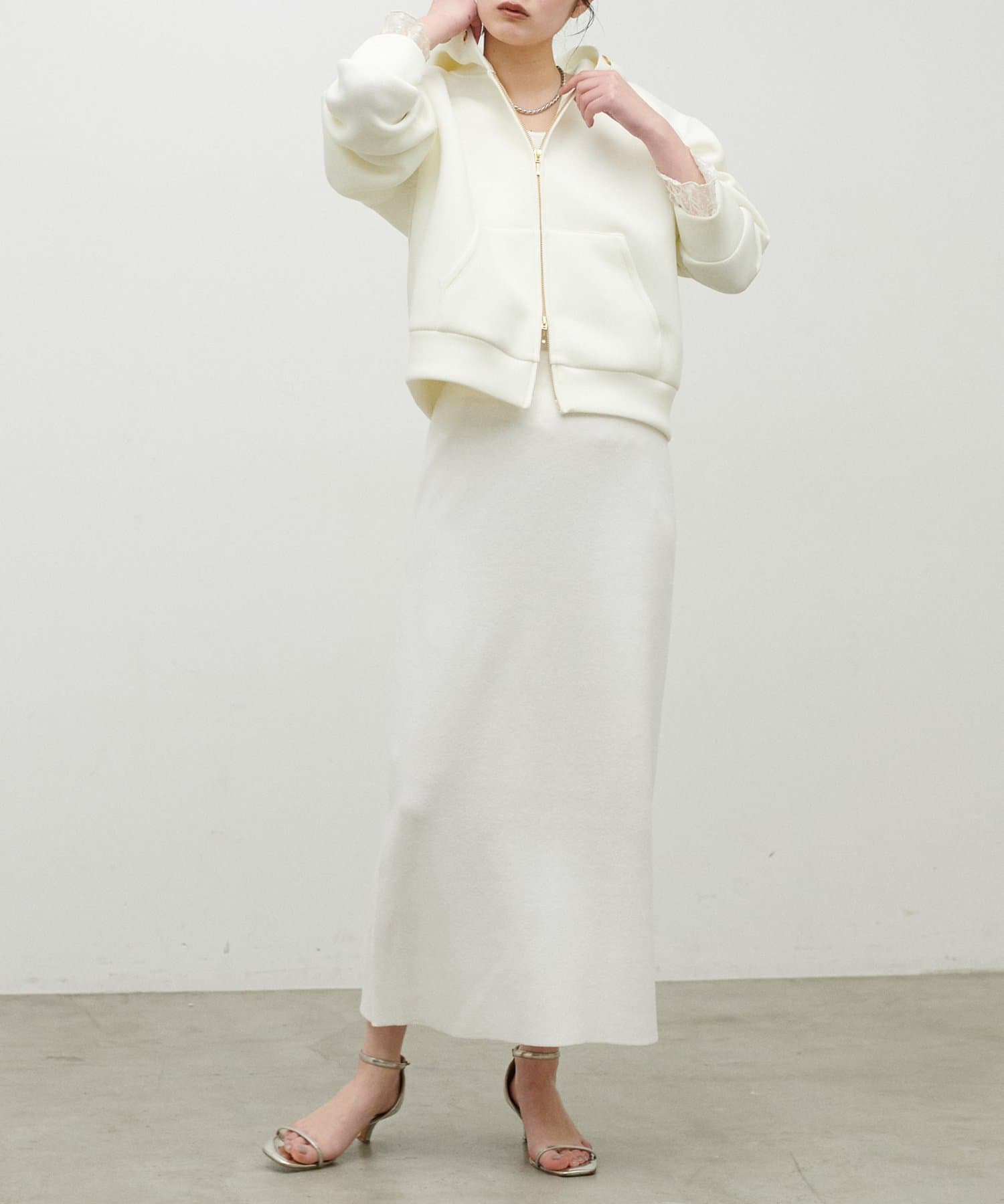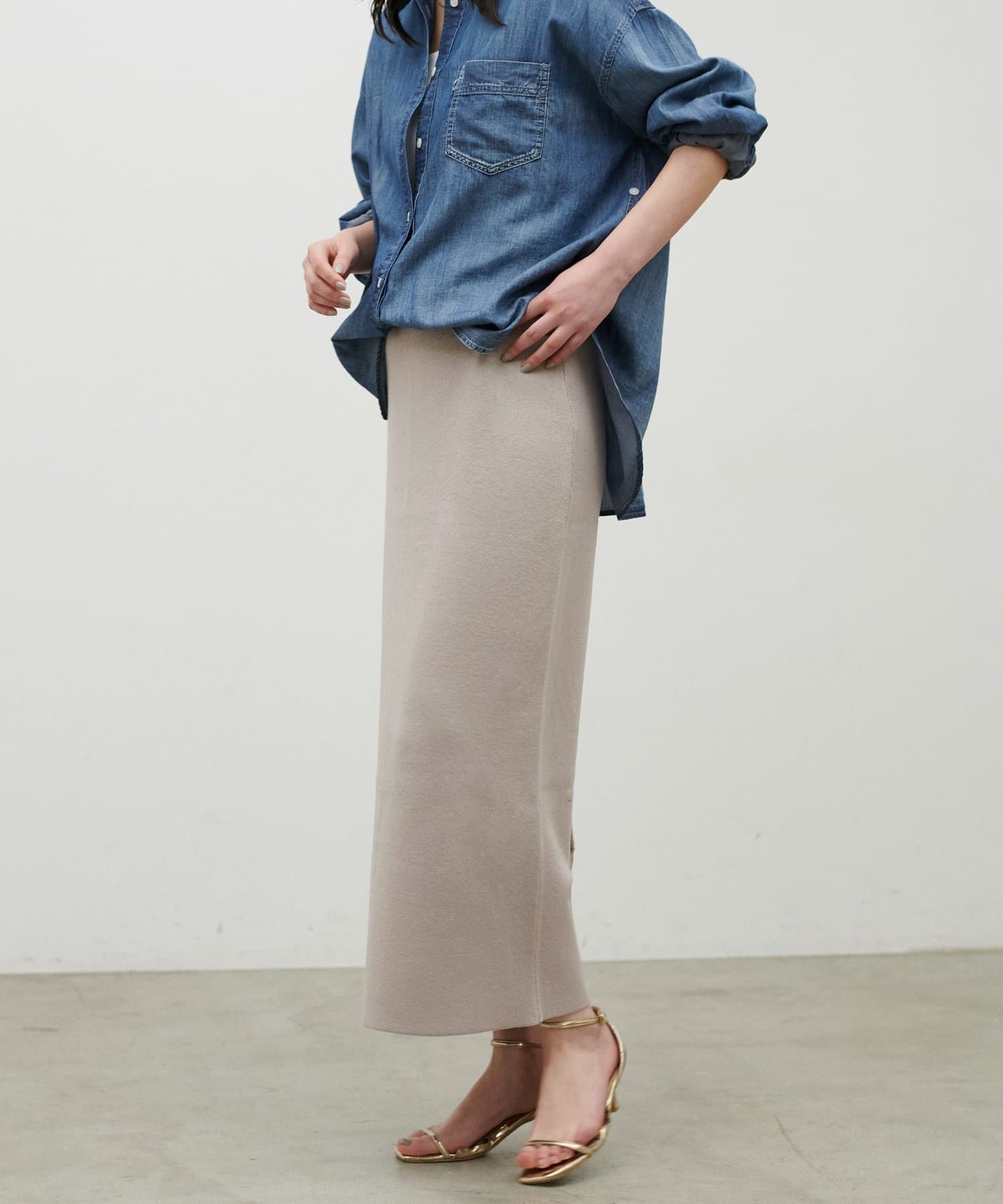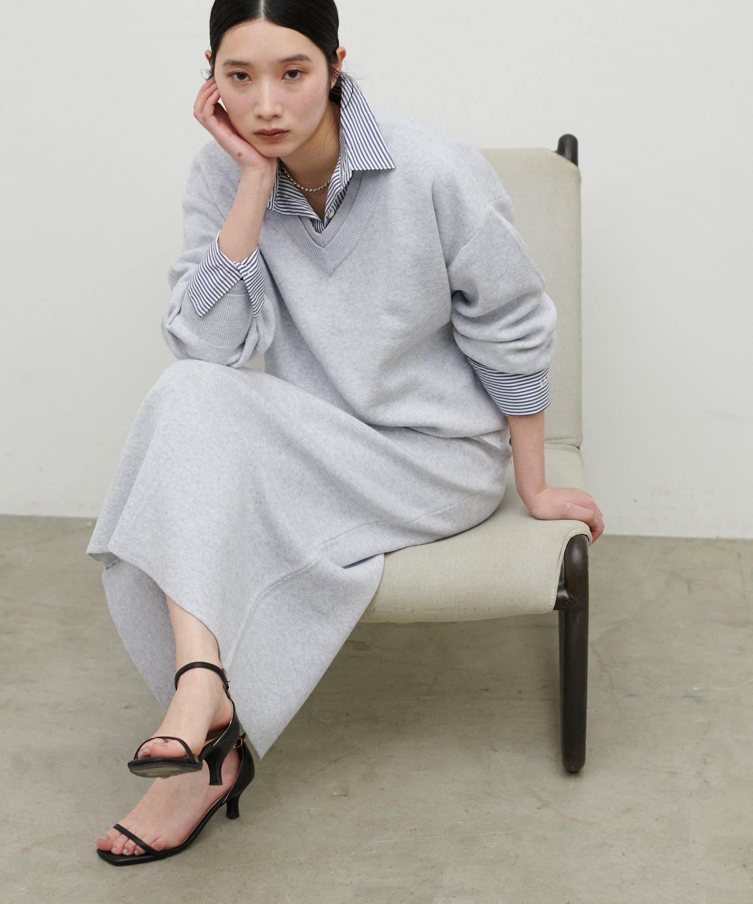 ストンと落ちるIラインシルエットで、甘さを抑えた大人の印象に仕上げました。