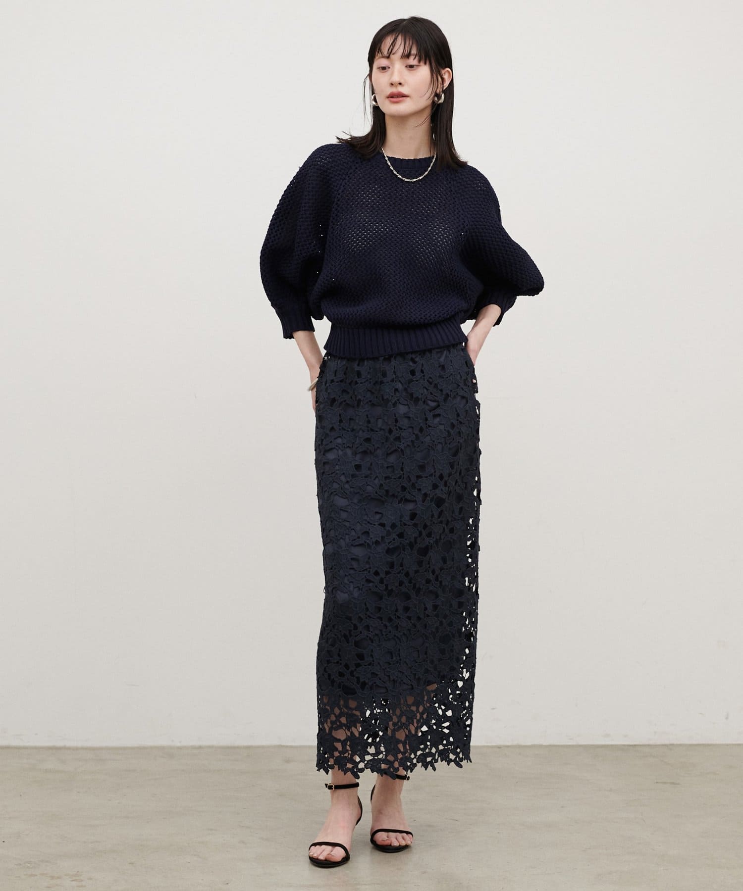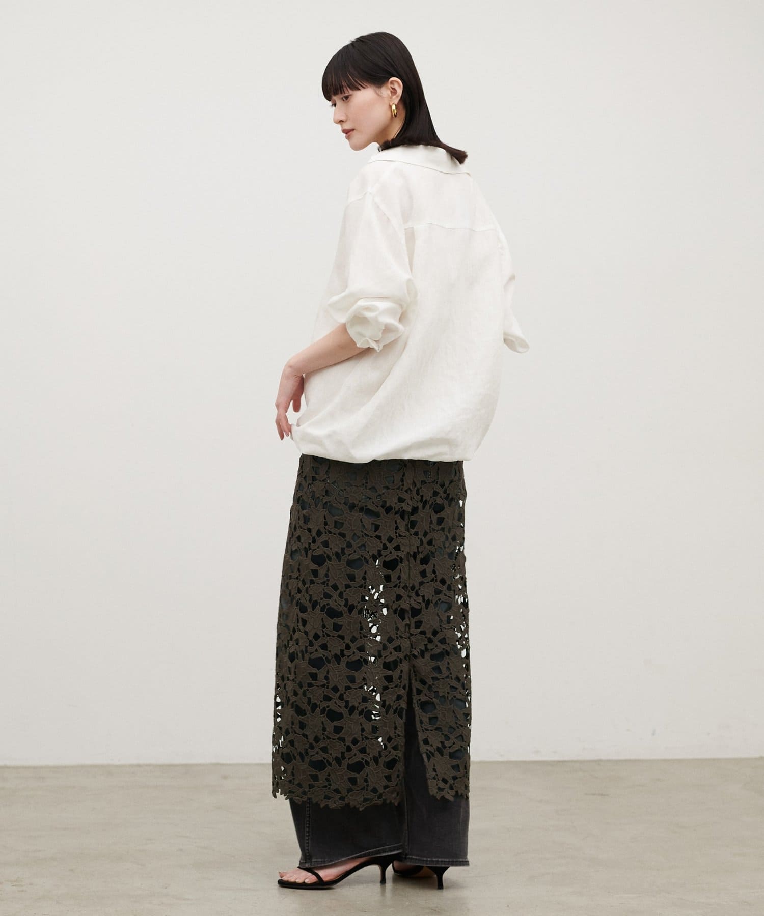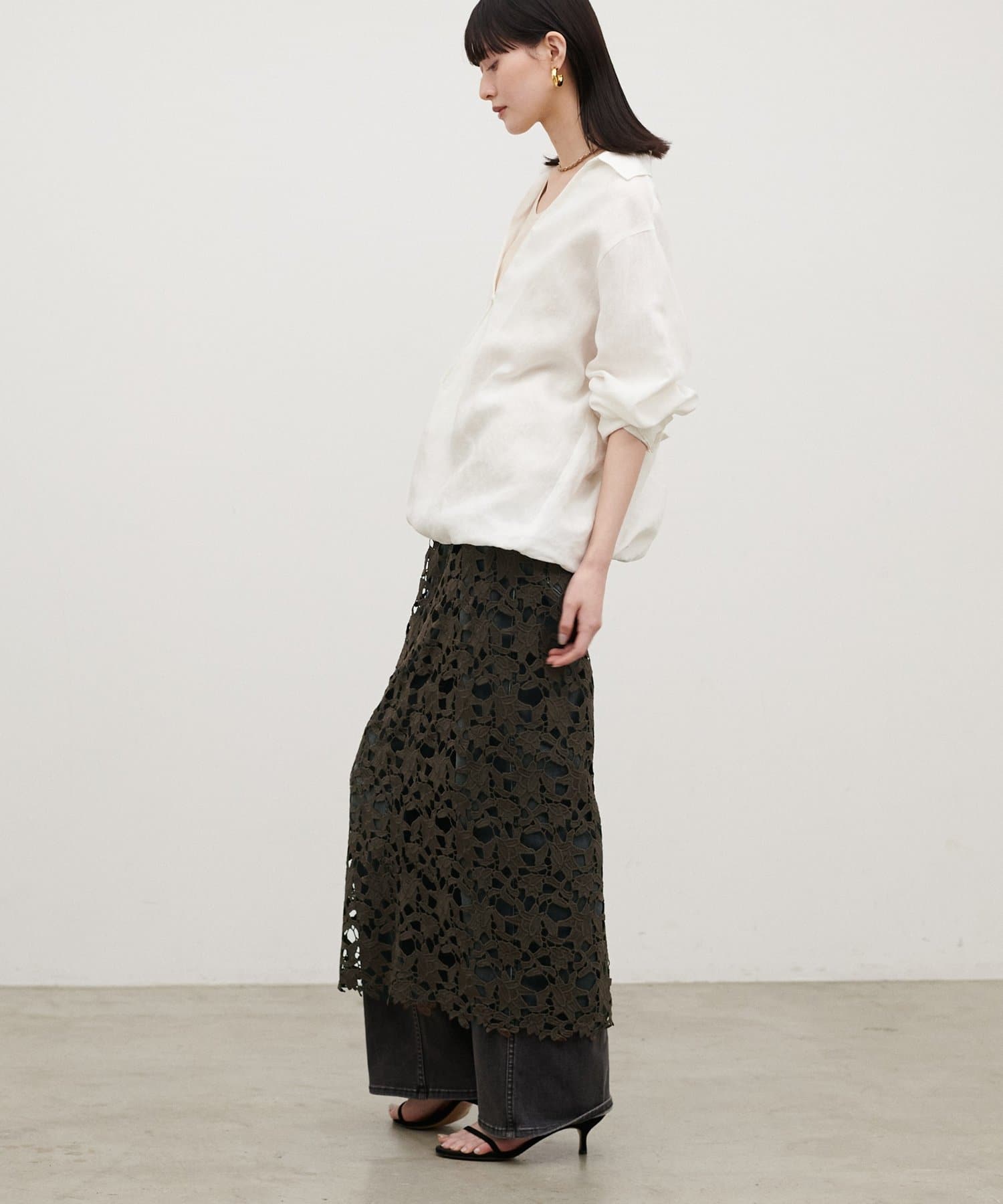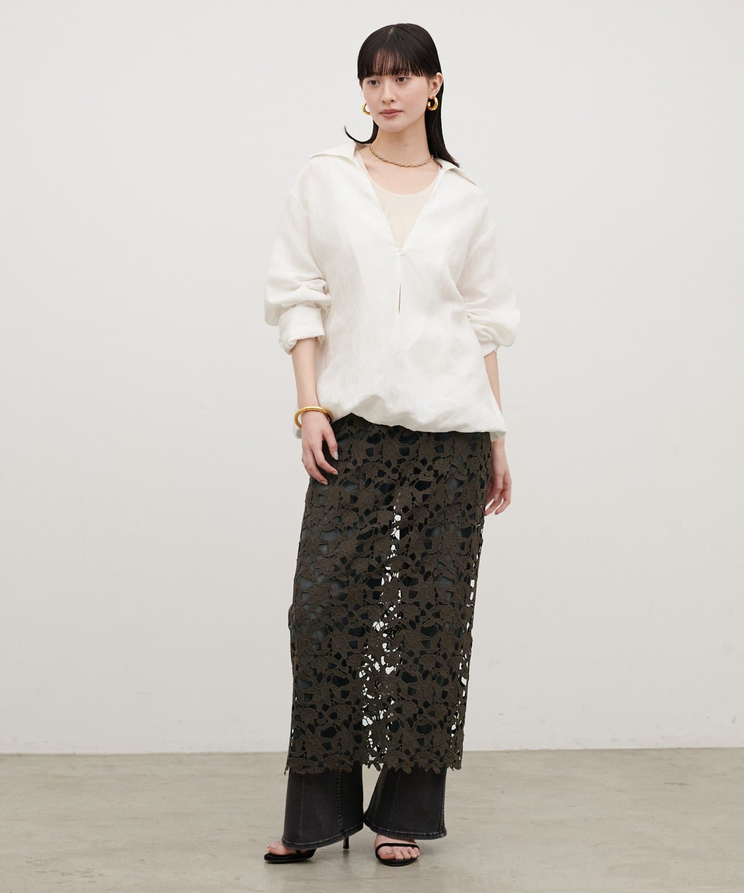 ジャケットやシャツと合わせれば、レースの表情が引き立つきれいめな印象に。