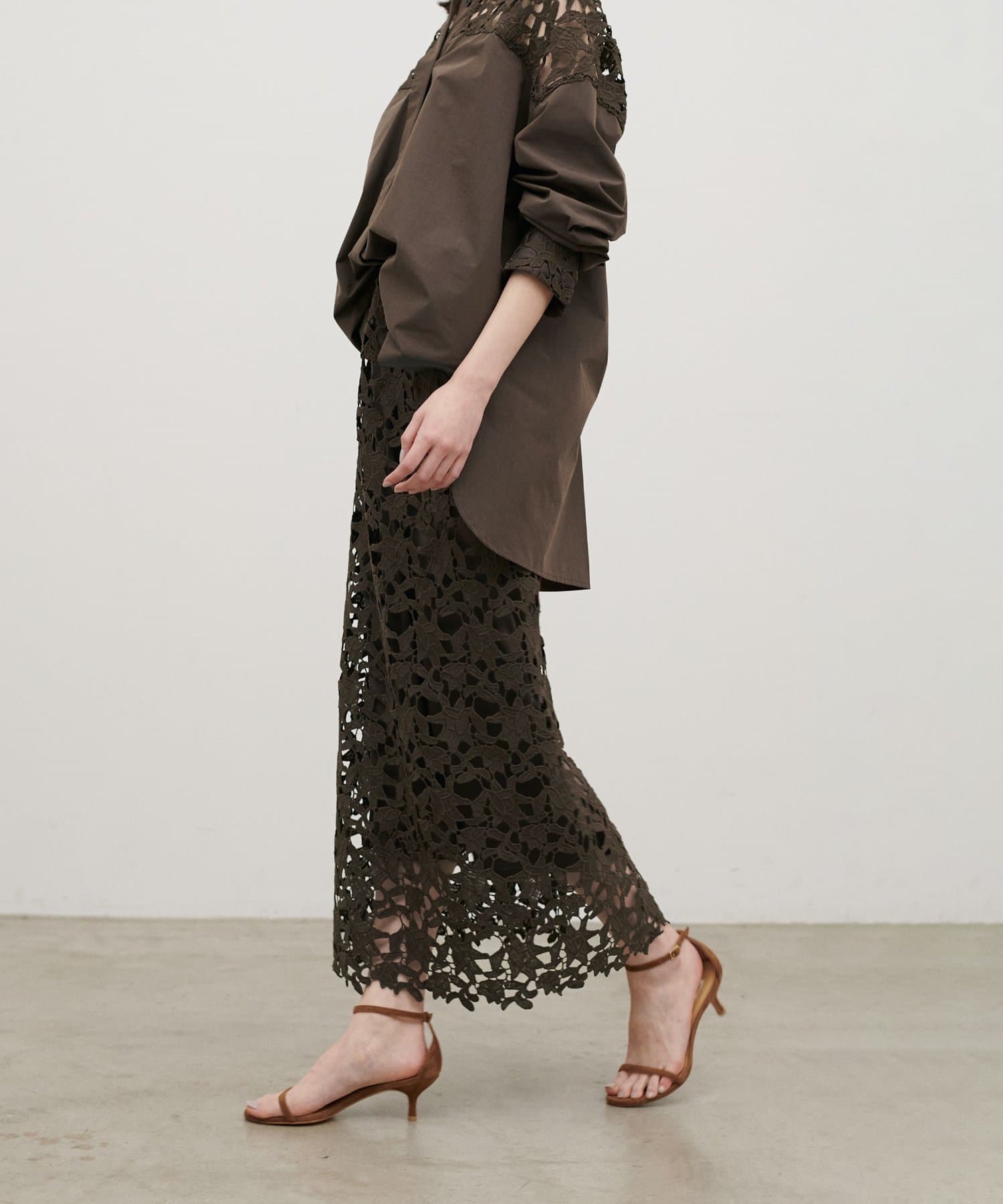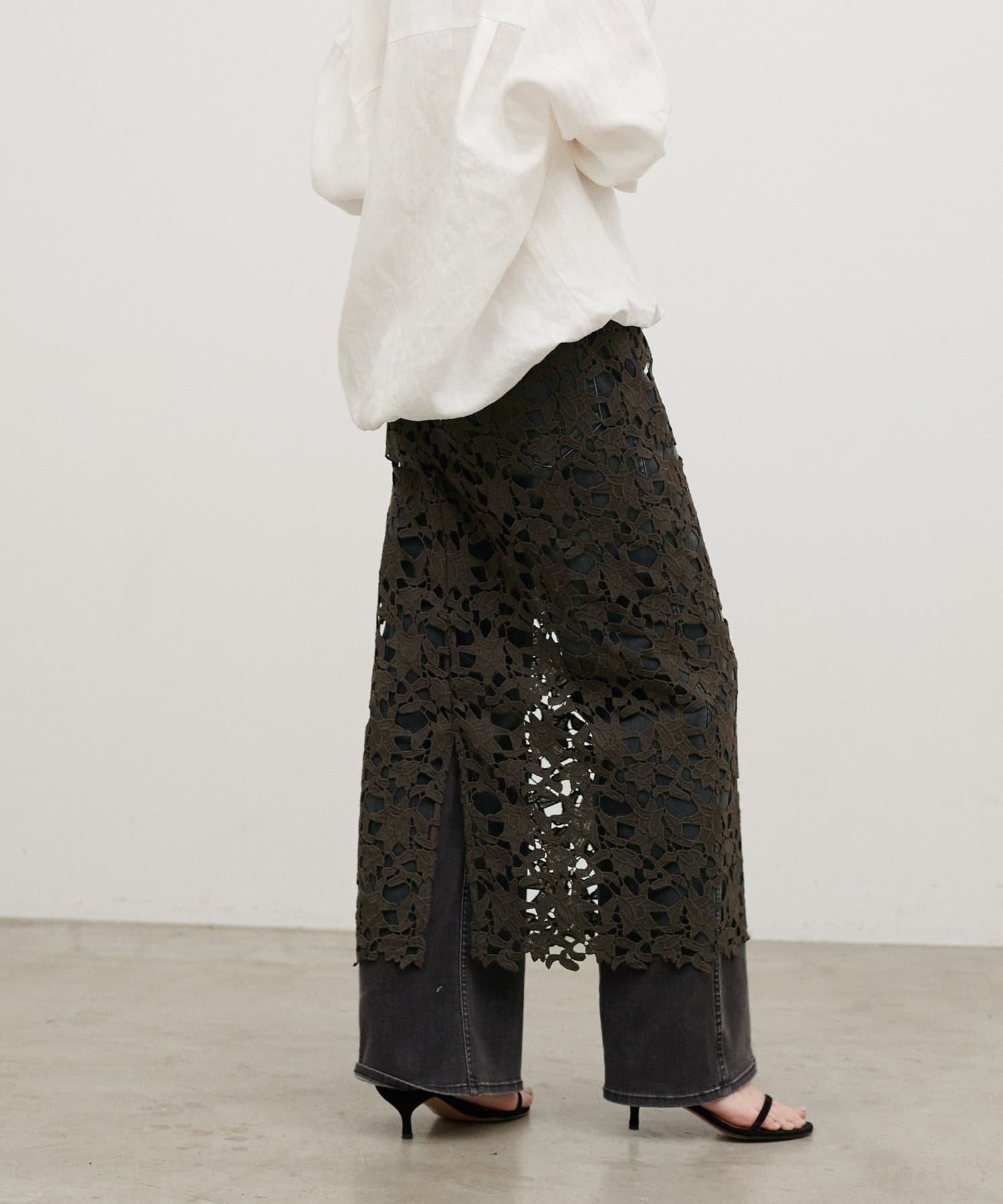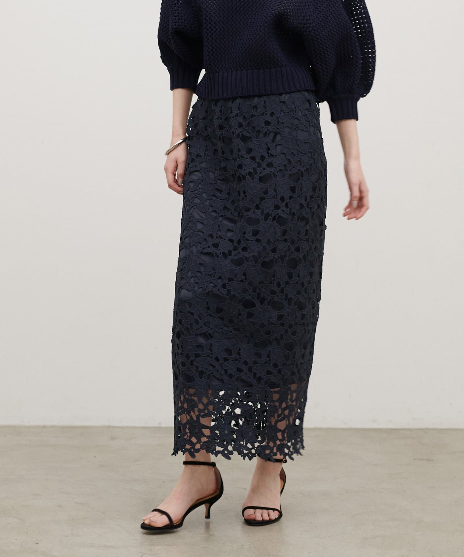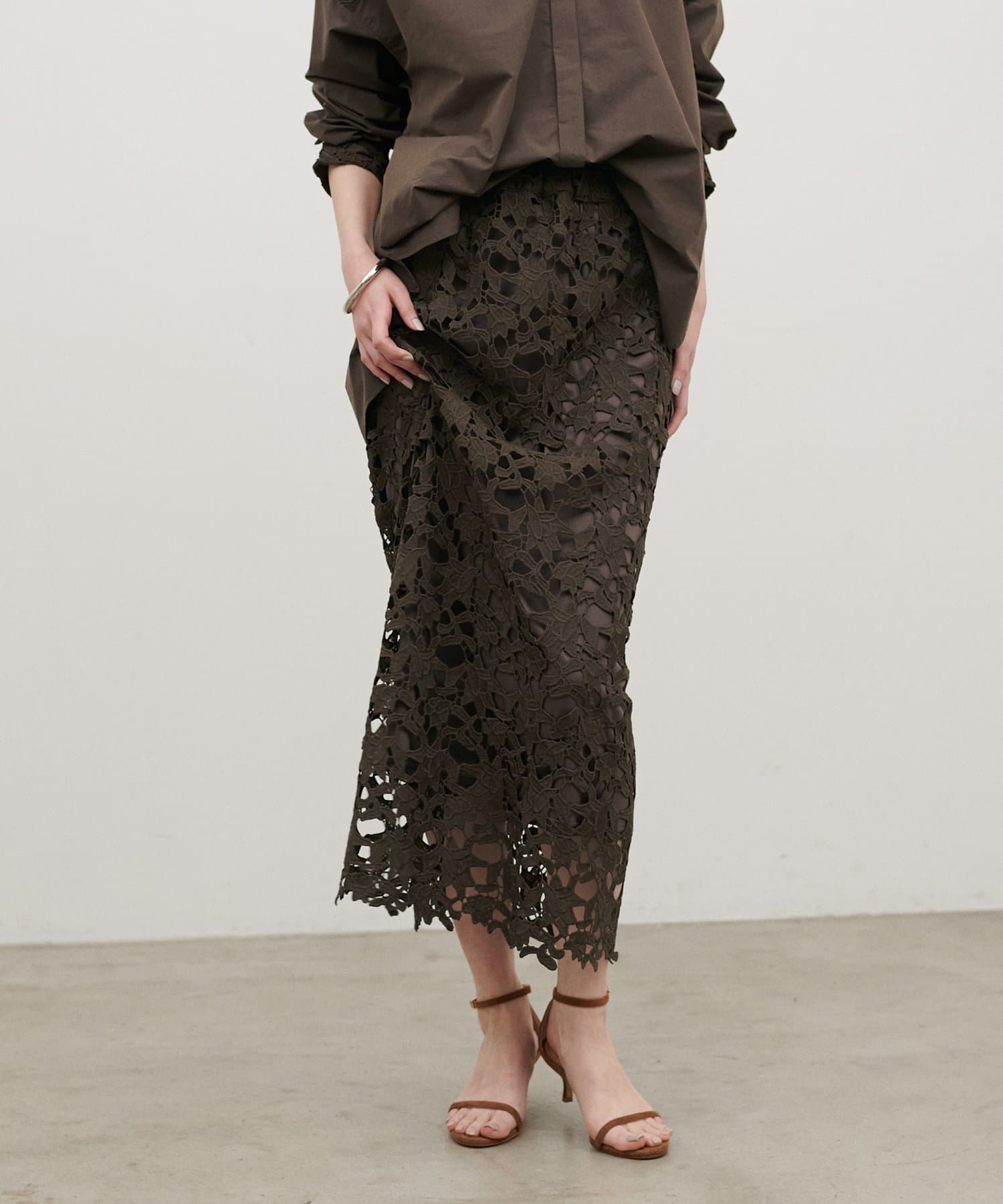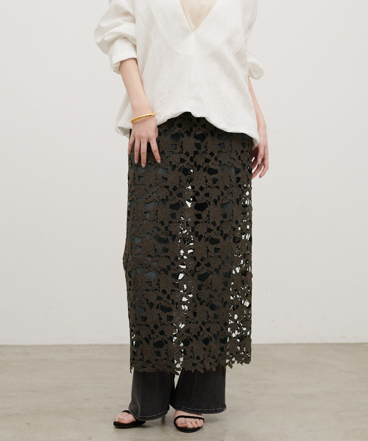 繊細な刺しゅうレースが目を惹くロングスカート。