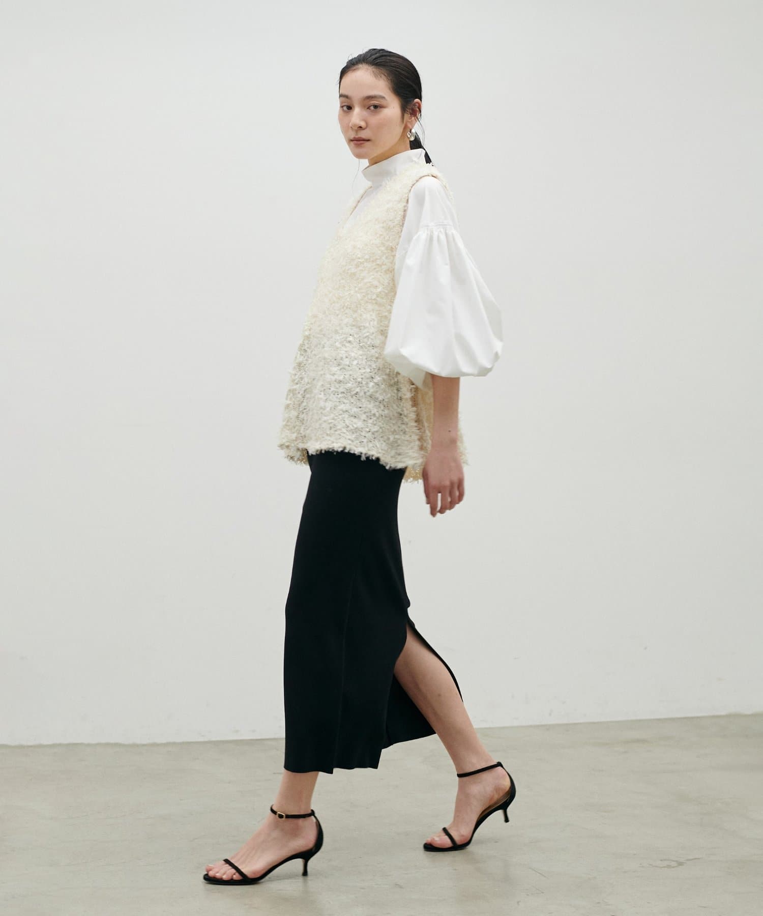 素材感がありながらも甘くなりすぎず、大人っぽく着こなせるのが魅力。