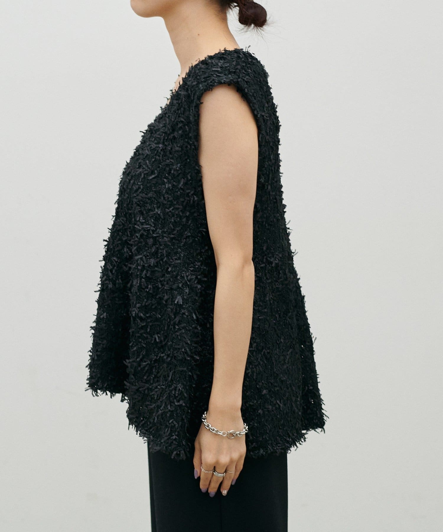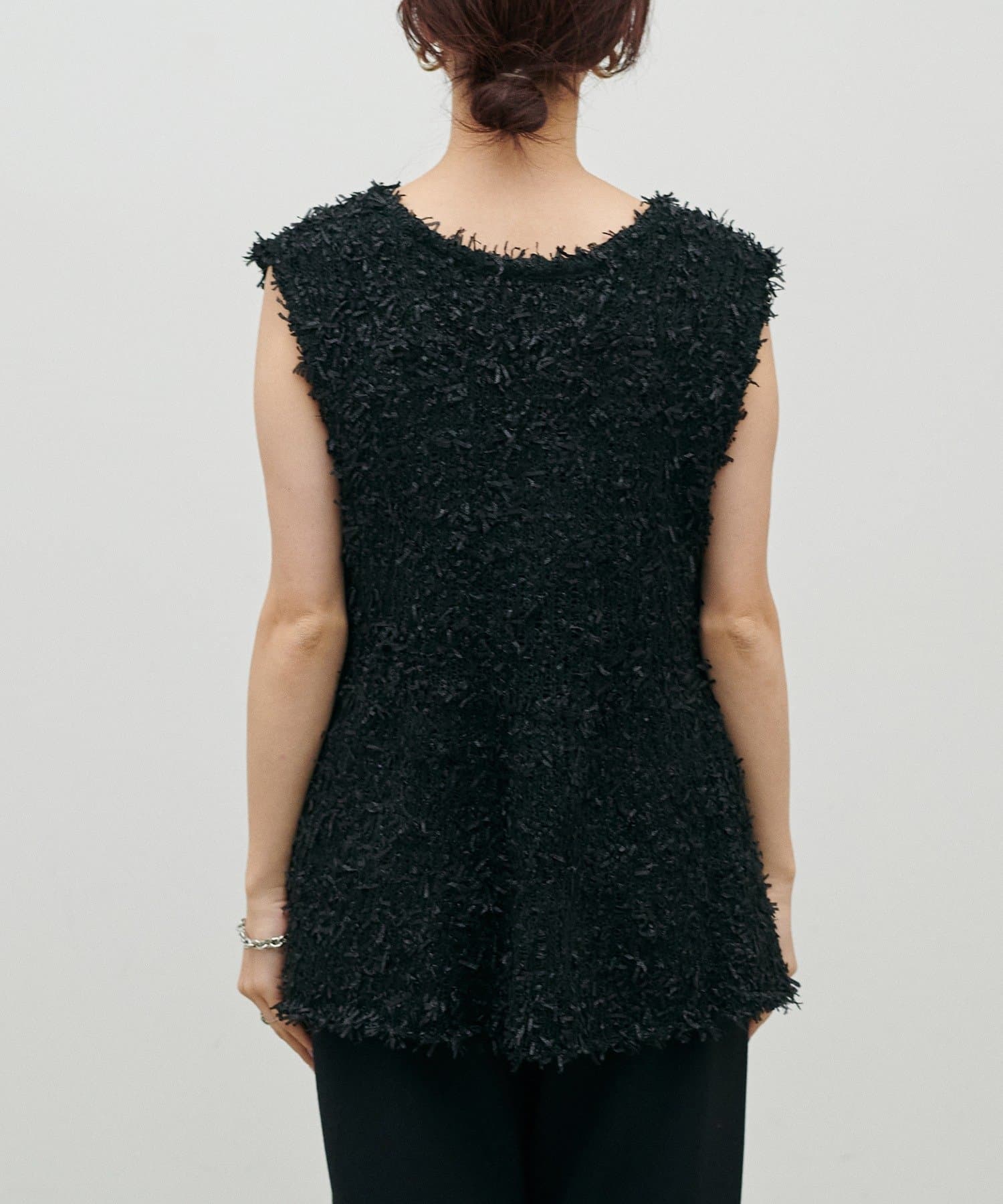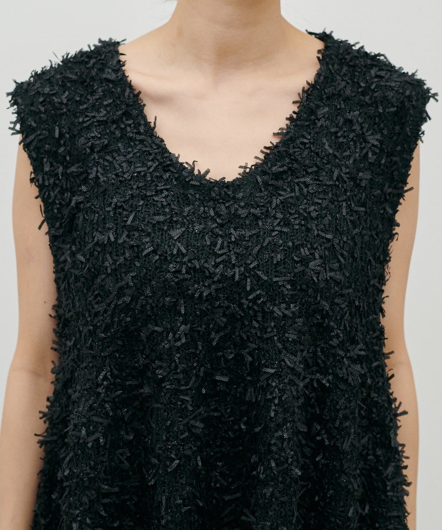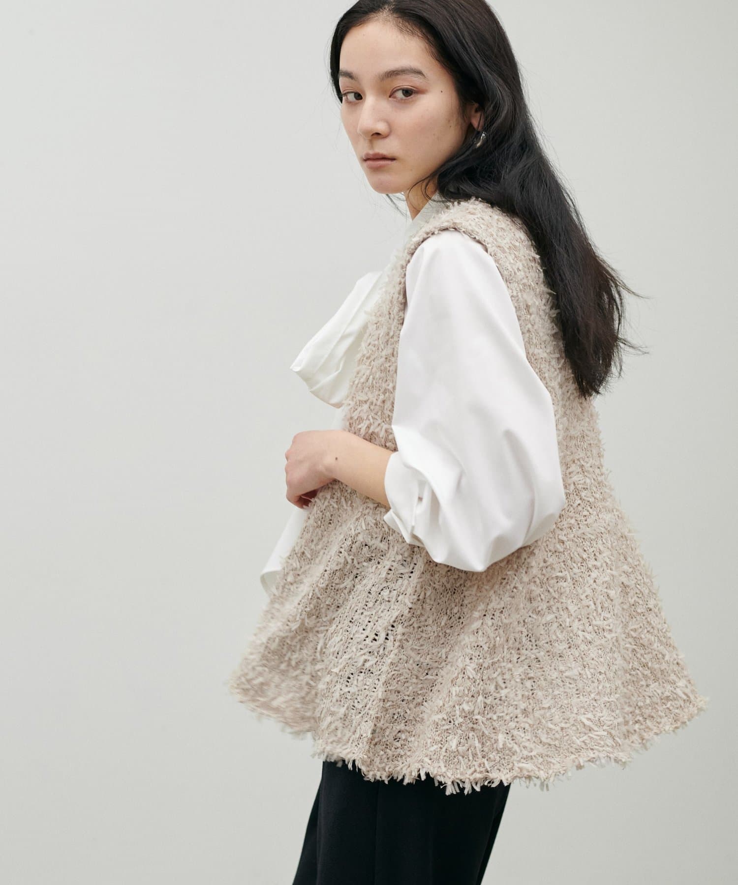 表情のあるリボンヤーン素材を使用した、存在感のあるニットベスト。