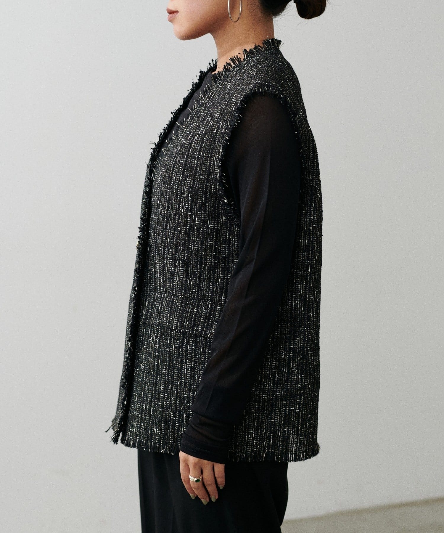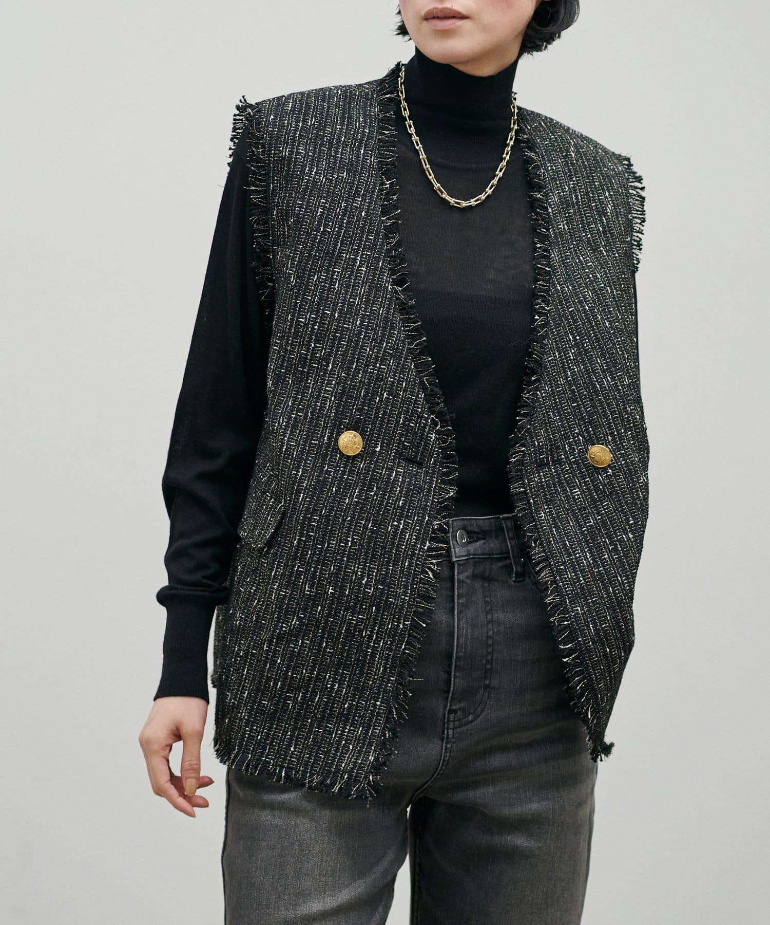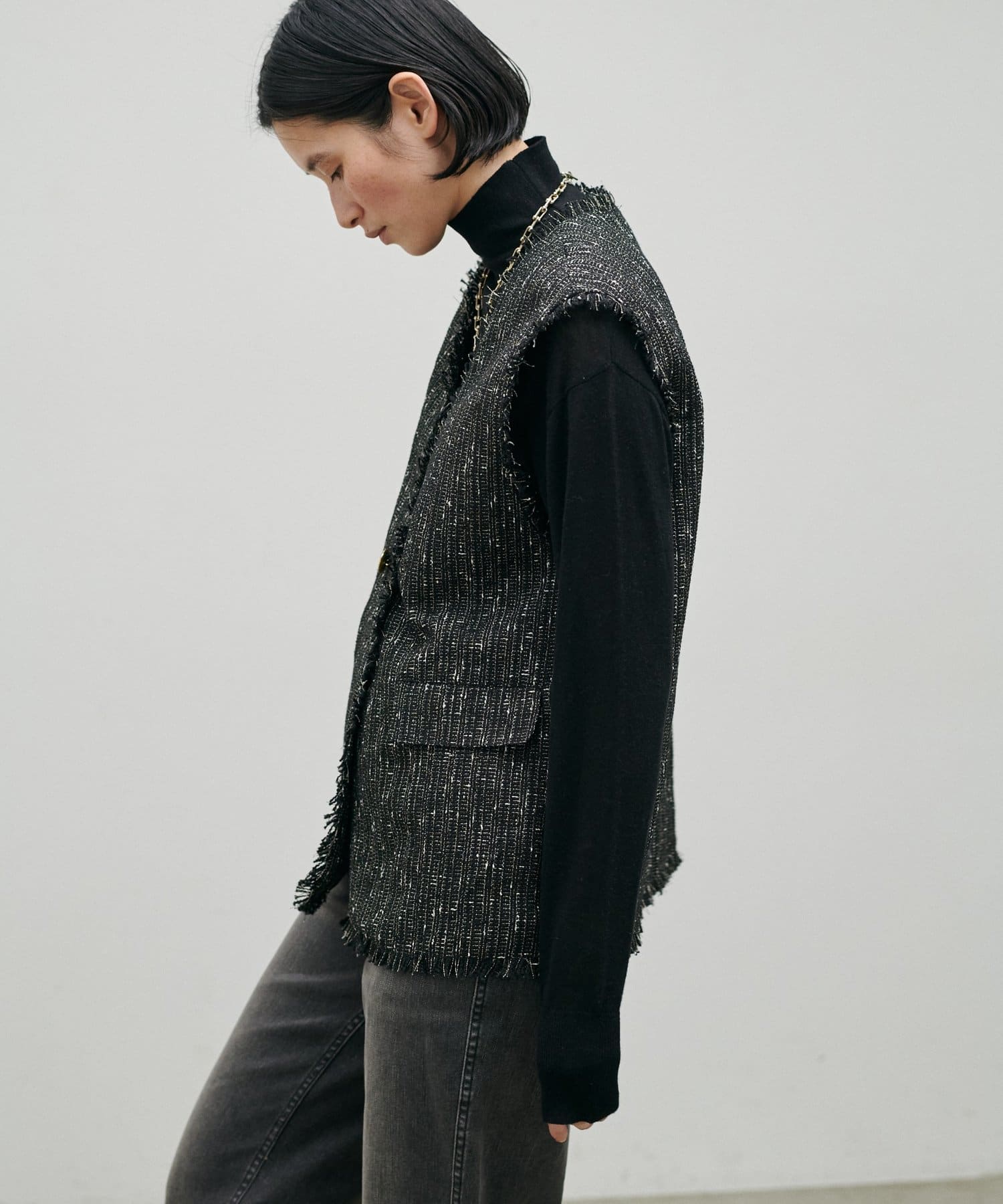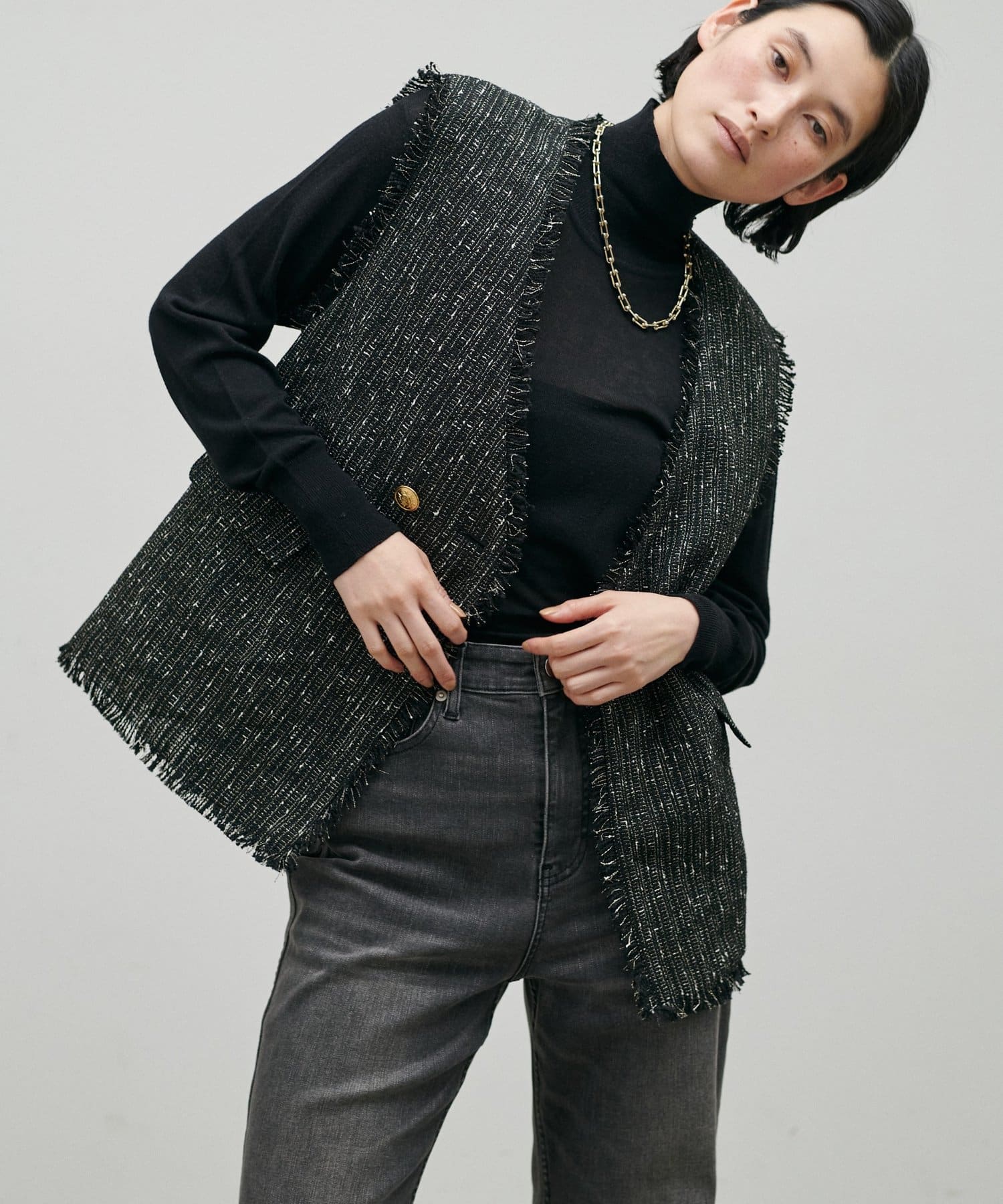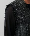さりげなくラメ糸が織り込まれた高級感のあるツイード素材のベストが登場。