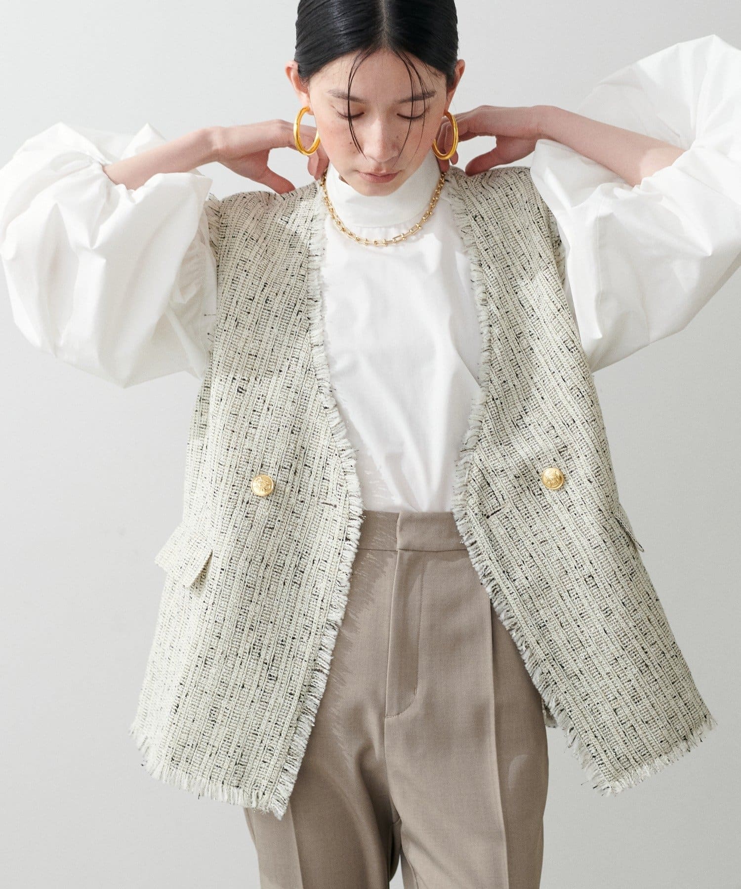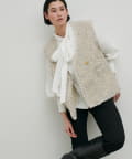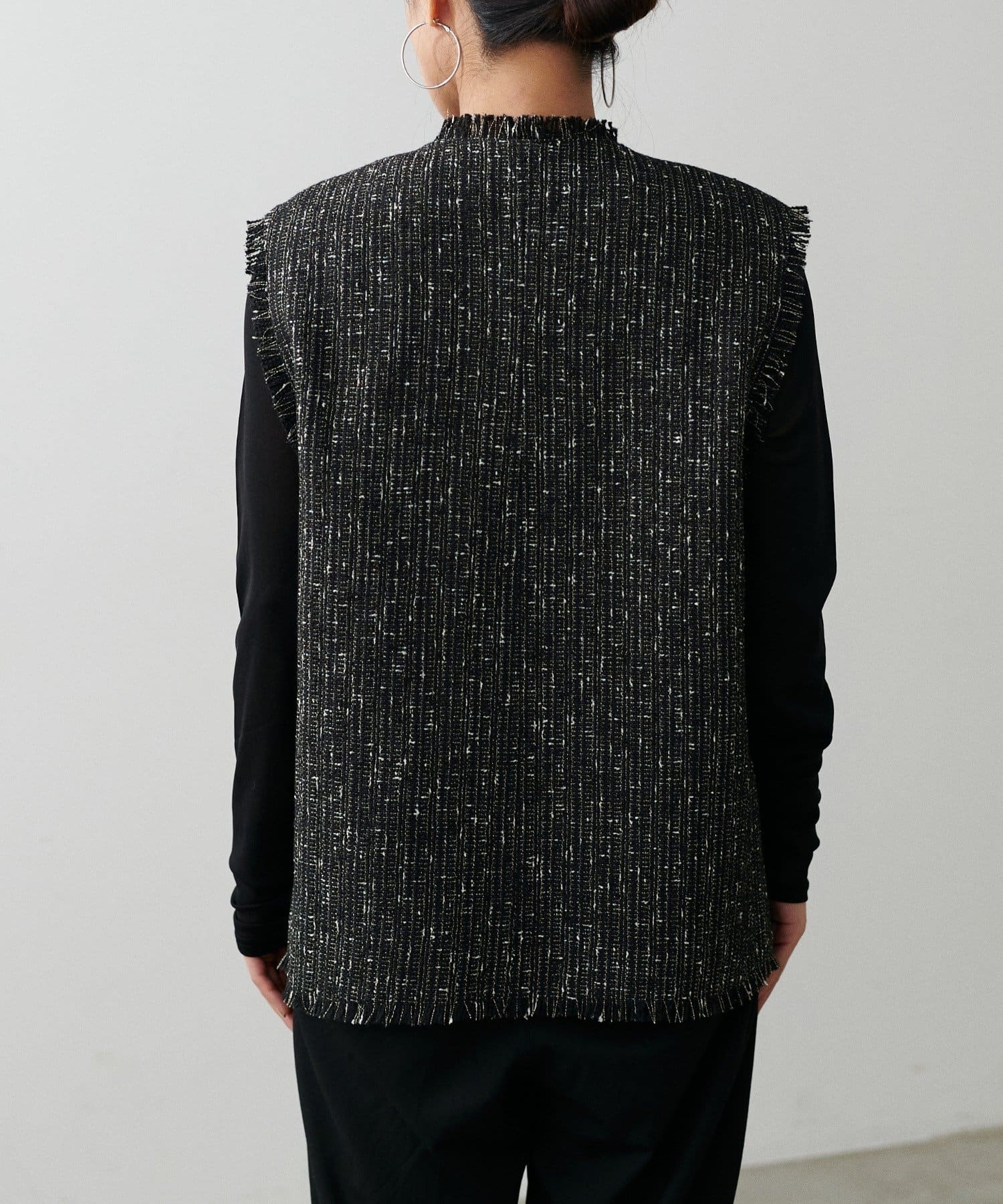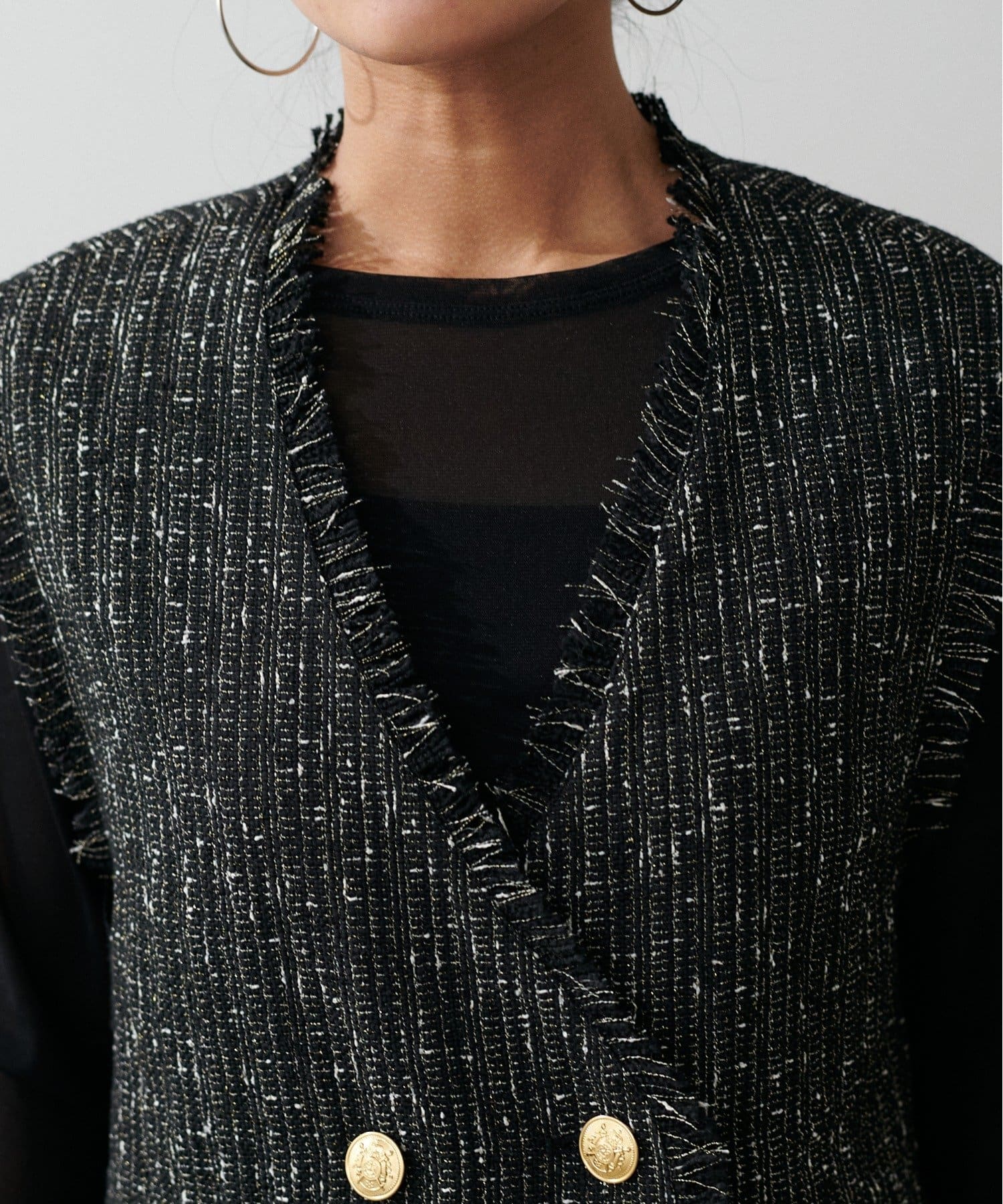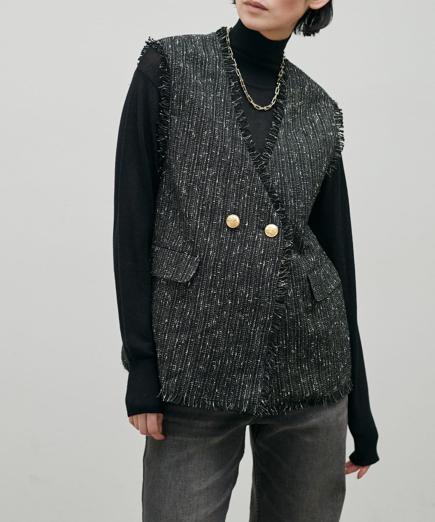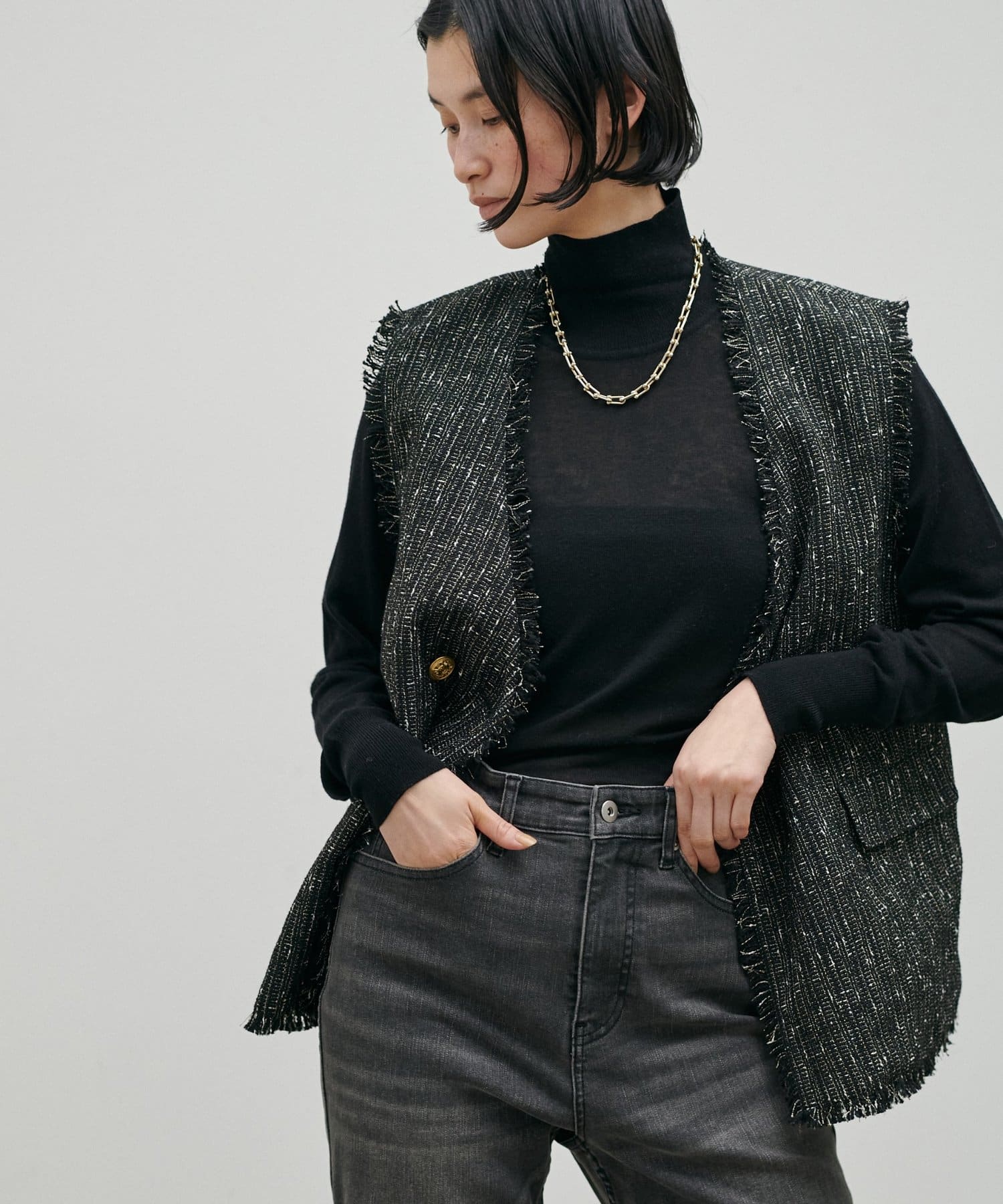 さりげなくラメ糸が織り込まれた高級感のあるツイード素材のベストが登場。