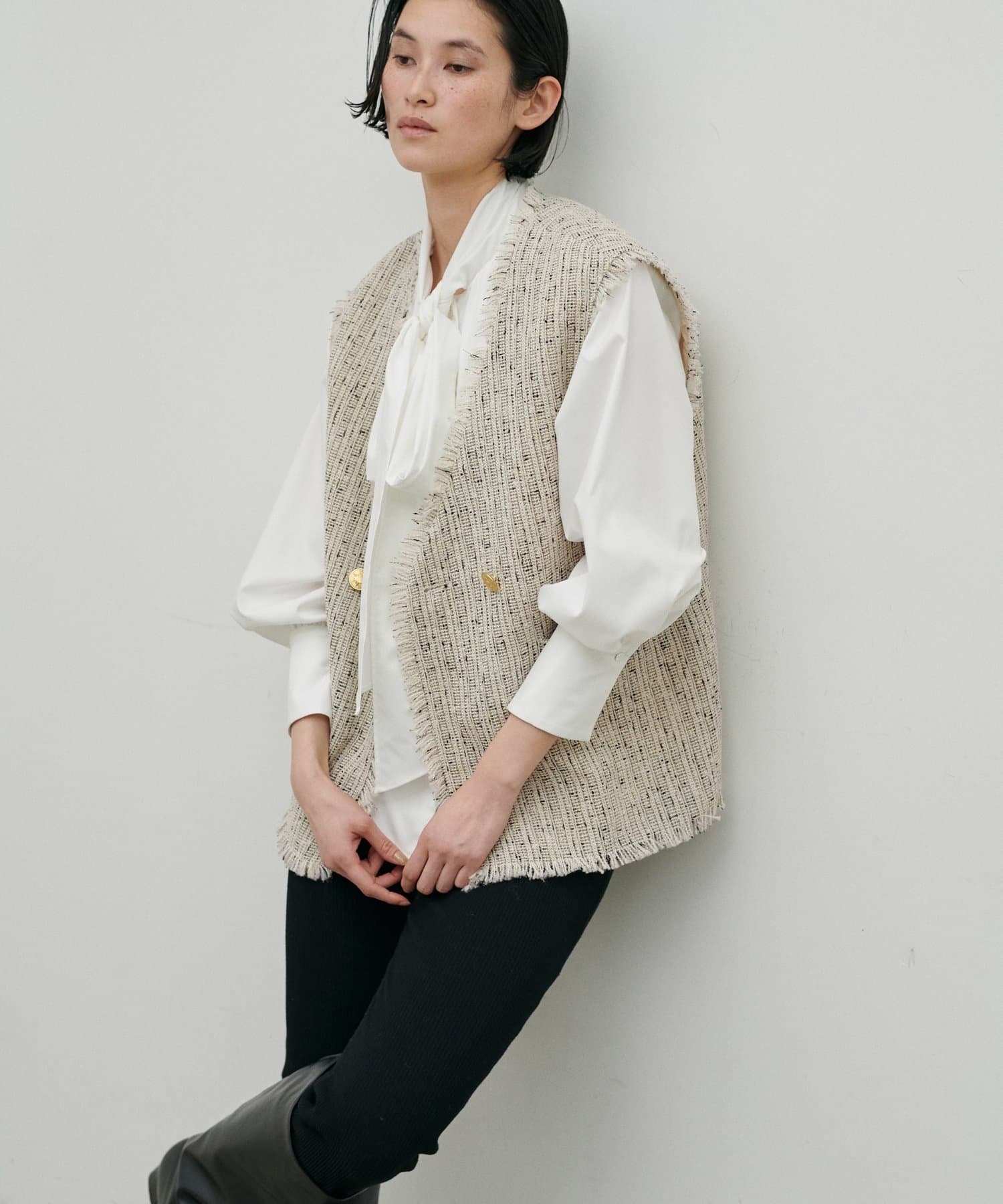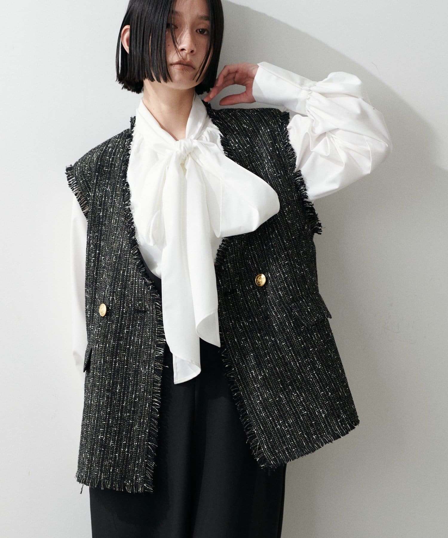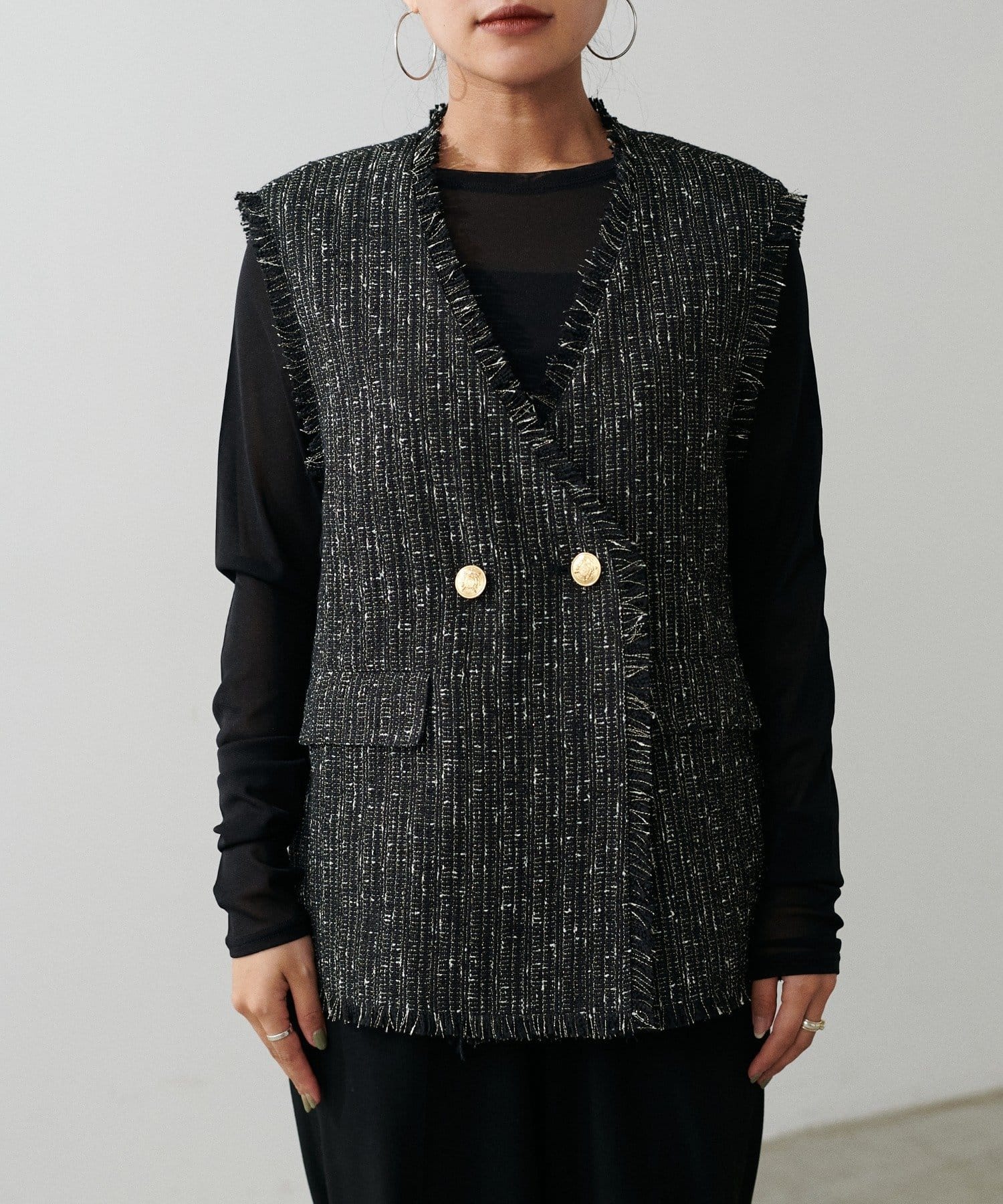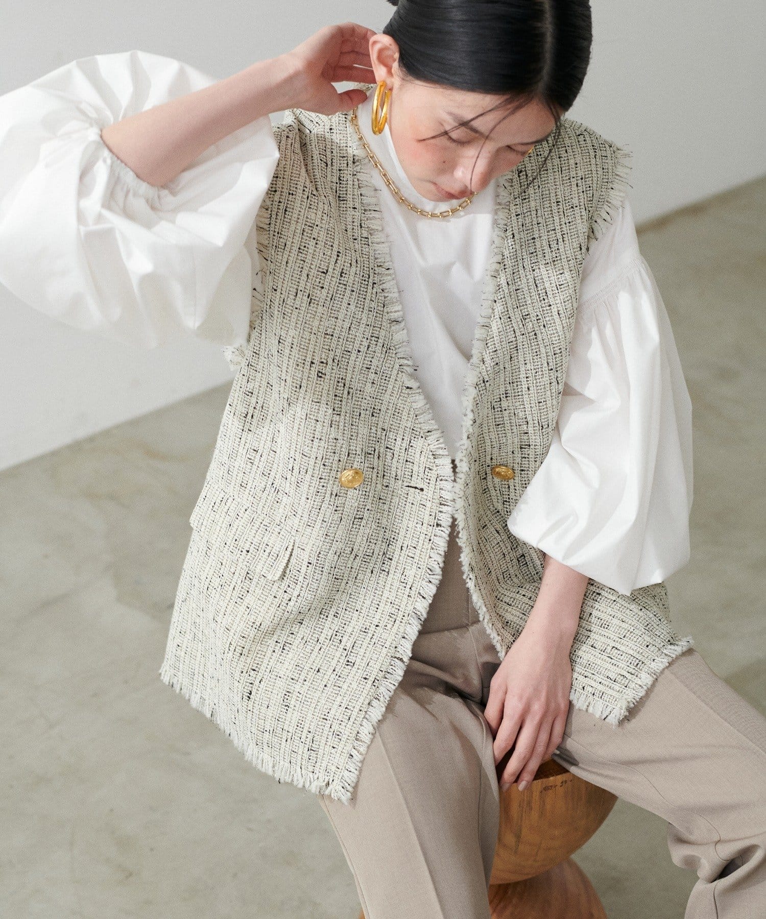 さりげなくラメ糸が織り込まれた高級感のあるツイード素材のベストが登場。