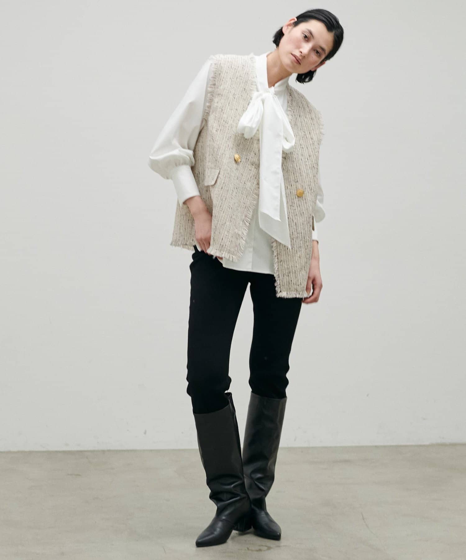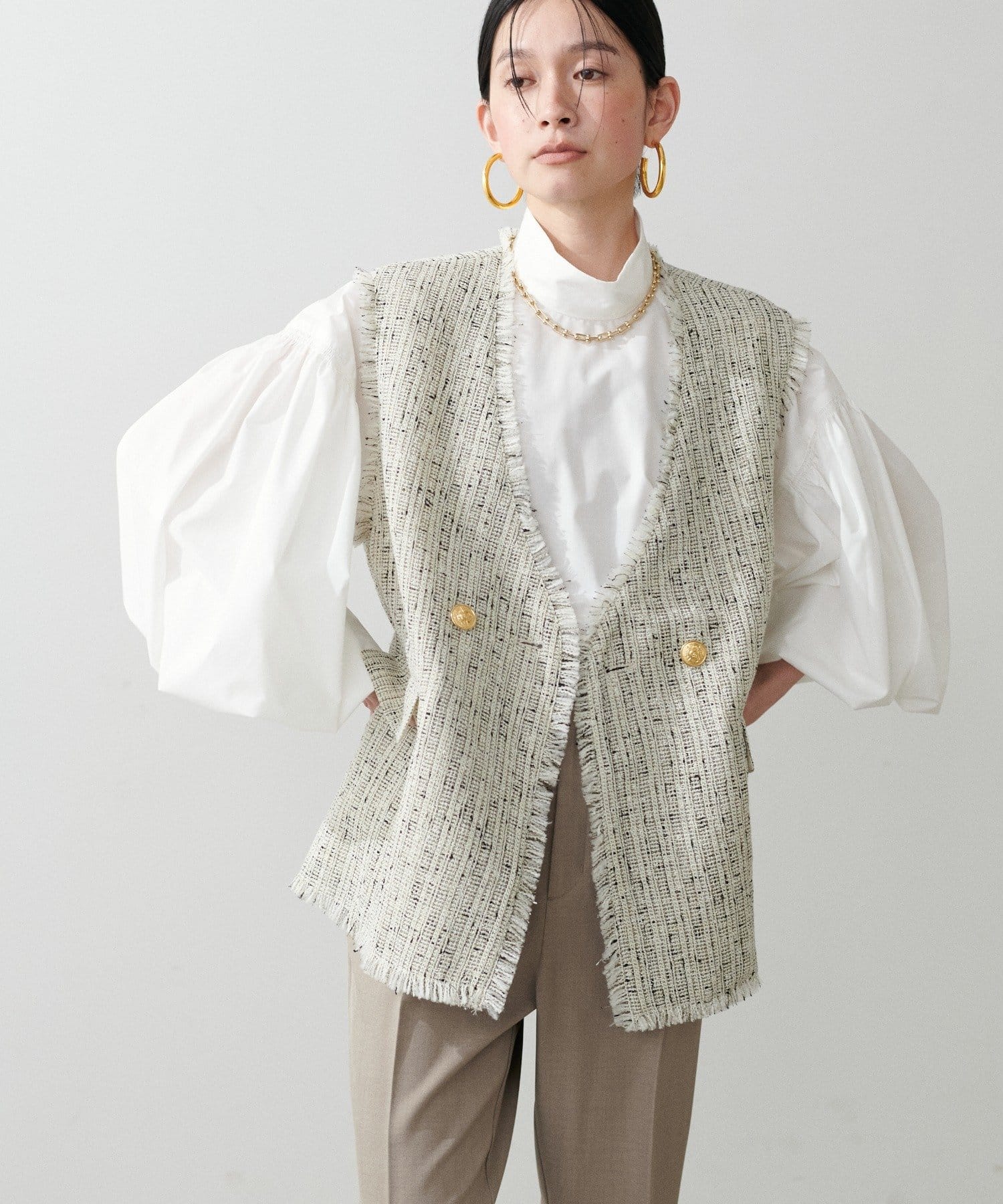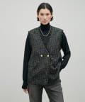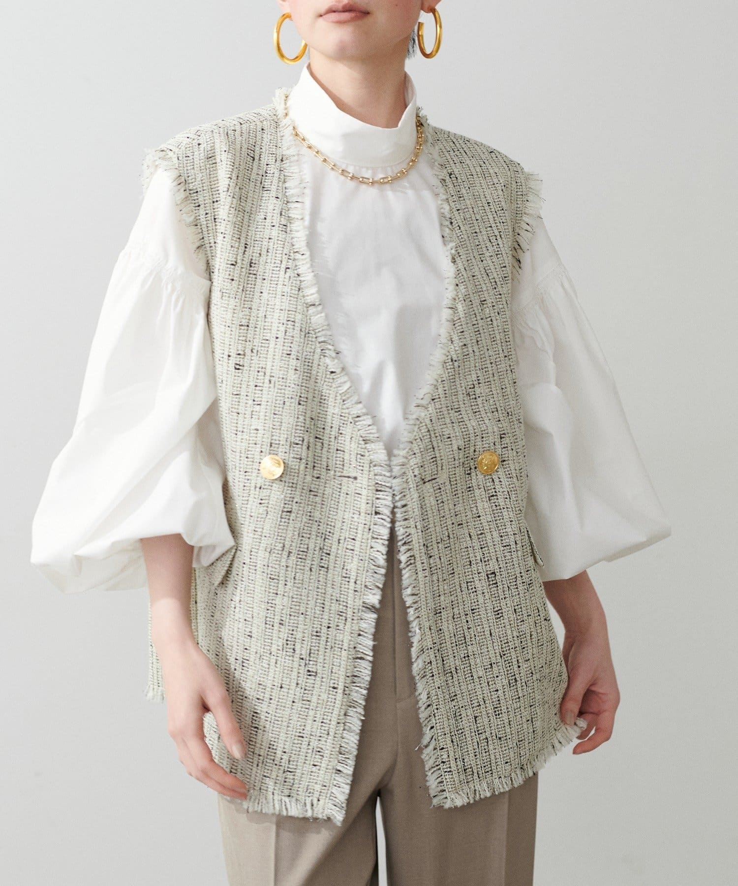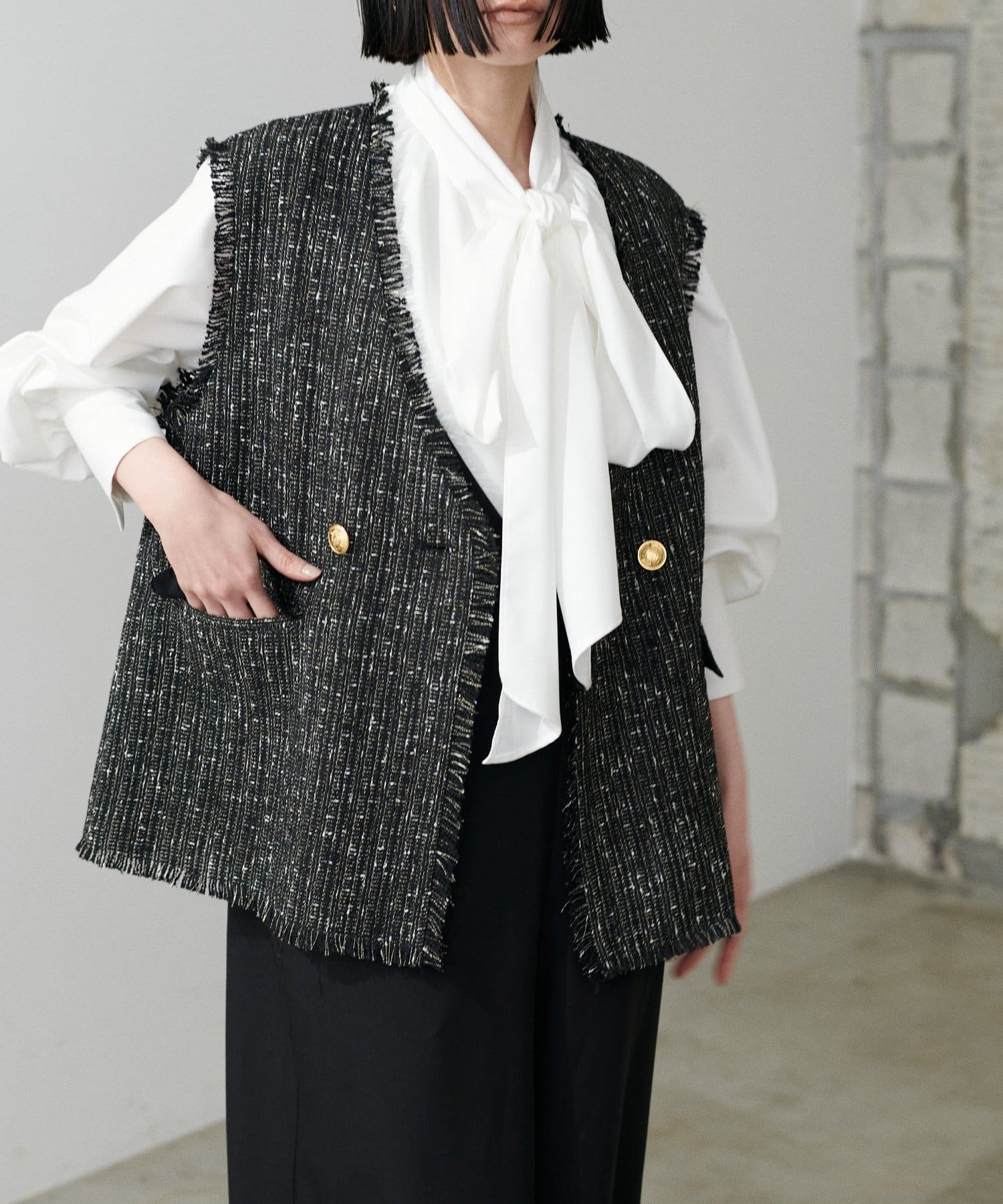 さりげなくラメ糸が織り込まれた高級感のあるツイード素材のベストが登場。