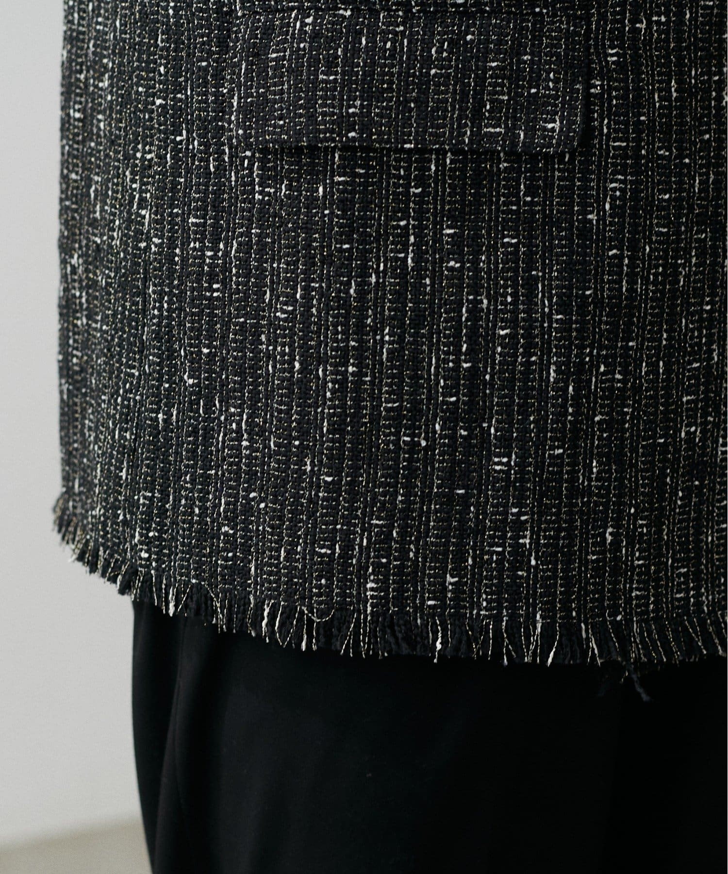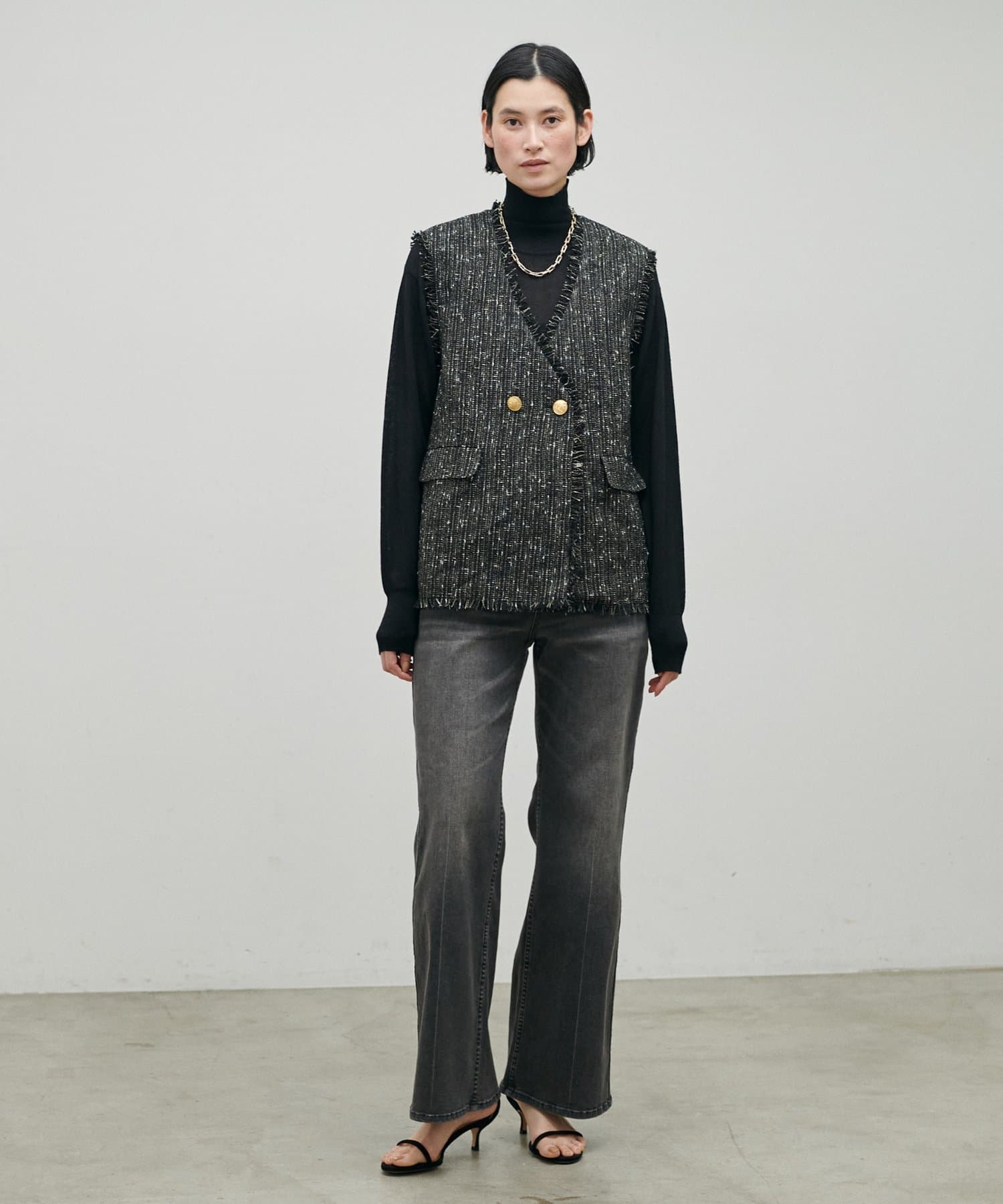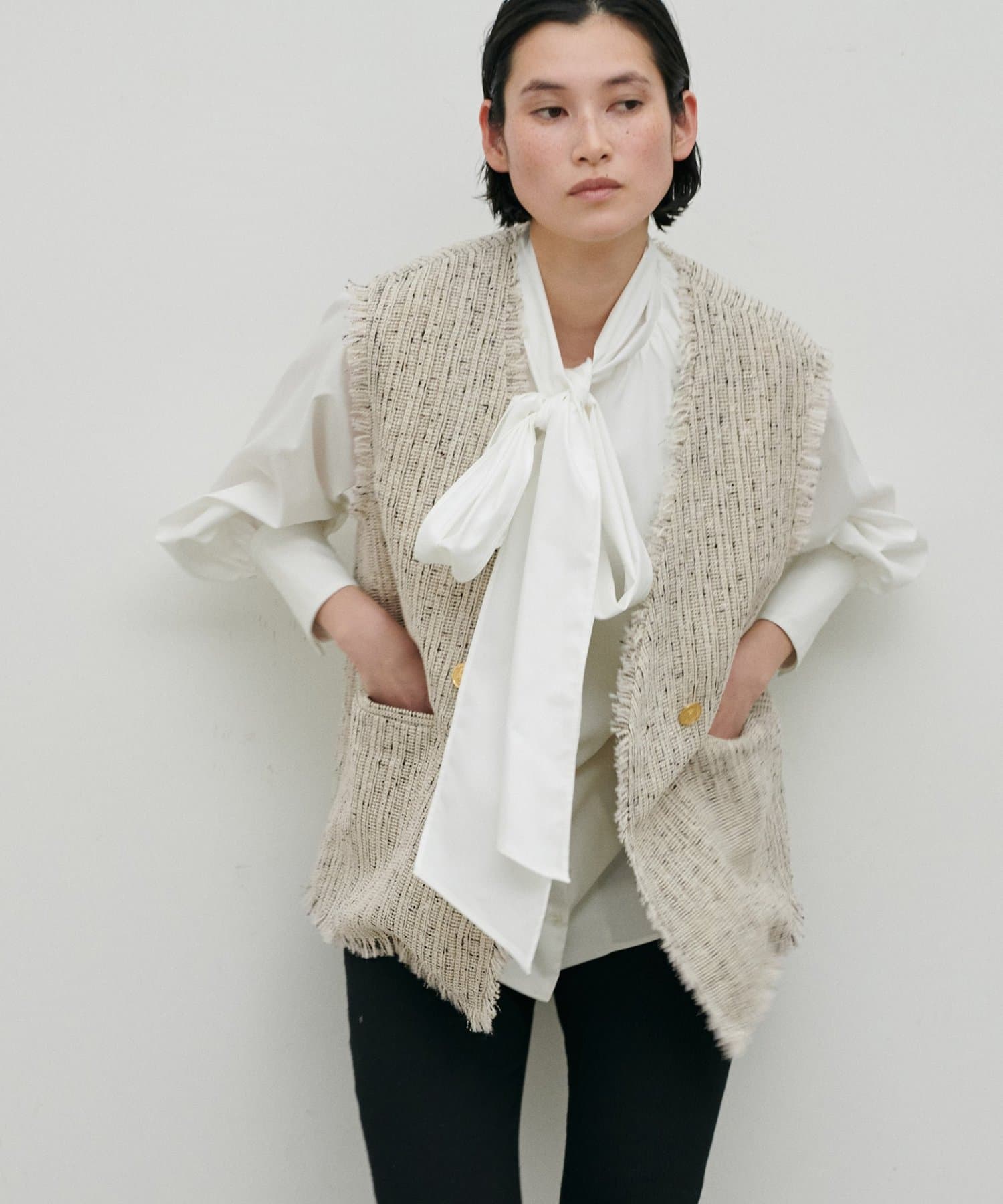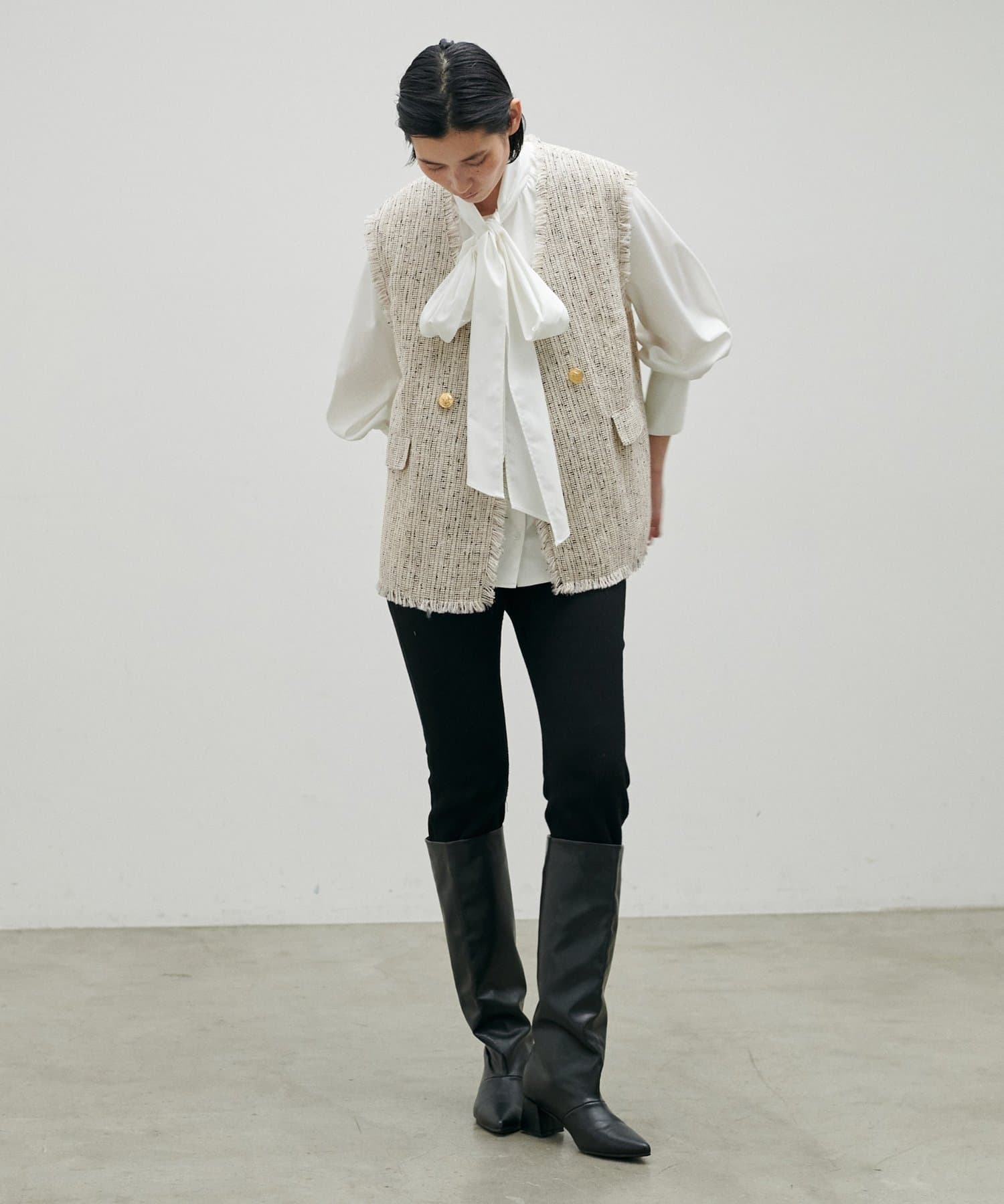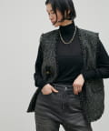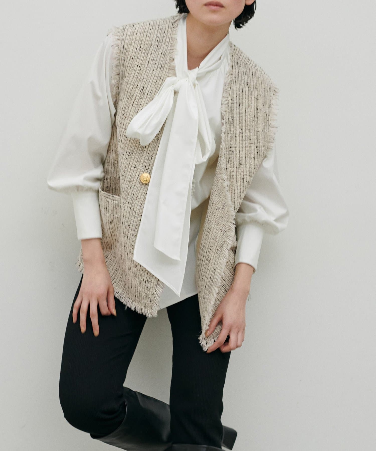 さりげなくラメ糸が織り込まれた高級感のあるツイード素材のベストが登場。