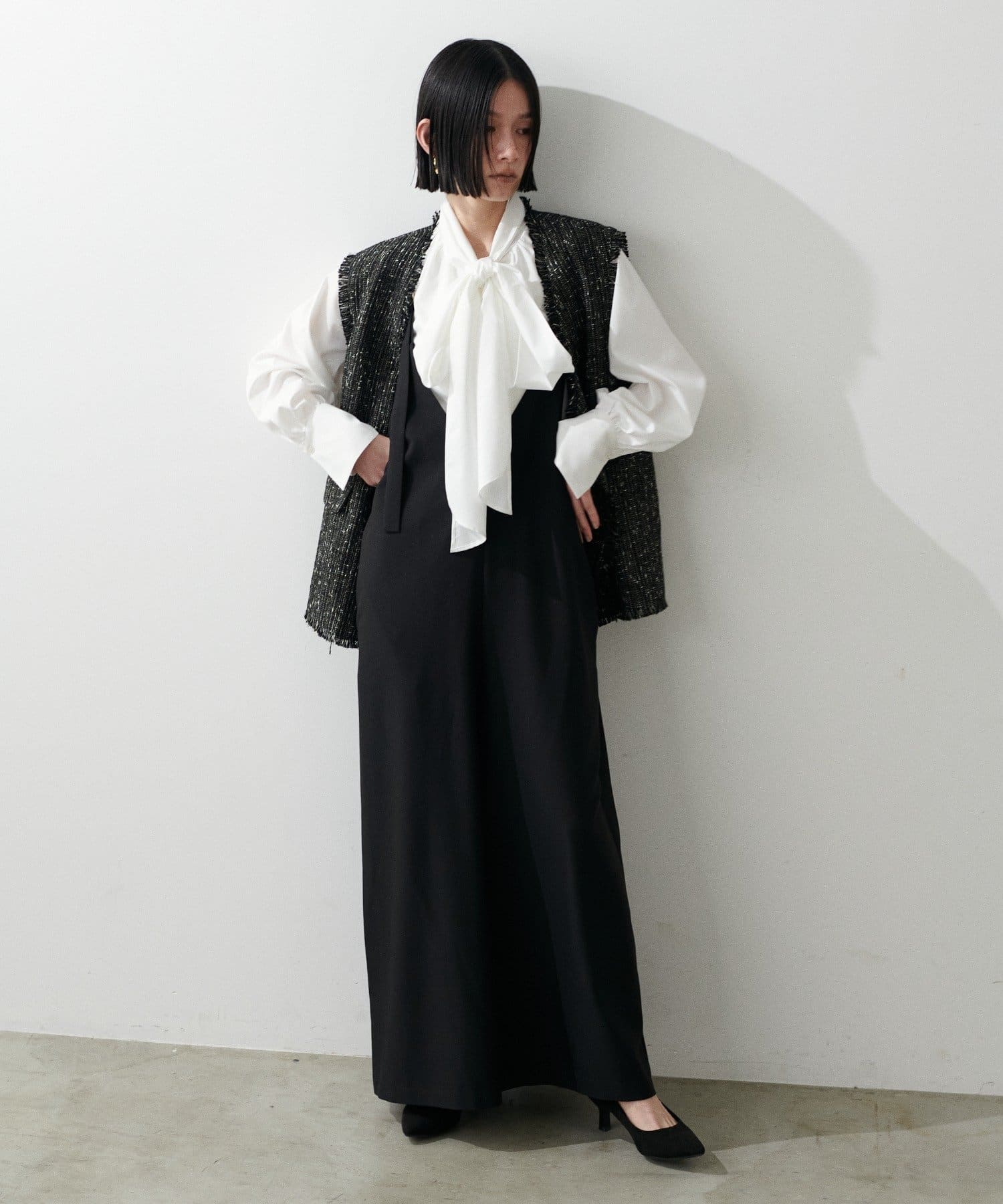 袖や胸元にボリュームのあるデザインのアイテムと合わせるとより華やかに。
