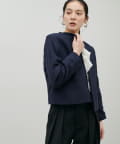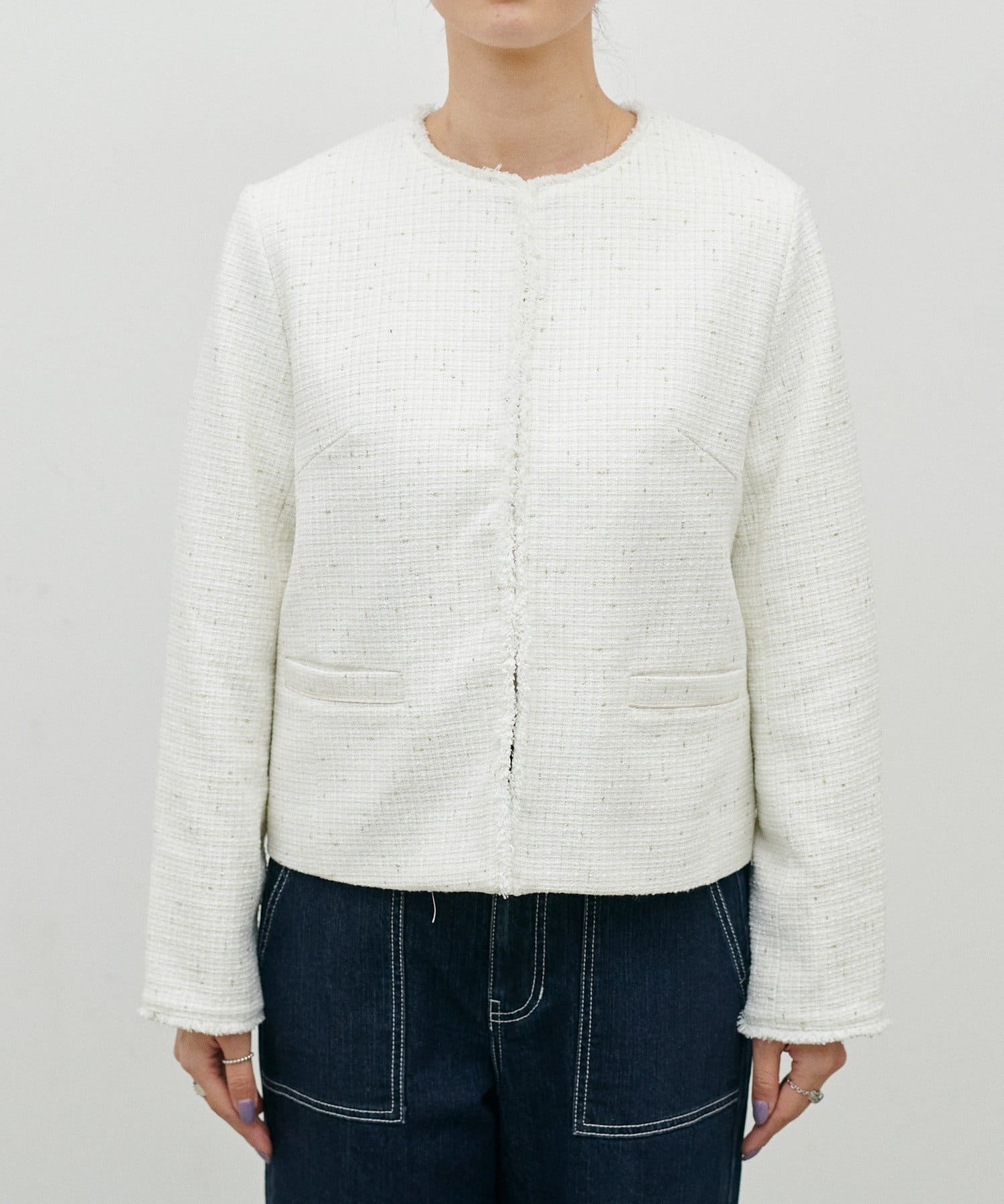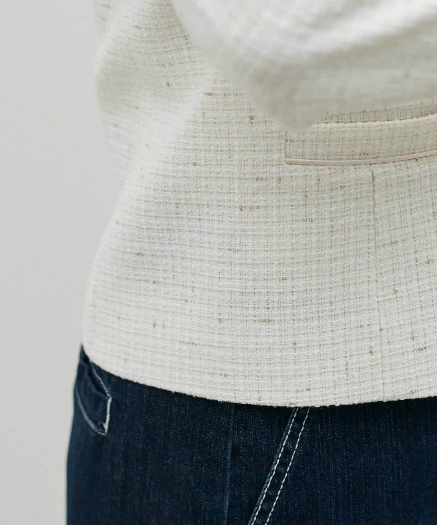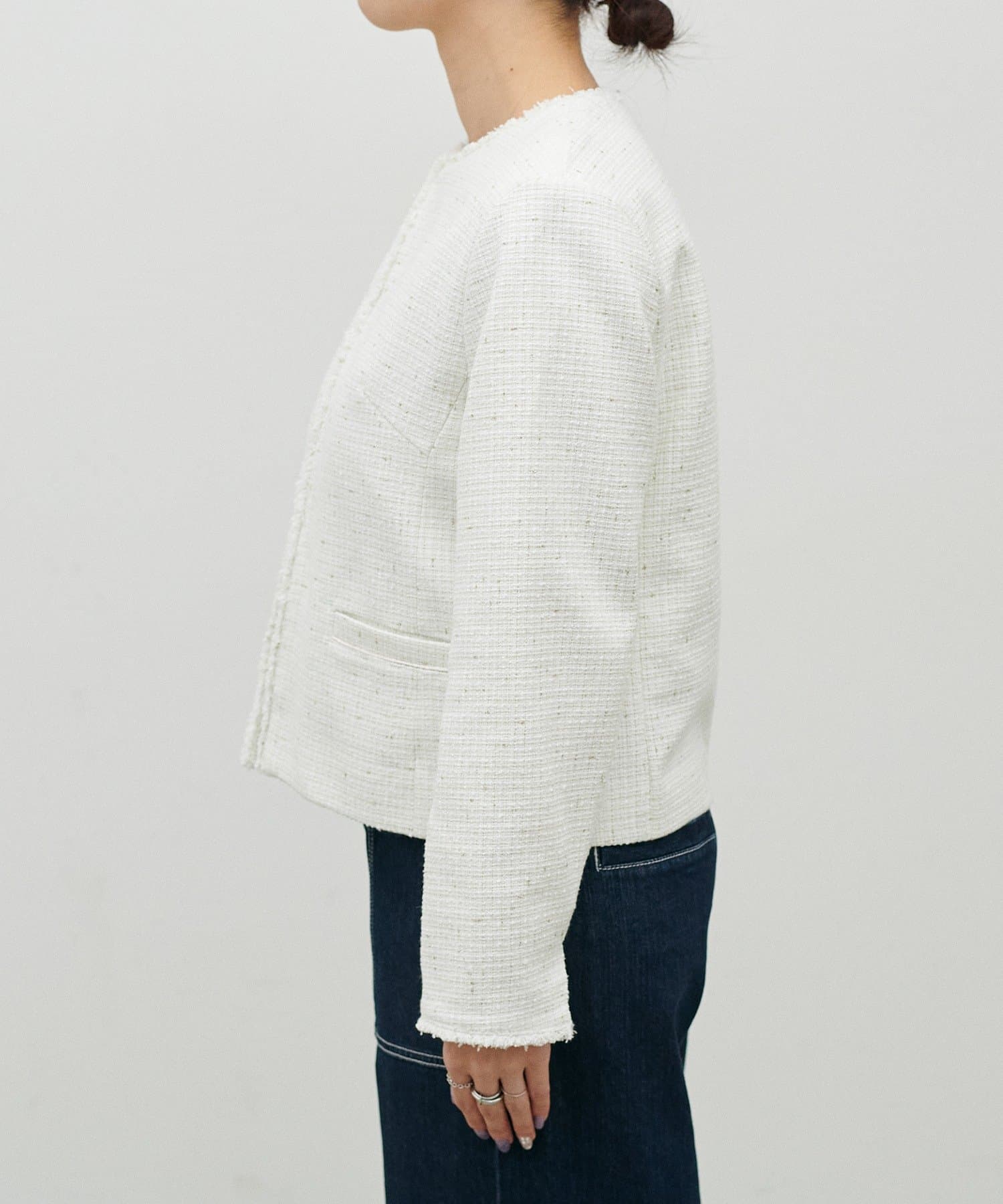 MIXのツイードがアクセントのノーカラージャケット。