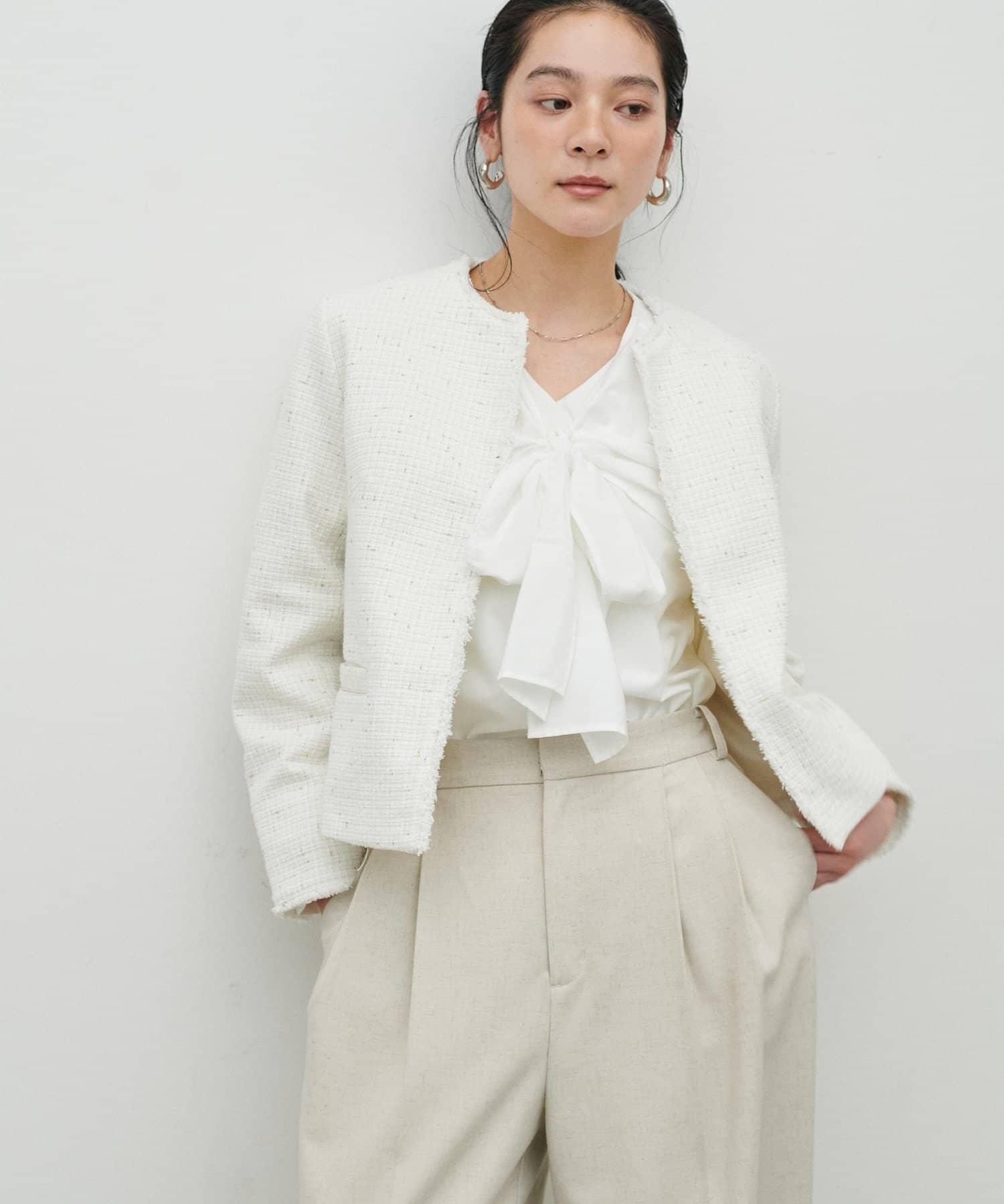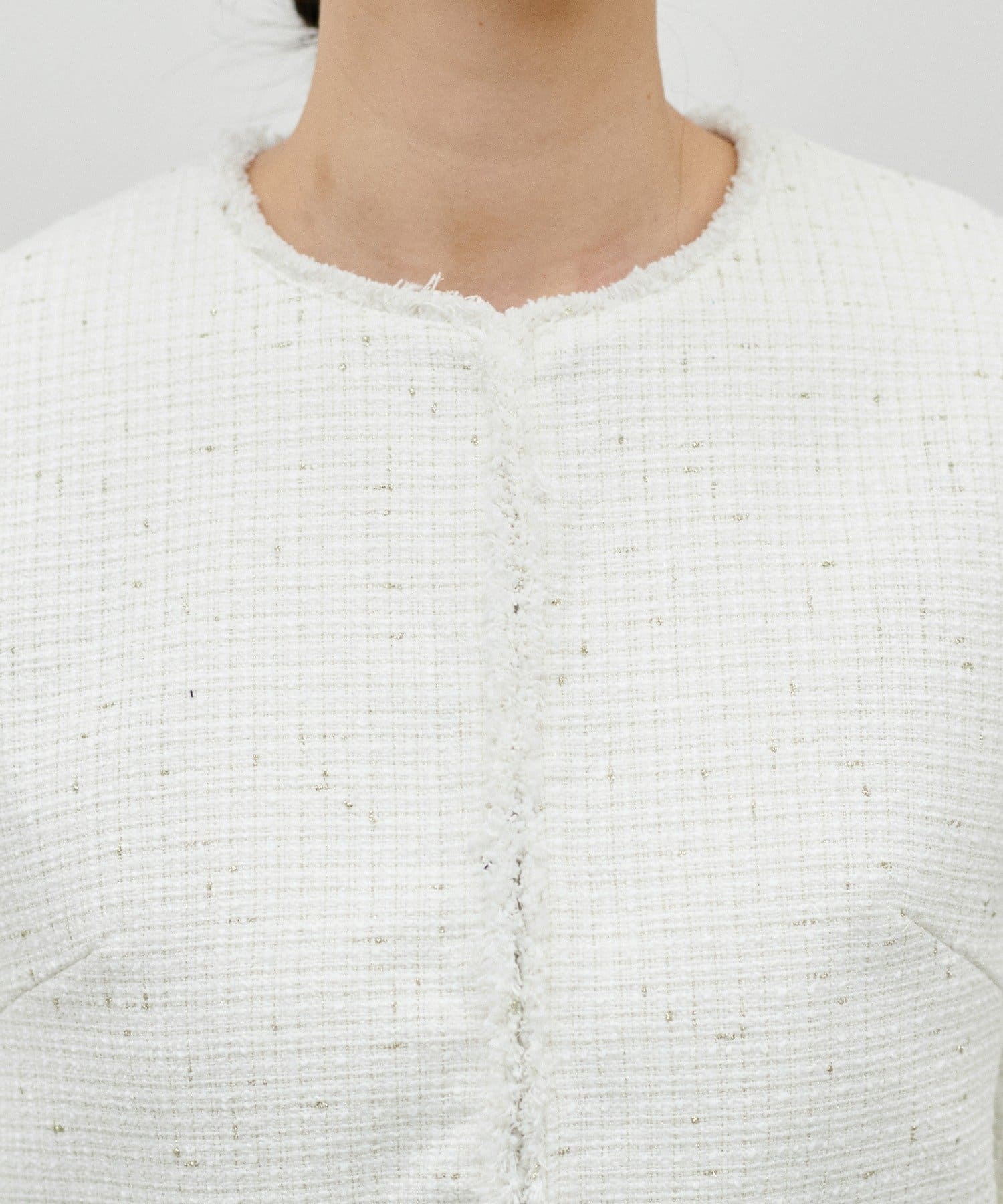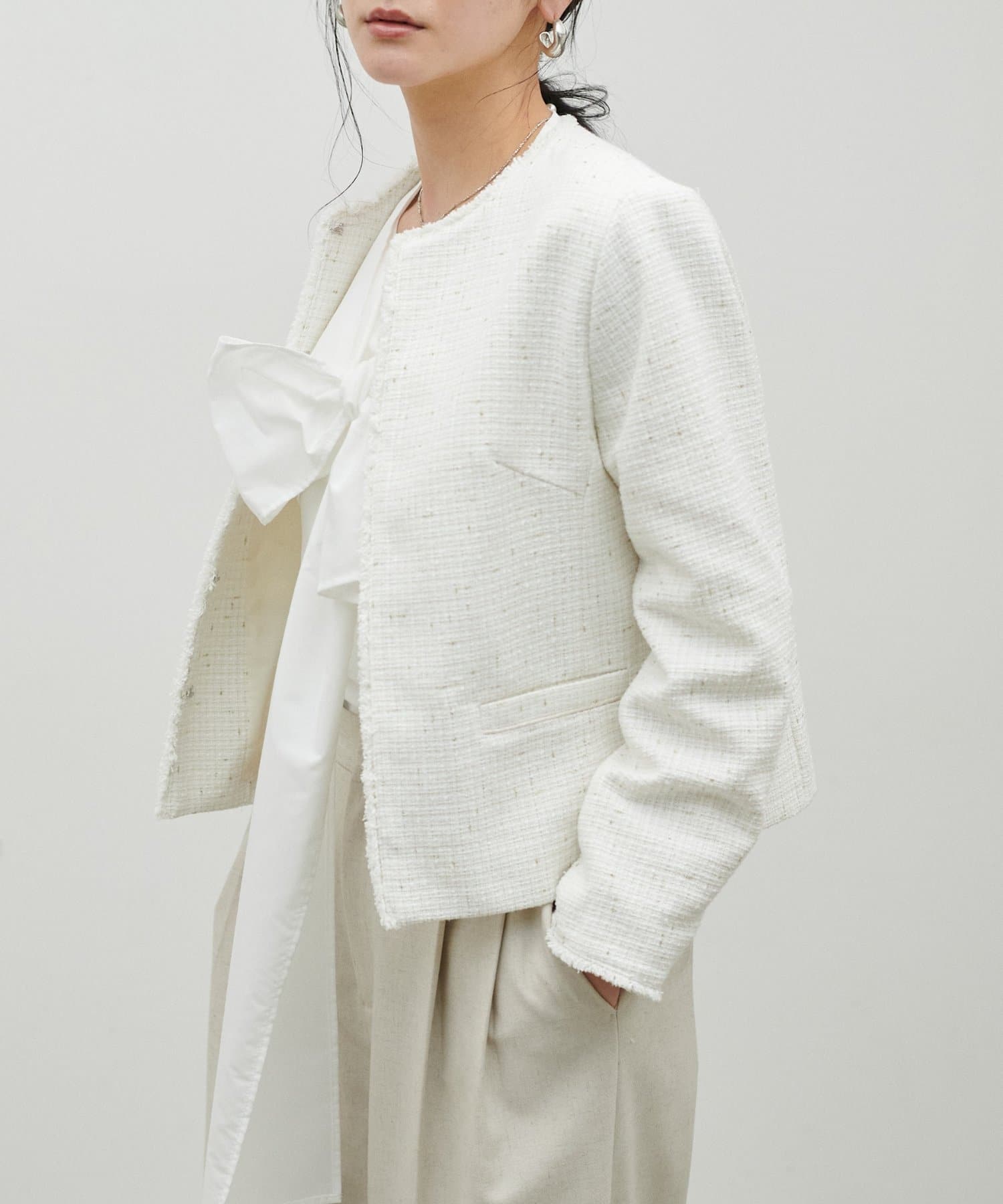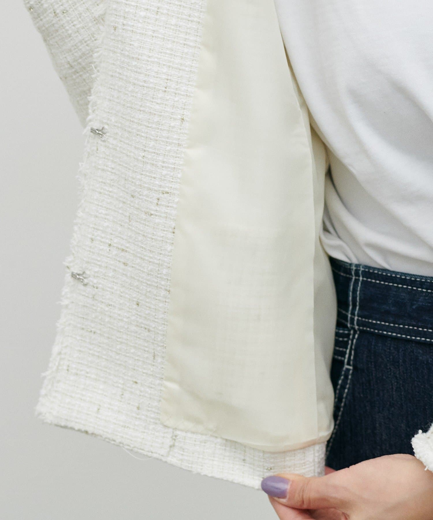 MIXのツイードがアクセントのノーカラージャケット。