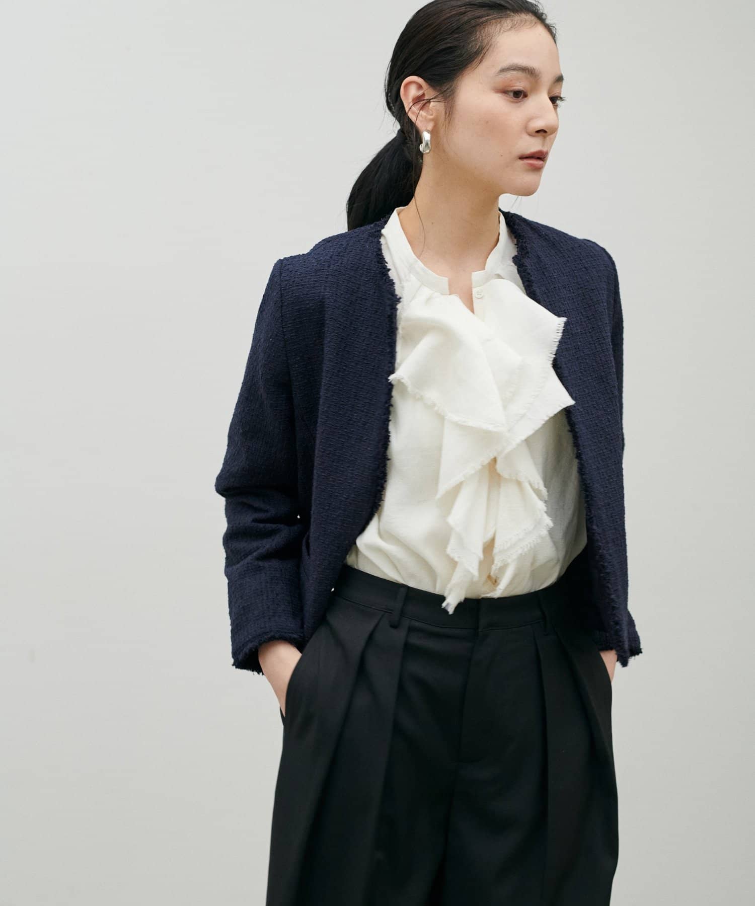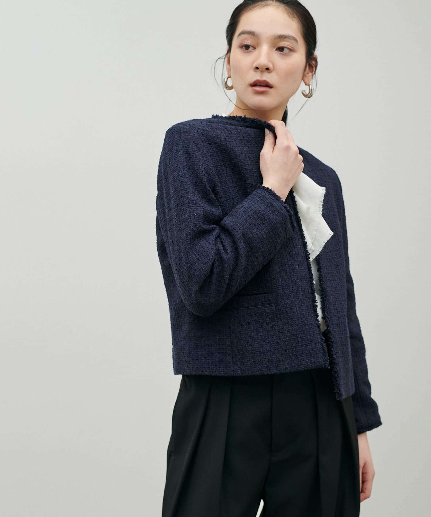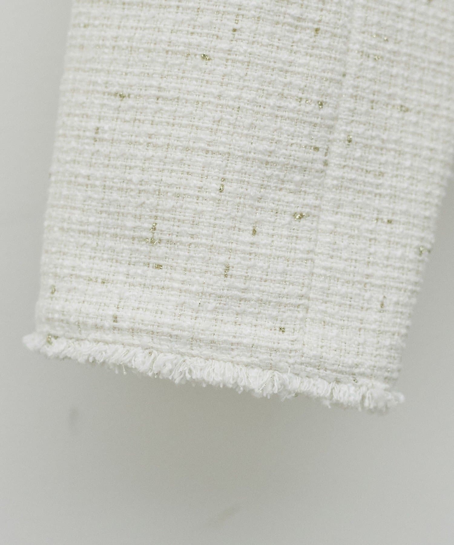 裾のフリンジとやや細めの糸をMIXしたツイードで肩肘を張りすぎない、