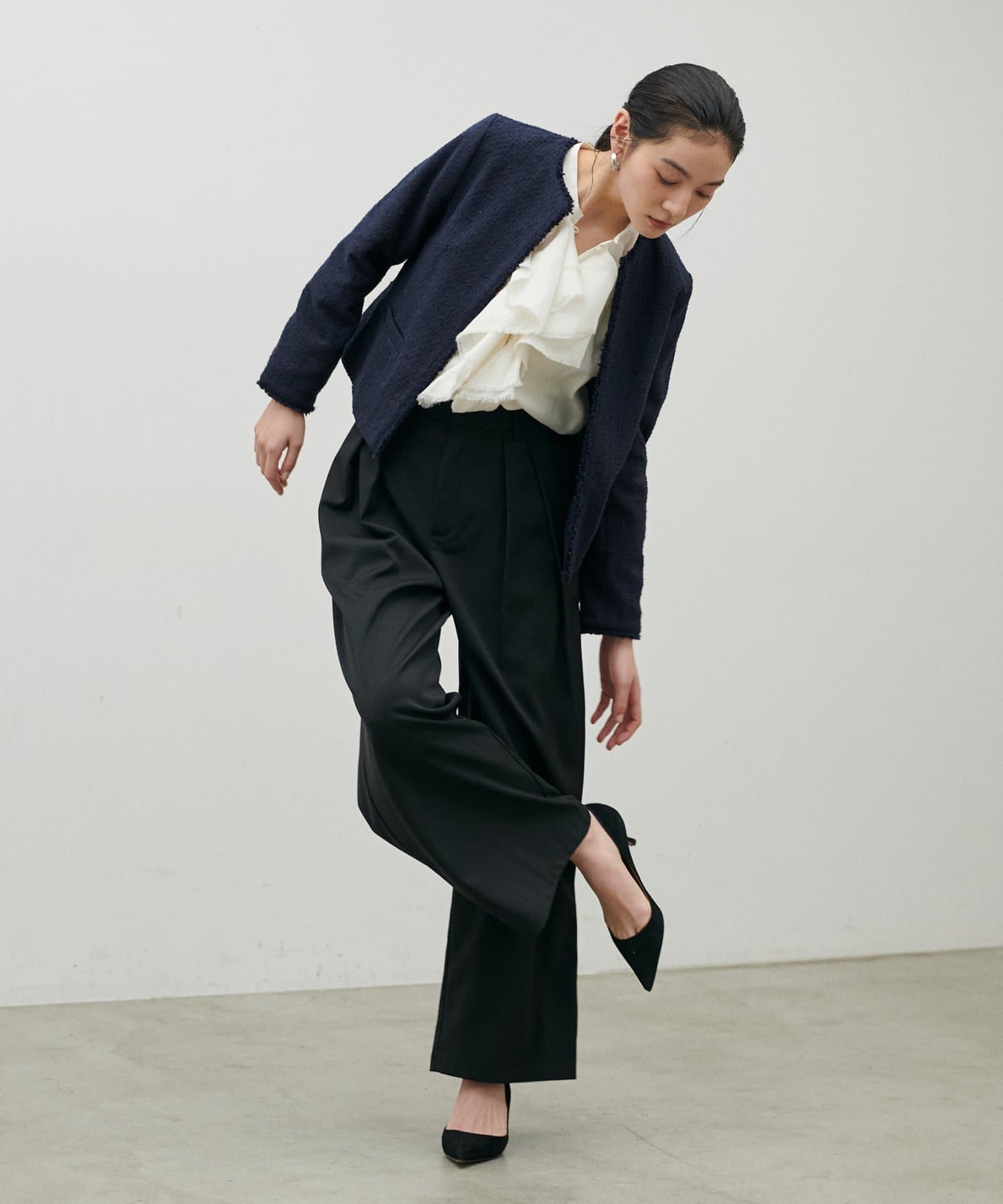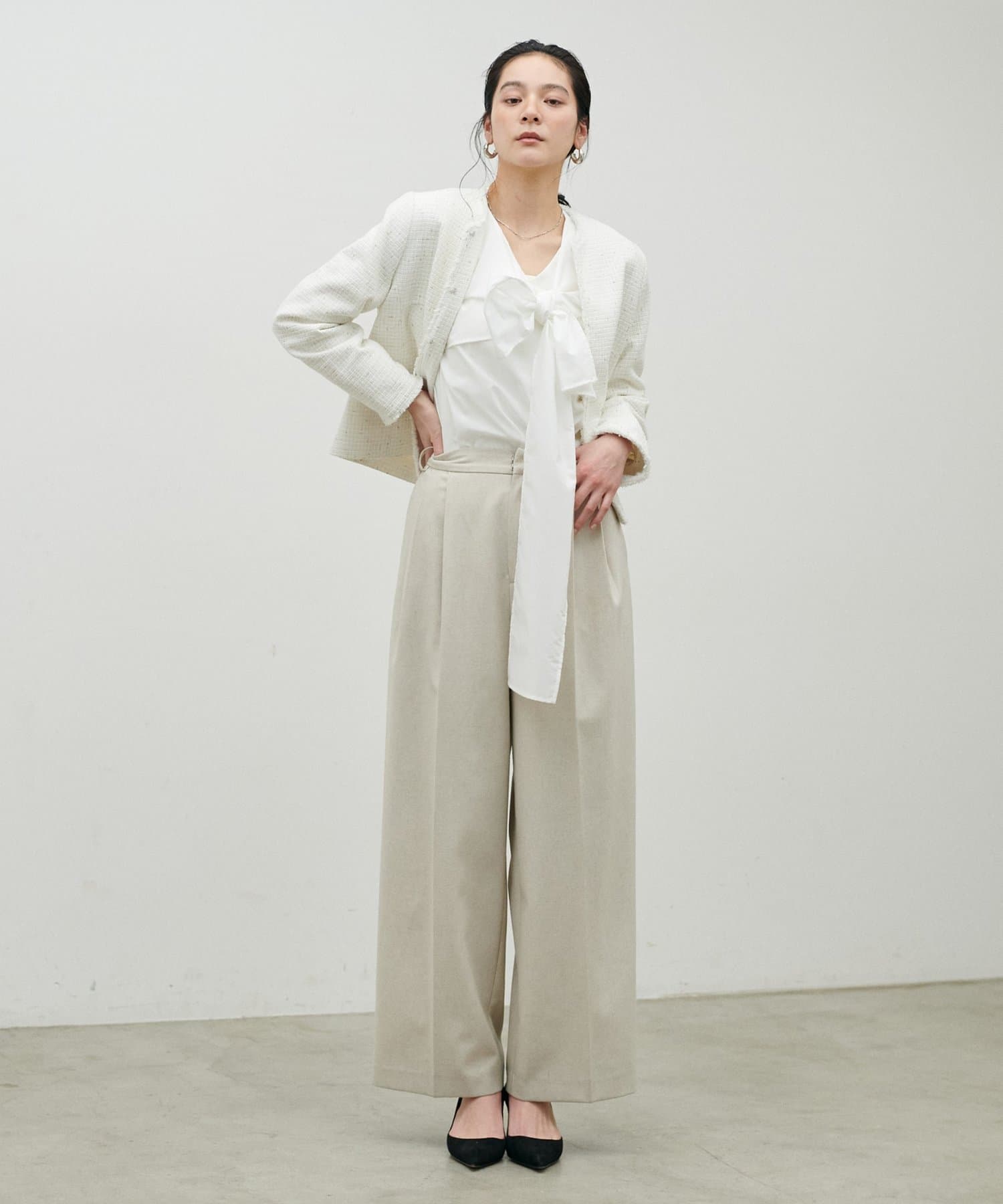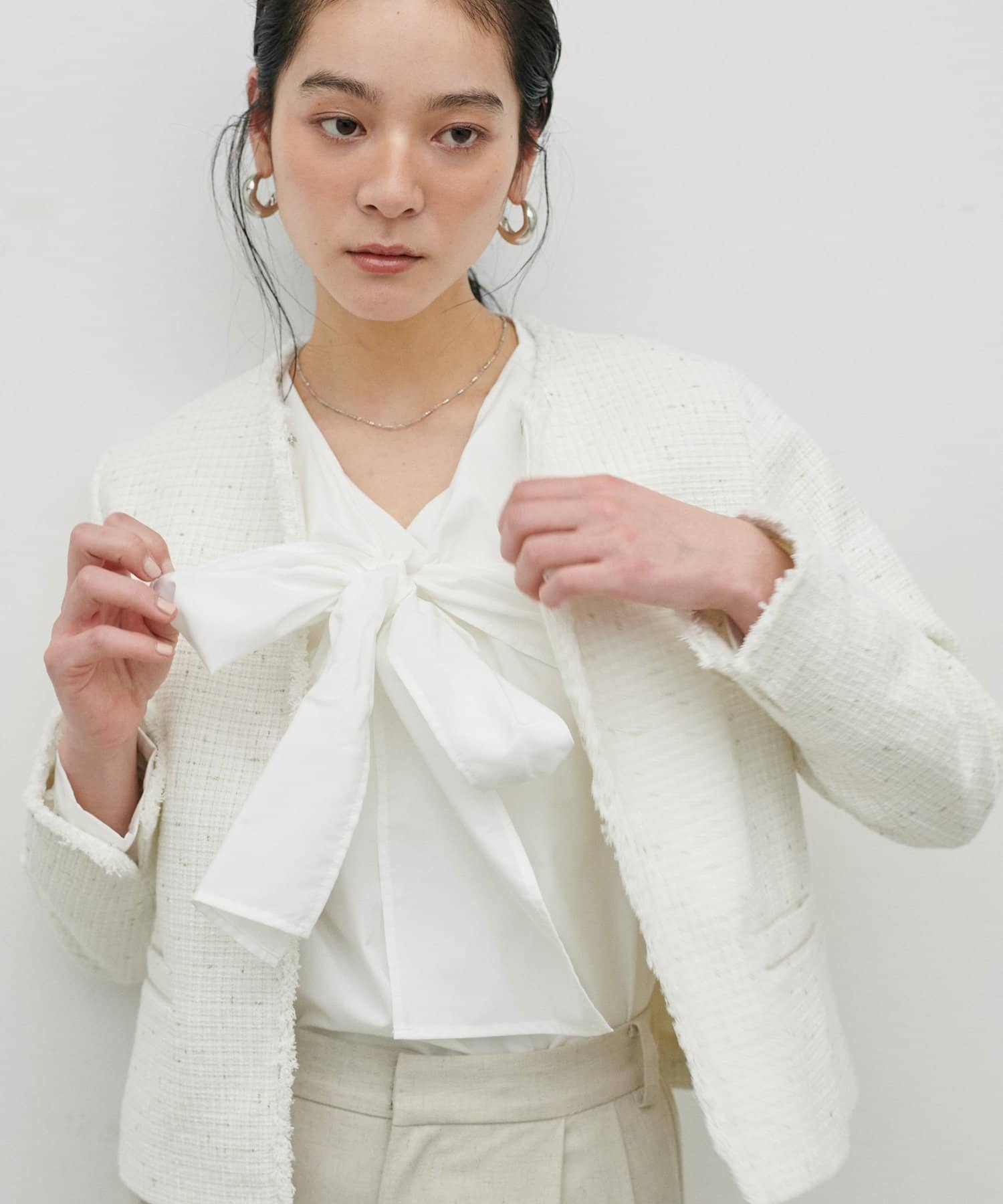 ノーカラーデザインなのでボリュームのあるブラウスとの相性が◎。