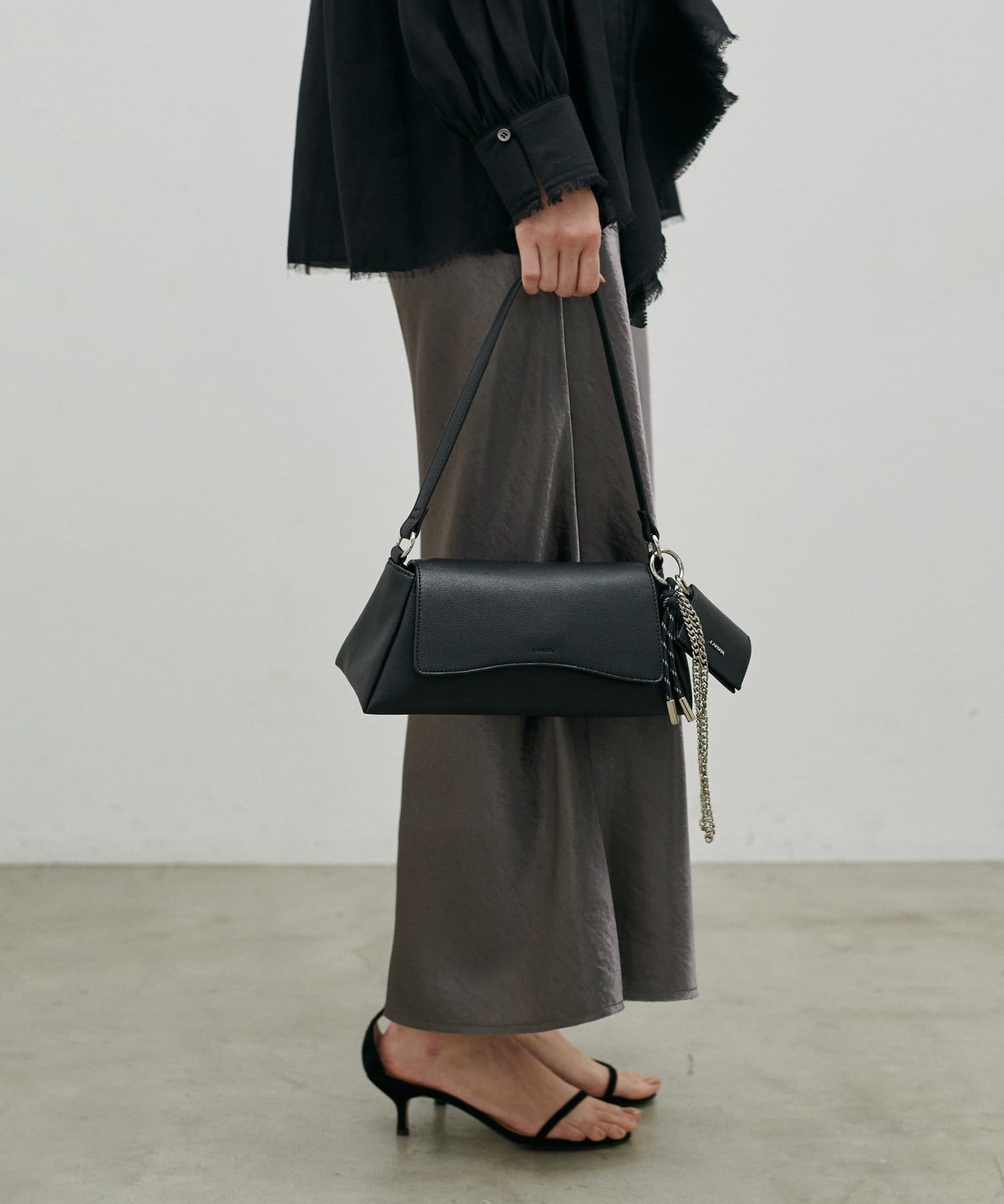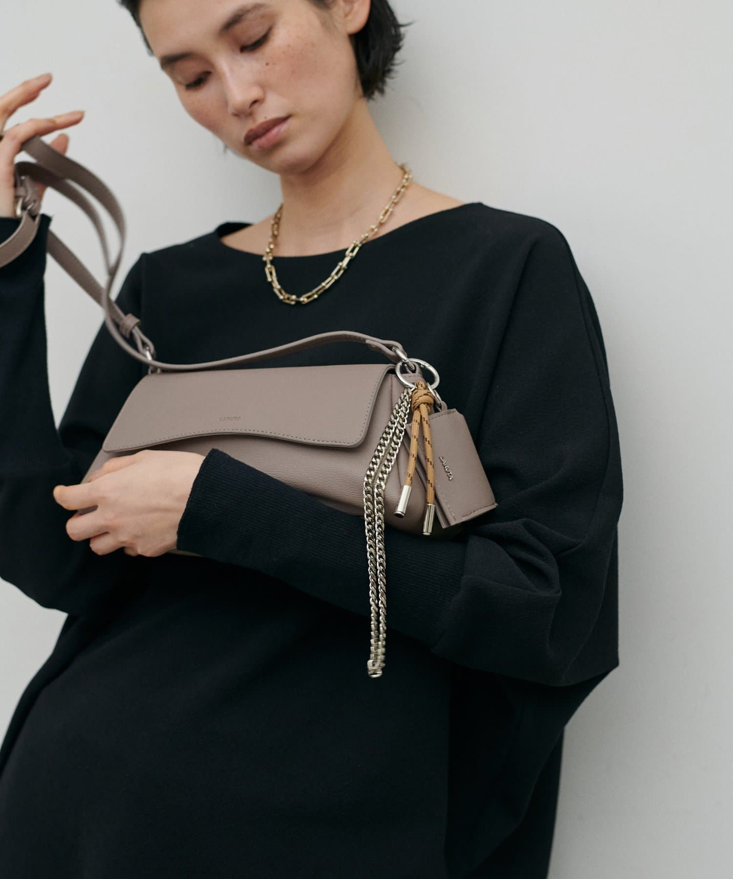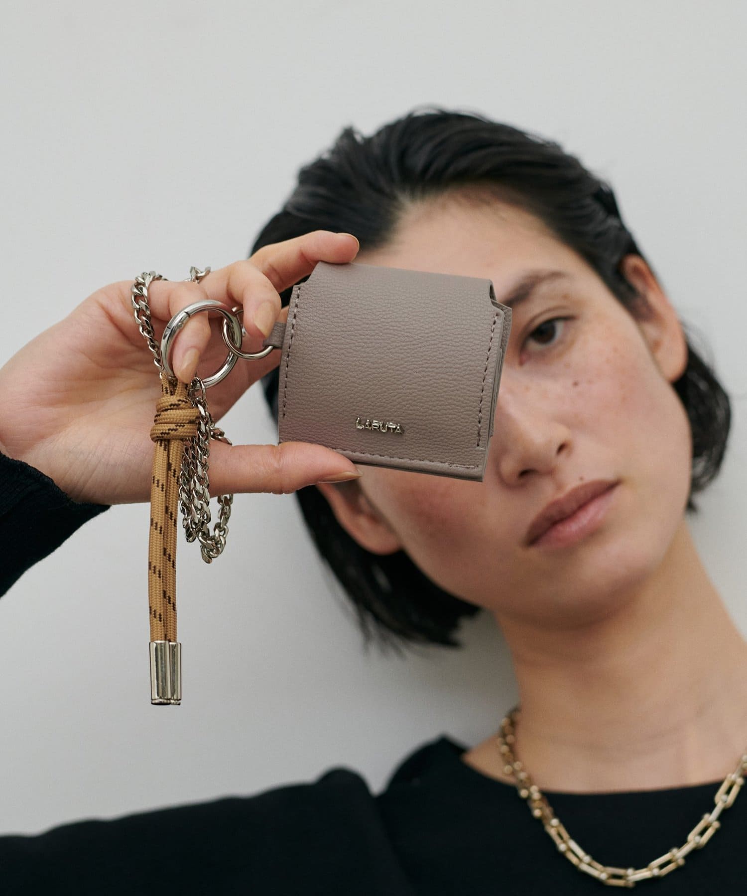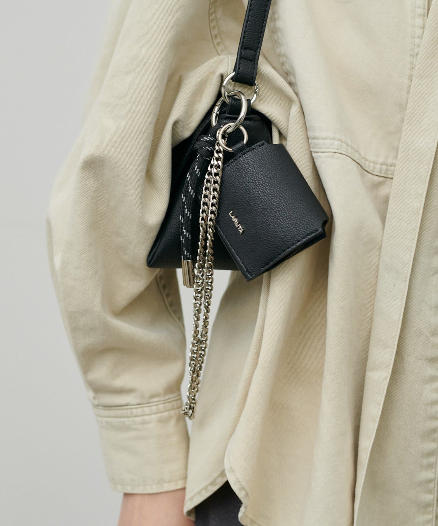 立体的なLARUTAのエンボスデザインや、トレンドのチャームもついているのがポイント。