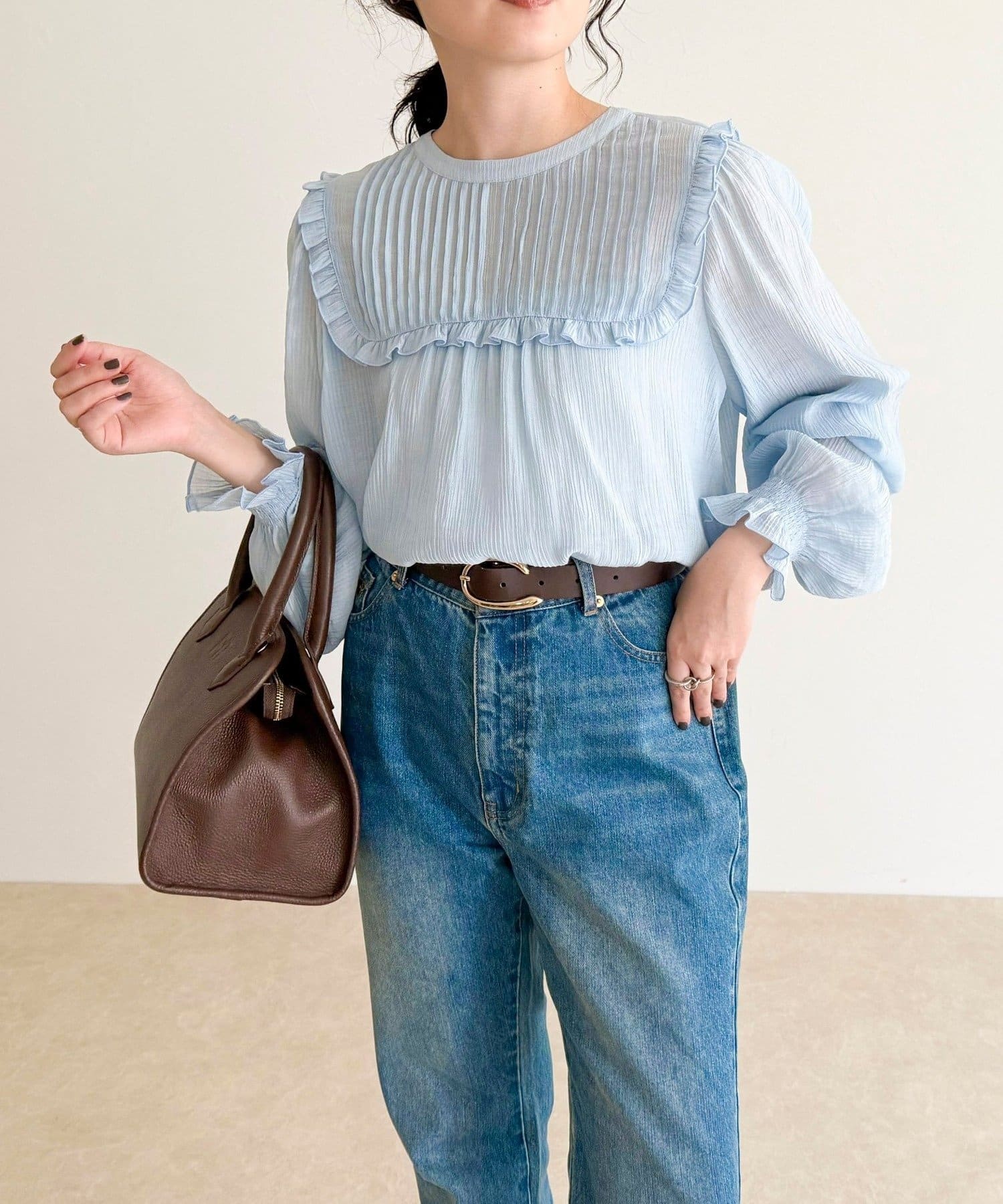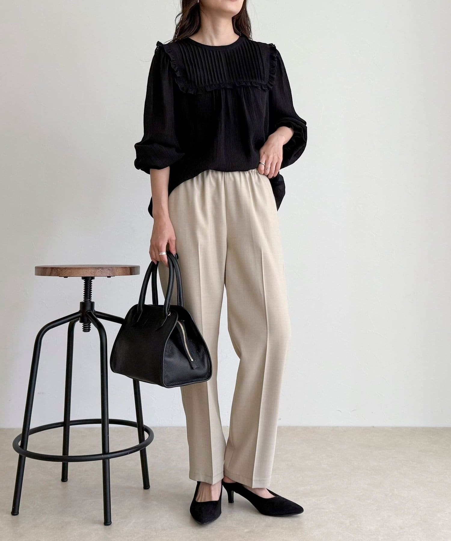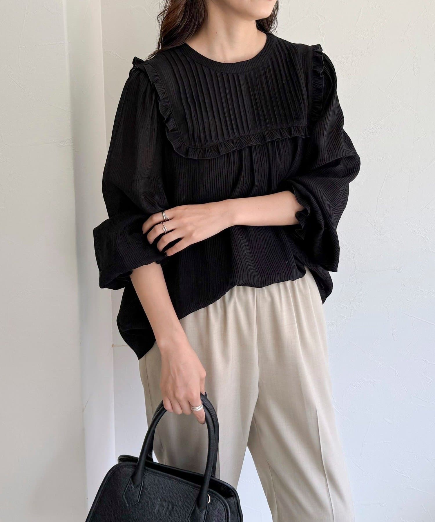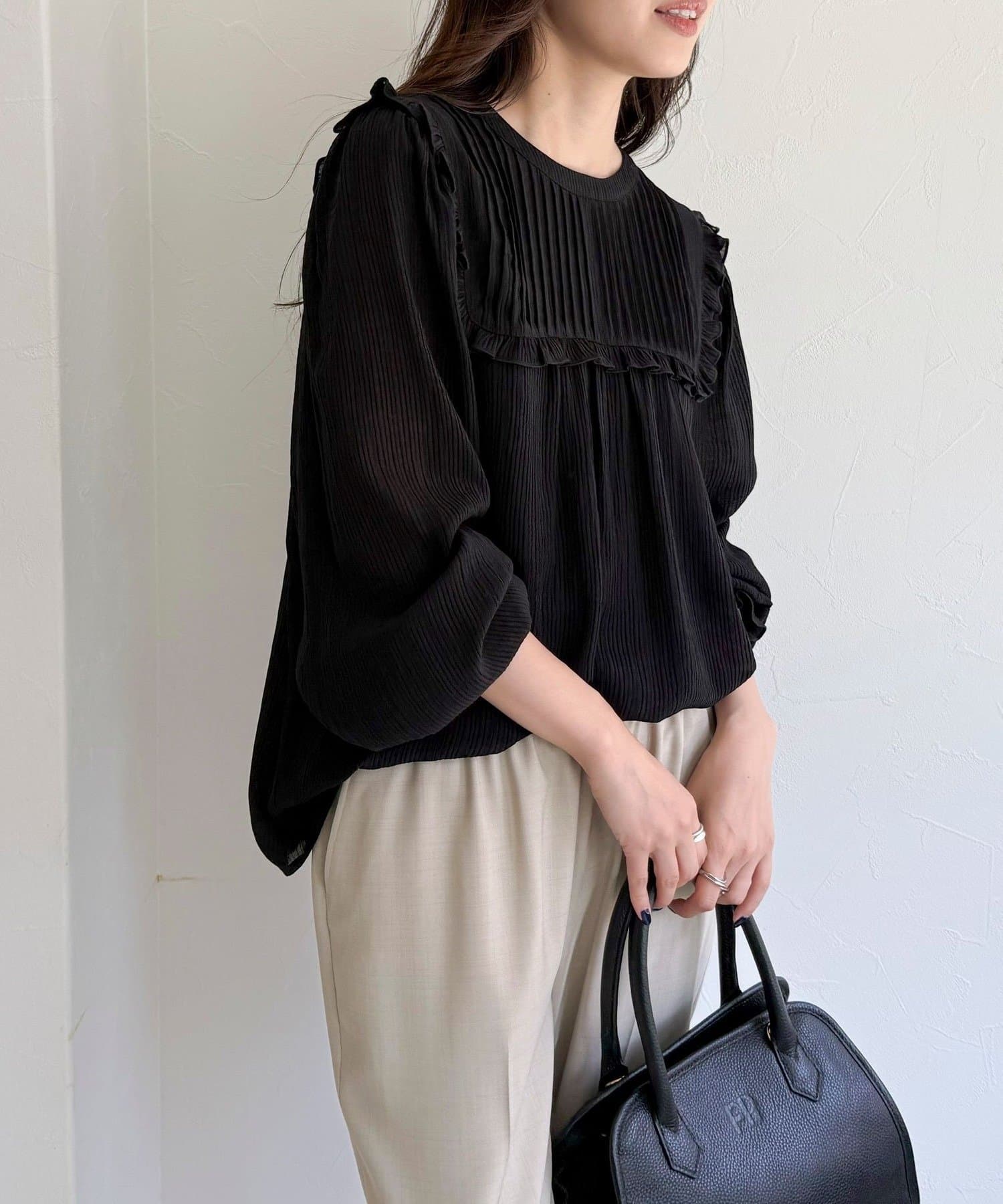 ・胸元のピンタックとたっぷりのギャザーが女性らしい柔らかなシルエットを演出