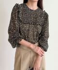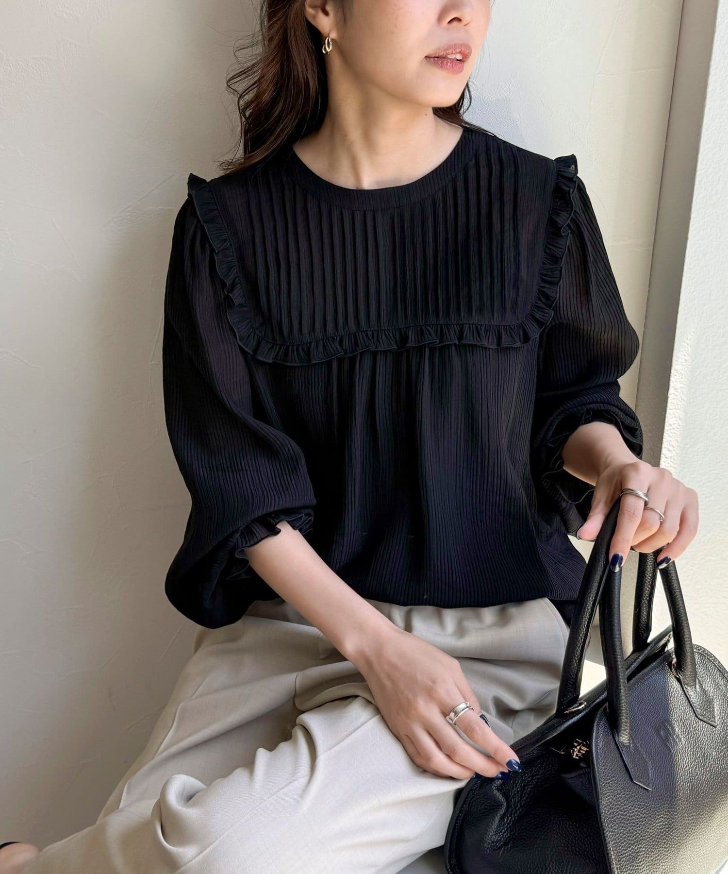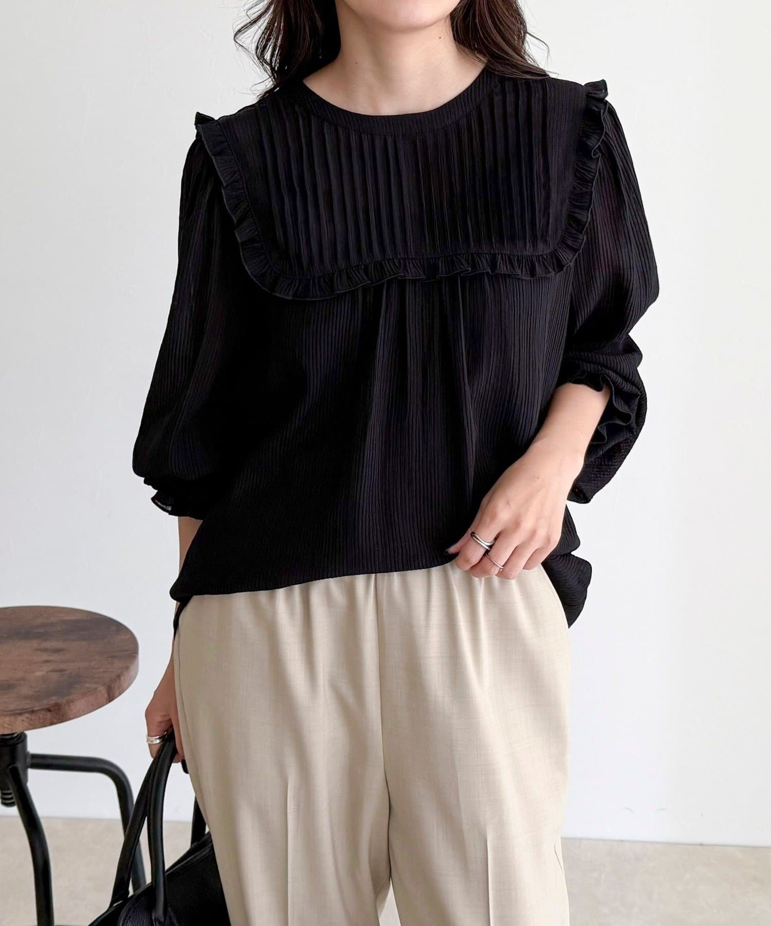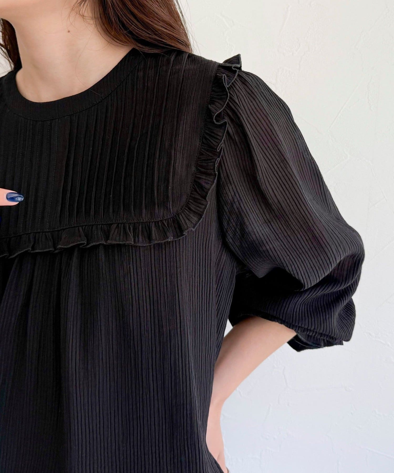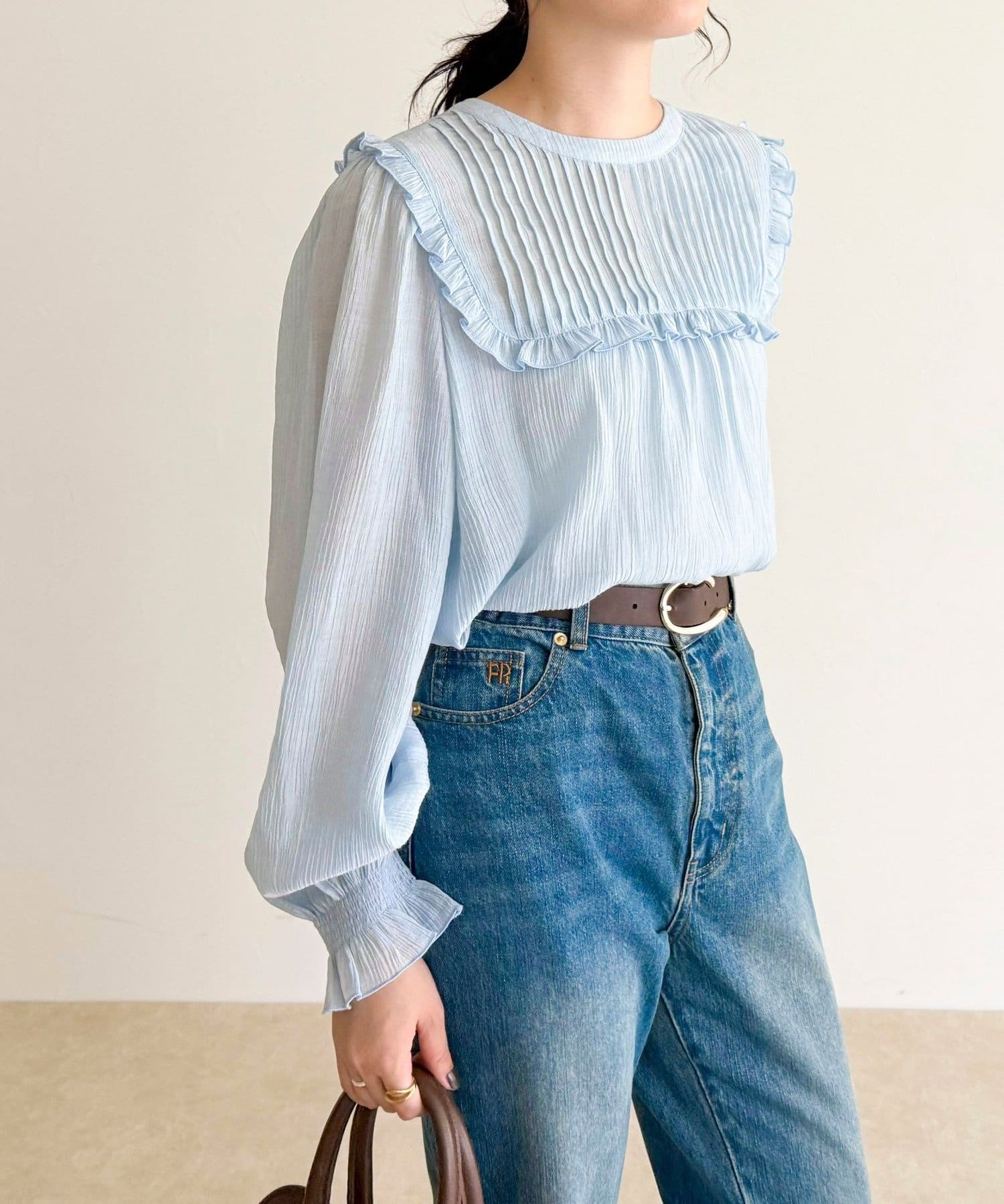 ・胸元のピンタックとたっぷりのギャザーが女性らしい柔らかなシルエットを演出