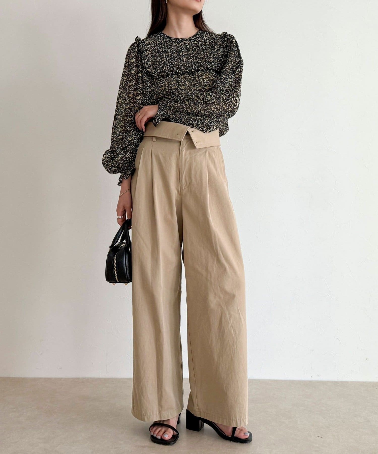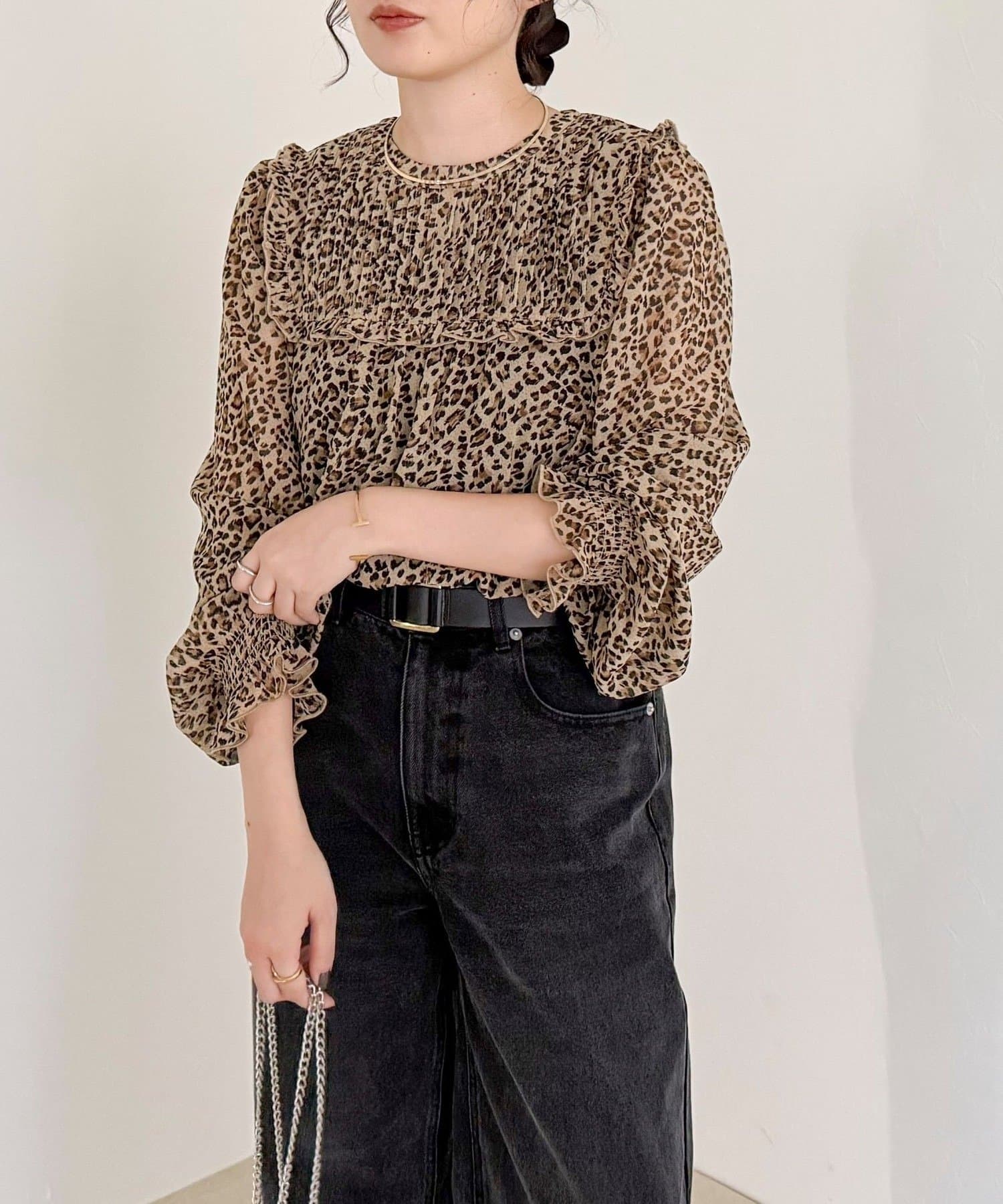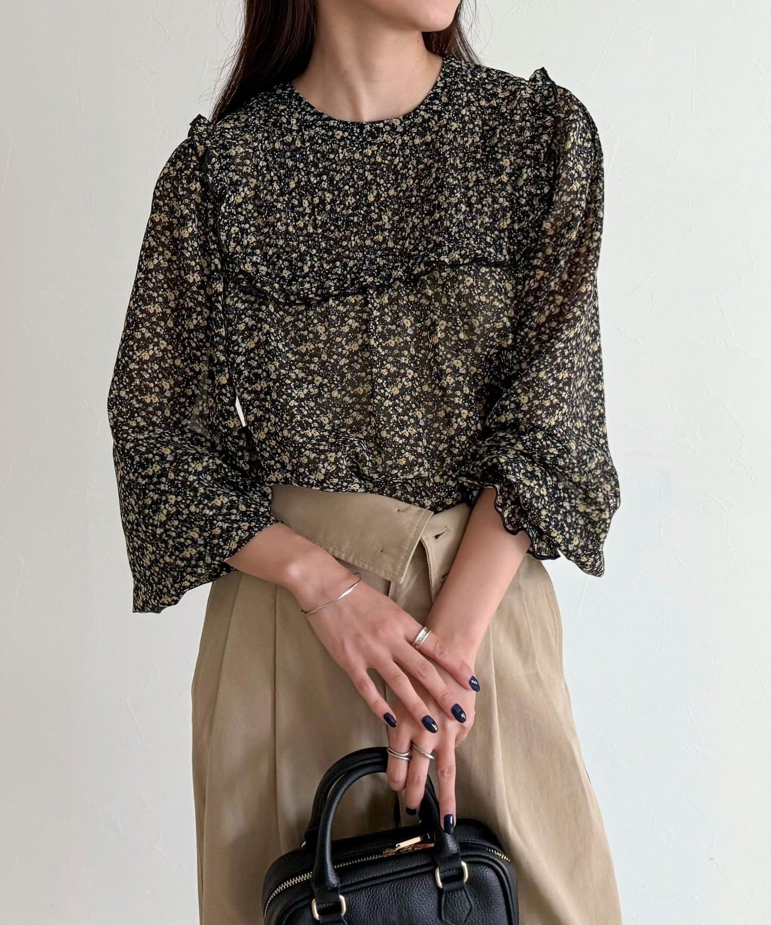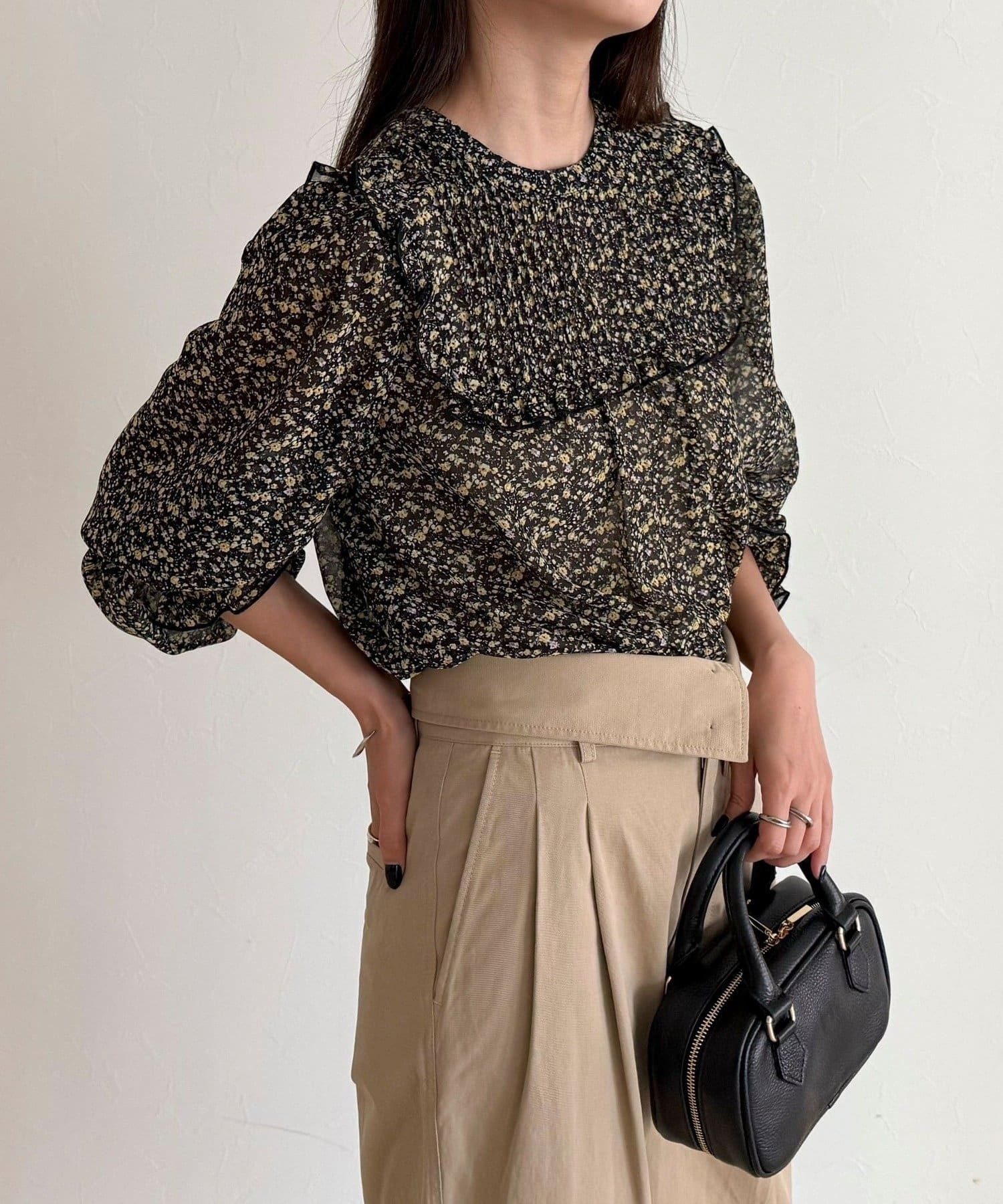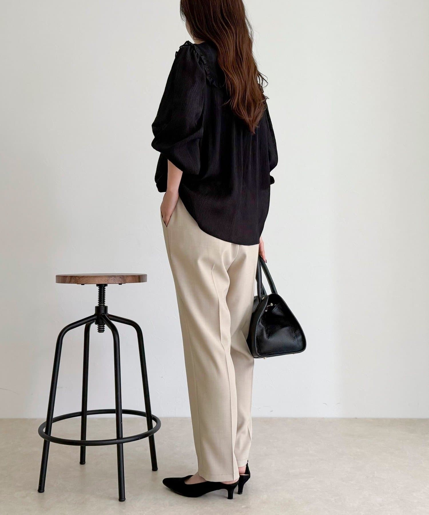 ・胸元のピンタックとたっぷりのギャザーが女性らしい柔らかなシルエットを演出