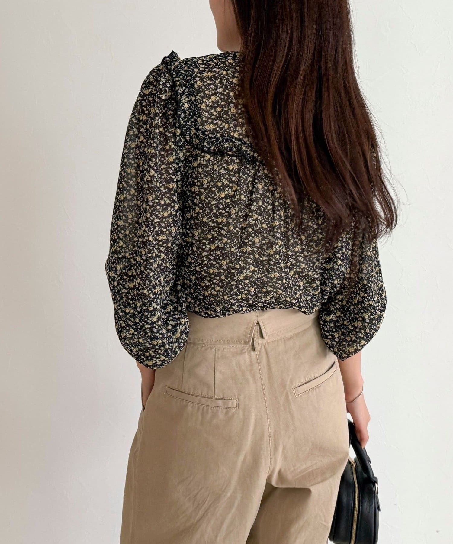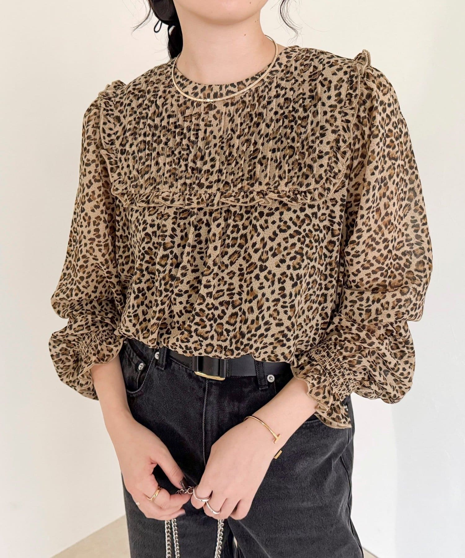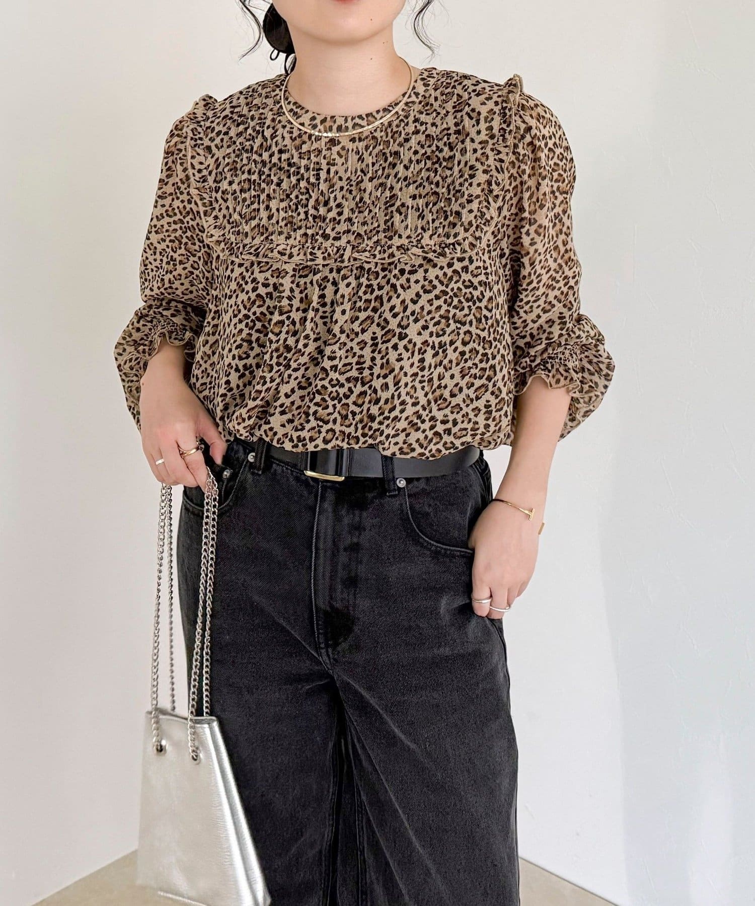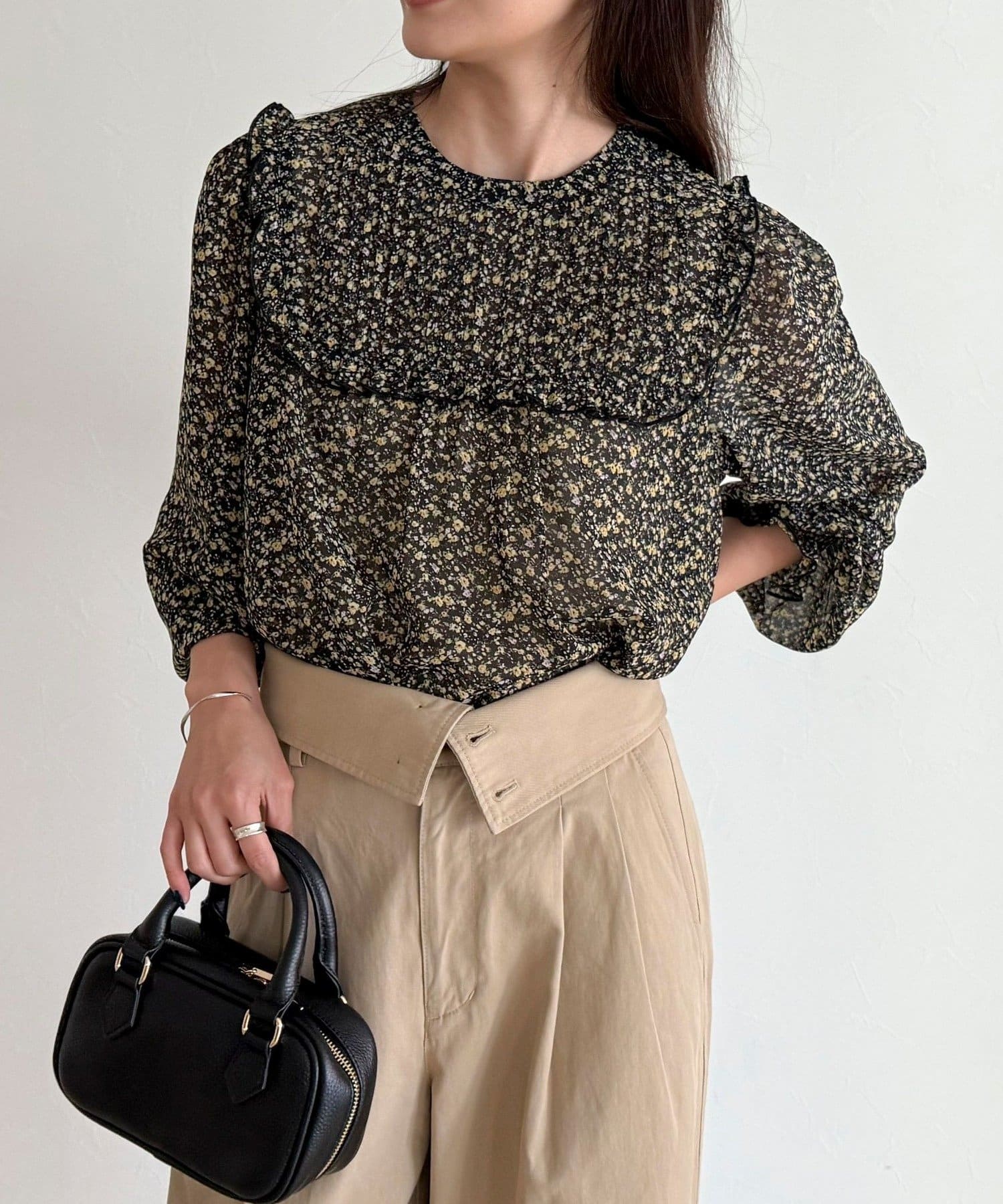 ・胸元のピンタックとたっぷりのギャザーが女性らしい柔らかなシルエットを演出