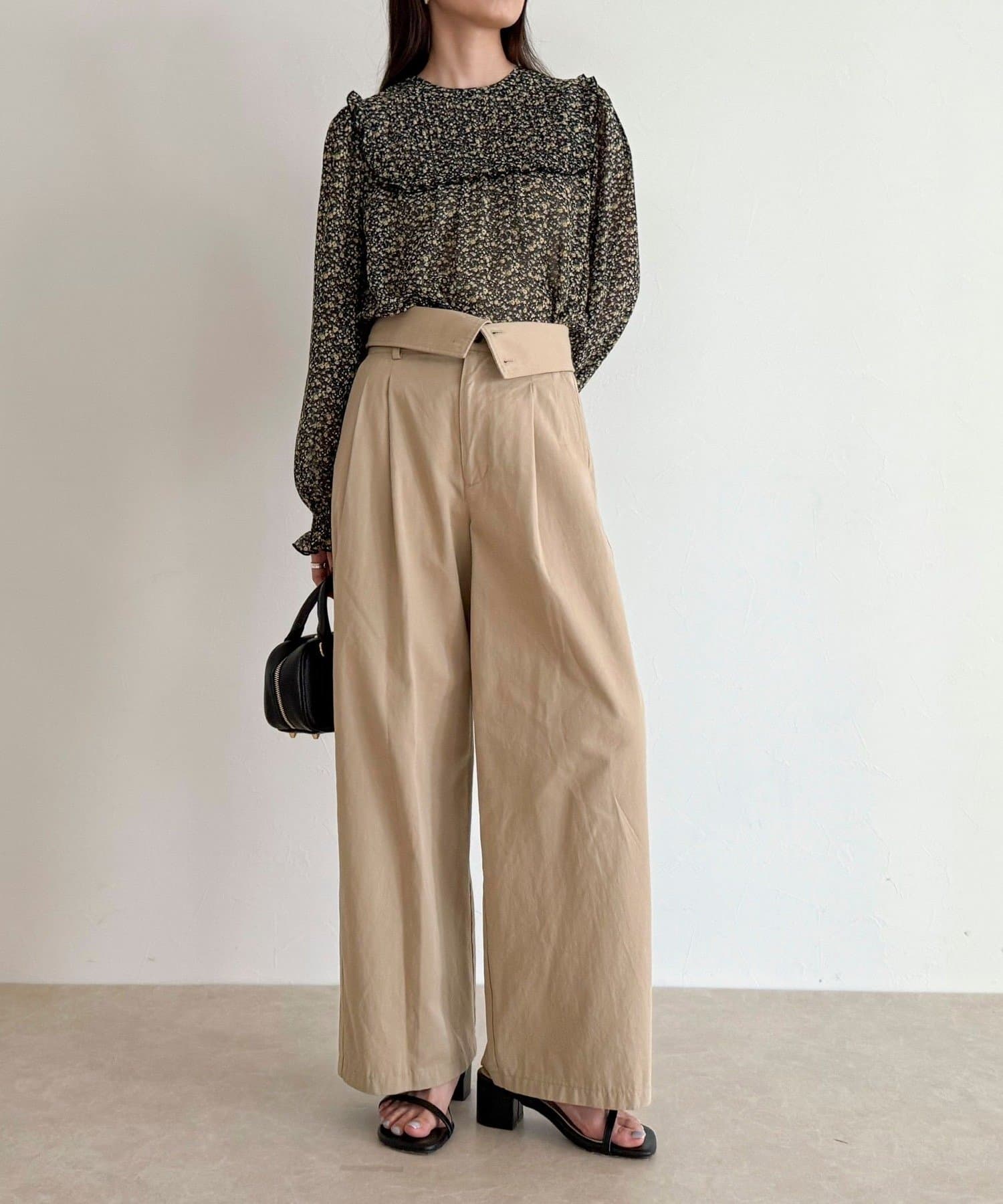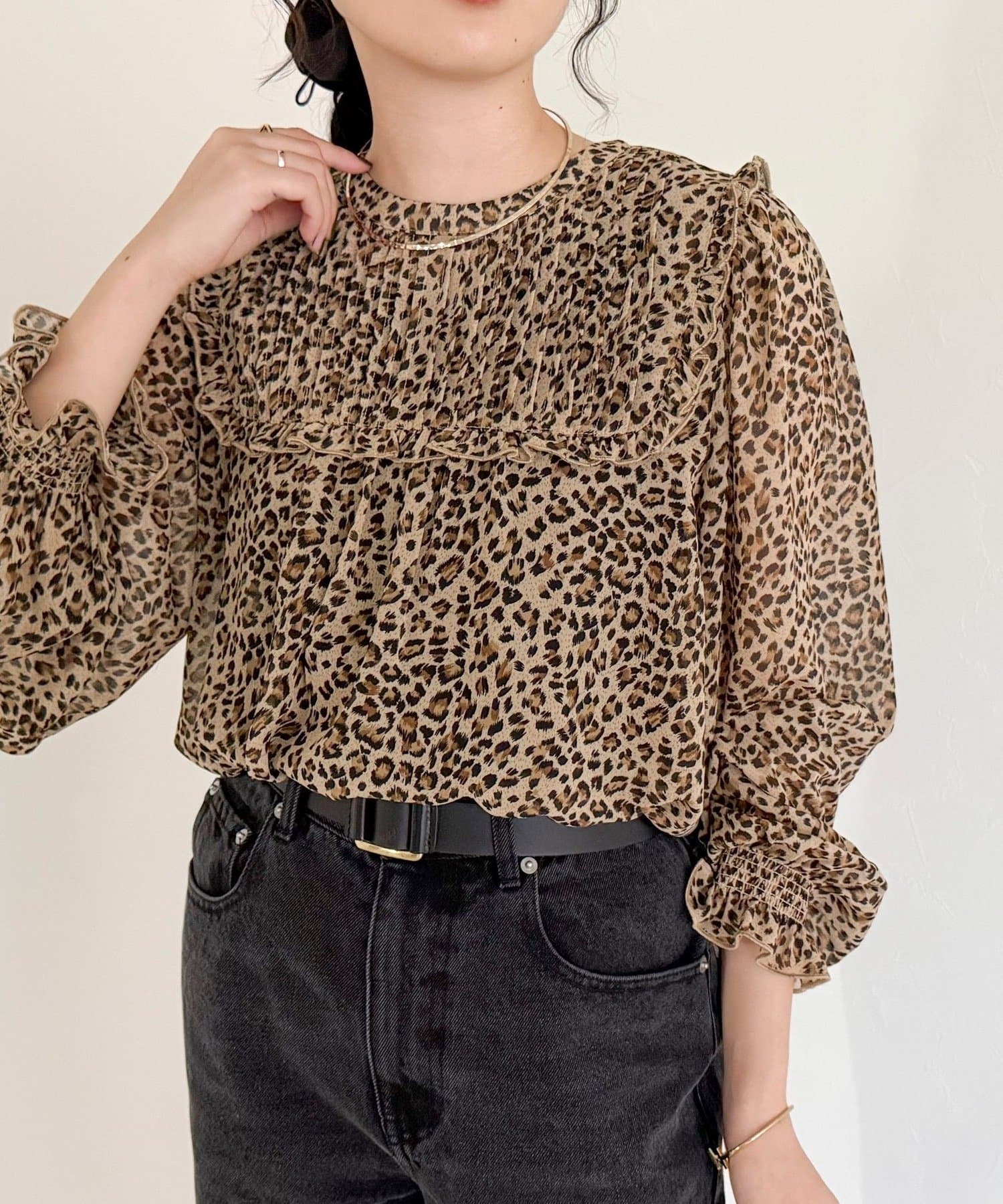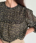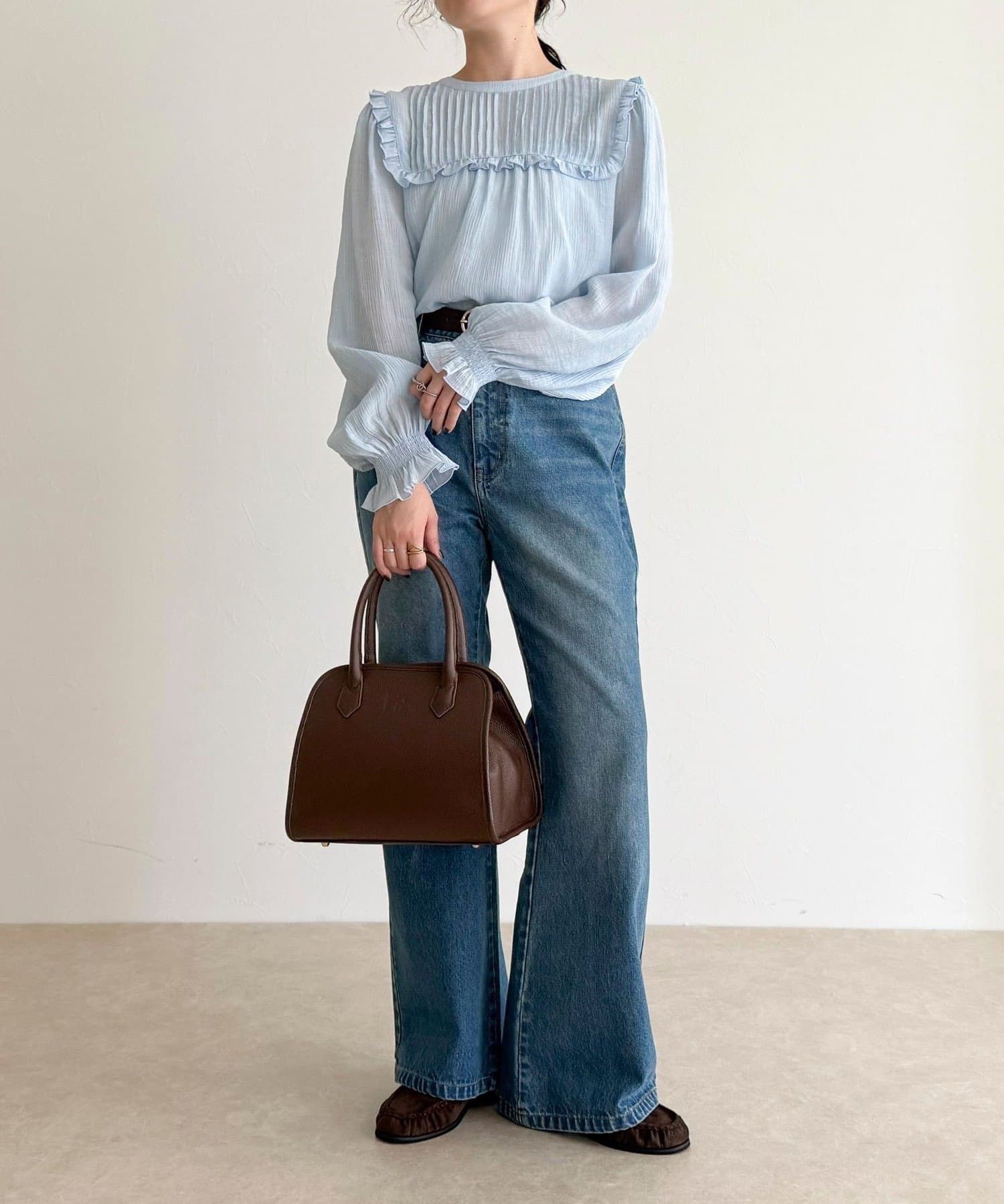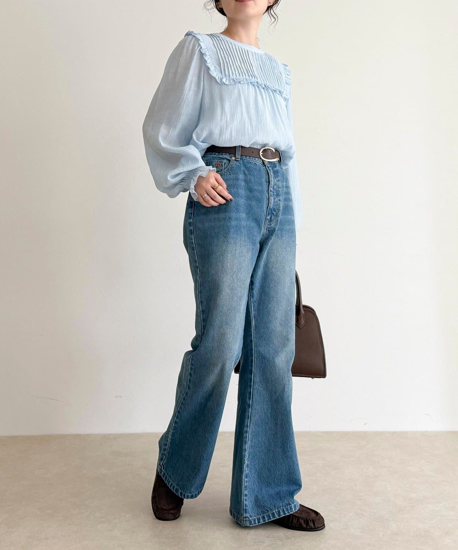 ・胸元のピンタックとたっぷりのギャザーが女性らしい柔らかなシルエットを演出