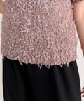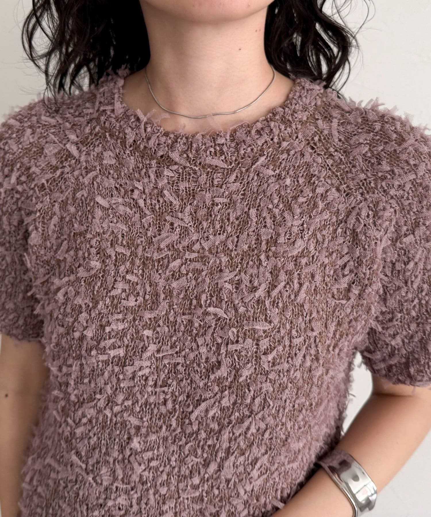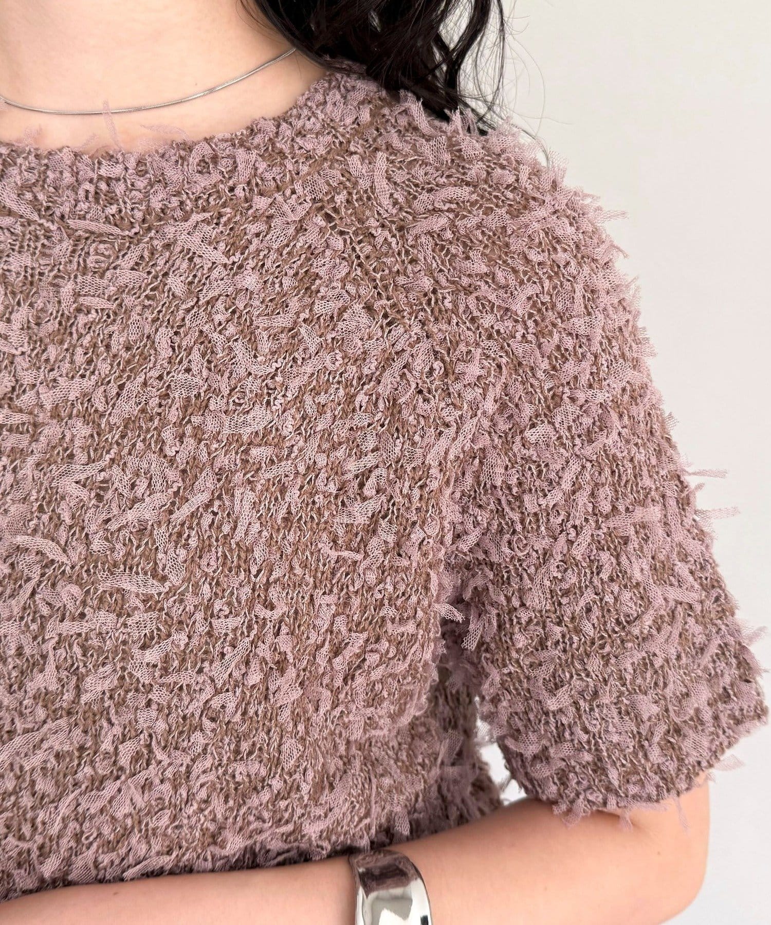 ・トレンド感のある異素材ミックスが魅力のチュールテープ半袖ニットプルオーバーです