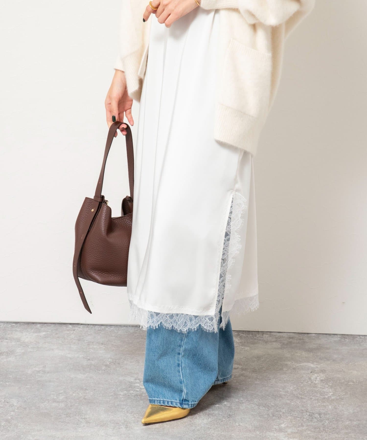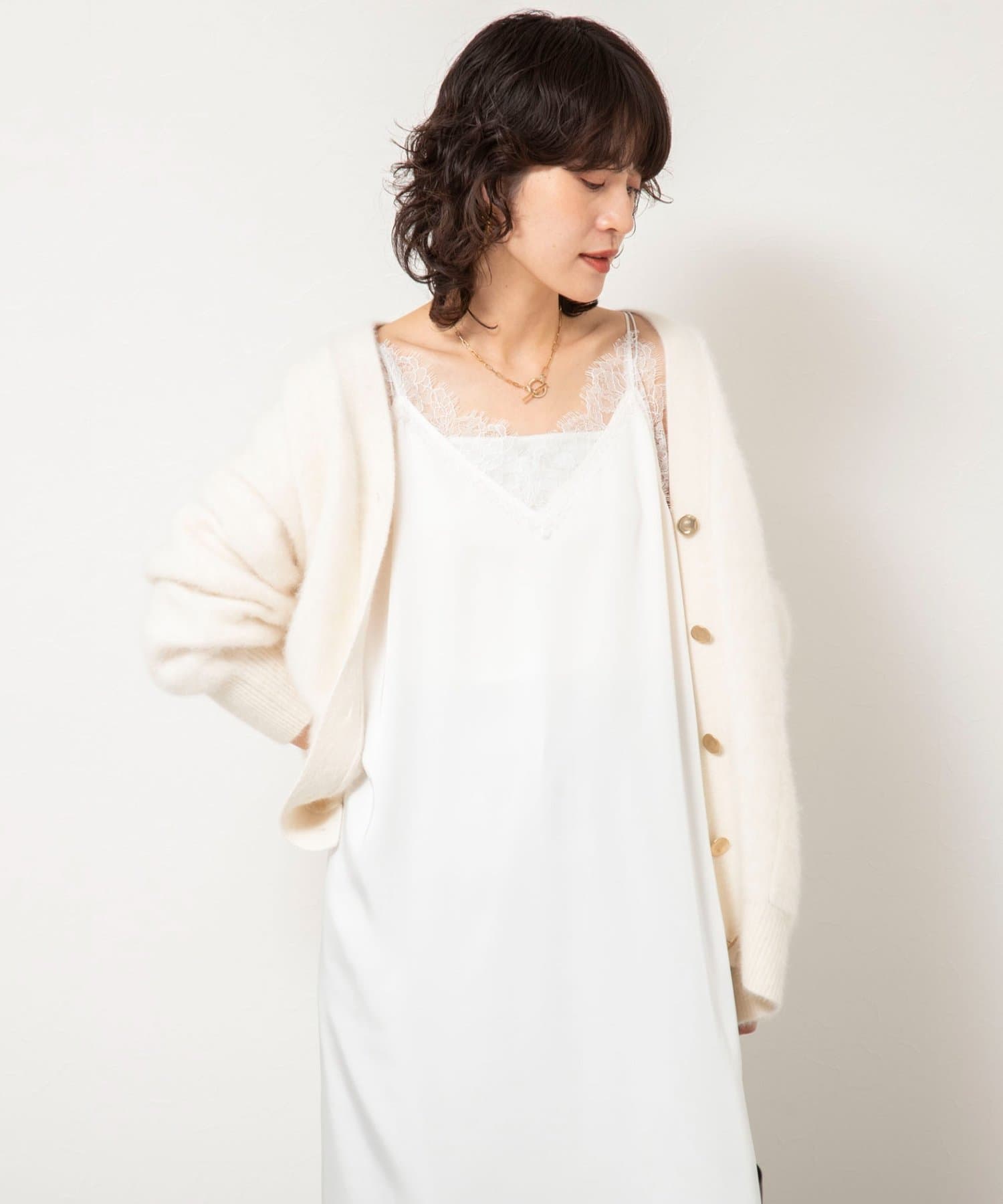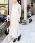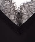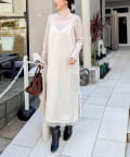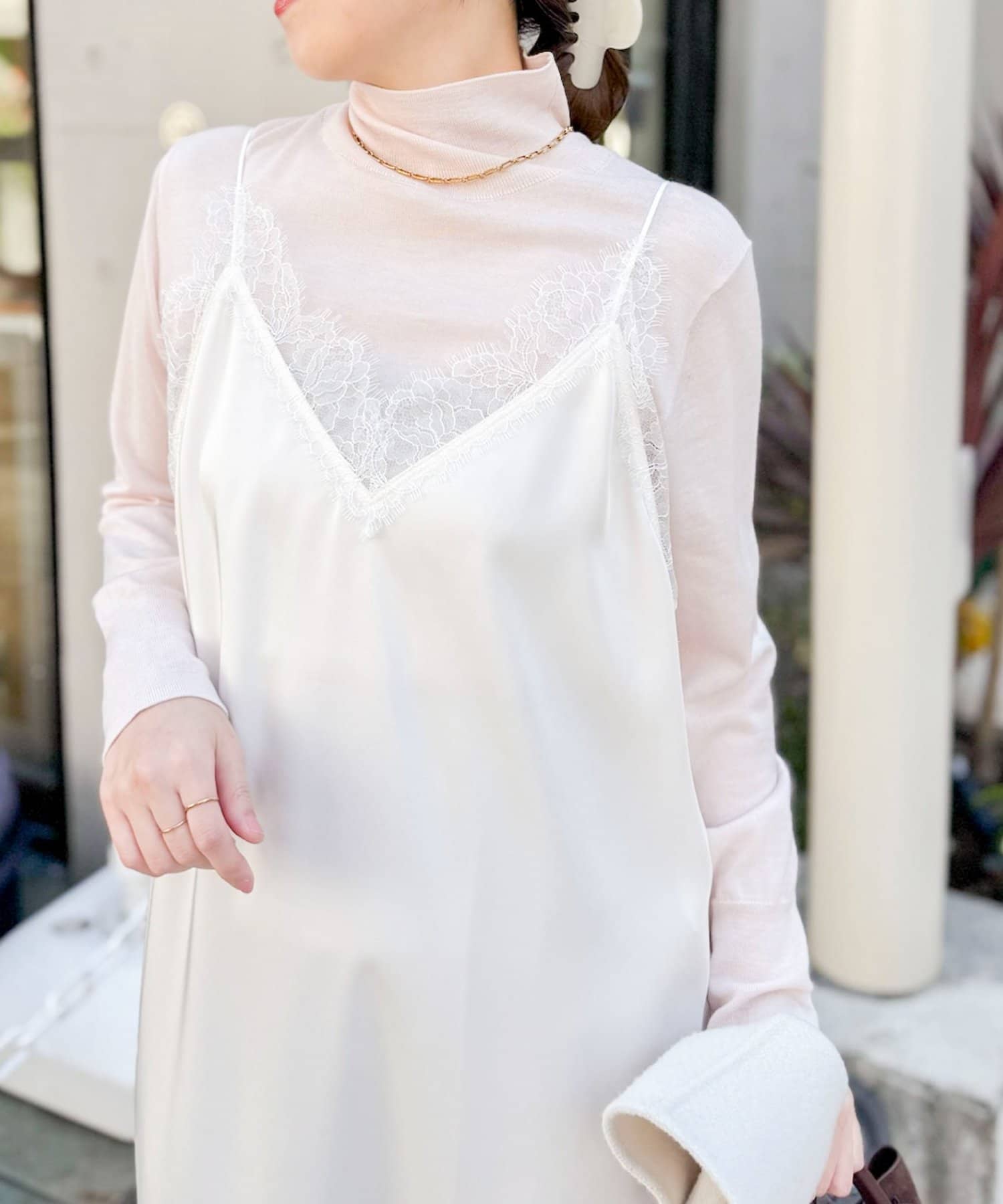 ・裾や胸元などに施された繊細なレースが、ラグジュアリーな雰囲気をプラスし、女性らしさを引き立てる一枚
