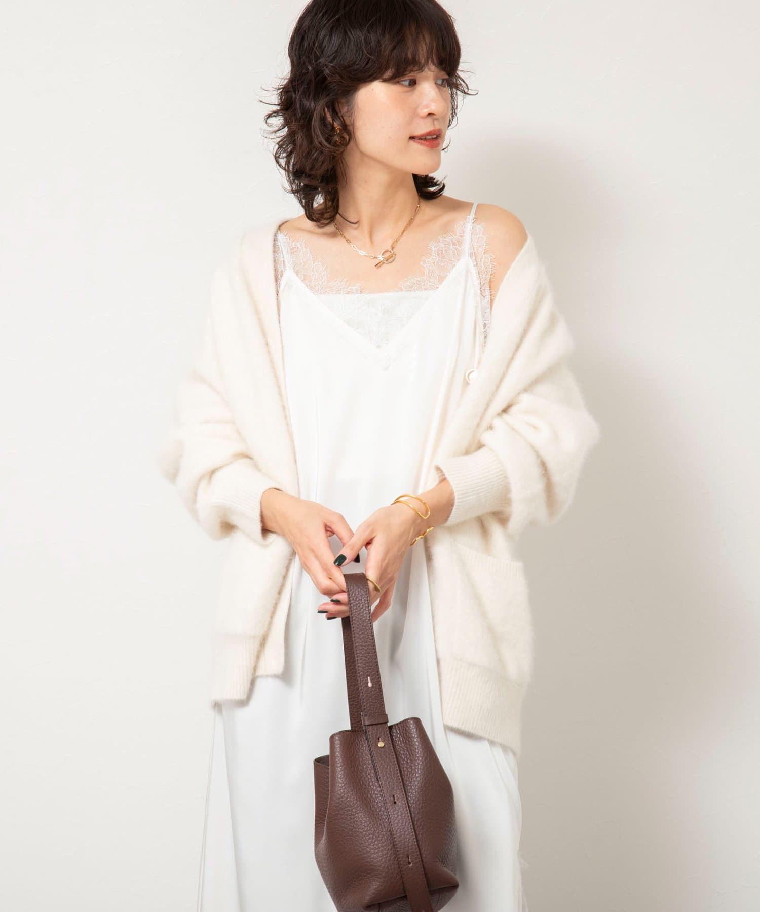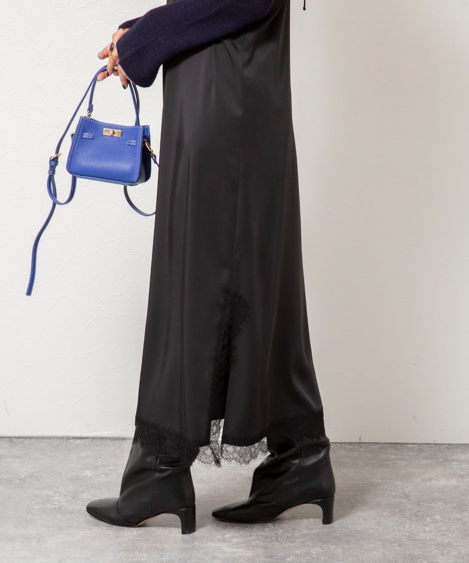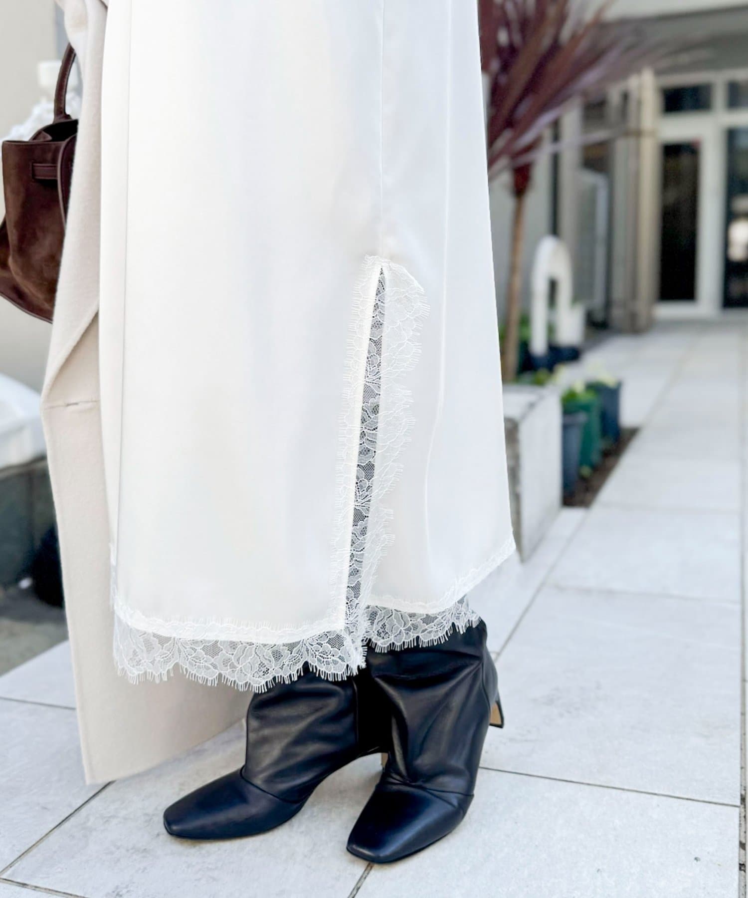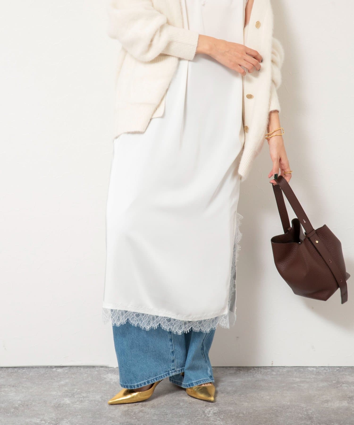 ・裾や胸元などに施された繊細なレースが、ラグジュアリーな雰囲気をプラスし、女性らしさを引き立てる一枚