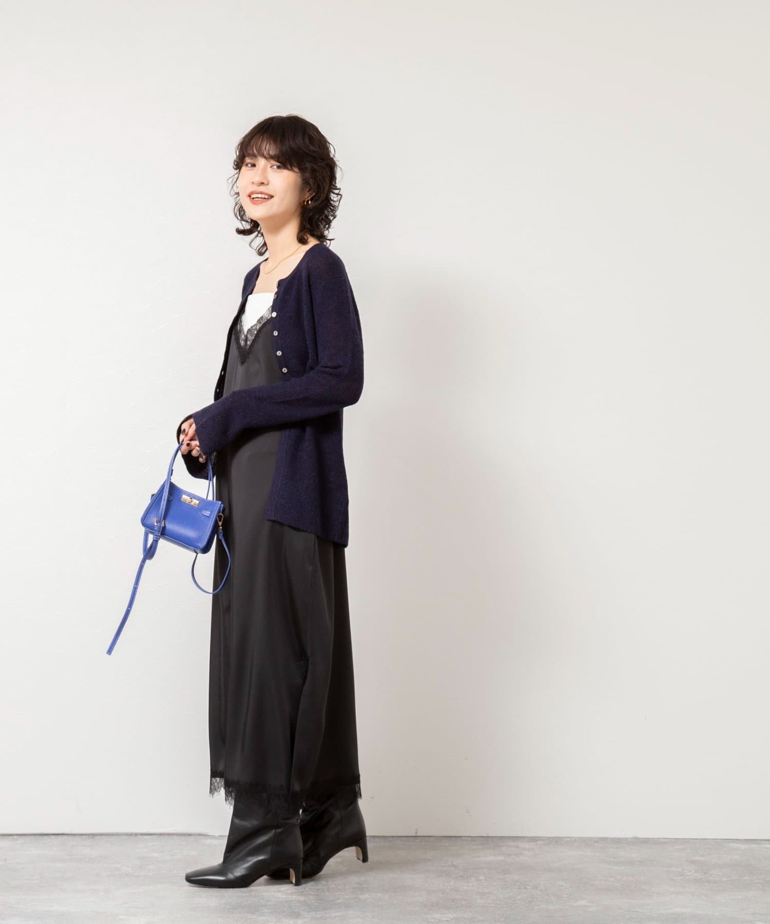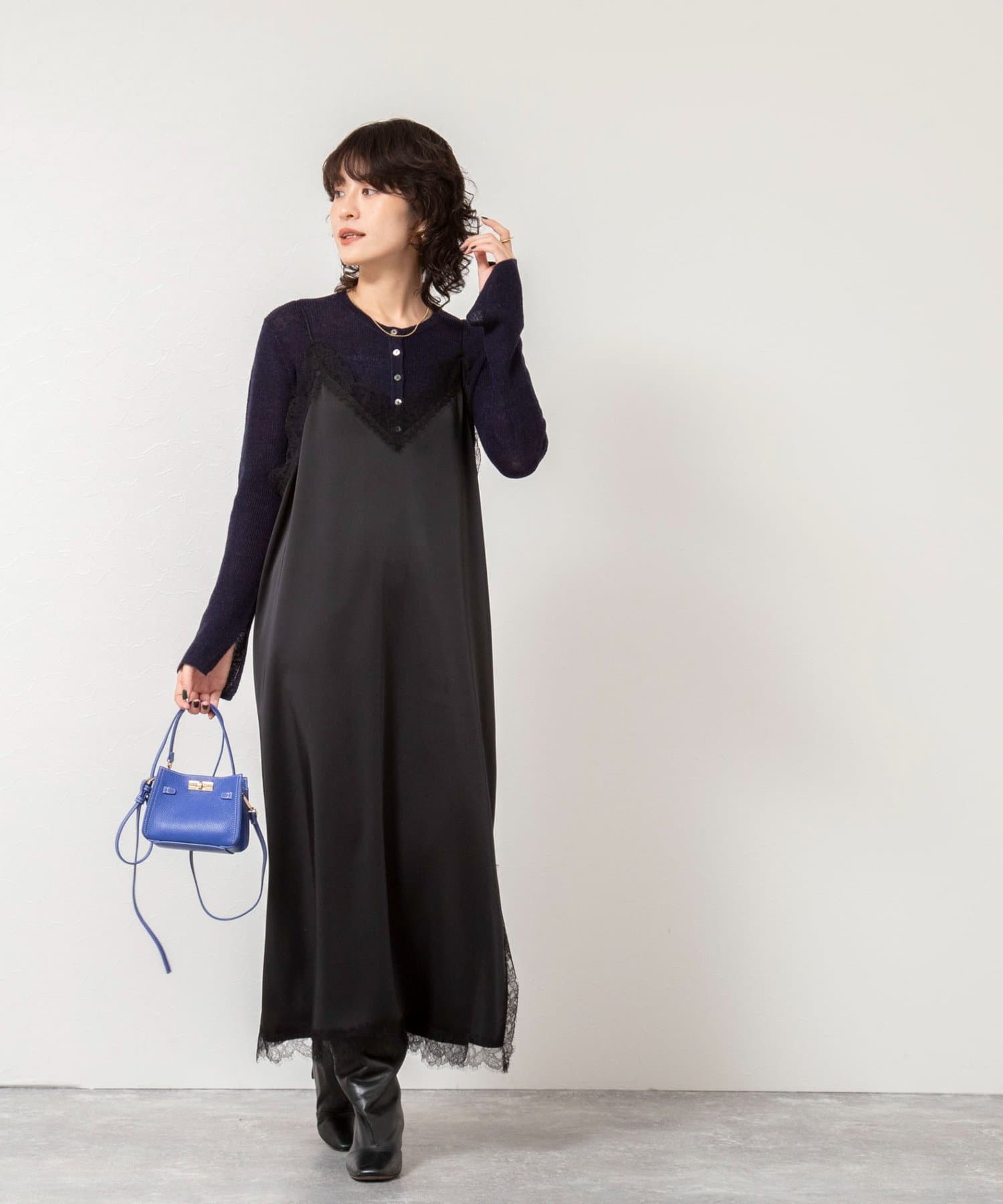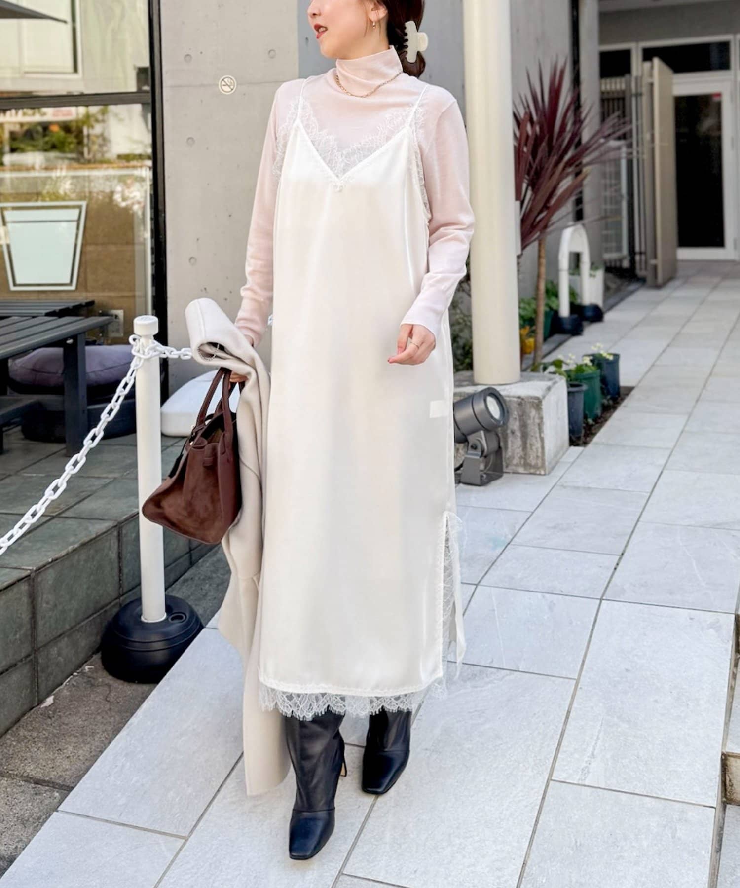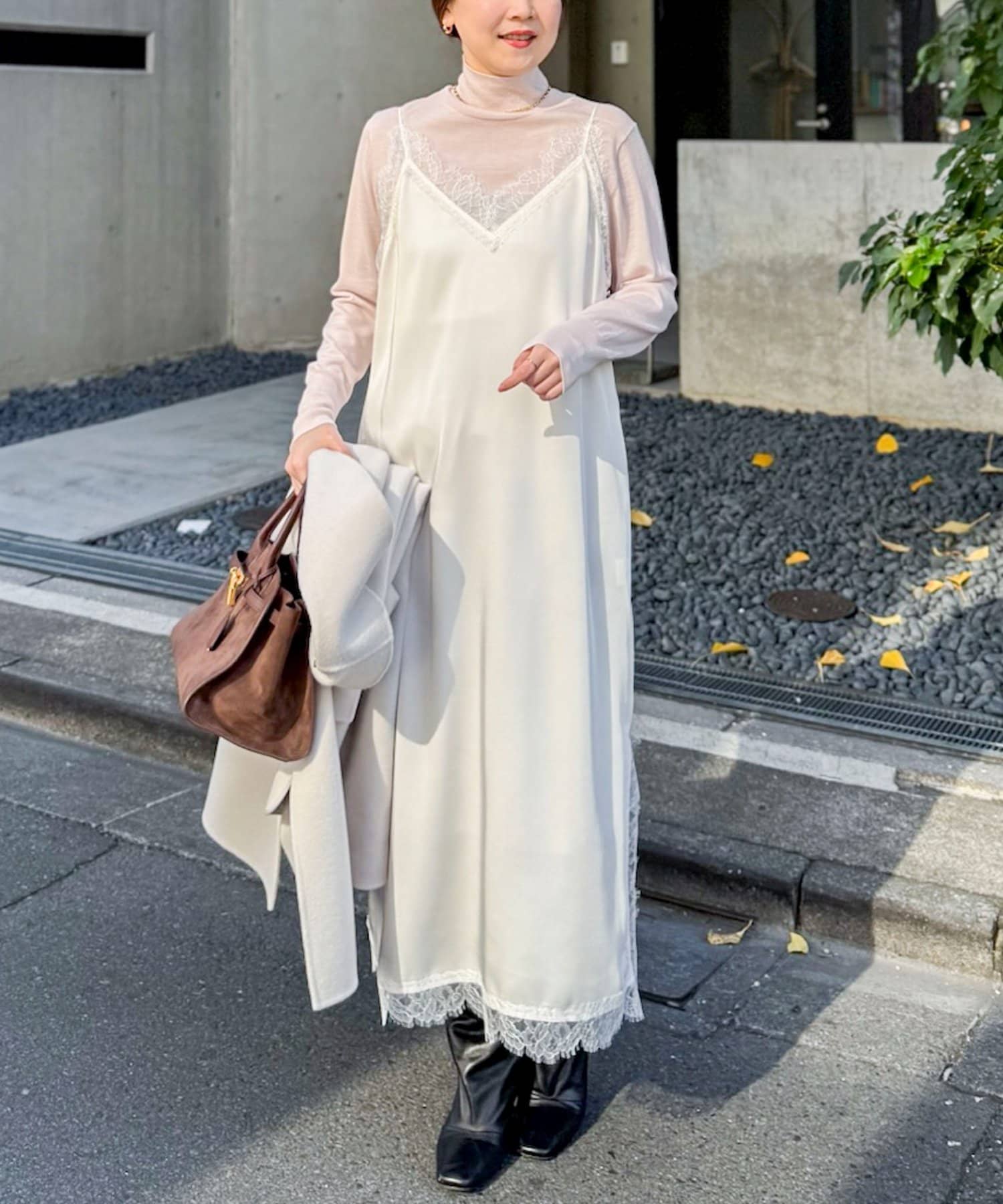 ウォッシャブルトリミングレースサテンキャミワンピース