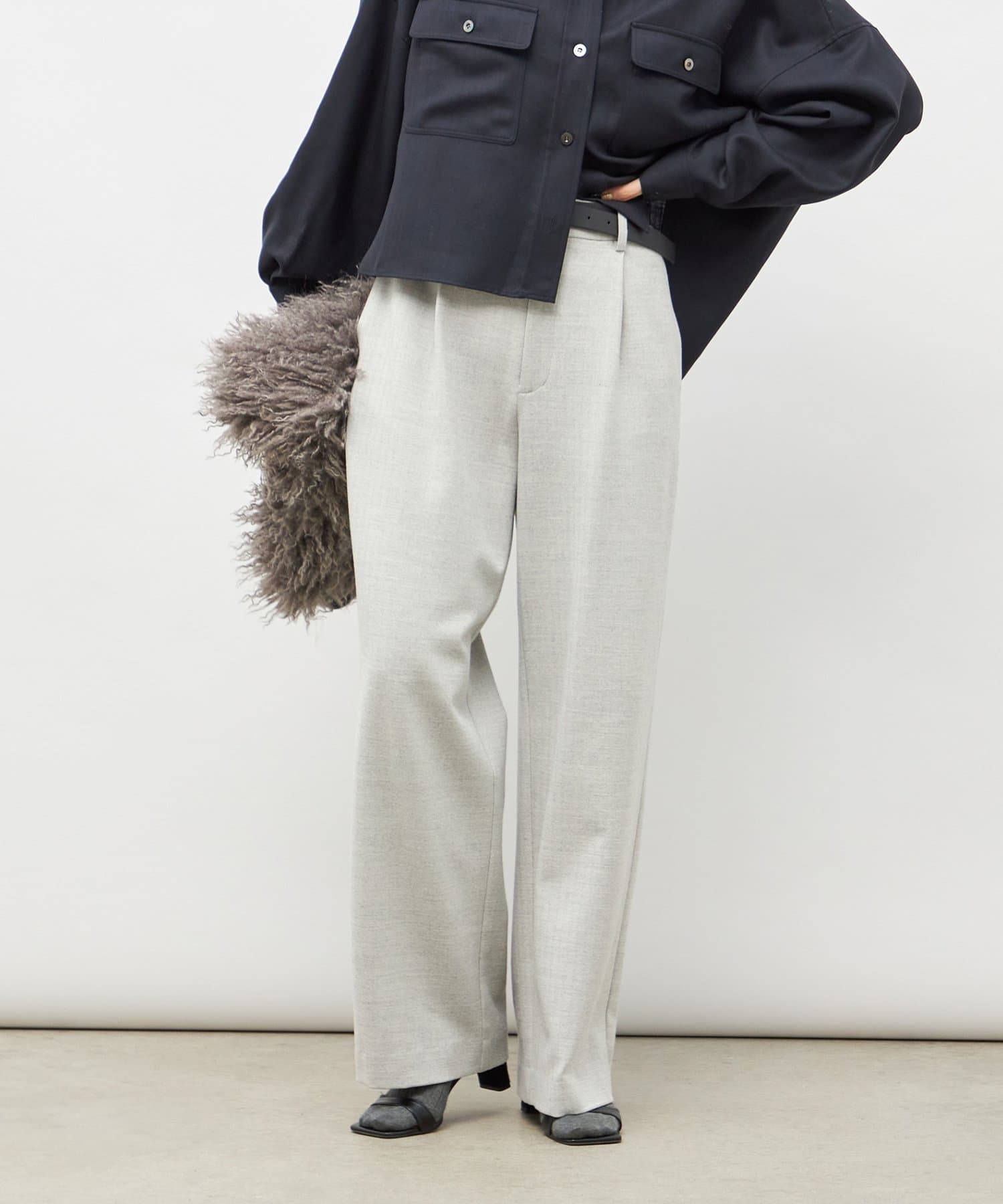 ウォッシャブル両面起毛ヘリンボーン/ストライプセミワイドパンツ